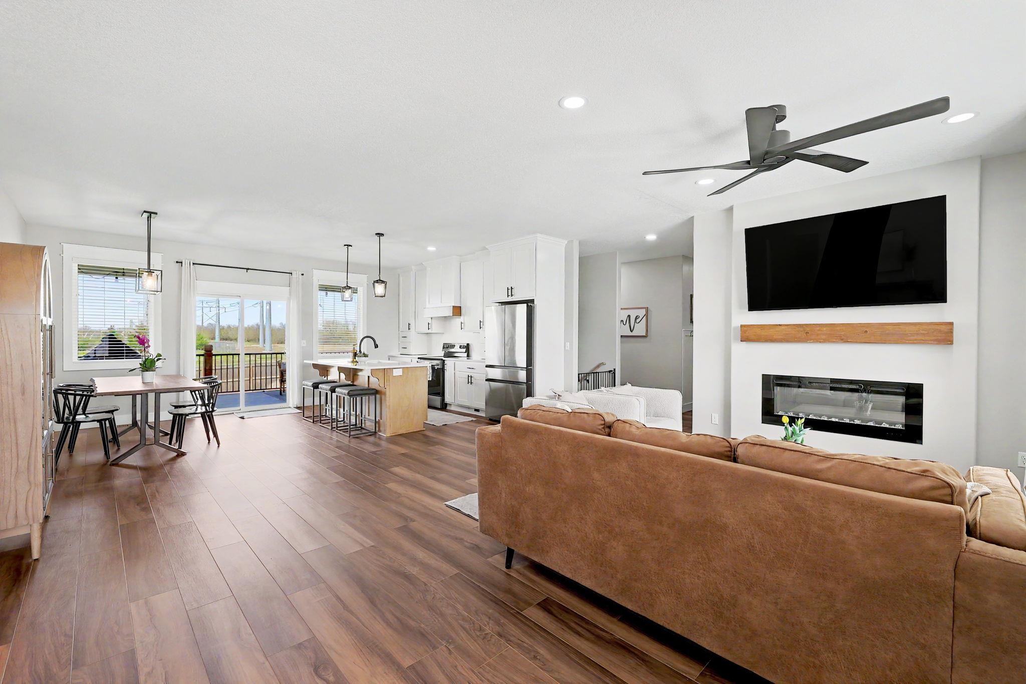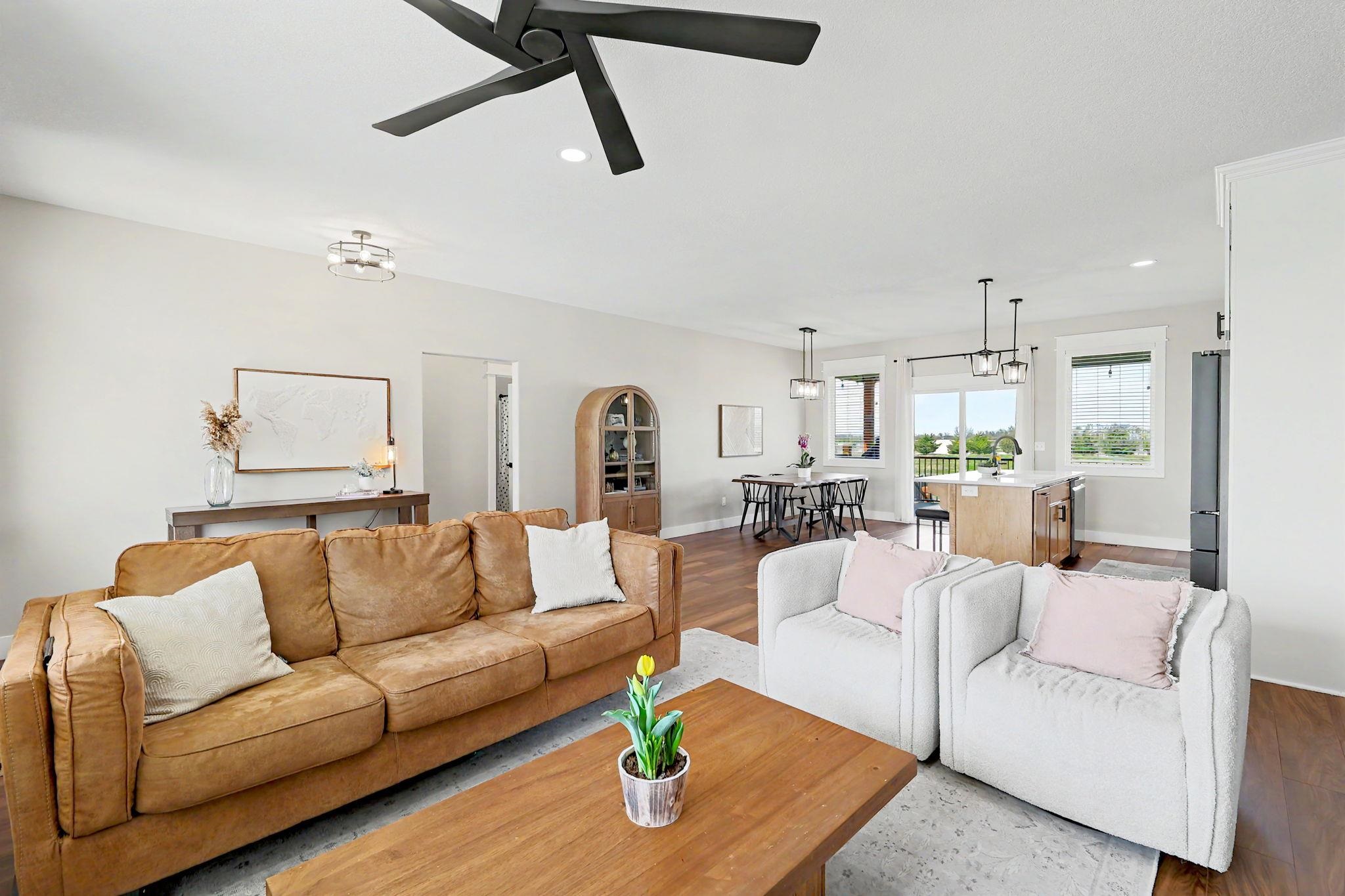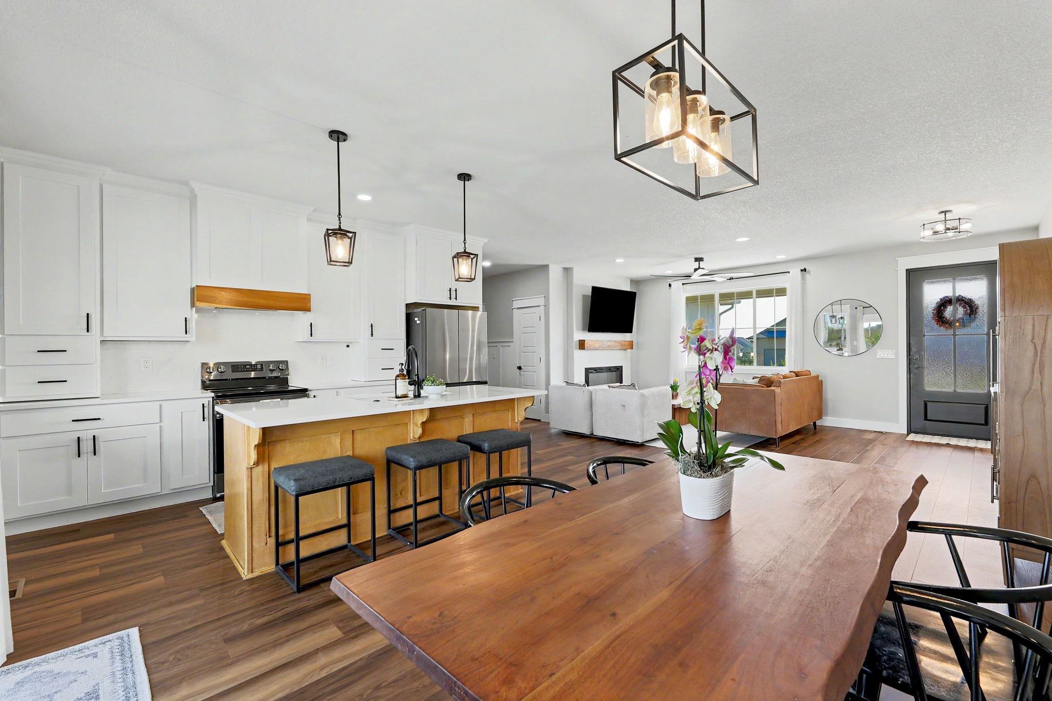 Better than new! Built in 2022, this move-in-ready home offers the perfect blend of modern design and thoughtful functionality. From the moment you arrive, you'll notice the exceptional curb appeal, highlighted by a striking steel front door, limestone exterior accents, and an oversized side-load garage. Inside, the spacious, open-concept layout is filled with natural light and features beautiful flooring, neutral paint tones, and a stunning fireplace, perfect for both everyday living and entertaining. The large dining area flows seamlessly into the main living space and kitchen. The split-bedroom floor plan provides added privacy, with a luxurious primary suite that includes a walk-in closet and convenient access to the main-floor laundry room. Additional bedrooms also feature generous walk-in closets. The fully finished view-out basement expands your living space with two large bedrooms, a full bathroom, a spacious family room, a wet bar, and a dedicated office with elegant French doors. Step outside to enjoy a large fenced backyard with no rear neighbors, complete with a covered deck and patio - ideal for relaxing or entertaining. Situated on a low-traffic street, this home offers both comfort and convenience in a desirable setting. Immaculately maintained and truly move-in ready. This is a must-see home!