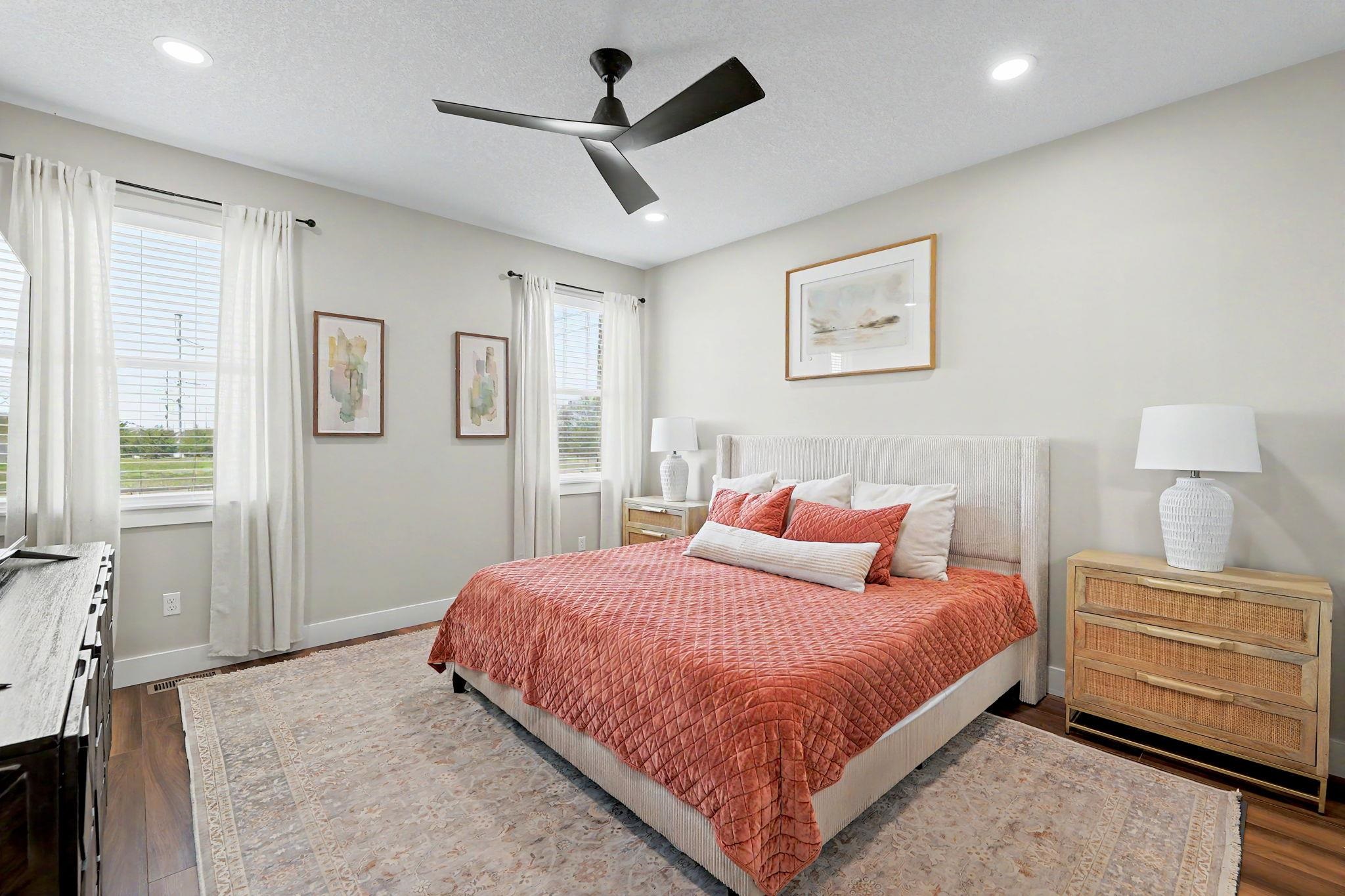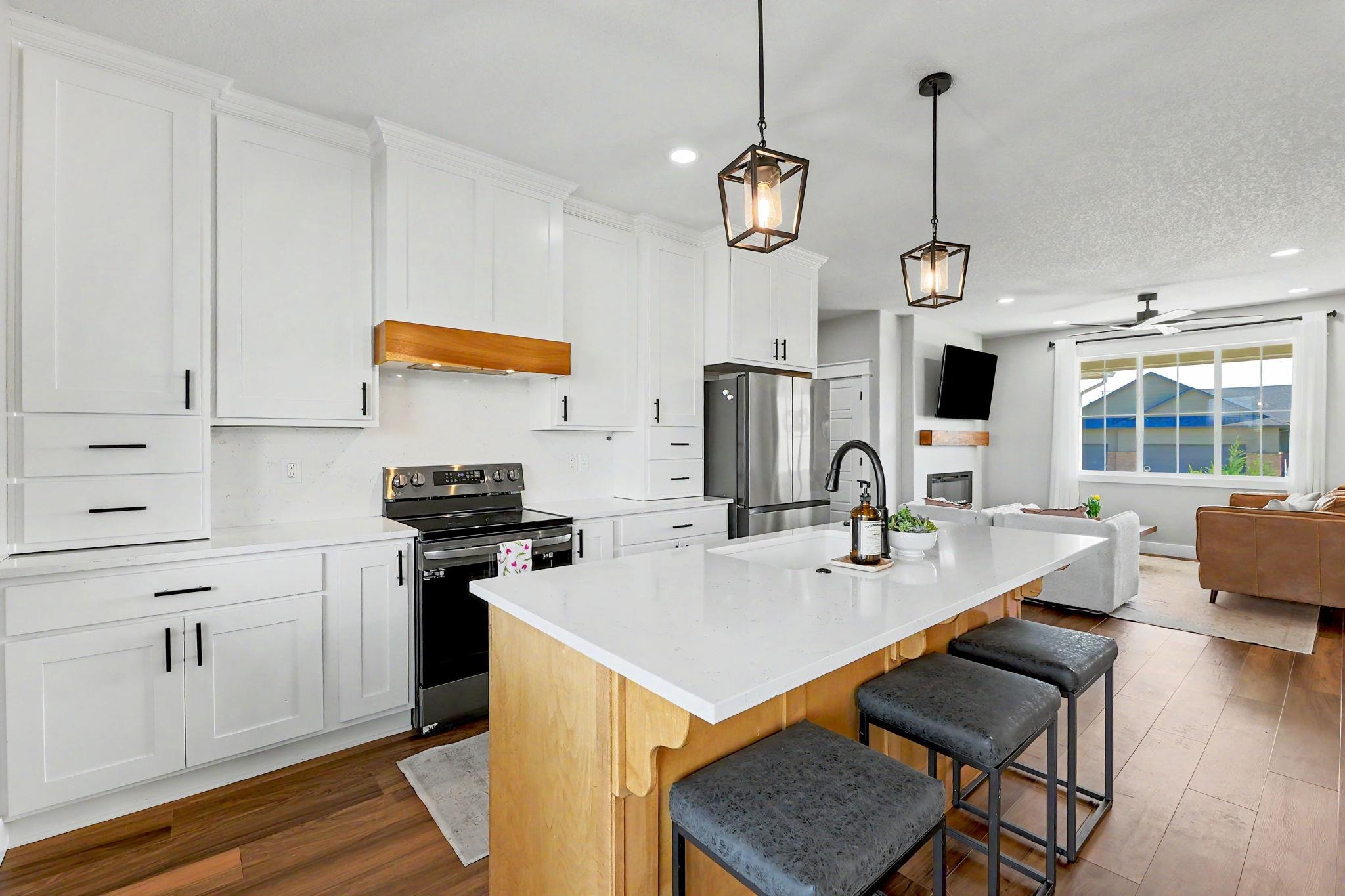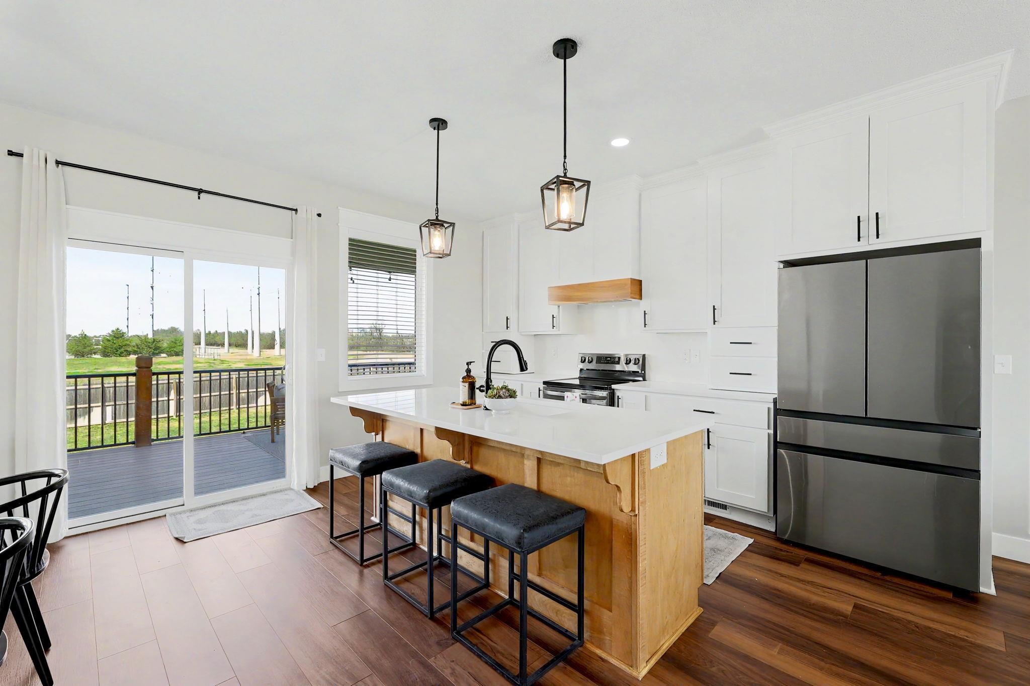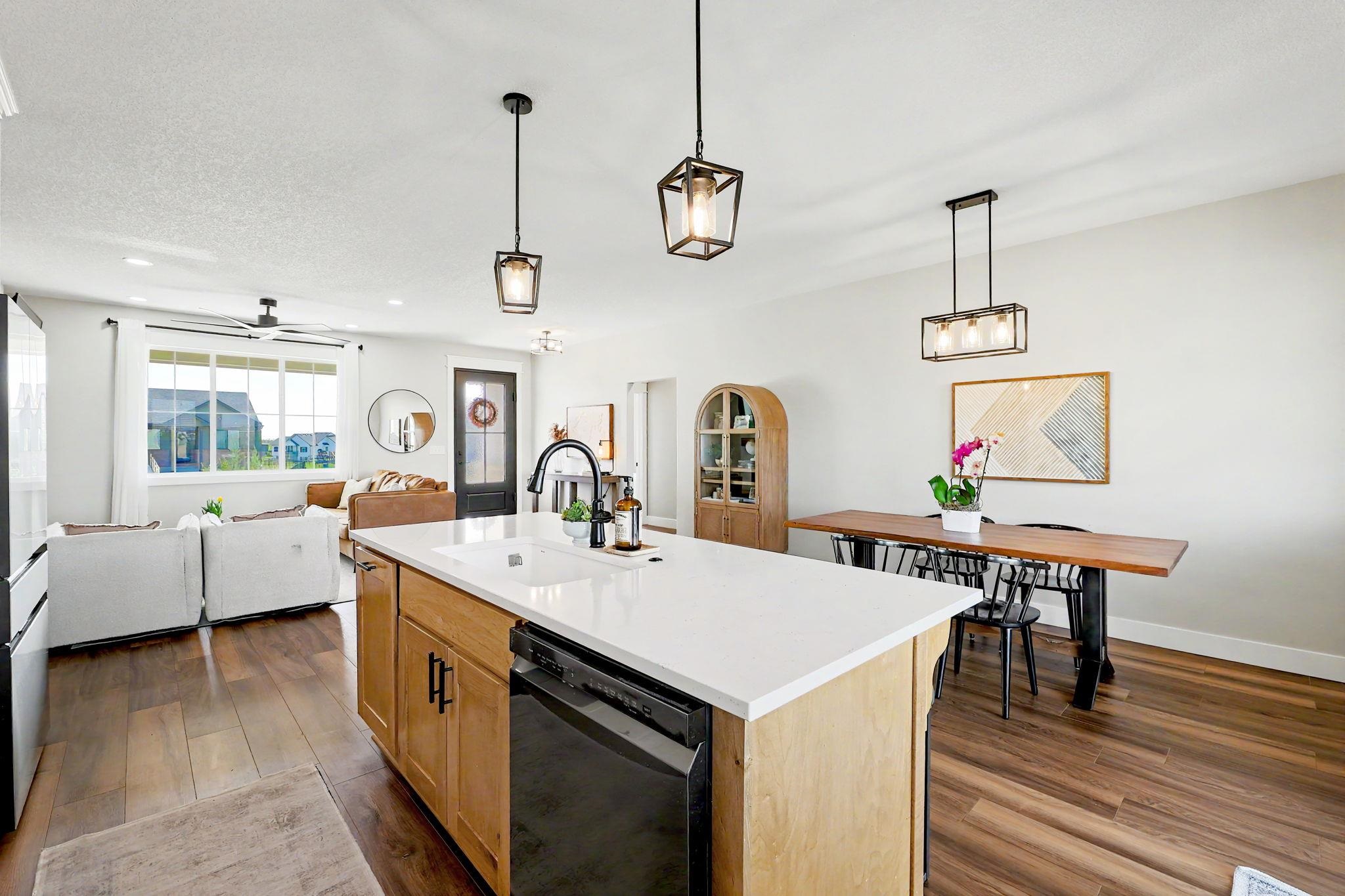 Better than new! Built in 2022, this move-in-ready home offers the perfect blend of modern design and thoughtful functionality. From the moment you arrive, you'll notice the exceptional curb appeal, highlighted by a striking steel front door, limestone exterior accents, and an oversized side-load garage. Inside, the spacious, open-concept layout is filled with natural light and features beautiful flooring, neutral paint tones, and a stunning fireplace, perfect for both everyday living and entertaining. The large dining area flows seamlessly into the main living space and kitchen. The split-bedroom floor plan provides added privacy, with a luxurious primary suite that includes a walk-in closet and convenient access to the main-floor laundry room. Additional bedrooms also feature generous walk-in closets. The fully finished view-out basement expands your living space with two large bedrooms, a full bathroom, a spacious family room, a wet bar, and a dedicated office with elegant French doors. Step outside to enjoy a large fenced backyard with no rear neighbors, complete with a covered deck and patio - ideal for relaxing or entertaining. Situated on a low-traffic street, this home offers both comfort and convenience in a desirable setting. Immaculately maintained and truly move-in ready. This is a must-see home!