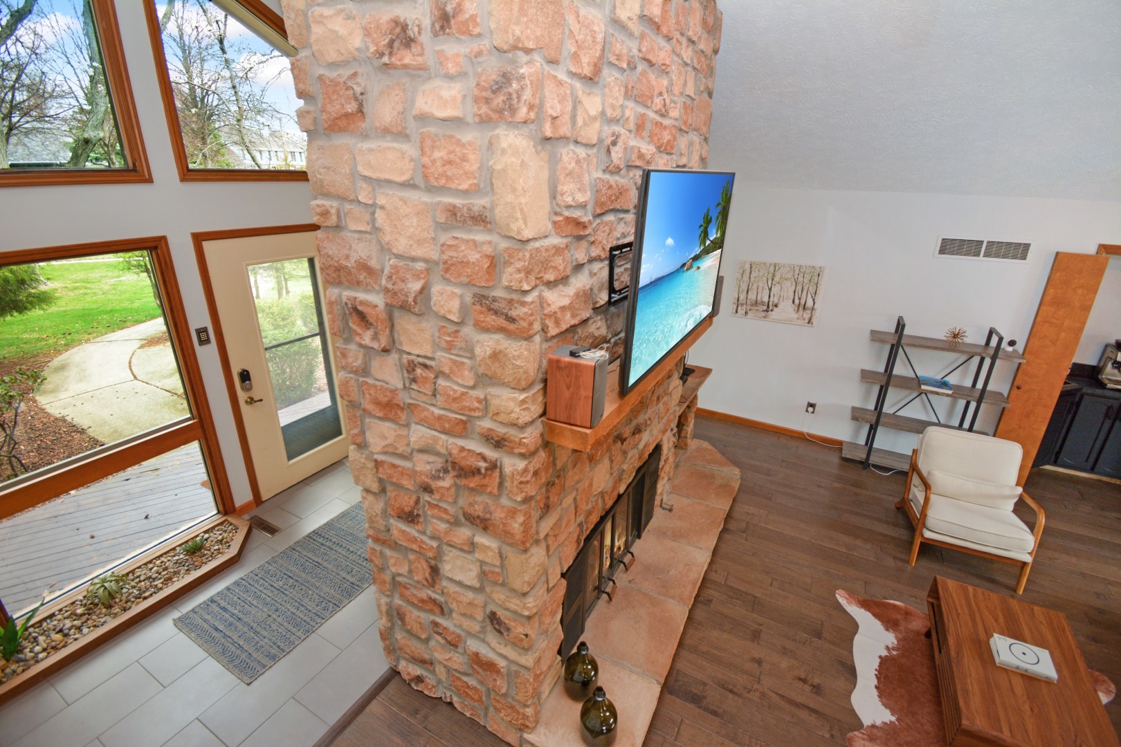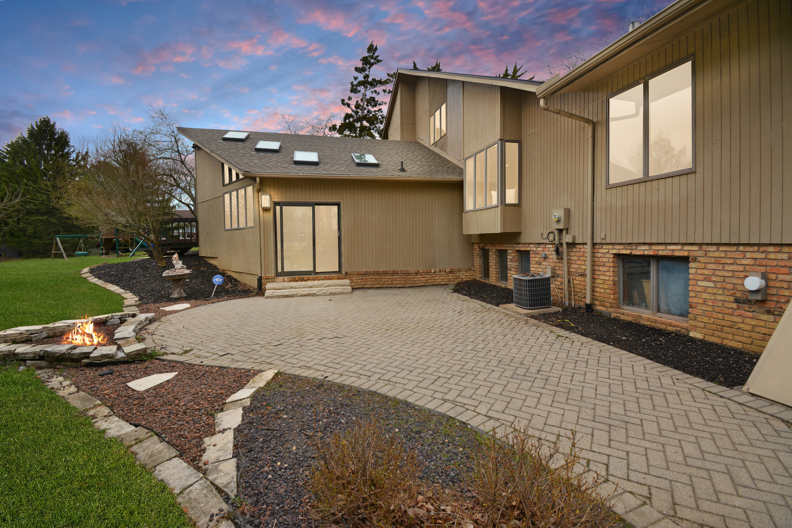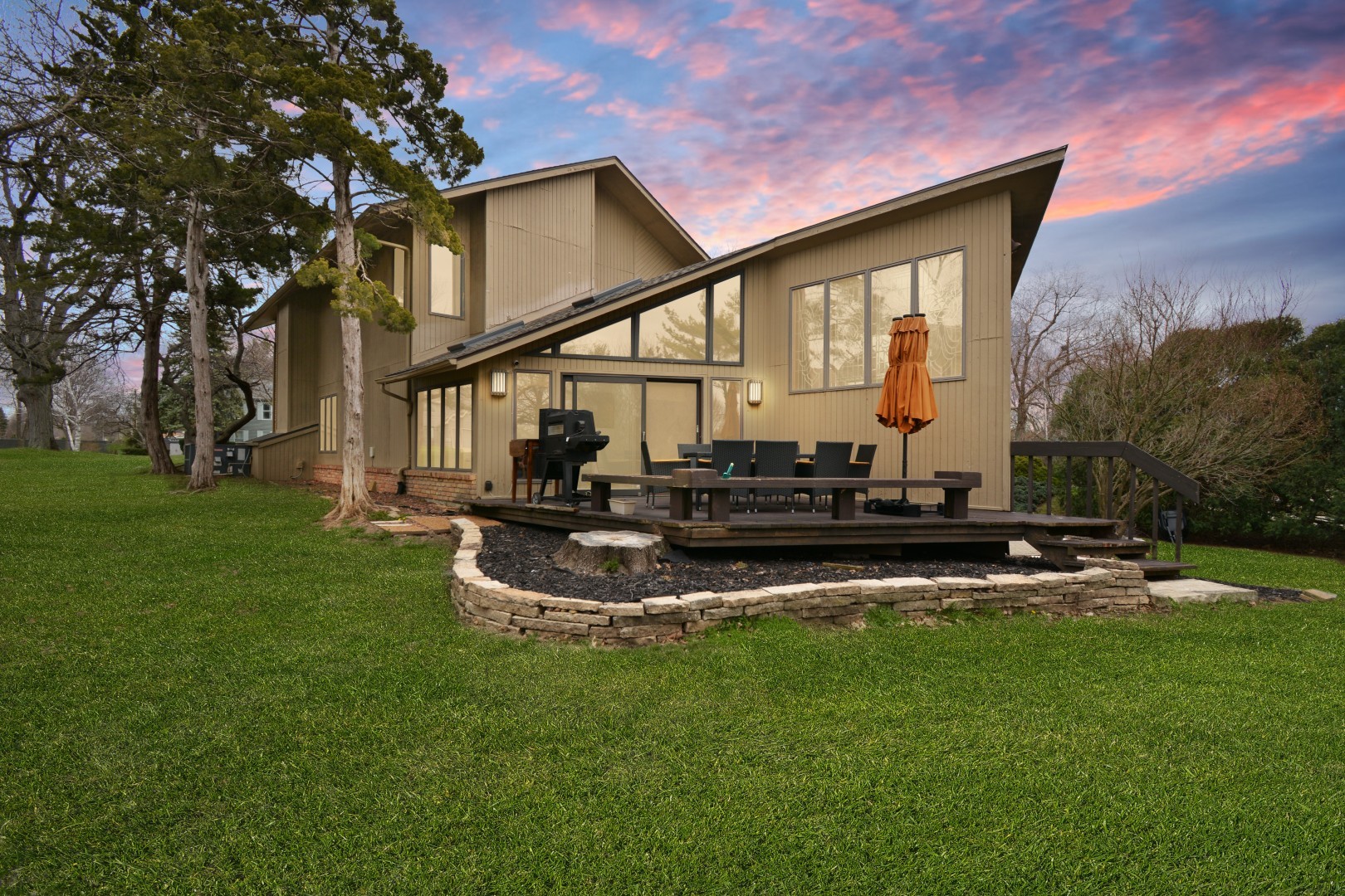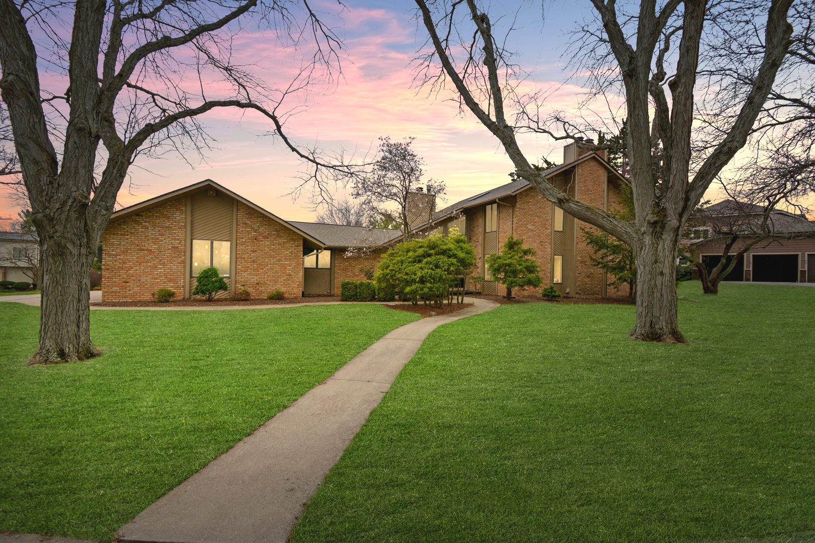 Welcome to 37 Pendleton Way, a stunning mid-century modern gem nestled in East Bloomington's Brookridge Subdivision. Situated on a quiet street between two cul-de-sacs, this home offers unparalleled privacy on a raised, expansive lot surrounded by mature trees and lush landscaping. The outdoor living space is perfect for entertaining or relaxing, featuring an expanded brick paver patio and deck. Inside, the home boasts 4 spacious bedrooms and 3.5 baths, including TWO Master Suites-one on the main level and one on the second floor! Enter through a 2-story foyer featuring built-in planters, a striking stone wall, ample windows and impressive architectural design. The newly renovated modern eat-in chef's kitchen includes custom cabinets, Quartz countertops, a breakfast bar, high-end stainless steel appliances, and new lighting. The stylish living room is highlighted by a chic fireplace and built-in shelving on every wall. The vaulted family room features a floor-to-ceiling stone fireplace a hidden wet bar and custom window seat, while the elegant separate dining room is perfect for formal gatherings. Designed to feel like your own private oasis, the magnificent multi-level four-seasons room offers leaded glass windows, a sauna, hot tub, updated powder room, and direct access to the deck and patio. The second-floor master suite includes a stone fireplace, en suite bath with skylight, dual sinks, multiple closets, and a tiled shower. The main floor master suite features an updated en suite bath with a tiled shower. Convenience is key with three laundry hook-ups- one on each level. The finished basement, recently refreshed with LVP flooring, paint, and lighting, can serve as a family room or a 5th bedroom, complete with walk-out access and ample storage. The 3-car side load garage offers pull-down attic stairs and a workbench. Recent updates to ensure modern comfort and peace of mind include a new roof, skylights, furnace, sewer line clean out, landscaping, fresh paint & new LVP flooring on stairs and 2nd level, dishwasher, washer/dryer. This extraordinary home at 37 Pendleton combines mid-century modern elegance with contemporary upgrades, making it a must-see property. Schedule your private showing today and experience the unique charm and sophistication of this one-of-a-kind Brookridge beauty!
