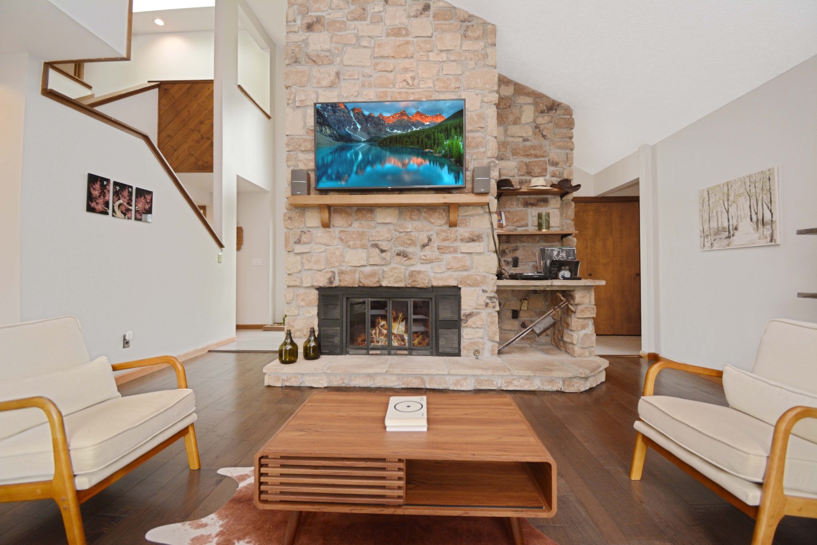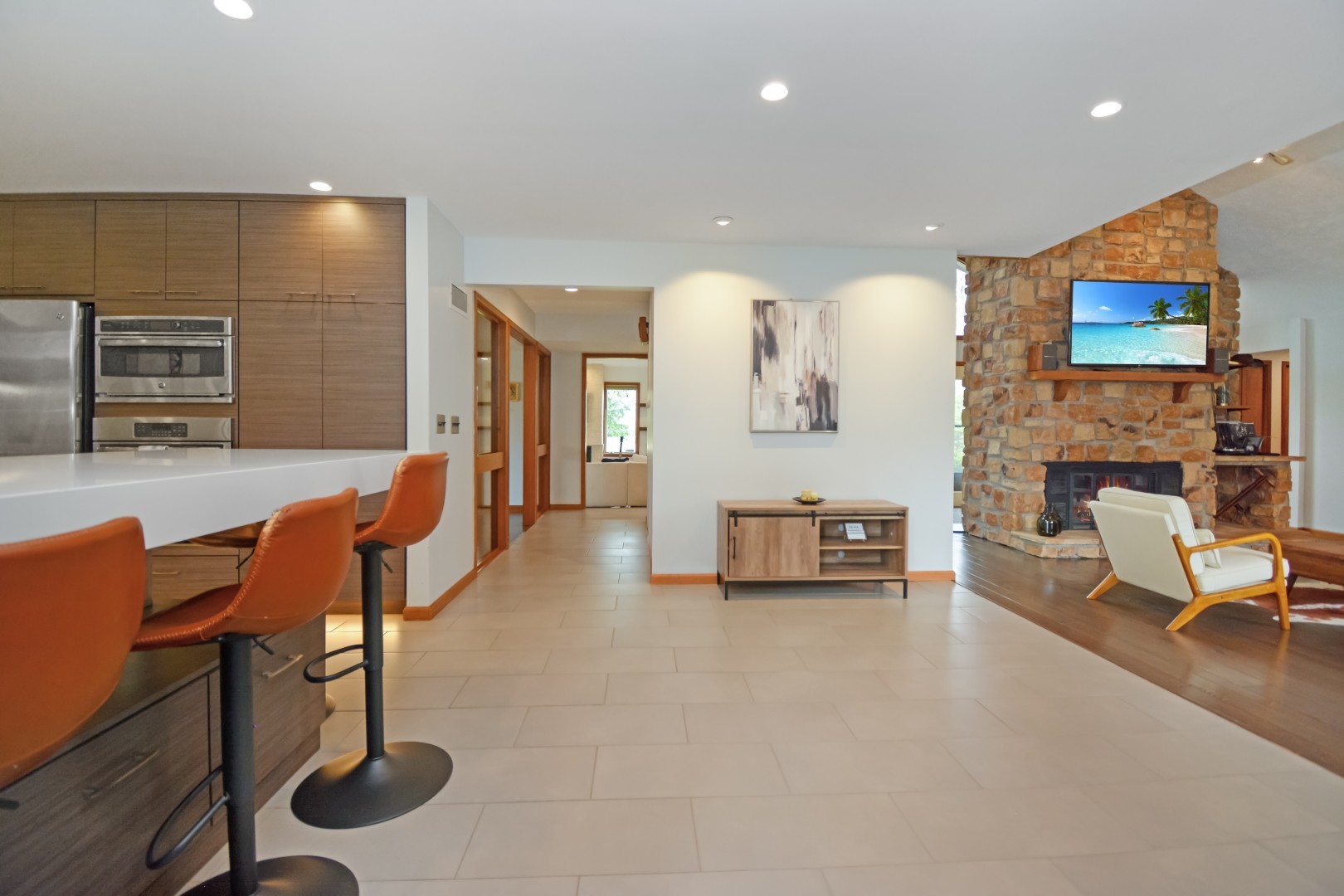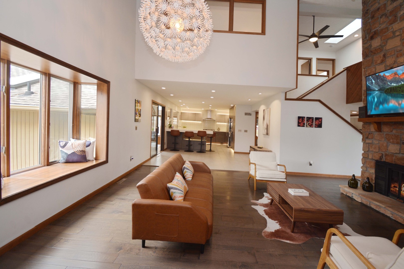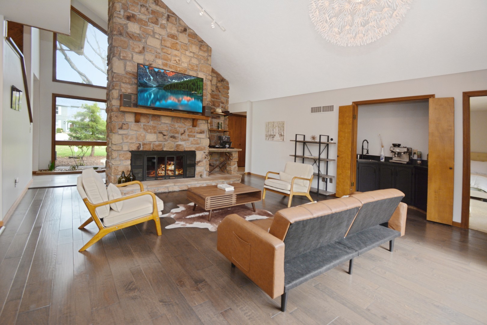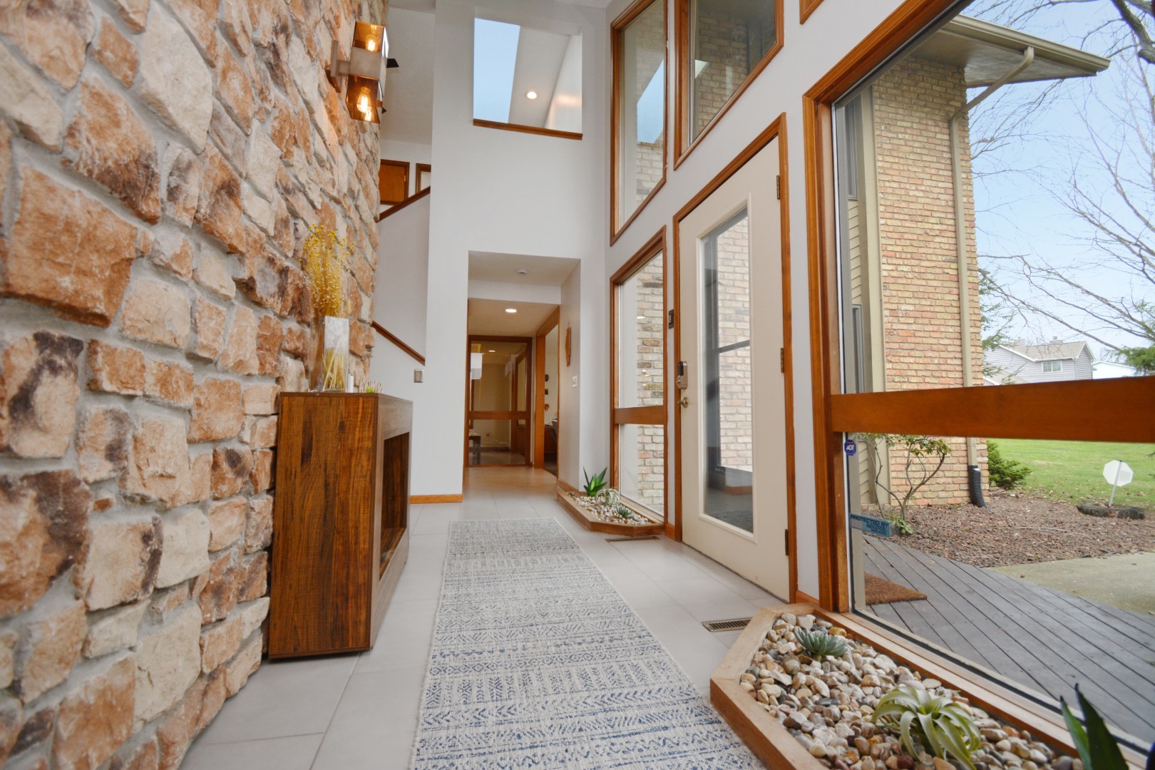 Welcome to 37 Pendleton Way, a stunning mid-century modern gem nestled in East Bloomington's Brookridge Subdivision. Situated on a quiet street between two cul-de-sacs, this home offers unparalleled privacy on a raised, expansive lot surrounded by mature trees and lush landscaping. The outdoor living space is perfect for entertaining or relaxing, featuring an expanded brick paver patio and deck. Inside, the home boasts 4 spacious bedrooms and 3.5 baths, including TWO Master Suites-one on the main level and one on the second floor! Enter through a 2-story foyer featuring built-in planters, a striking stone wall, ample windows and impressive architectural design. The newly renovated modern eat-in chef's kitchen includes custom cabinets, Quartz countertops, a breakfast bar, high-end stainless steel appliances, and new lighting. The stylish living room is highlighted by a chic fireplace and built-in shelving on every wall. The vaulted family room features a floor-to-ceiling stone fireplace a hidden wet bar and custom window seat, while the elegant separate dining room is perfect for formal gatherings. Designed to feel like your own private oasis, the magnificent multi-level four-seasons room offers leaded glass windows, a sauna, hot tub, updated powder room, and direct access to the deck and patio. The second-floor master suite includes a stone fireplace, en suite bath with skylight, dual sinks, multiple closets, and a tiled shower. The main floor master suite features an updated en suite bath with a tiled shower. Convenience is key with three laundry hook-ups- one on each level. The finished basement, recently refreshed with LVP flooring, paint, and lighting, can serve as a family room or a 5th bedroom, complete with walk-out access and ample storage. The 3-car side load garage offers pull-down attic stairs and a workbench. Recent updates to ensure modern comfort and peace of mind include a new roof, skylights, furnace, sewer line clean out, landscaping, fresh paint & new LVP flooring on stairs and 2nd level, dishwasher, washer/dryer. This extraordinary home at 37 Pendleton combines mid-century modern elegance with contemporary upgrades, making it a must-see property. Schedule your private showing today and experience the unique charm and sophistication of this one-of-a-kind Brookridge beauty!