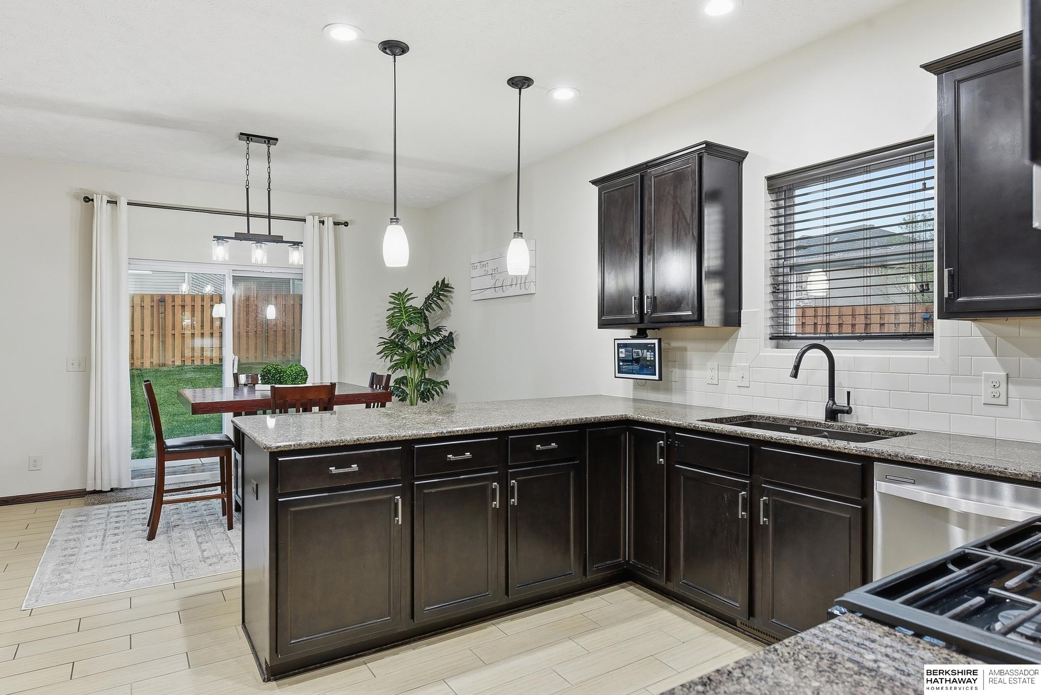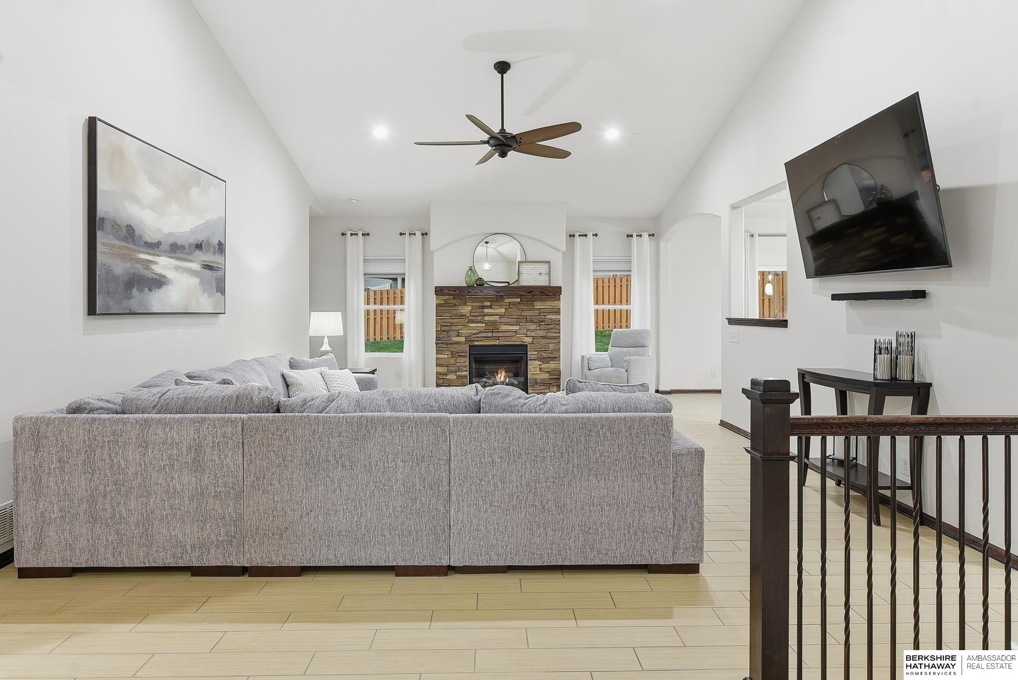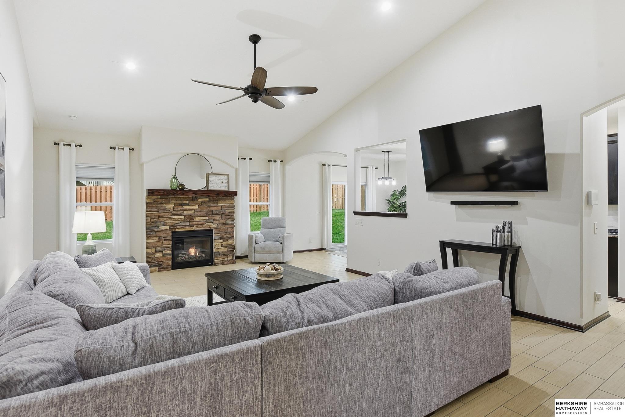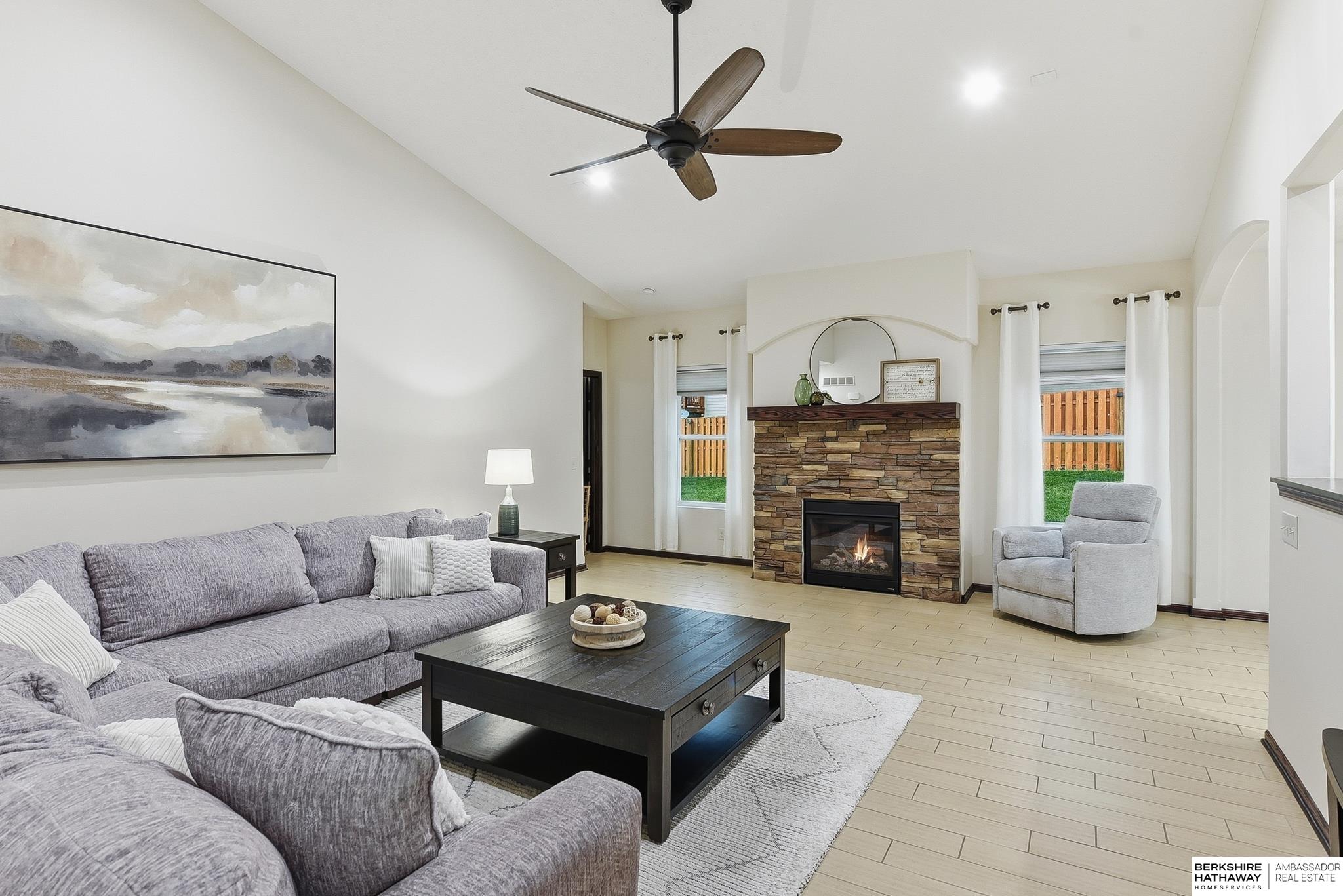 Welcome to this beautifully maintained 5 bedroom ranch on a corner lot in Pebblebrooke! This open-concept home features soaring ceilings in the great room, newer paint, and durable ceramic tile plank flooring in the main living areas. The great room offers a gas fireplace and flows into a stylish kitchen with granite, tile backsplash, stainless steel appliances, gas range, and pantry. The spacious primary suite includes barn doors to a large walk-in closet, and a bath with dual sinks, whirlpool tub, and a separate tiled shower. The finished lower level features a large family room, bedrooms 4 & 5, a bath, and a cool bonus room. Fully fenced backyard, sprinkler system, year-round exterior lighting, new humidifier and Hvac serviced for peace of mind. Home is meticulous and has lots of little extras. This is a great location with a neighborhood park, basketball court, trail and conveniently located next to the Highway 370 corridor and Gretna Schools!