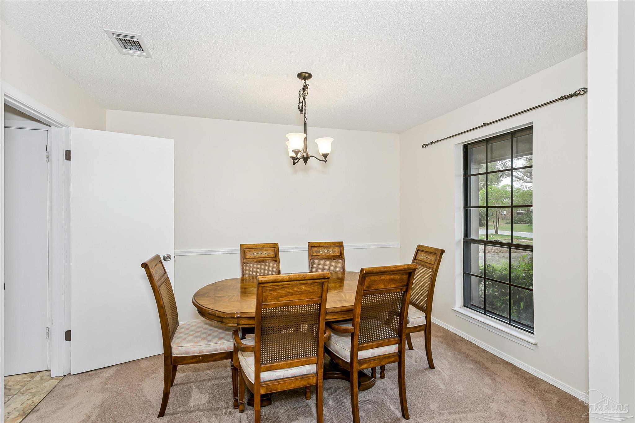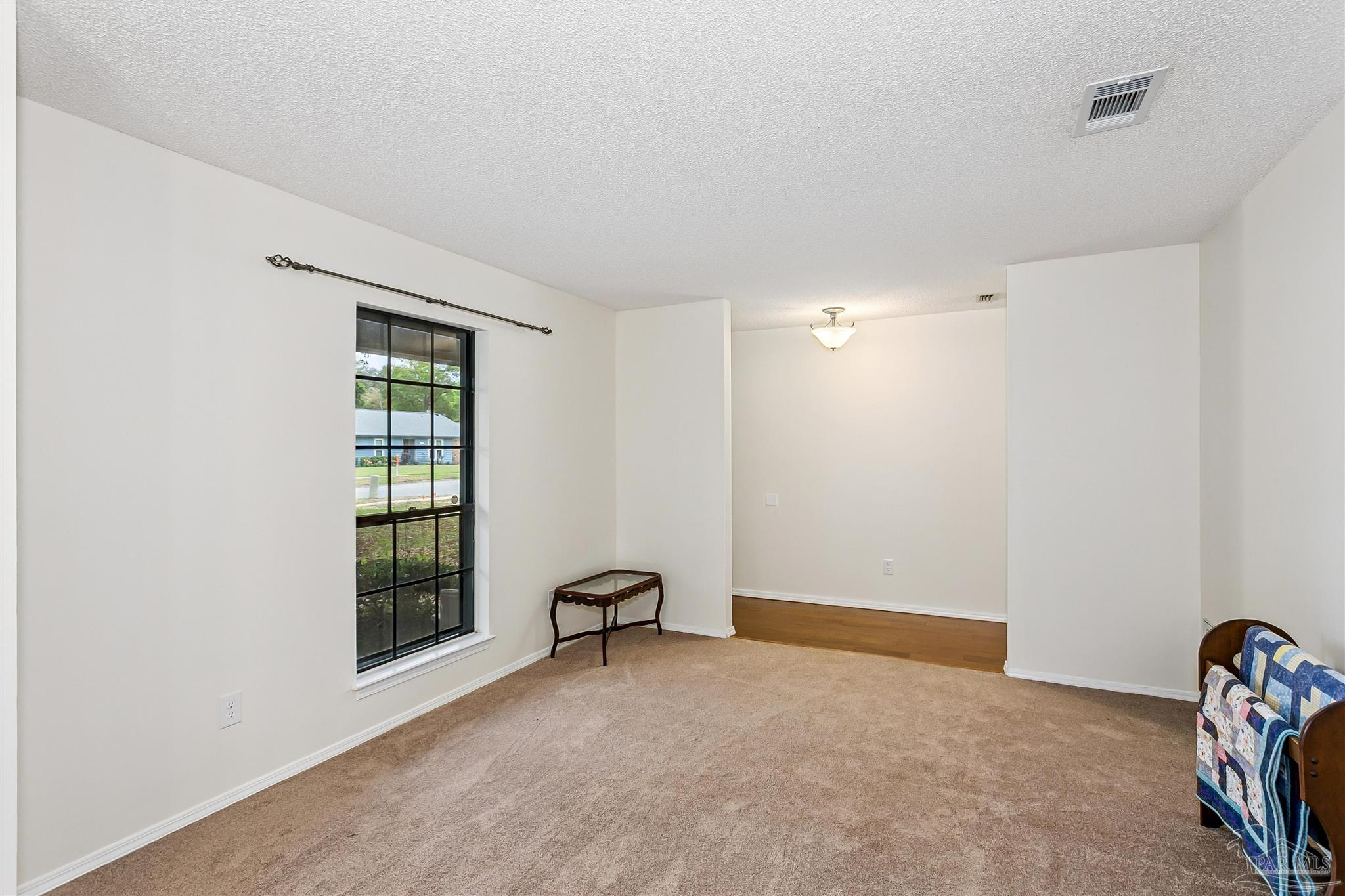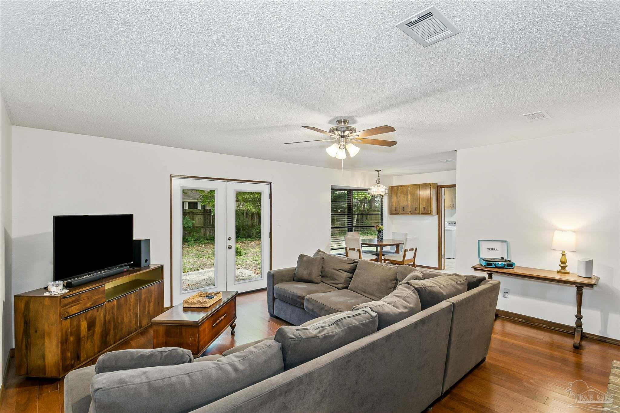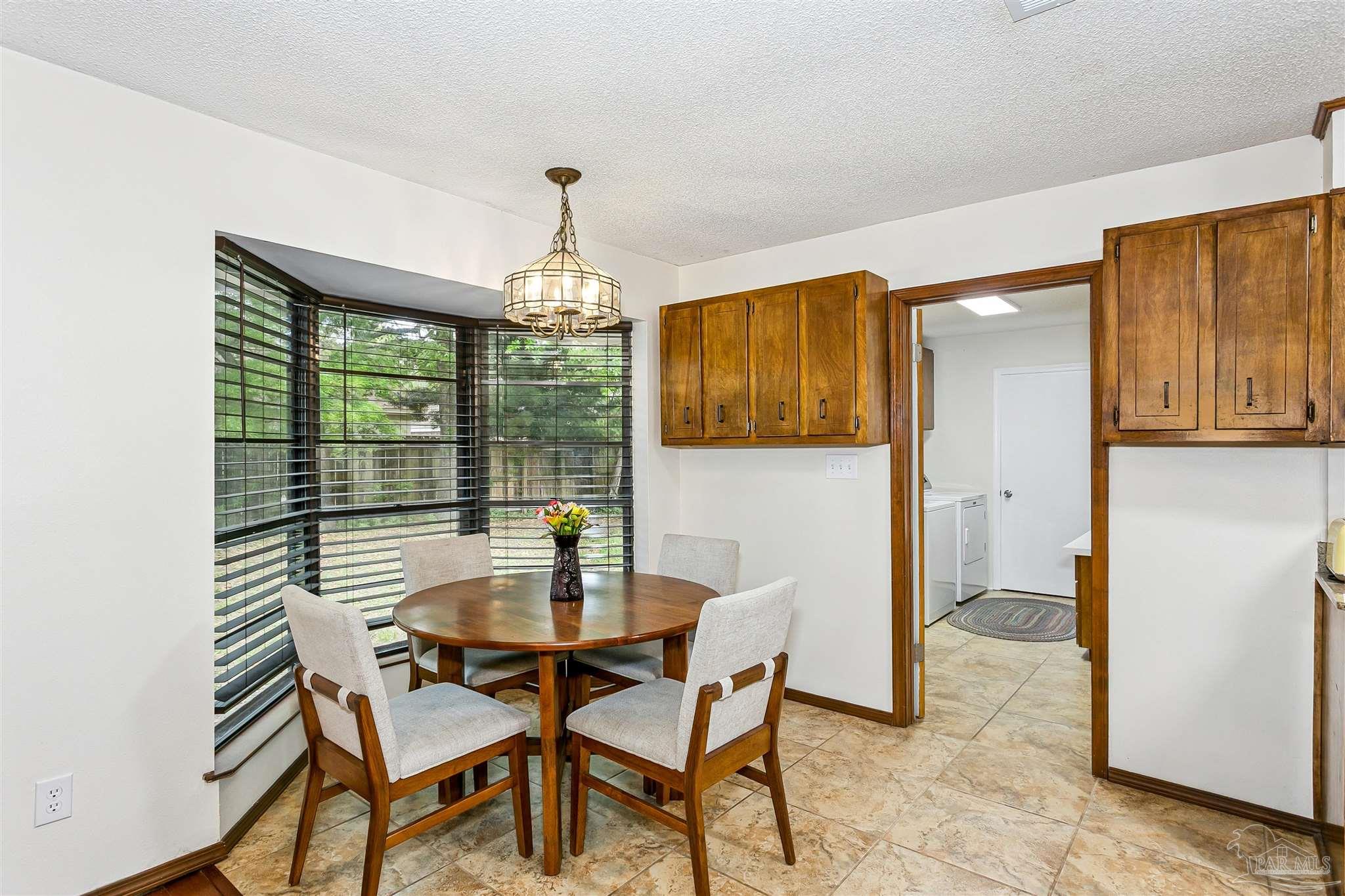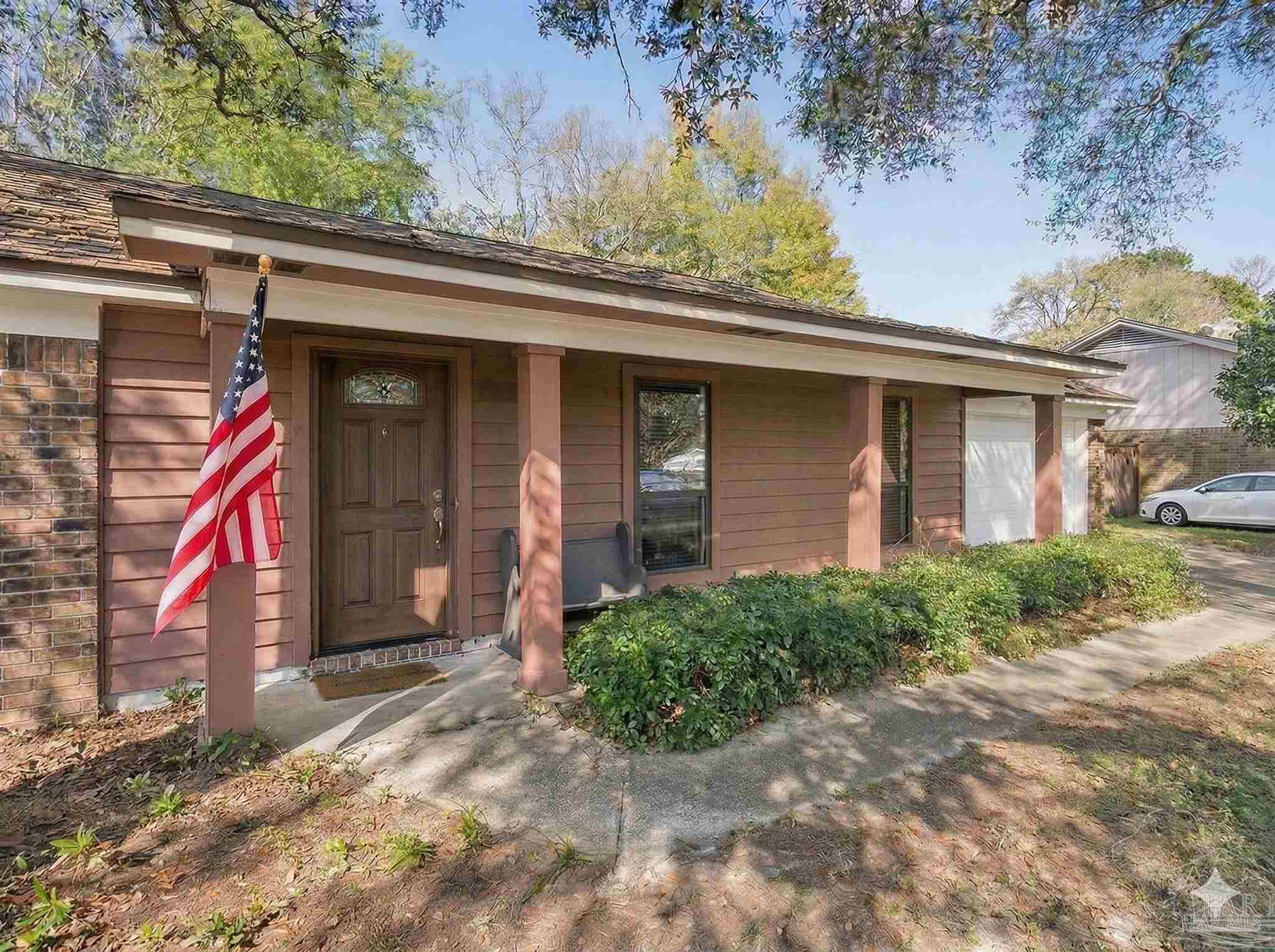 This charming 3-bedroom, 2-bath home in the sought-after Baywoods subdivision is on the market! Its rustic exterior blends natural brick with warm cedar-style siding, creating a cozy curb appeal with a welcoming covered front porch. Come and sit awhile as neighbors stroll by and wave from the sidewalk. A sprawling front lawn shaded by an oak's canopy provides a peaceful setting, while the home's large windows offer a glimpse of the bright interior spaces. Inside, you'll find an excellent floor plan with generously sized rooms and abundant storage, including a formal living and dining room that can flex as an office, playroom, or workout space. The den features a floor-to-ceiling built-in bookshelf with cabinets and a classic mantel. The kitchen boasts granite countertops, a breakfast nook, pantry, and newer stainless-steel appliances, Both bathrooms have been upgraded with granite countertops. Each bedroom includes spacious closets, and the primary suite has a walk-in closet. The home also features a laundry room with a built-in sink, a bonus storage room, and a two-car garage. Additional recent upgrades include new tile, lighting, blinds, front and sliding doors, and several newer windows. The fully fenced backyard offers plenty of space for outdoor entertaining or even a pool. Ideally located with quick access to I-10, this home is minutes from major shopping centers, restaurants, parks, and recreational areas. It also offers convenient proximity to military installations such as NAS Pensacola and Corry Station. This home combines timeless character, thoughtful upgrades, and a prime location - ready for you to make it your own.