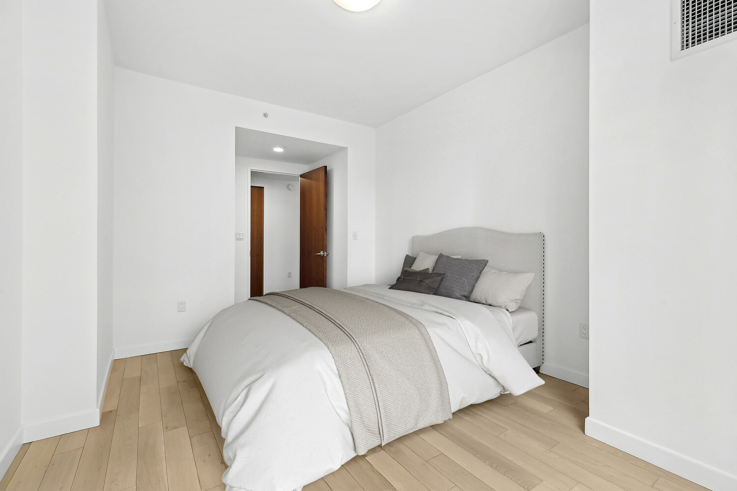 Inside, the home makes an immediate impression. Soaring 9-foot ceilings and floor-to-ceiling windows frame treetop views through southern exposure, flooding the open-concept living and kitchen area with natural light throughout the day. Upgraded blond wide-plank hardwood floors add warmth underfoot, while the seamless layout flows effortlessly between spaces - equally suited to quiet evenings in or entertaining guests.