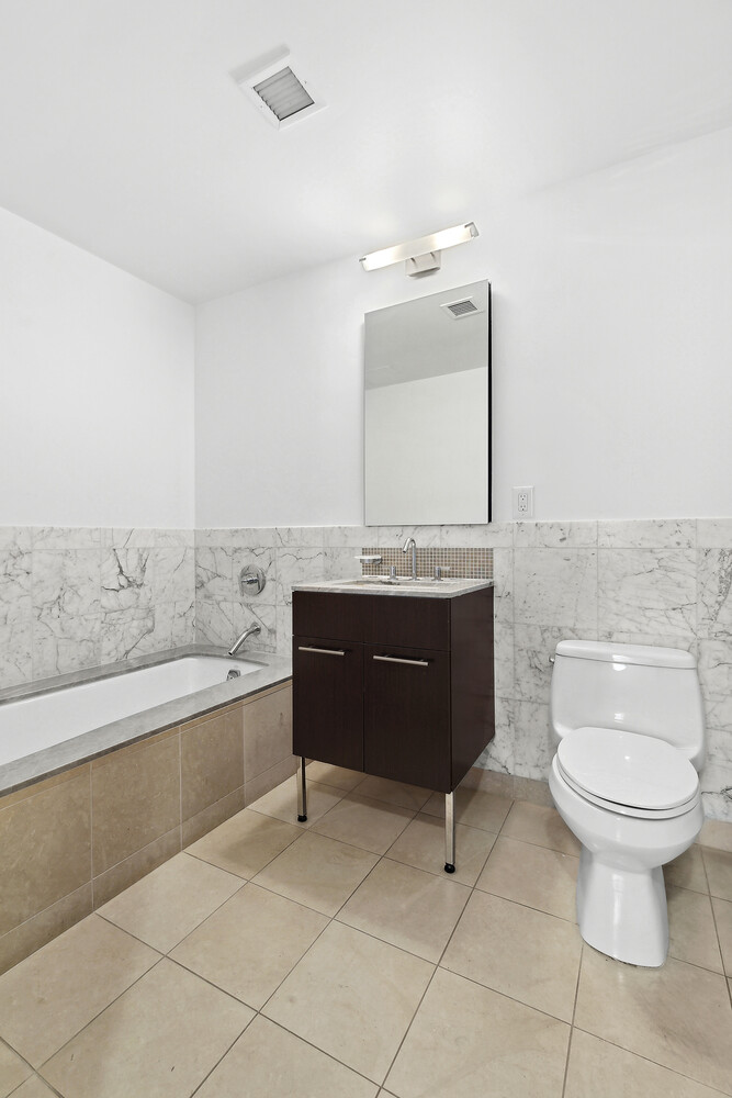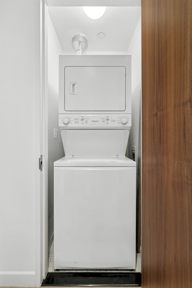 The chef's kitchen is outfitted for serious cooking: stone countertops, custom cabinetry, a Sub-Zero refrigerator, Viking gas range, and a wine cooler. The bedroom comfortably accommodates a king-sized bed with generous closet space, and the spa-calibrated bathroom - finished in marble and limestone - offers an oversized soaking tub, a separate stall shower, and a sense of calm that's hard to come by in the city. An in-unit stackable vented washer/dryer completes the picture.
