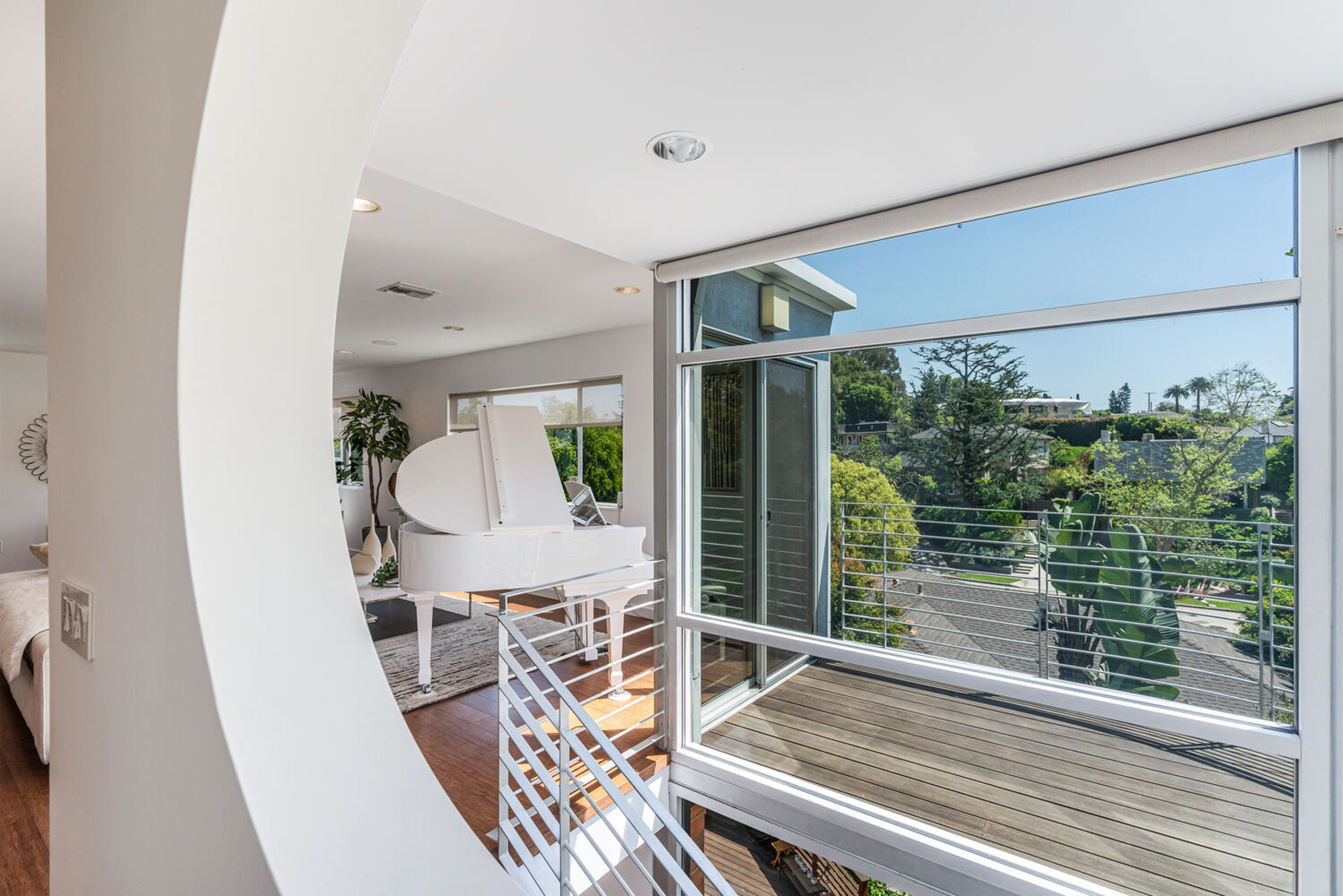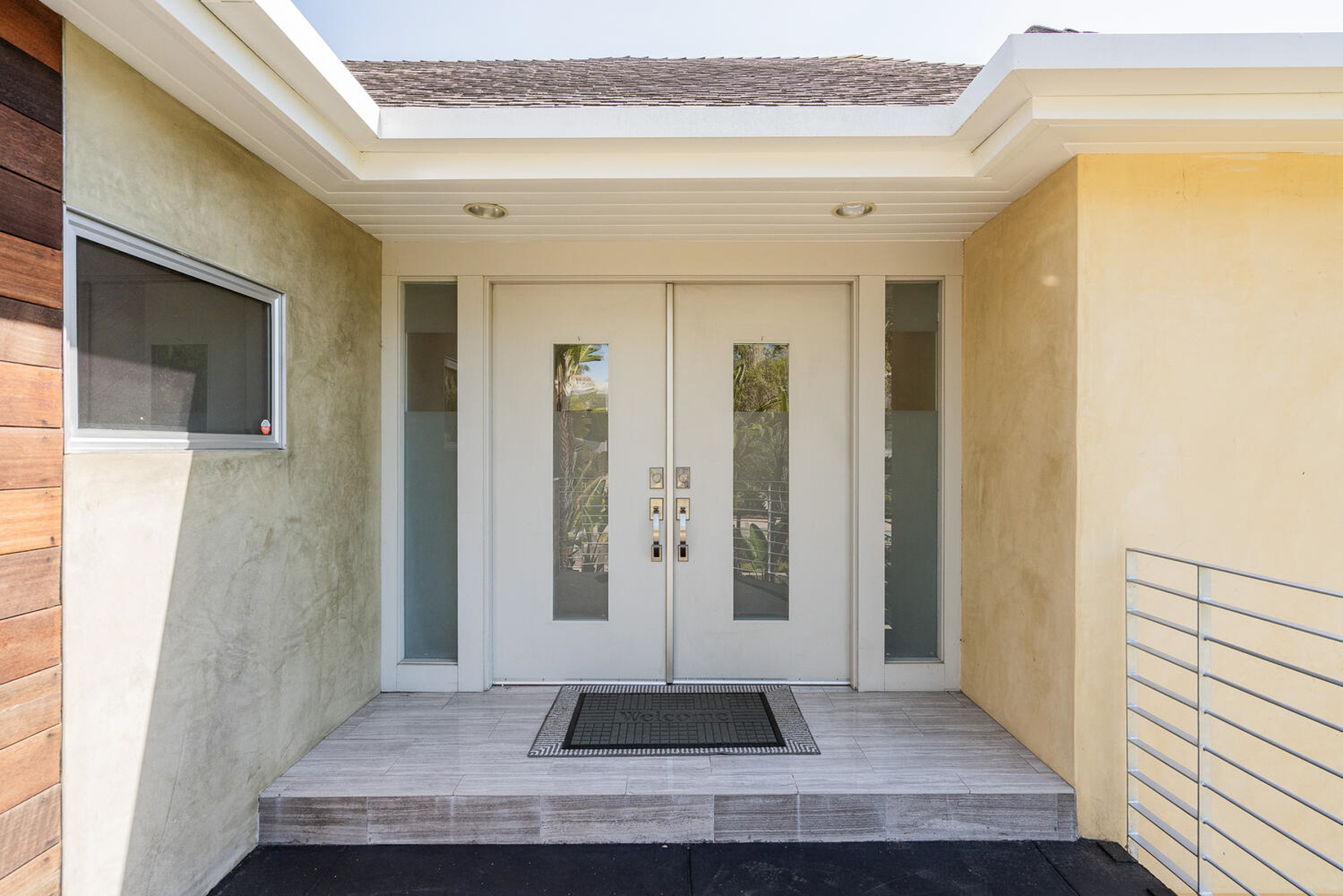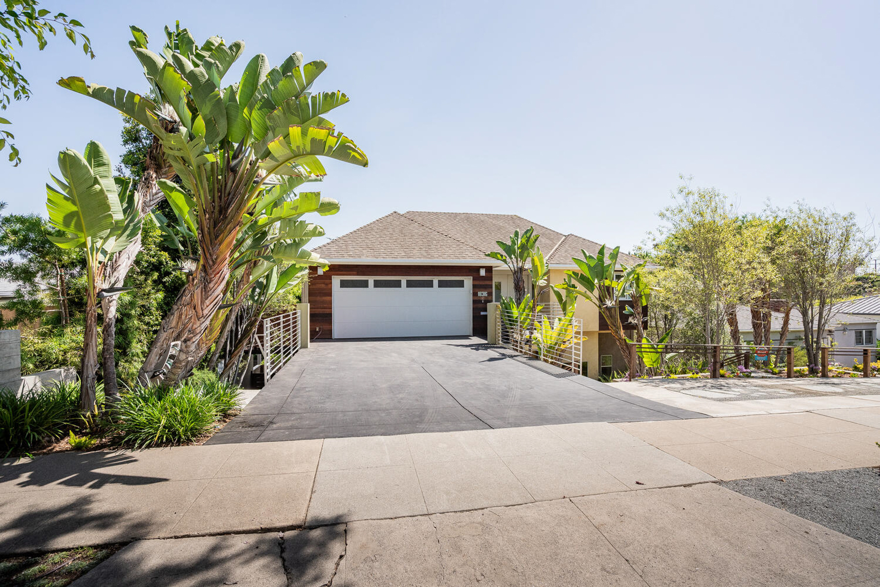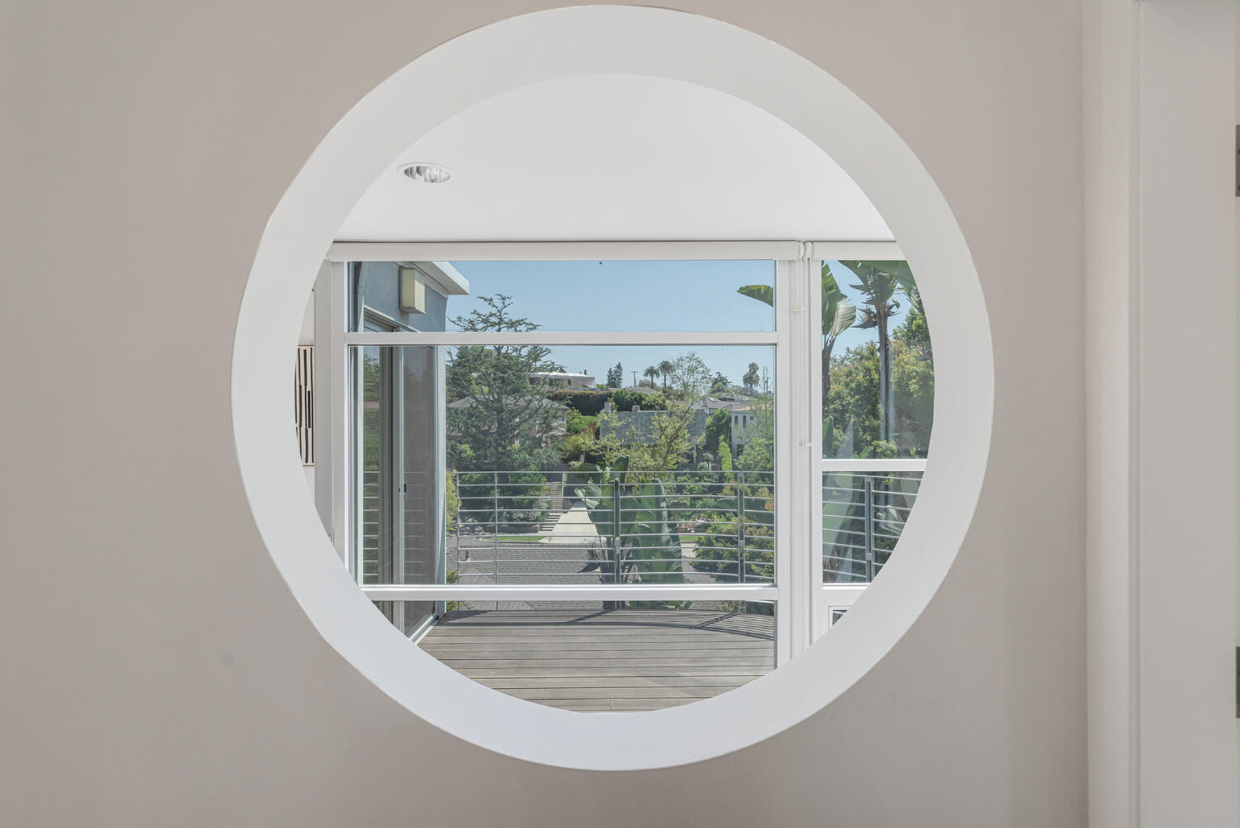 Perched on a knoll in Cheviot Hills' Monte Mar enclave, this custom architectural residence by Eric C. Chang, AIA, reveals a quiet sophistication, where an understated exterior gives way to a deeply intentional interior shaped by light, proportion, and thoughtful design. Rebuilt from the ground up in 2012-2013 and thoughtfully upgraded over the past year, the home draws inspiration from the philosophy of "round heaven, square earth," with circular and linear forms woven throughout to create a sense of harmony, balance, and flow. Sunlight fills the south-facing interiors, where open living spaces unfold with ease and continuity. The main level is conceived as a continuous living space, with living, dining, and kitchen areas flowing together, framed by expansive windows that capture soft greenery and hillside views. Circular openings and windows act as sculptural portals, establishing a quiet architectural rhythm, while a dramatic glass-enclosed stairwell introduces movement and layered perspectives across levels. Also on the main level, the primary bedroom suite offers a private retreat, complete with a spa-like bath featuring dual vanities, a soaking tub, separate shower, and two generous walk-in closets. At the heart of the home, a beautifully crafted washitsu room with tatami flooring and shoji screens offers a rare and versatile living experience, equally suited for tea gatherings, intimate dining, meditation, or yoga. Both serene and social, it reflects a lifestyle that values presence, connection, and balance. Additional tatami-accented spaces extend this design language, creating a cohesive sense of calm throughout. Designed for both active living and quiet retreat, the lower level is anchored by a family room with soaring 14-foot ceilings and a new fireplace, complemented by three en-suite bedrooms with walk-in closets, and a dedicated office positioned for privacy and flexibility, including its own entrance. Outdoors, terraced gardens and mature plantings, including tall bird of paradise, create a lush, layered setting that enhances both beauty and stability, offering inviting spaces for entertaining, play, or peaceful moments throughout the day. Located near Rancho Park Golf Course, Cheviot Hills Park, and key Westside access, this residence offers a rare balance of architectural clarity, warmth, and a lifestyle that feels at once active, connected, and quietly restorative. (Please note: Public records show 4 bathrooms, but there are actually 3 full baths, one 3-quarter bath, and a powder room. According to owner/architect, the city approved bathroom additions and signed off on the Certificate of Occupancy.)