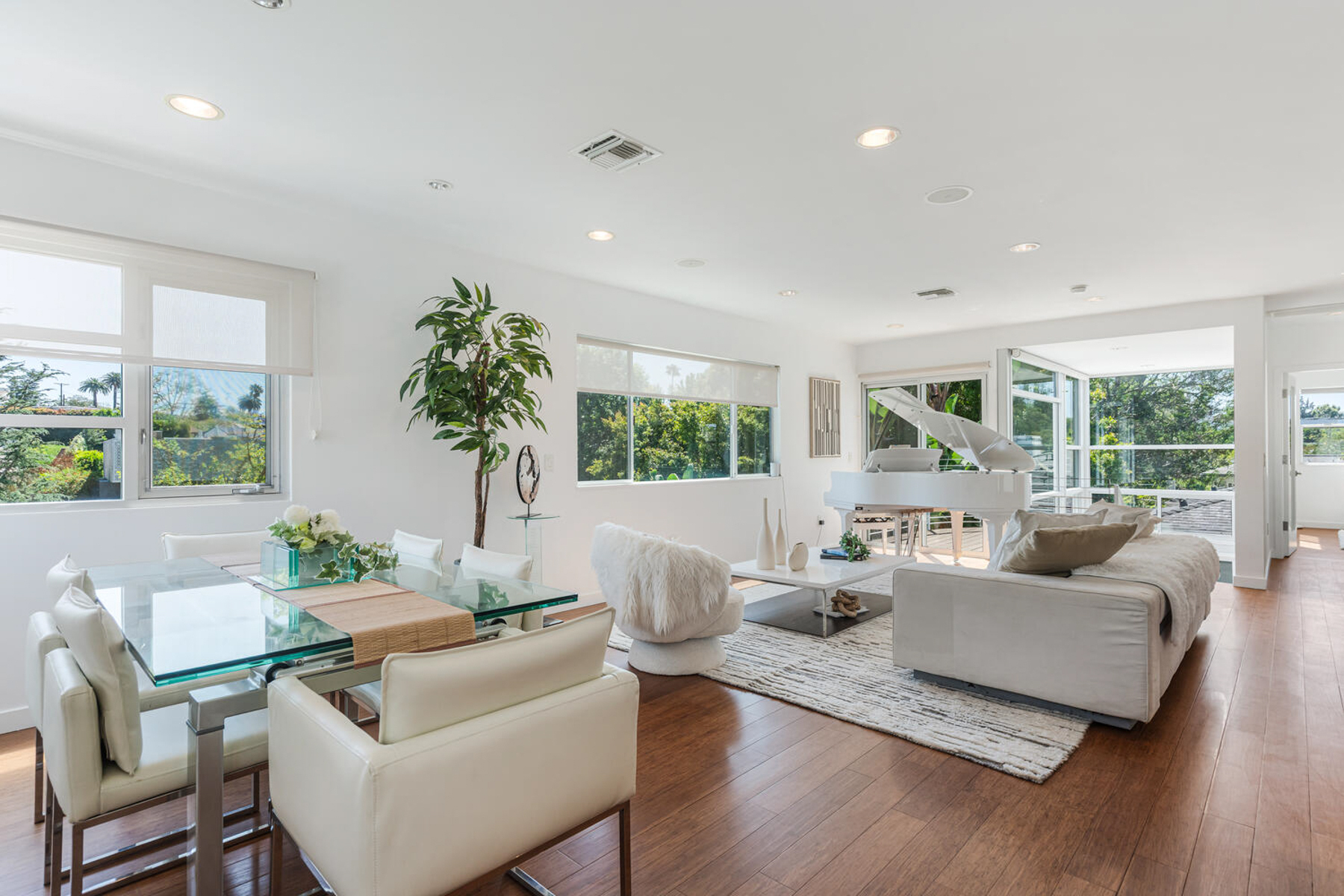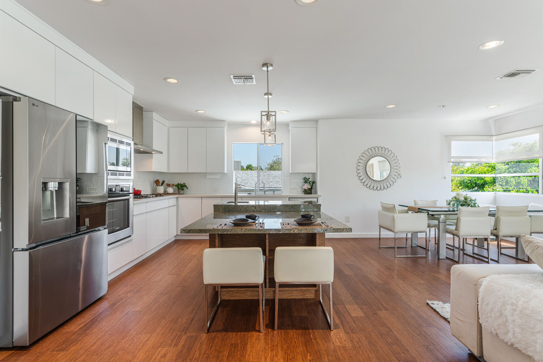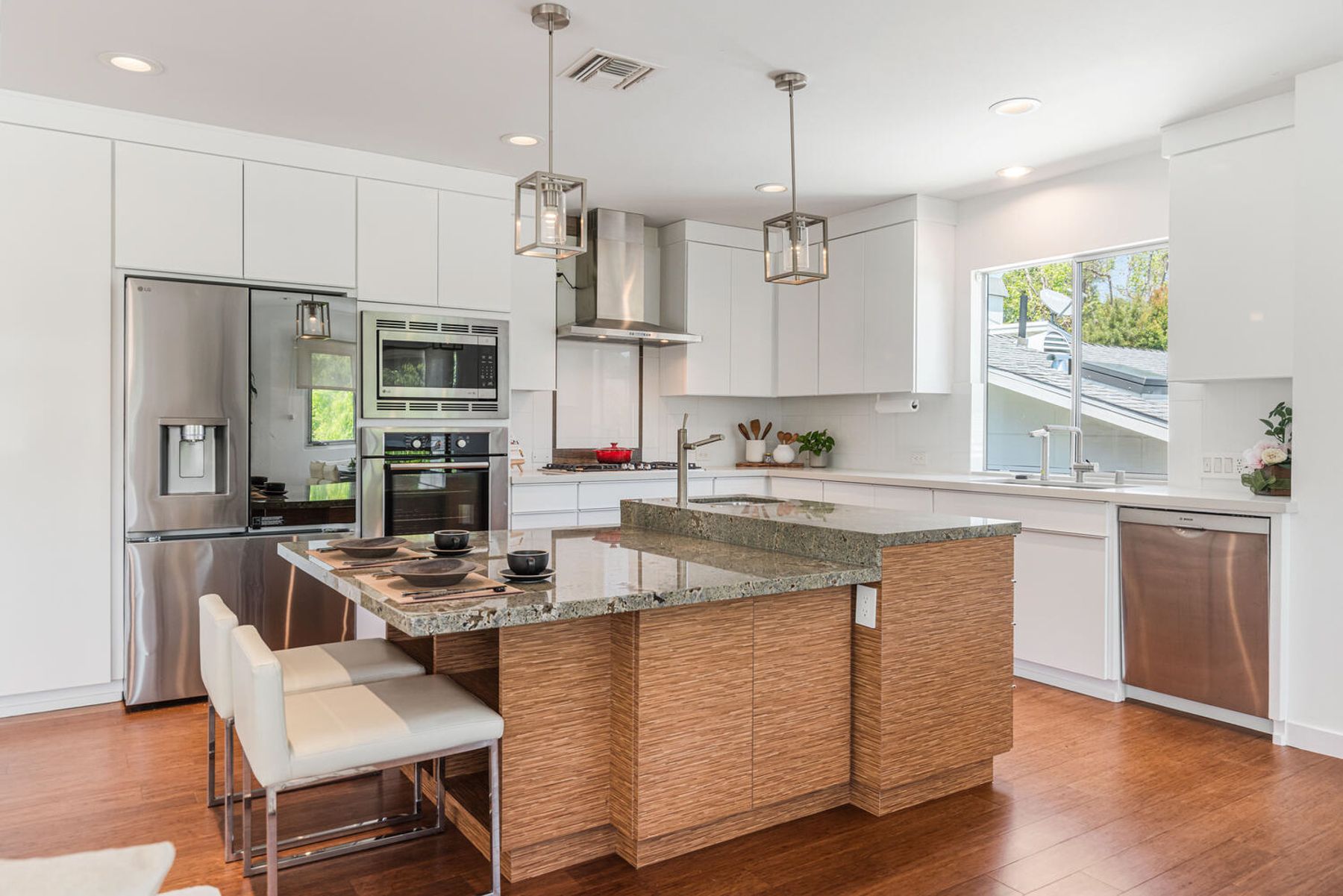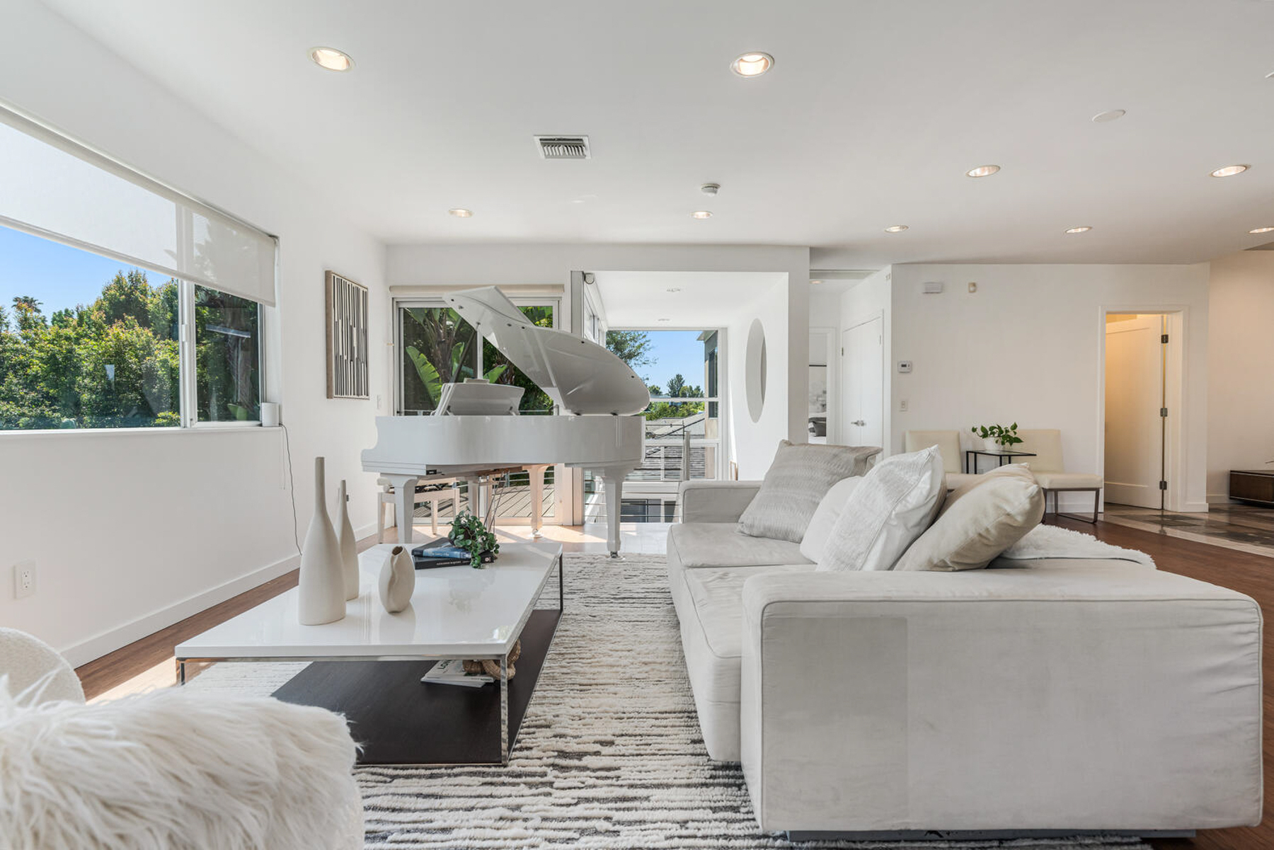 Perched on a knoll in Cheviot Hills' Monte Mar enclave, this custom architectural residence by Eric C. Chang, AIA, reveals a quiet sophistication, where an understated exterior gives way to a deeply intentional interior shaped by light, proportion, and thoughtful design. Rebuilt from the ground up in 2012-2013 and thoughtfully upgraded over the past year, the home draws inspiration from the philosophy of "round heaven, square earth," with circular and linear forms woven throughout to create a sense of harmony, balance, and flow. Sunlight fills the south-facing interiors, where open living spaces unfold with ease and continuity. The main level is conceived as a continuous living space, with living, dining, and kitchen areas flowing together, framed by expansive windows that capture soft greenery and hillside views. Circular openings and windows act as sculptural portals, establishing a quiet architectural rhythm, while a dramatic glass-enclosed stairwell introduces movement and layered perspectives across levels. Also on the main level, the primary bedroom suite offers a private retreat, complete with a spa-like bath featuring dual vanities, a soaking tub, separate shower, and two generous walk-in closets. At the heart of the home, a beautifully crafted washitsu room with tatami flooring and shoji screens offers a rare and versatile living experience, equally suited for tea gatherings, intimate dining, meditation, or yoga. Both serene and social, it reflects a lifestyle that values presence, connection, and balance. Additional tatami-accented spaces extend this design language, creating a cohesive sense of calm throughout. Designed for both active living and quiet retreat, the lower level is anchored by a family room with soaring 14-foot ceilings and a new fireplace, complemented by three en-suite bedrooms with walk-in closets, and a dedicated office positioned for privacy and flexibility, including its own entrance. Outdoors, terraced gardens and mature plantings, including tall bird of paradise, create a lush, layered setting that enhances both beauty and stability, offering inviting spaces for entertaining, play, or peaceful moments throughout the day. Located near Rancho Park Golf Course, Cheviot Hills Park, and key Westside access, this residence offers a rare balance of architectural clarity, warmth, and a lifestyle that feels at once active, connected, and quietly restorative. (Please note: Public records show 4 bathrooms, but there are actually 3 full baths, one 3-quarter bath, and a powder room. According to owner/architect, the city approved bathroom additions and signed off on the Certificate of Occupancy.)