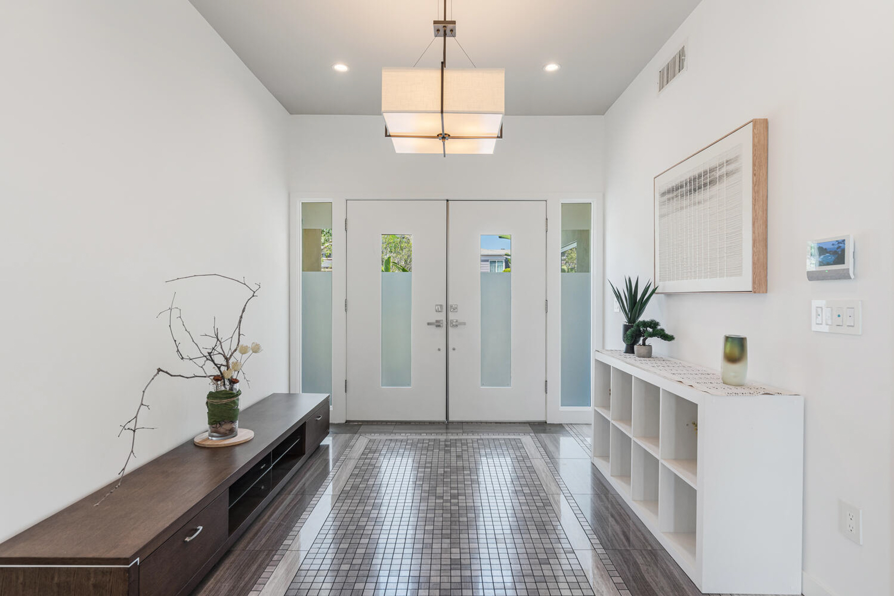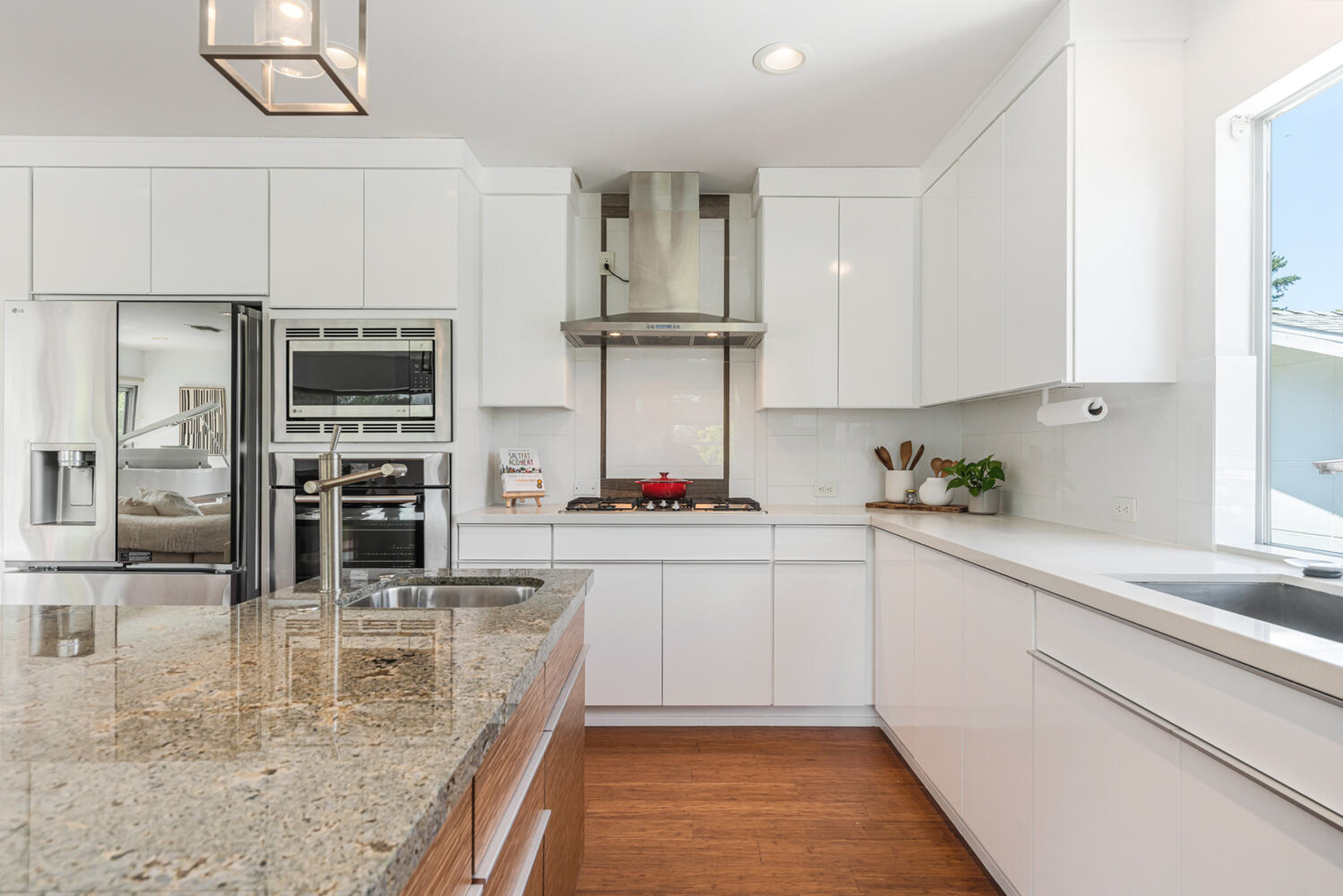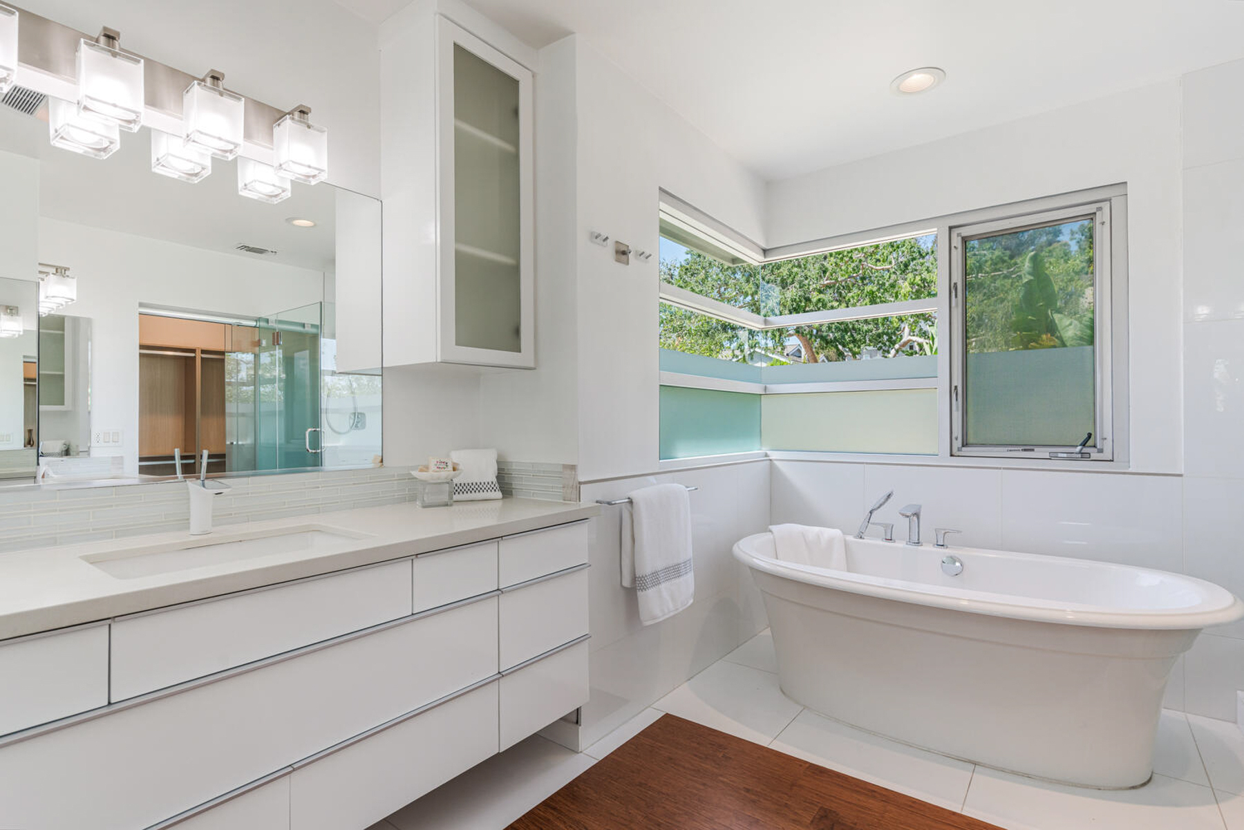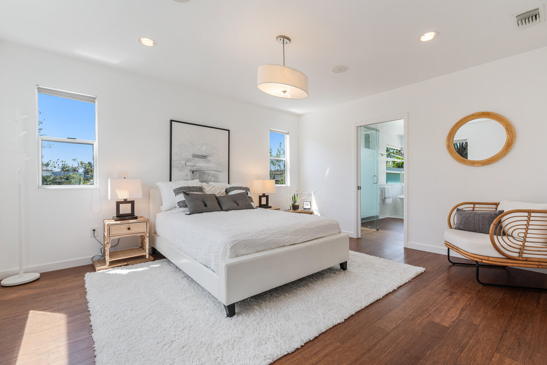 Perched on a knoll in Cheviot Hills' Monte Mar enclave, this custom architectural residence by Eric C. Chang, AIA, reveals a quiet sophistication, where an understated exterior gives way to a deeply intentional interior shaped by light, proportion, and thoughtful design. Rebuilt from the ground up in 2012-2013 and thoughtfully upgraded over the past year, the home draws inspiration from the philosophy of "round heaven, square earth," with circular and linear forms woven throughout to create a sense of harmony, balance, and flow. Sunlight fills the south-facing interiors, where open living spaces unfold with ease and continuity. The main level is conceived as a continuous living space, with living, dining, and kitchen areas flowing together, framed by expansive windows that capture soft greenery and hillside views. Circular openings and windows act as sculptural portals, establishing a quiet architectural rhythm, while a dramatic glass-enclosed stairwell introduces movement and layered perspectives across levels. Also on the main level, the primary bedroom suite offers a private retreat, complete with a spa-like bath featuring dual vanities, a soaking tub, separate shower, and two generous walk-in closets. At the heart of the home, a beautifully crafted washitsu room with tatami flooring and shoji screens offers a rare and versatile living experience, equally suited for tea gatherings, intimate dining, meditation, or yoga. Both serene and social, it reflects a lifestyle that values presence, connection, and balance. Additional tatami-accented spaces extend this design language, creating a cohesive sense of calm throughout. Designed for both active living and quiet retreat, the lower level is anchored by a family room with soaring 14-foot ceilings and a new fireplace, complemented by three en-suite bedrooms with walk-in closets, and a dedicated office positioned for privacy and flexibility, including its own entrance. Outdoors, terraced gardens and mature plantings, including tall bird of paradise, create a lush, layered setting that enhances both beauty and stability, offering inviting spaces for entertaining, play, or peaceful moments throughout the day. Located near Rancho Park Golf Course, Cheviot Hills Park, and key Westside access, this residence offers a rare balance of architectural clarity, warmth, and a lifestyle that feels at once active, connected, and quietly restorative. (Please note: Public records show 4 bathrooms, but there are actually 3 full baths, one 3-quarter bath, and a powder room. According to owner/architect, the city approved bathroom additions and signed off on the Certificate of Occupancy.)