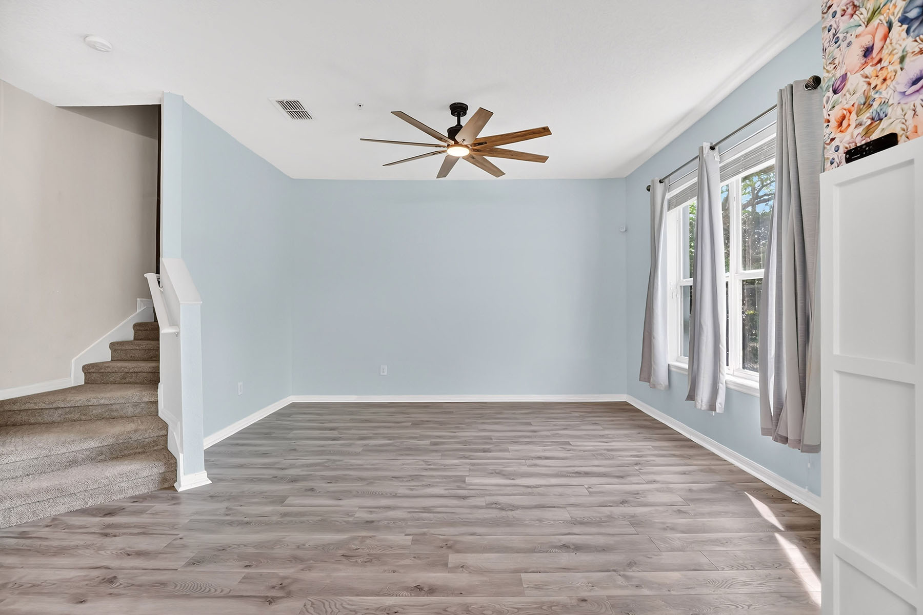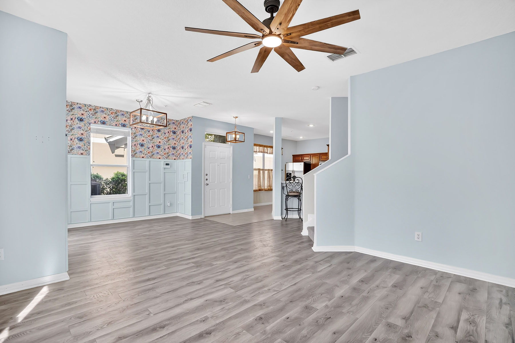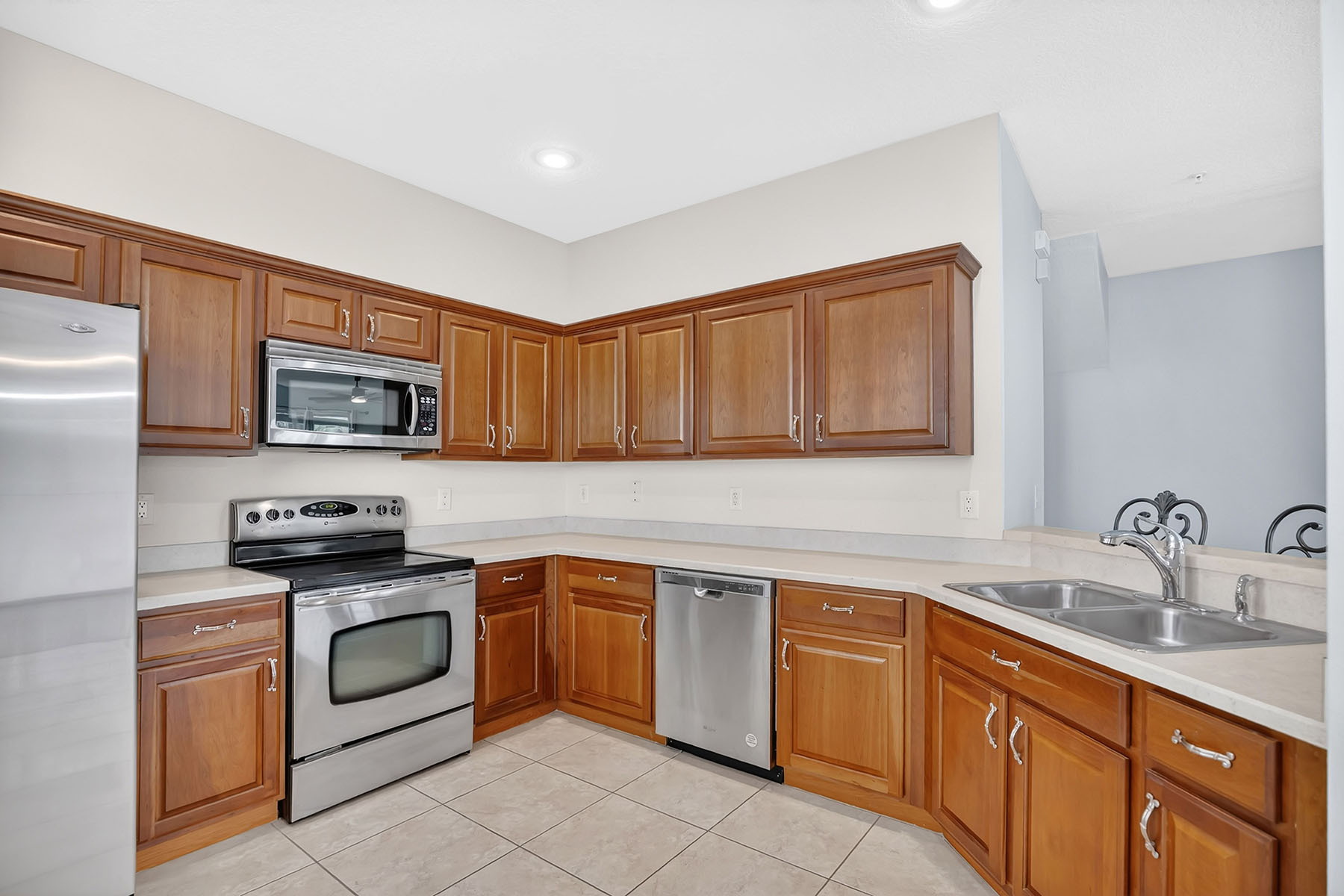 Welcome to this beautifully updated townhome-style condominium in Flagship Park, located right in the heart of everything you need while still offering a quiet, private setting. This three-bedroom, 2.5-bath unit features a well-designed floor plan with a full two-car garage providing you direct private entry inside with keyless garage entry, giving it a true townhome-style layout. Inside, the home is filled with natural light, creating a bright and comfortable living space. The kitchen features stainless steel appliances (dishwasher 2022), a pantry closet to hold all your dry goods, and a convenient breakfast bar with seating. The large window brightens the open kitchen and overlooks the great room for your main living and dining room spaces. Just off the kitchen, there is a small flex space that would make a great corner work/study area or additional storage space. It could also be a great spot for all your pet's needs. The dining area features a custom board and batten accent wall with floral wallpaper and a new light fixture, giving a stylish, modern touch. Lots of updates include newer stairwell carpet, new 10-millimeter laminate wood flooring, a fully renovated primary bathroom (2022) with dual sinks set into a beautiful marble-top vanity, a newer roof (2023), updated lighting fixtures and modern ceiling fans (2023). In addition, the home is equipped with an owned security system, doorbell camera, garage camera and fire sprinklers for added safety and peace of mind. Sliding glass doors lead to an outdoor sitting area that overlooks the water, offering a serene place to kick back and relax. Enjoy a peaceful setting every day with no rear neighbors and a beautiful pond view. The home also offers ample storage with a dedicated laundry room featuring shelving and an additional nook. The community features a pool and a small picnic area. The condo fee includes water, cable, internet, lawn care, exterior pest control, sewer and trash, offering low-maintenance living. Near SR 417, Interstate 4, tons of shopping, dining and major hospitals, this community makes it so easy to get anywhere you need to go while enjoying being tucked away from it all.
