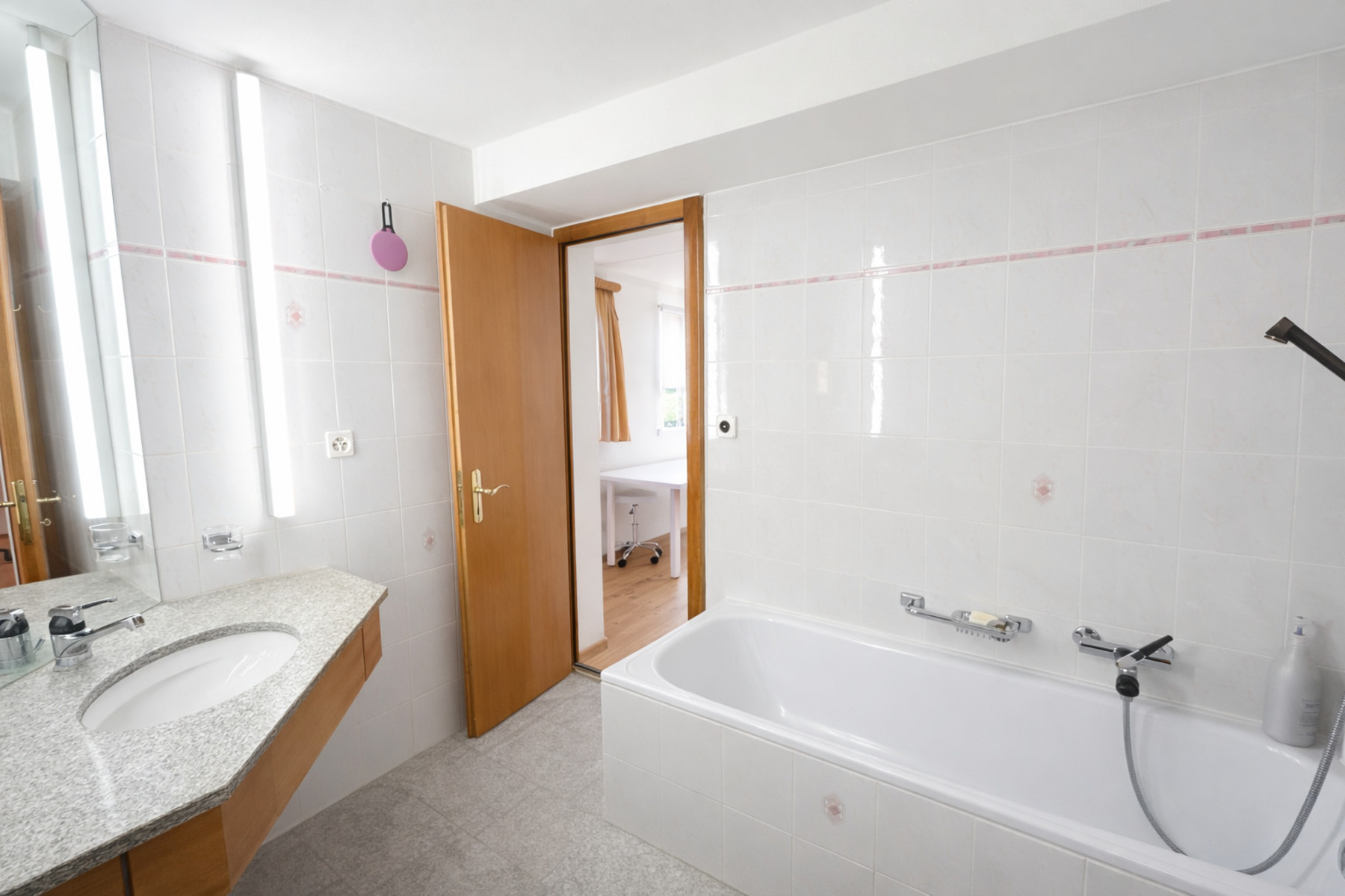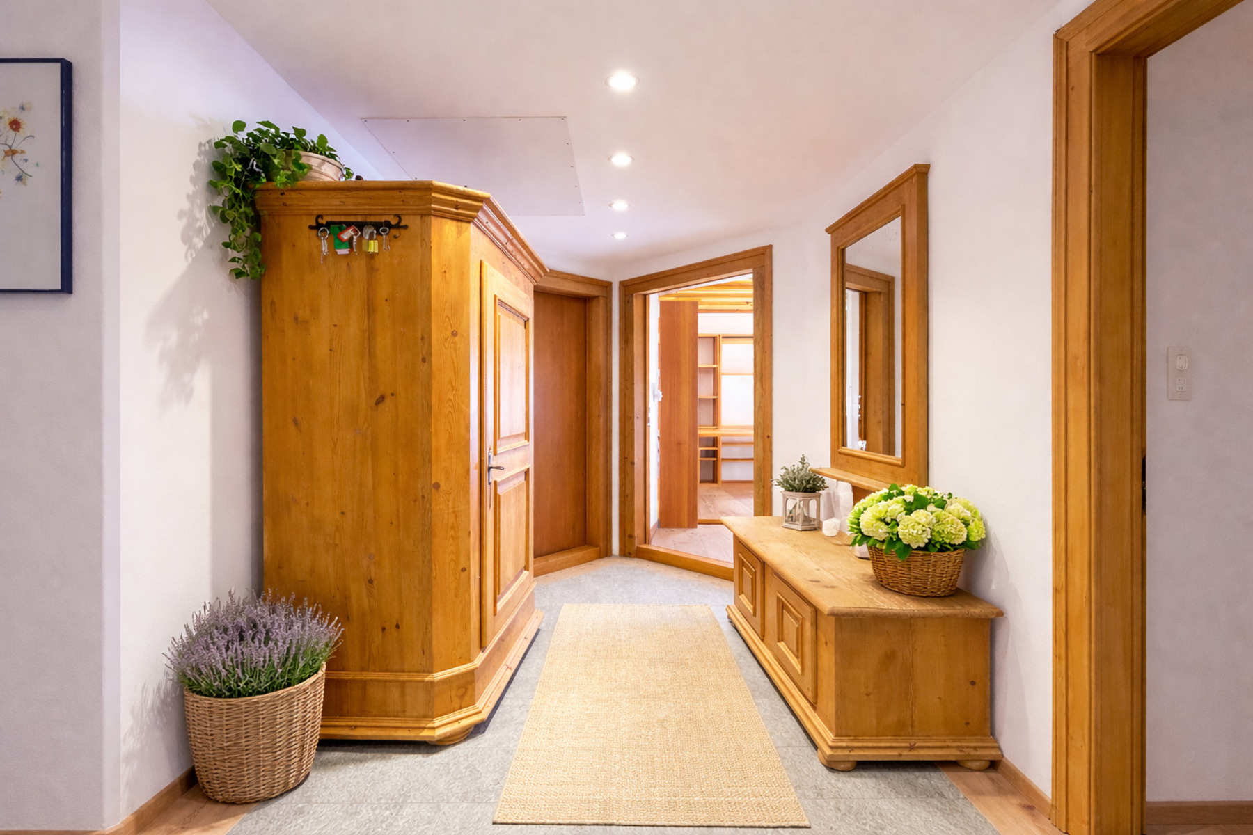 Upon entering, you are welcomed by a spacious entrance area with a practical built-in wardrobe, featuring a harmonious combination of stone and wooden flooring.