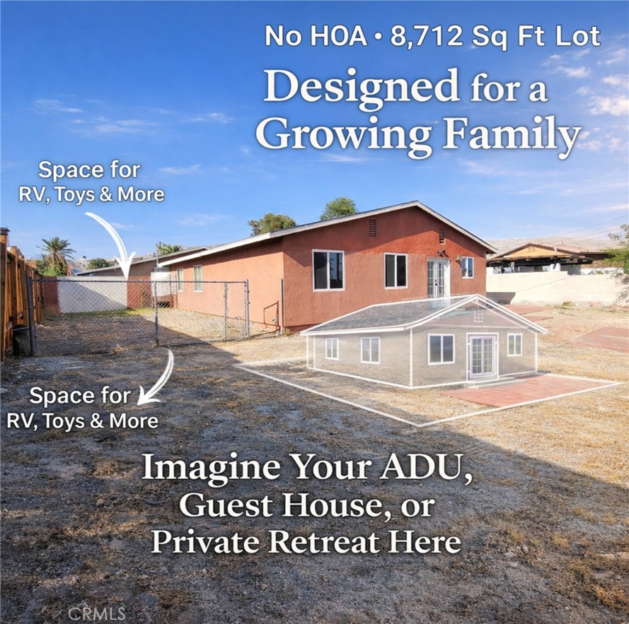 Room to grow, space to expand, and a place to call home. ...Welcome to 65941 Acoma Ave. - a home that blends comfort, functionality, and future potential - all in one inviting space designed for growing families. Located in a convenient Desert Hot Springsq, a hidden gem known for warm mineral springs. This home offers the everyday ease today's families are looking for, with room to expand and make it truly your own. Step inside to a bright, open-concept layout where the living and dining areas flow seamlessly together - perfect for both daily living and hosting. Natural light fills the space, while thoughtfully arranged living areas create a warm and welcoming environment. The living room invites you to relax and unwind, with a layout that feels both connected and defined - ideal for family time or entertaining guests. Just beyond, the dining area becomes a natural gathering place, ready for everything from weeknight dinners to special occasions. What truly sets this property apart is its versatility and potential. With ample outdoor space, this home presents an excellent opportunity for RV parking - a rare and valuable feature in the area - as well as the possibility to add an ADU (Accessory Dwelling Unit). Whether you're thinking multi-generational living, rental income, or creating a private guest retreat, the options here are wide open. The backyard offers a blank canvas ready to be transformed into your own private oasis - imagine outdoor entertaining areas, play space for kids, or future expansion. Conveniently located near schools, parks, and local amenities, this home supports a lifestyle of ease and accessibility - making it an ideal choice for families looking to grow into their next chapter.