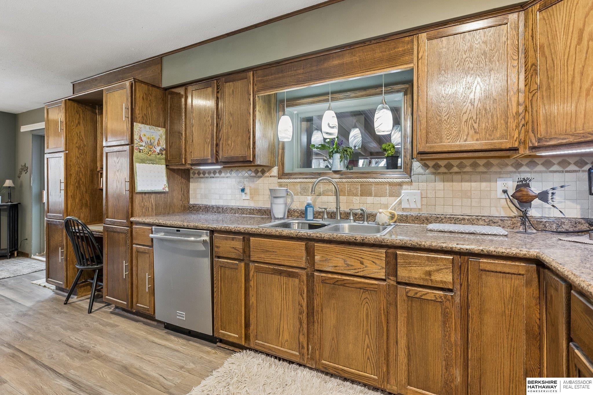 Charming all-brick ranch in a well-established Omaha neighborhood, offering a great blend of comfort and character. The main level features a spacious living area with a cozy fireplace and large windows for natural light, flowing into the dining area and kitchen with ample cabinetry and a convenient built-in desk space. The finished lower level is truly the highlight of this home, designed for entertaining and relaxation. Featuring a custom bar area and a layout that naturally flows for entertaining or unwinding, this space offers a unique, inviting atmosphere. The layout provides flexibility for a rec room, game area, or additional living space. With solid construction and a functional layout, this home offers both charm and opportunity in a desirable location.