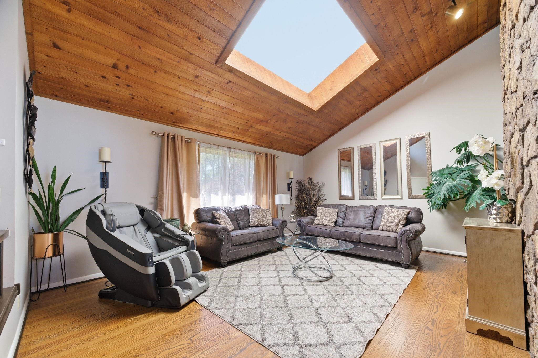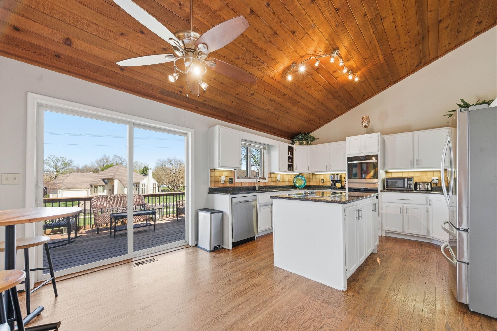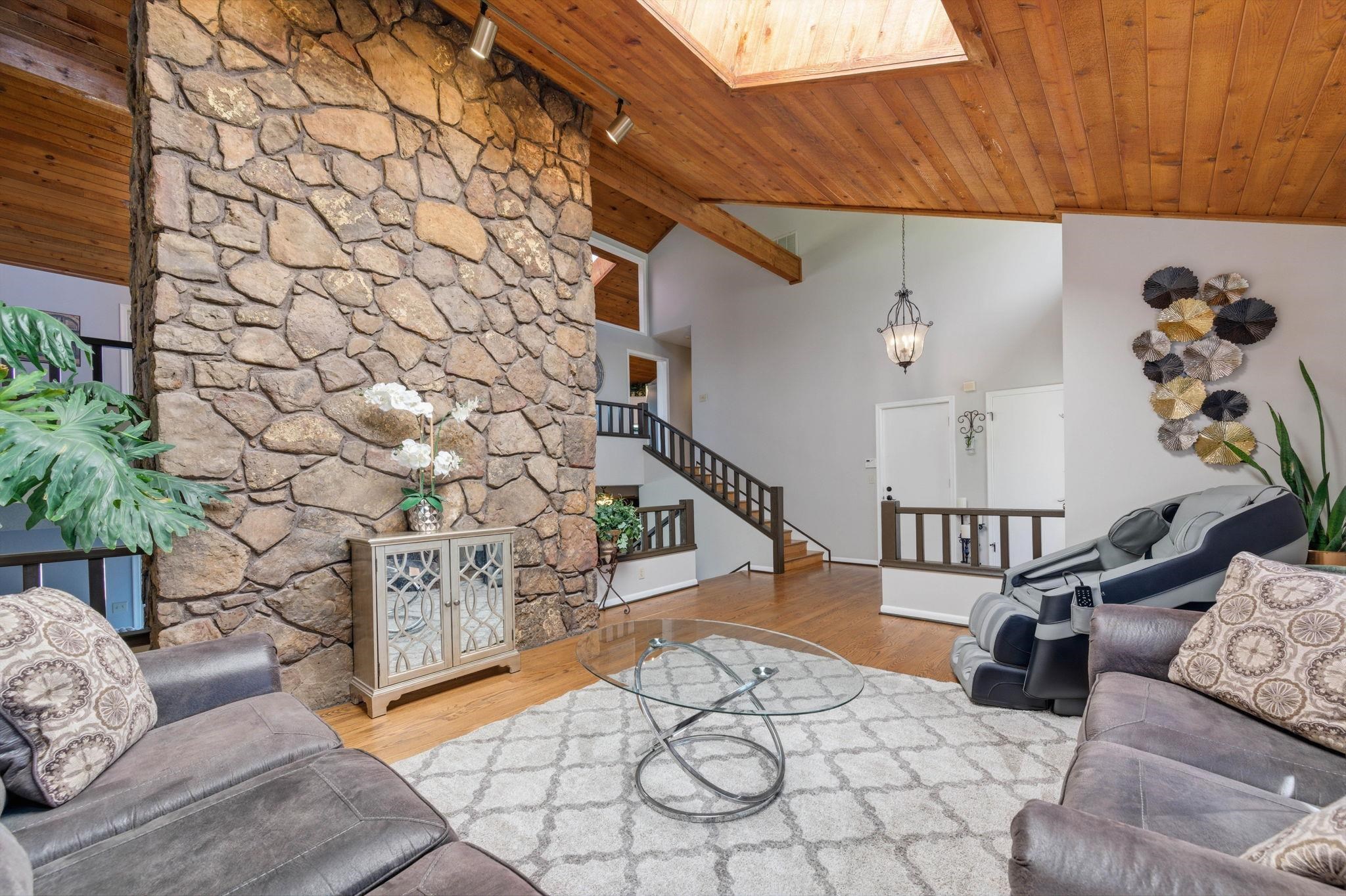 Backyard sunsets and golf course views set the tone for this standout property backing directly to Tallgrass Golf Course. Enjoy your own private retreat with an in-ground pool, raised deck, and newly fenced yard, creating a space designed for both relaxation and entertaining. Inside, the home makes an immediate impression with a dramatic floor-to-ceiling fireplace that extends from the main level to the third story, anchoring the open-concept living area. Natural light fills the space, highlighting vaulted ceilings and a layout that flows seamlessly from the living room to the kitchen and dining areas. The kitchen features granite countertops, vaulted ceilings, and an eat-in dining space, along with a separate formal dining room ideal for hosting. Just off the main living area, the deck overlooks the backyard and pool, making indoor-outdoor living effortless. The primary suite is a true retreat with vaulted ceilings, its own private sitting area, fireplace, walk-in closet, and an en suite bath complete with a separate shower and jacuzzi tub. Upstairs, you'll find 2 additional bedrooms, 1 with two closets and a spacious loft area, offering flexibility for a second living space, office, or creative area. The 4th bedroom is on the lower level. Recent updates include a freshly painted interior, new backyard fencing, tree removal to open up the lot, and professionally installed foundation piers for long-term stability. Additional highlights include abundant storage throughout and a large driveway. This home combines architectural character, functional space, and a premier golf course setting - ready for its next owner to enjoy.