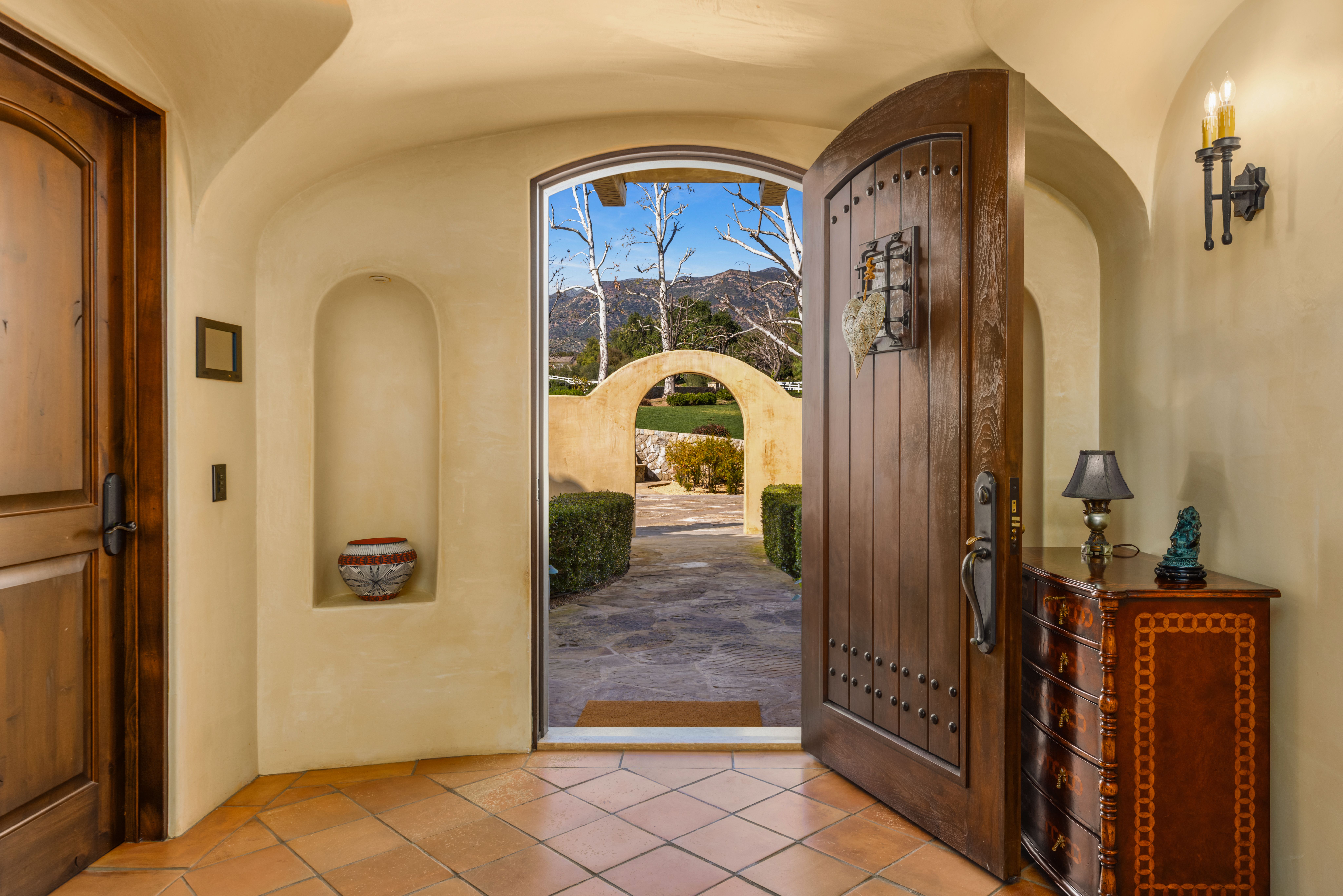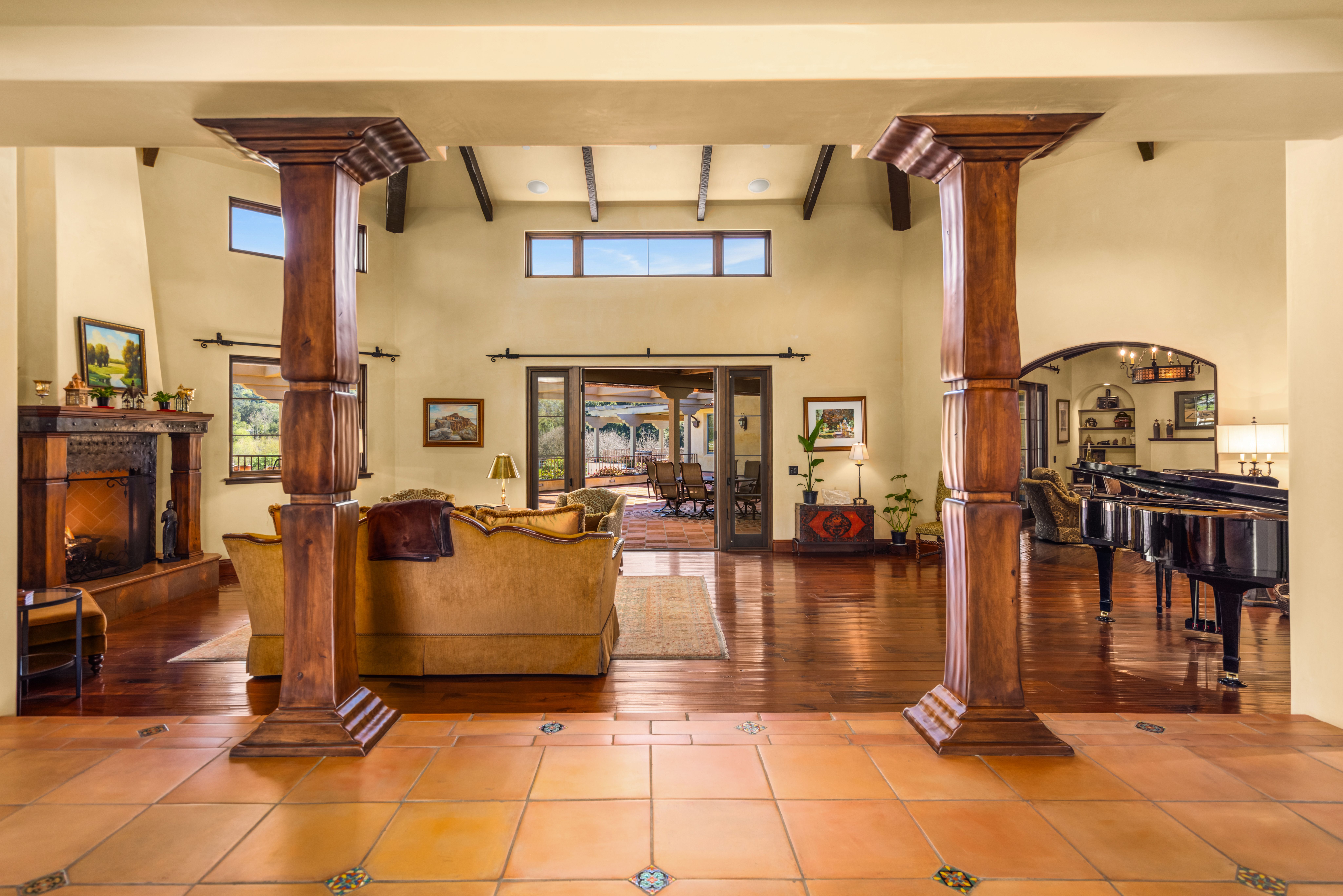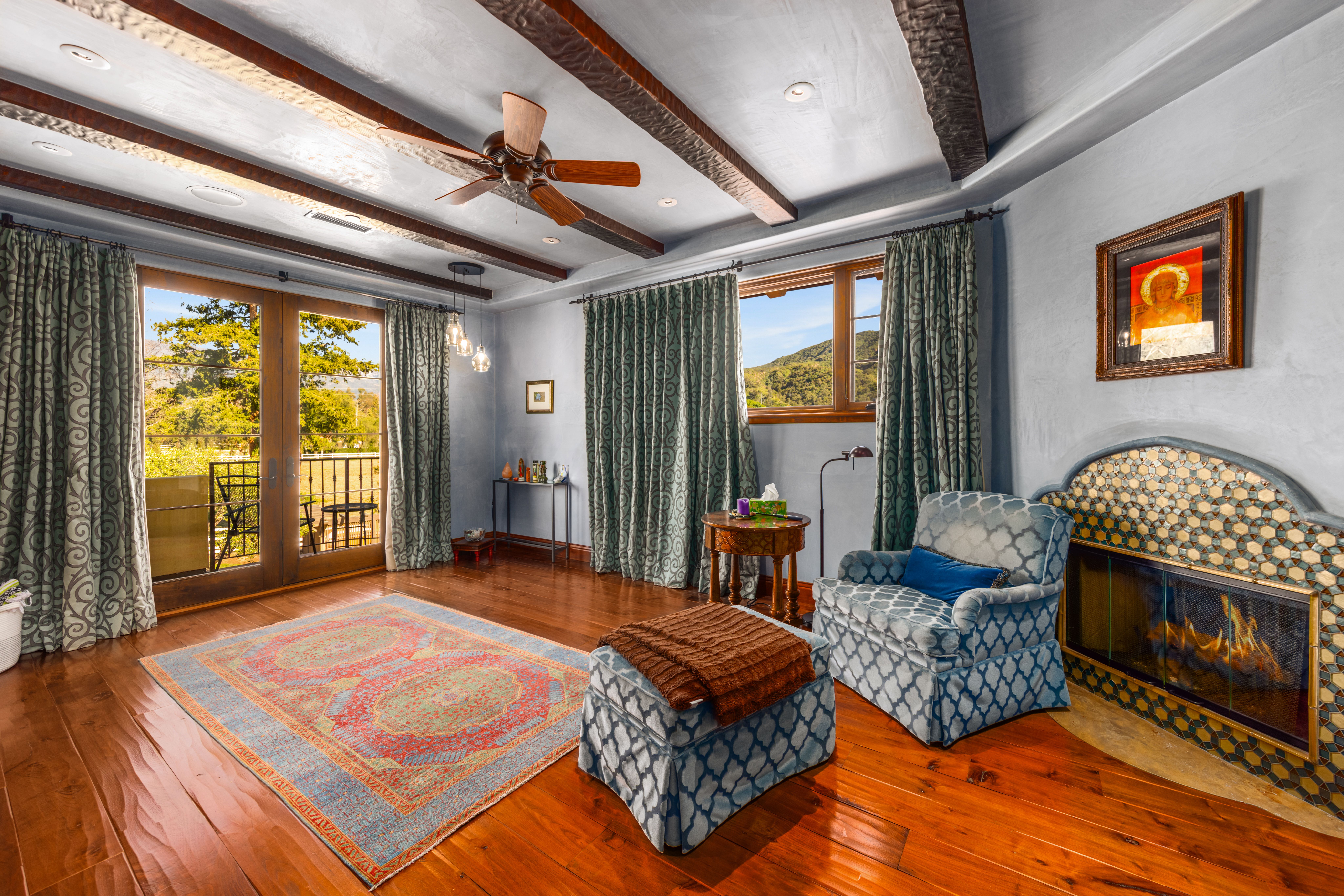 Set on approximately 3.88 acres in the Ojai Valley, Casa Vista Linda is a masterfully designed Mediterranean residence with distinctive Moroccan influences, where architectural artistry and refined materials create a home of quiet sophistication. Hand-hewn beams, richly finished walnut floors, and artisan tileworkmany elements crafted by local Ojai makersbring warmth and authenticity to expansive interiors filled with natural light and framed mountain views. Thoughtfully scaled living and dining spaces, a well-appointed kitchen that opens seamlessly to terraces, and multiple fireplaces throughout offer an atmosphere that is both elegant and inviting. Private bedroom suites, a loft retreat, dedicated office, and versatile lower-level living and wellness spaces provide flexibility for a variety of lifestyles. Outdoors, resort-caliber amenities include a grotto-style pool and spa, meditative labyrinth, curated gardens, and generous patios designed for relaxation and entertaining amid serene surroundings. A rare offering that pairs exceptional craftsmanship, privacy, and timeless Ojai beauty with effortless indoor-outdoor living.