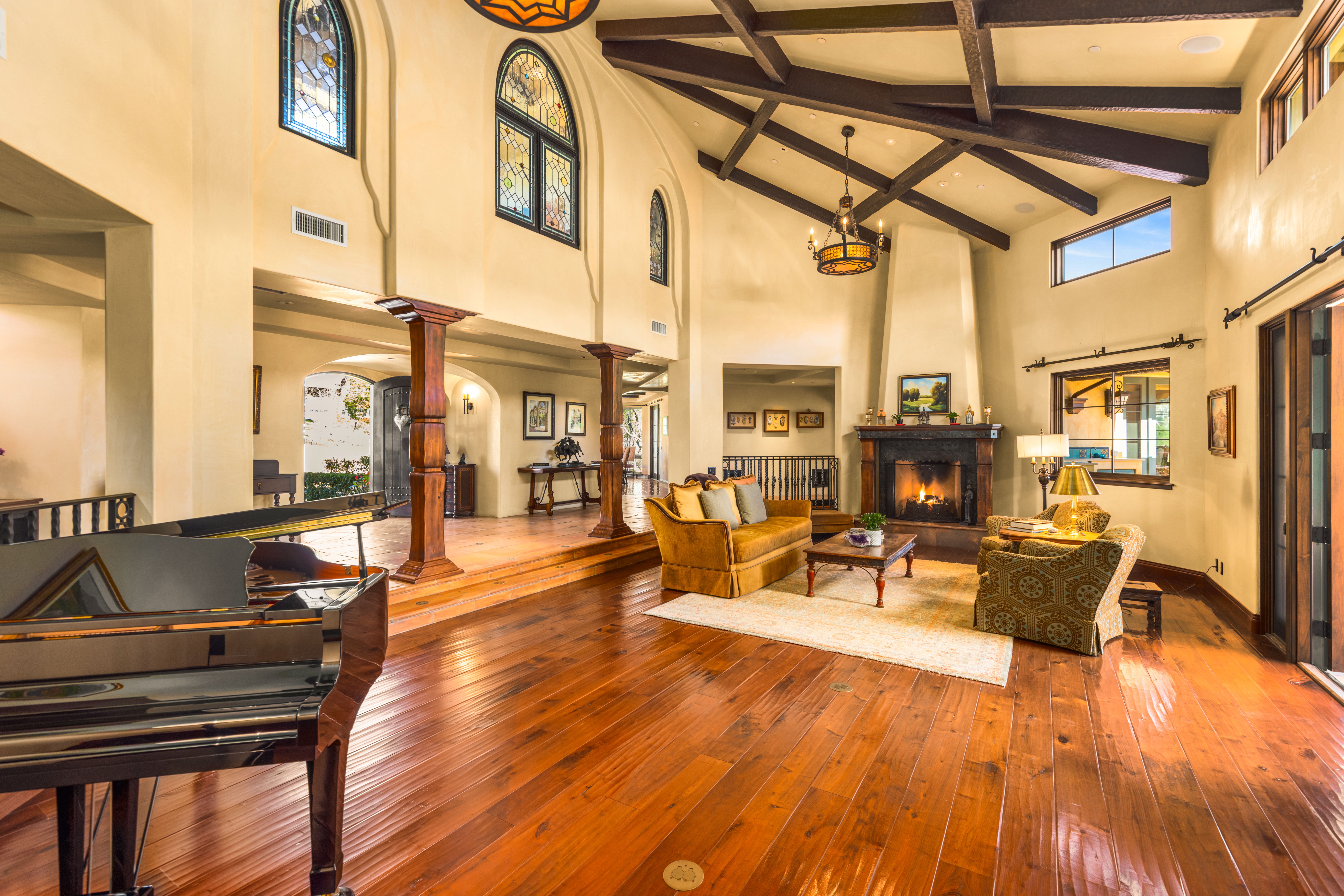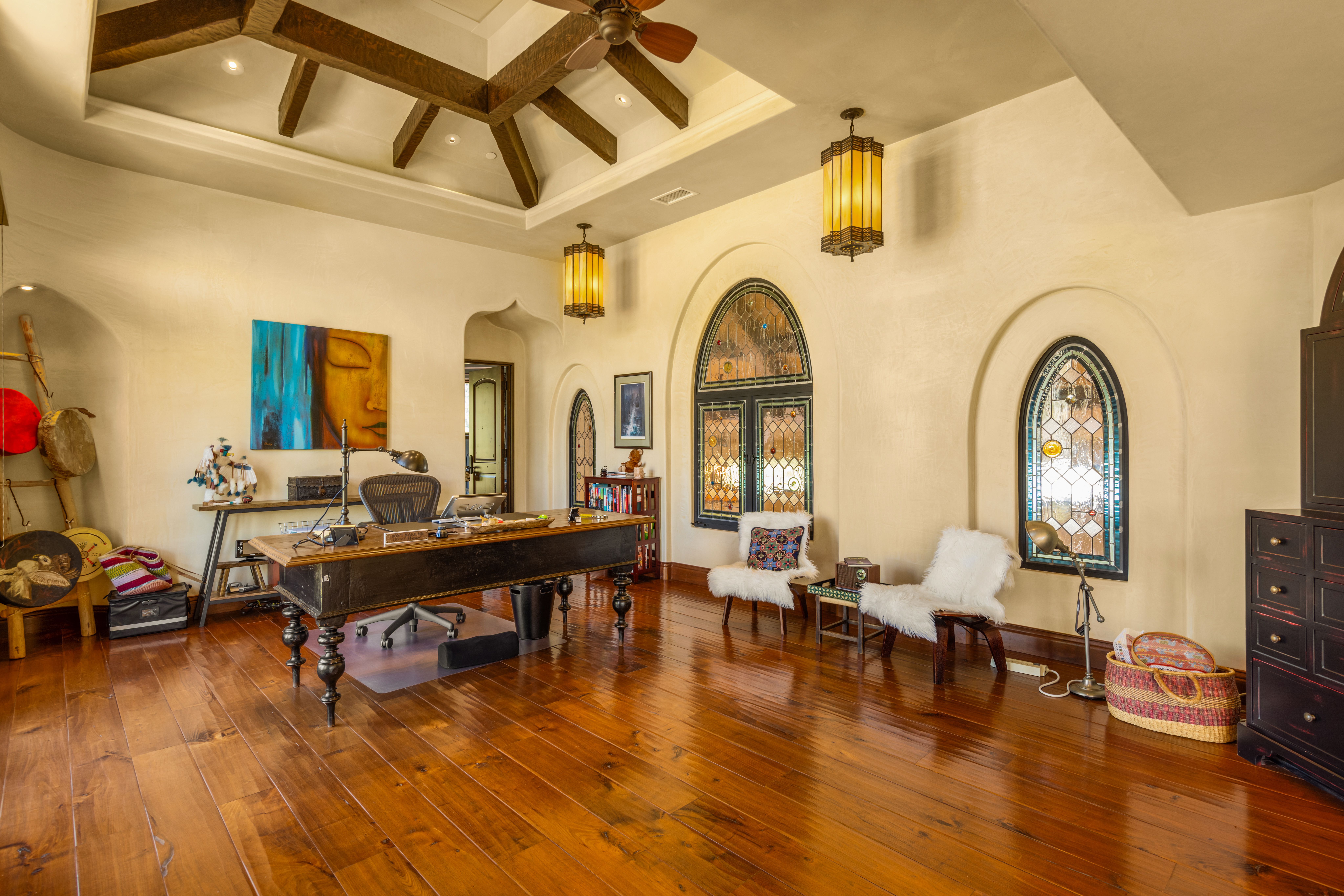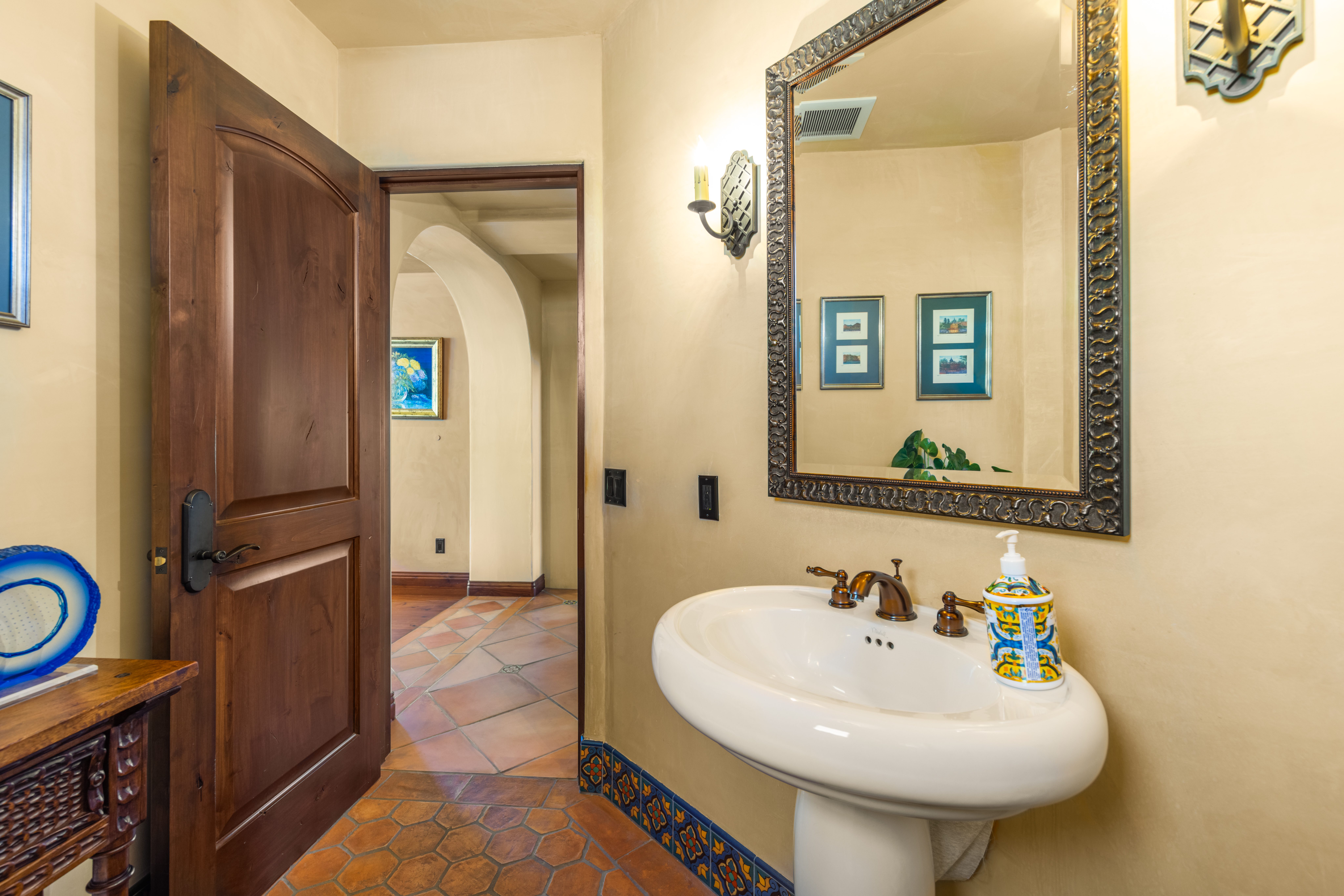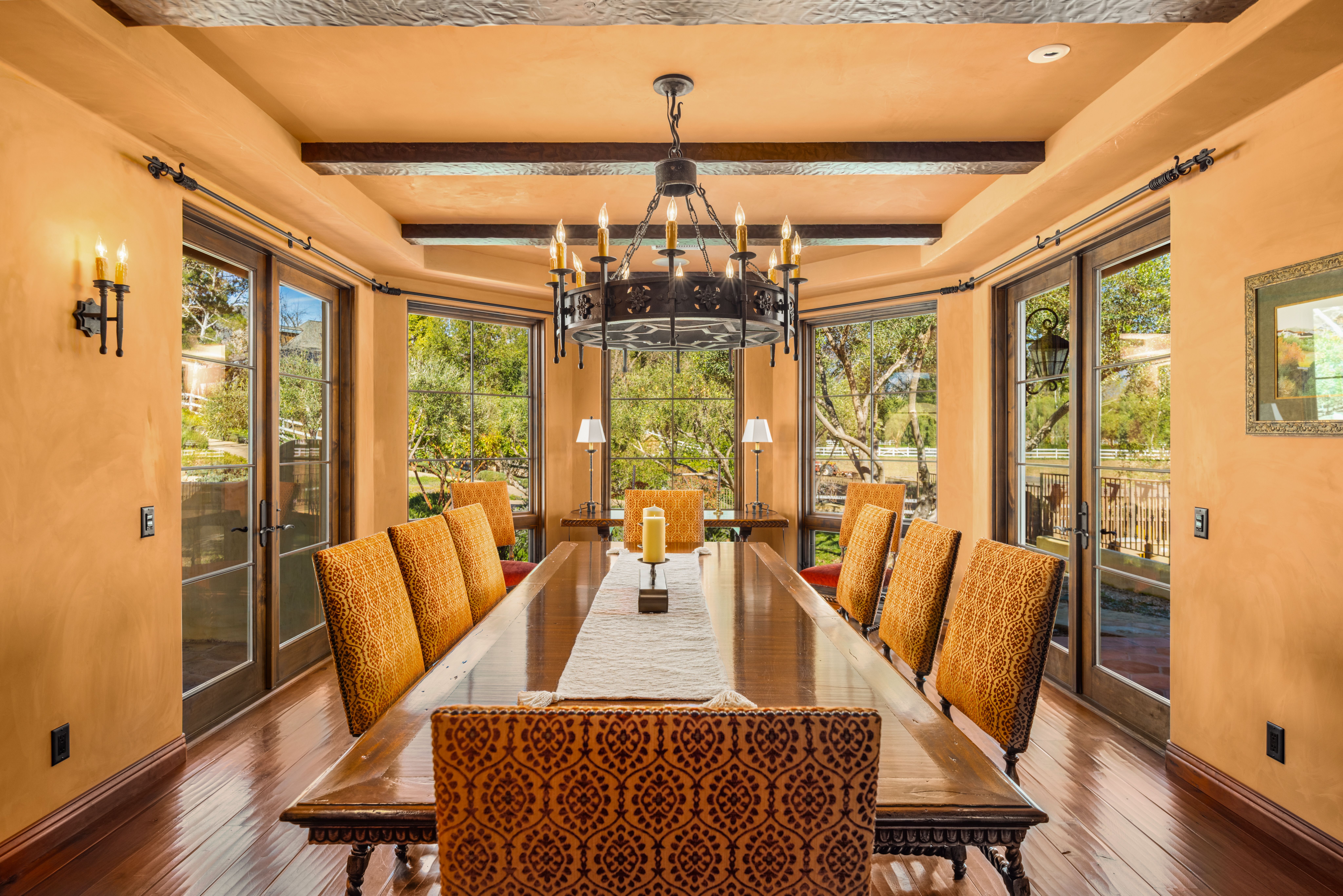 Set on approximately 3.88 acres in the Ojai Valley, Casa Vista Linda is a masterfully designed Mediterranean residence with distinctive Moroccan influences, where architectural artistry and refined materials create a home of quiet sophistication. Hand-hewn beams, richly finished walnut floors, and artisan tileworkmany elements crafted by local Ojai makersbring warmth and authenticity to expansive interiors filled with natural light and framed mountain views. Thoughtfully scaled living and dining spaces, a well-appointed kitchen that opens seamlessly to terraces, and multiple fireplaces throughout offer an atmosphere that is both elegant and inviting. Private bedroom suites, a loft retreat, dedicated office, and versatile lower-level living and wellness spaces provide flexibility for a variety of lifestyles. Outdoors, resort-caliber amenities include a grotto-style pool and spa, meditative labyrinth, curated gardens, and generous patios designed for relaxation and entertaining amid serene surroundings. A rare offering that pairs exceptional craftsmanship, privacy, and timeless Ojai beauty with effortless indoor-outdoor living.