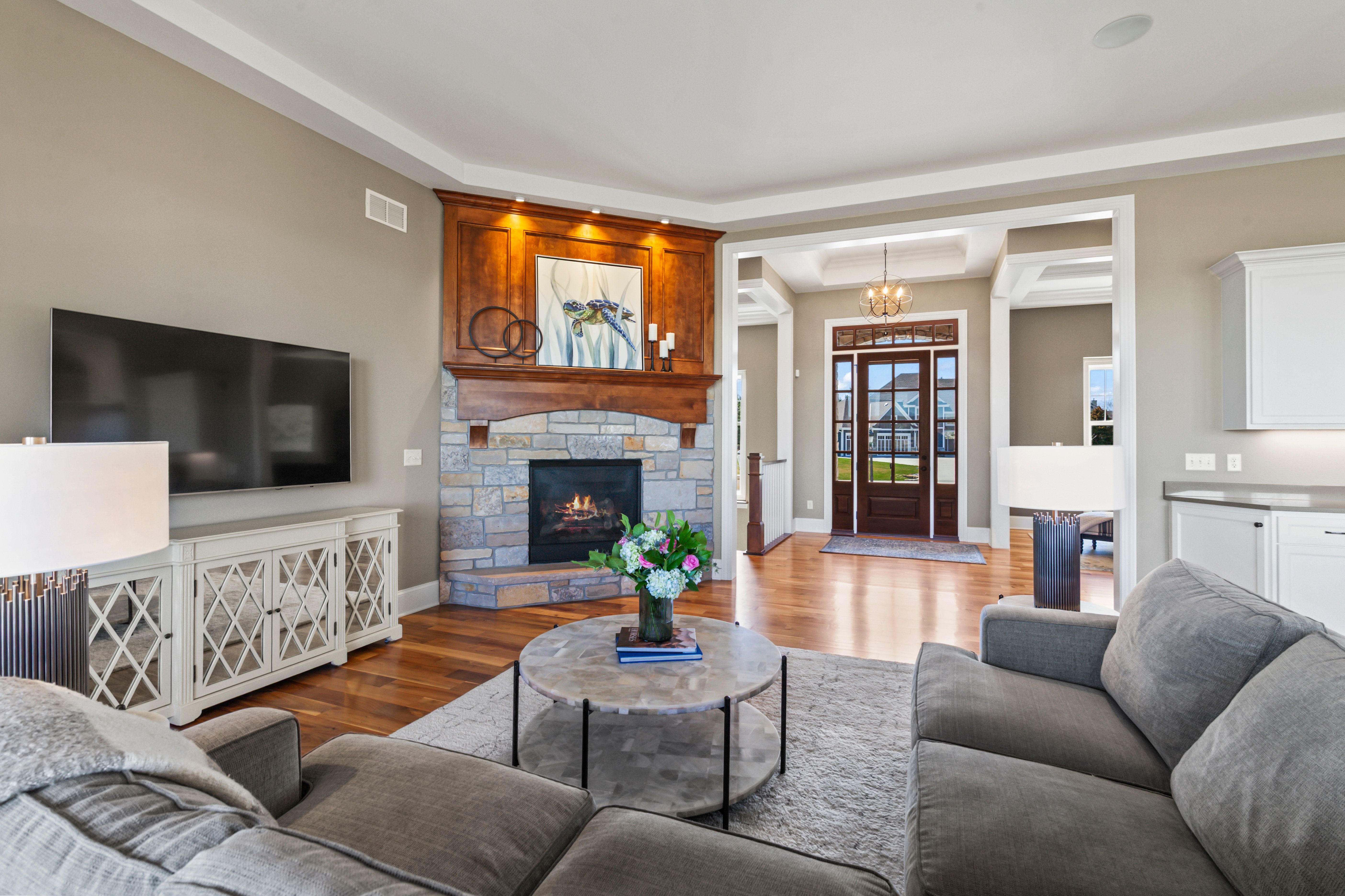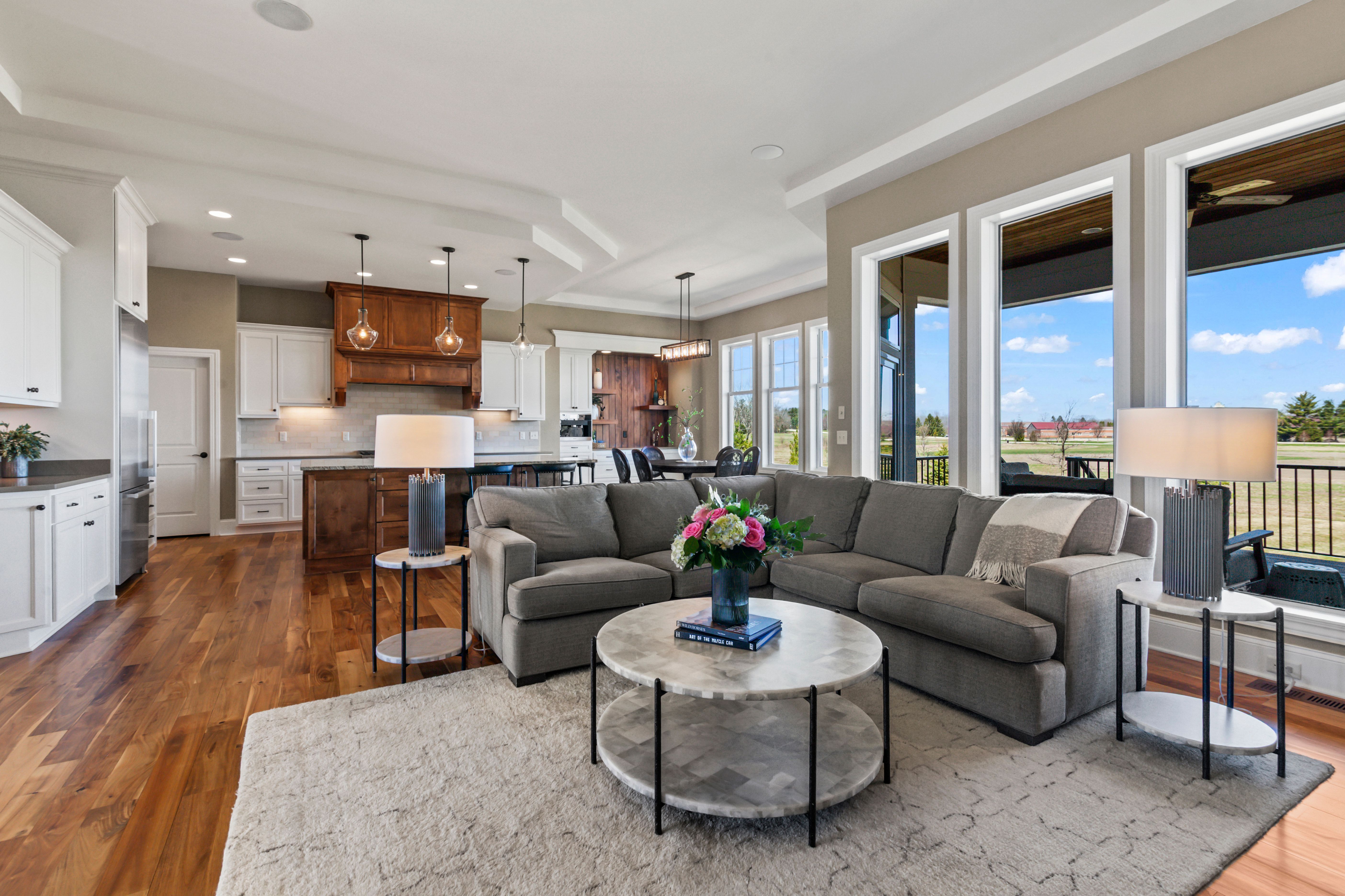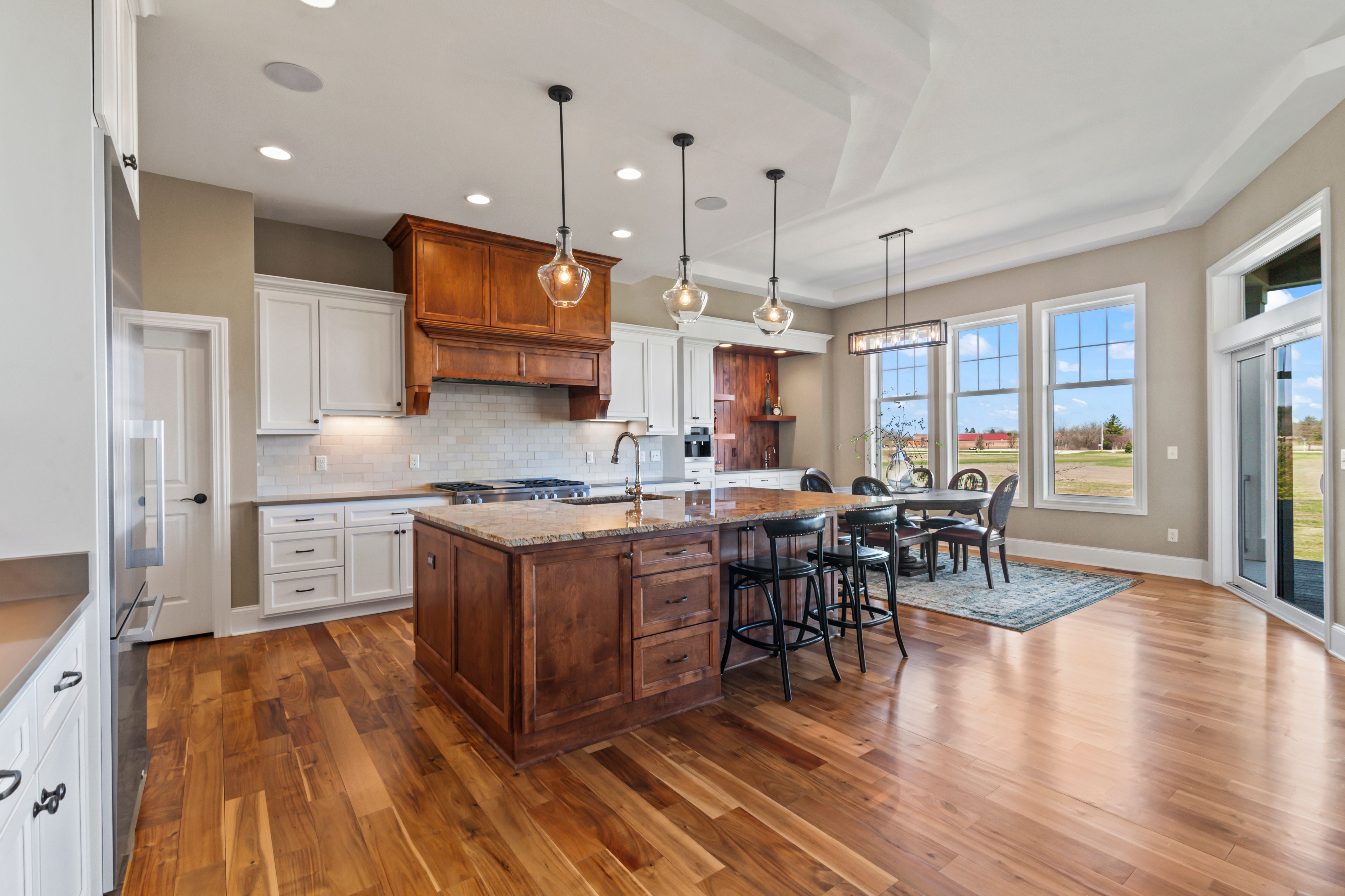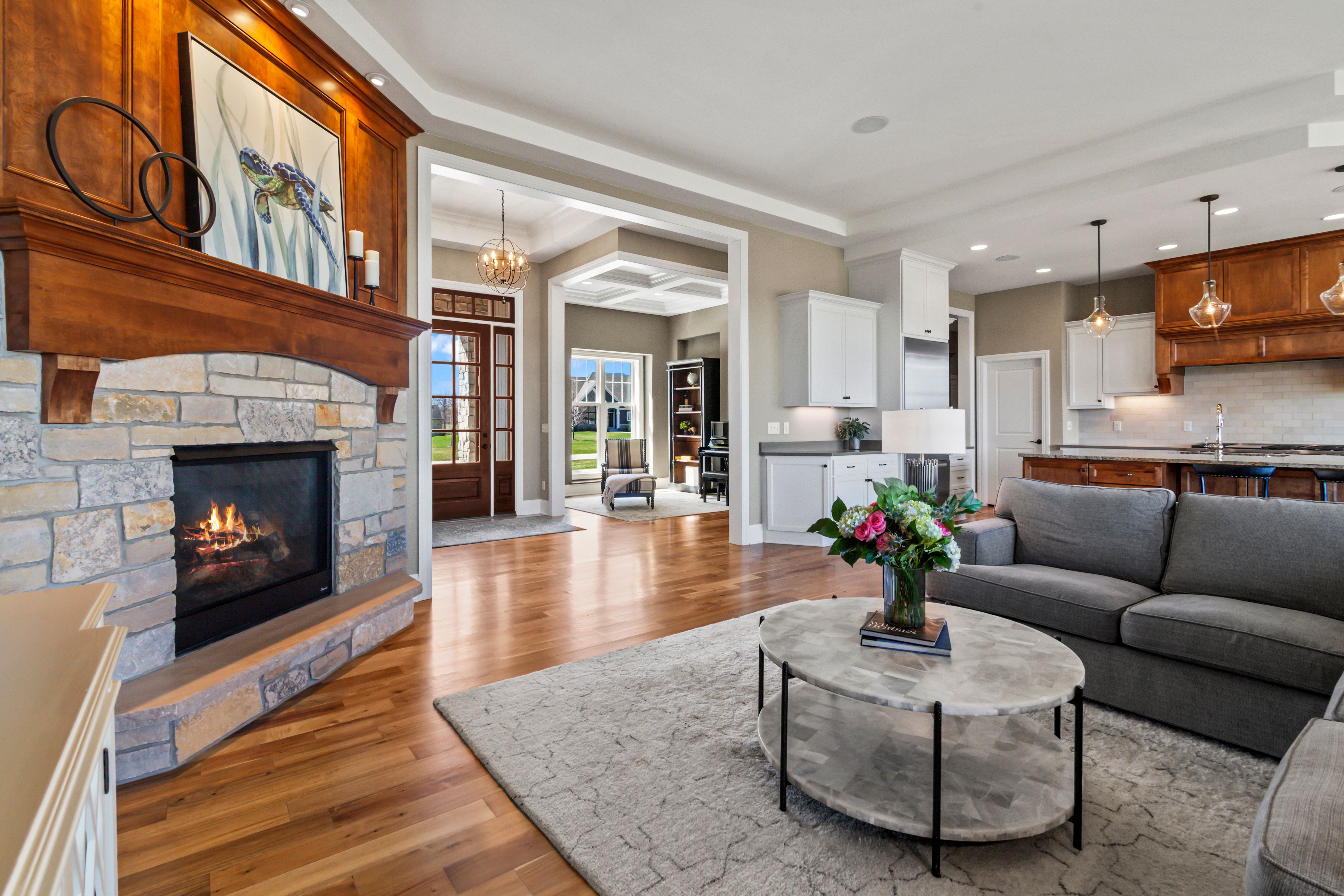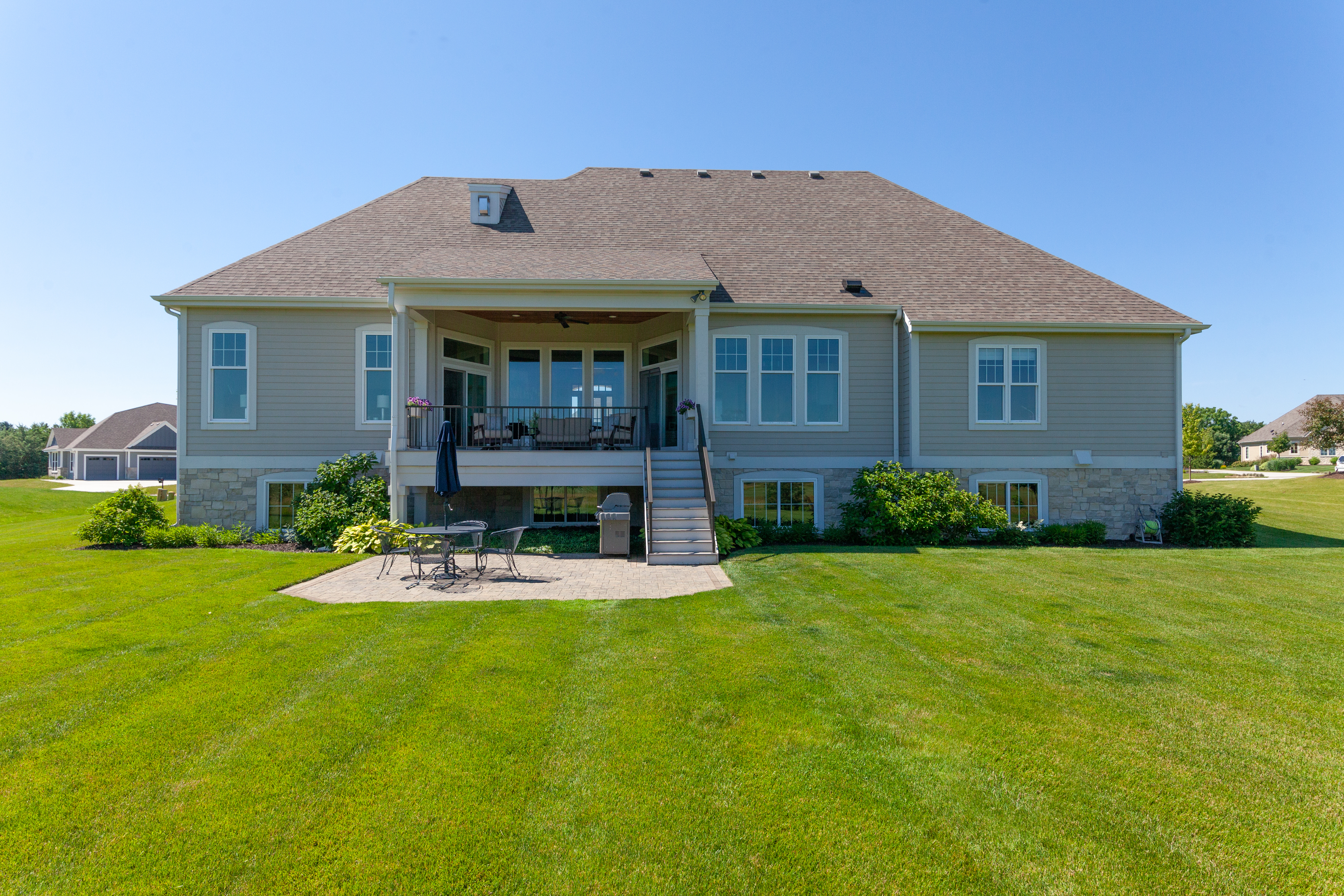 Refined finishes abound in this exquisite model home within the prestigious Hartland School District. An open-concept, split-bedroom layout showcases soaring ceilings, crown molding, and newly glossed hardwoods. The expansive great room flows into a gourmet kitchen boasting an 8.5' island, walk-in pantry, and bespoke coffee bar. Retreat to the spa-inspired primary suite with a Kohler soaking tub and custom tiled shower. The main level is completed by two bedrooms with Jack-and-Jill bath, dedicated den and mudroom/laundry. A daylight-drenched finished lower level offers a secondary kitchen, rec room, and 4th bedroom. Experience serene nature preserve views from the covered deck with dual entry from the kitchen & primary, or paver patio. Enjoy extensive community walking trails in this premier setting.