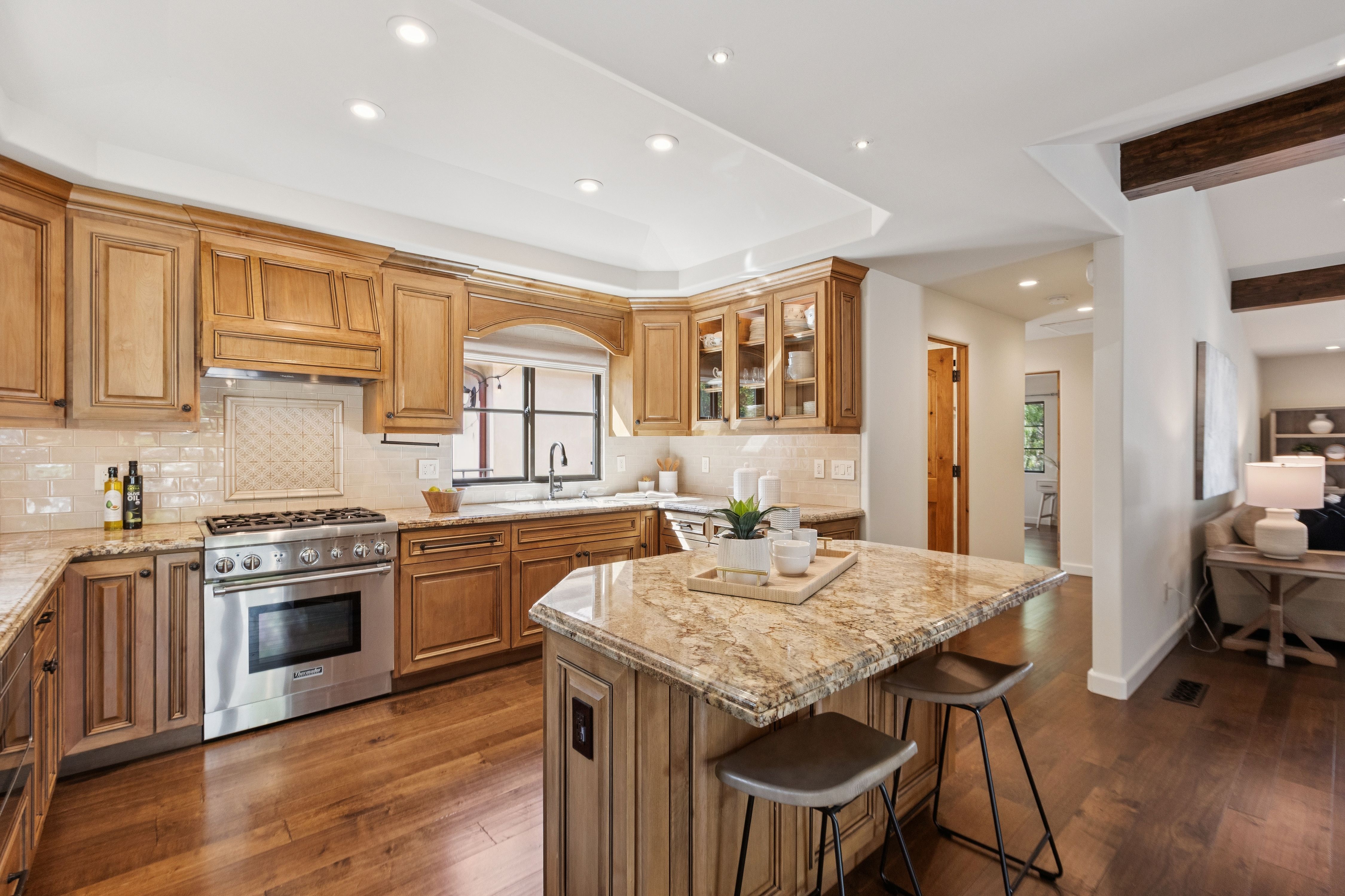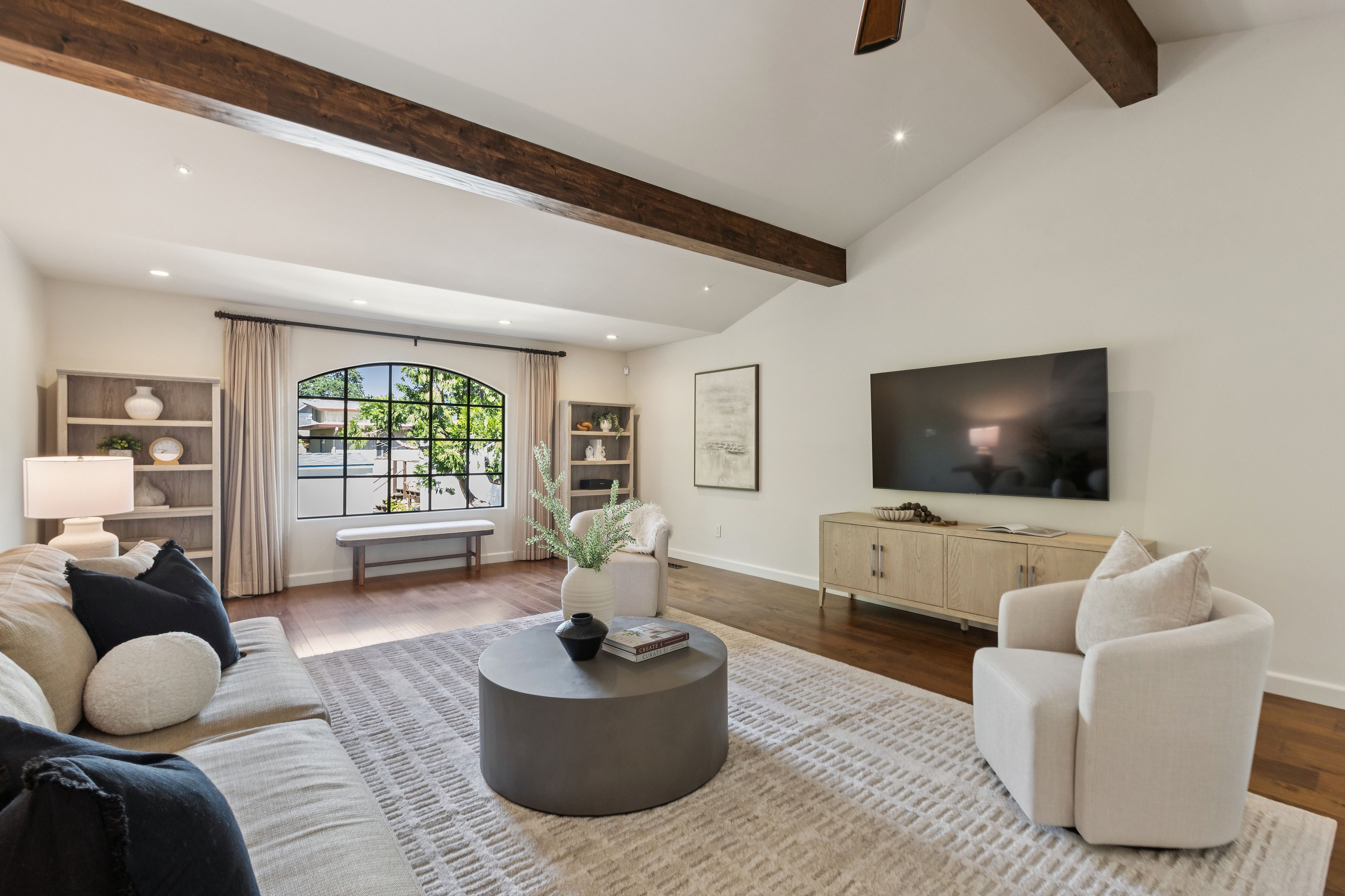 Framed by mature hedges surrounding the lush front gardens and patio, the welcoming Spanish architecture invites a peaceful ambience. Paver stone driveway, travertine tiles and pigmented stucco create a beautiful backdrop to this lovely property which was rebuilt in 2017. The handsome metal and glass entry door opens to the generous great room and spacious dining room. A dual sided gas fireplace surrounded in limestone facade creates a natural division and commanding focal point to both spaces while still maintaining an open, connected feel for everyday living and entertaining. Beautiful hardwood floors flow throughout the interior while vaulted ceilings are accented by natural light through the large picture windows and French doors. The spacious dining room is thoughtfully enhanced by an outcove, which functions as a perfect serving area with wine refrigerator and provides access to the elevated deck. The kitchen blends classic materials with everyday functionality, featuring gorgeous wood stained cabinetry with granite counters and a porcelain subway tile backsplash. A center island allows for additional storage and preparation space. Professional grade appliances include a Subzero refrigerator, Thermador oven range and dishwasher. The guest bathroom showcases similar warm wood stained cabinetry, granite countertops, and decorative tile accents that add texture and style. All three bedrooms are well appointed and each guest bedroom enjoys dual closets.At the rear of the home is the primary suite. This lovely retreat is a peaceful space with vaulted ceiling and an abundance of natural light. A large walk-in closet provides ample wardrobe storage and the primary bath is spacious and well appointed, featuring a soaking tub, stall shower, dual vanities, and gorgeous stone finishes to create the spa-like setting. The rear yard is designed for both relaxation and entertaining. The generous, tiered deck is ideal for outdoor dining and gathering. Meandering pathways lead through the garden with mature trees, vibrant plantings, and lounging areas that create a sense of privacy and retreat. A jetted spa is a perfect place to relax at the end of the day. A bonus room and storage is accessed off the lawn area and a great flexible space for a multitude of uses.Just steps from award winning Daves Elementary and a quick stroll to Vasona and Oak Meadow Parks, this wonderful location will not disappoint. Minutes to downtown Los Gatos shopping and dining district and an easy commute to Silicon Valley, this charming property offers comfort and convenience with upscale style and timeless appeal.