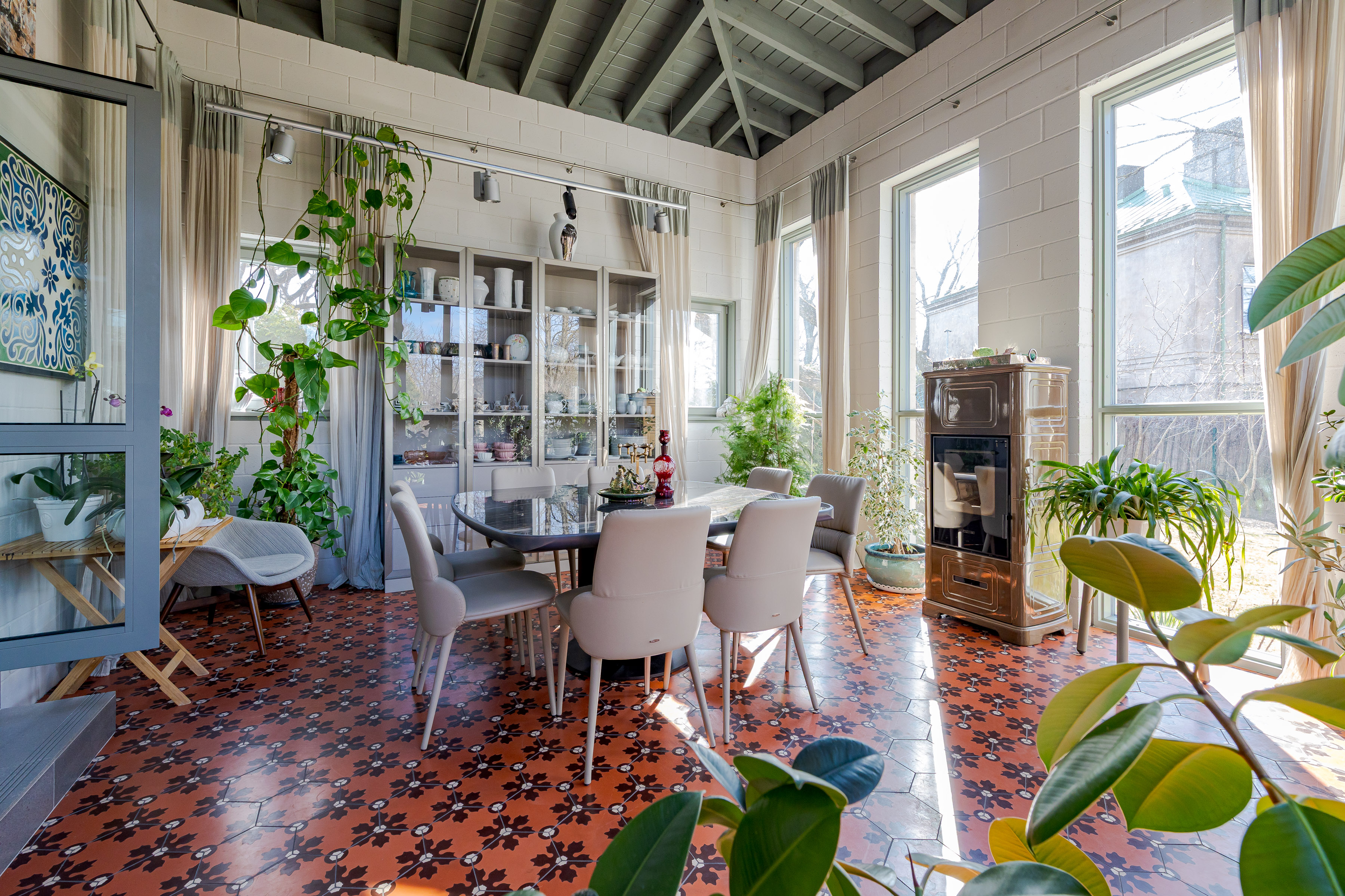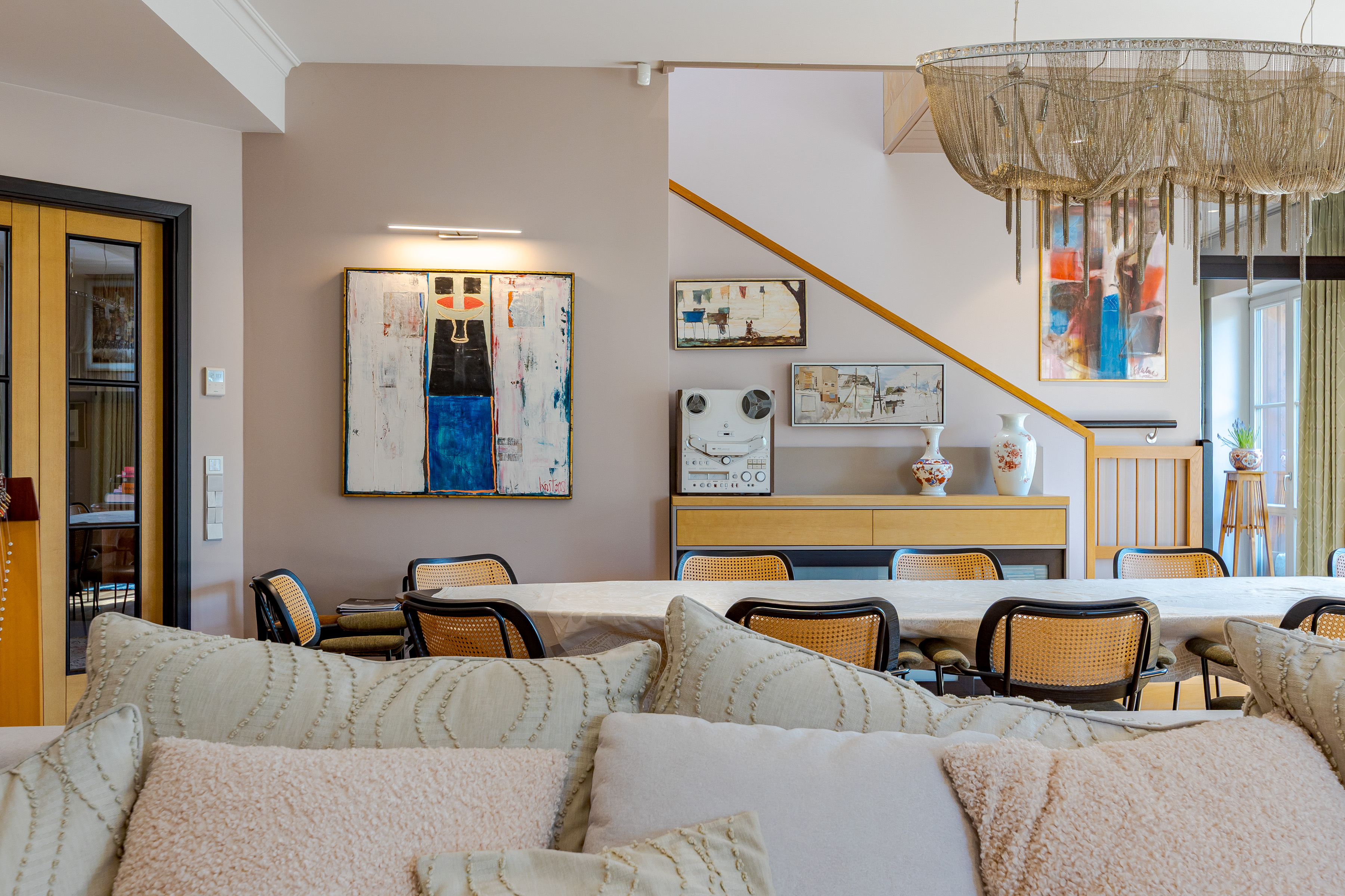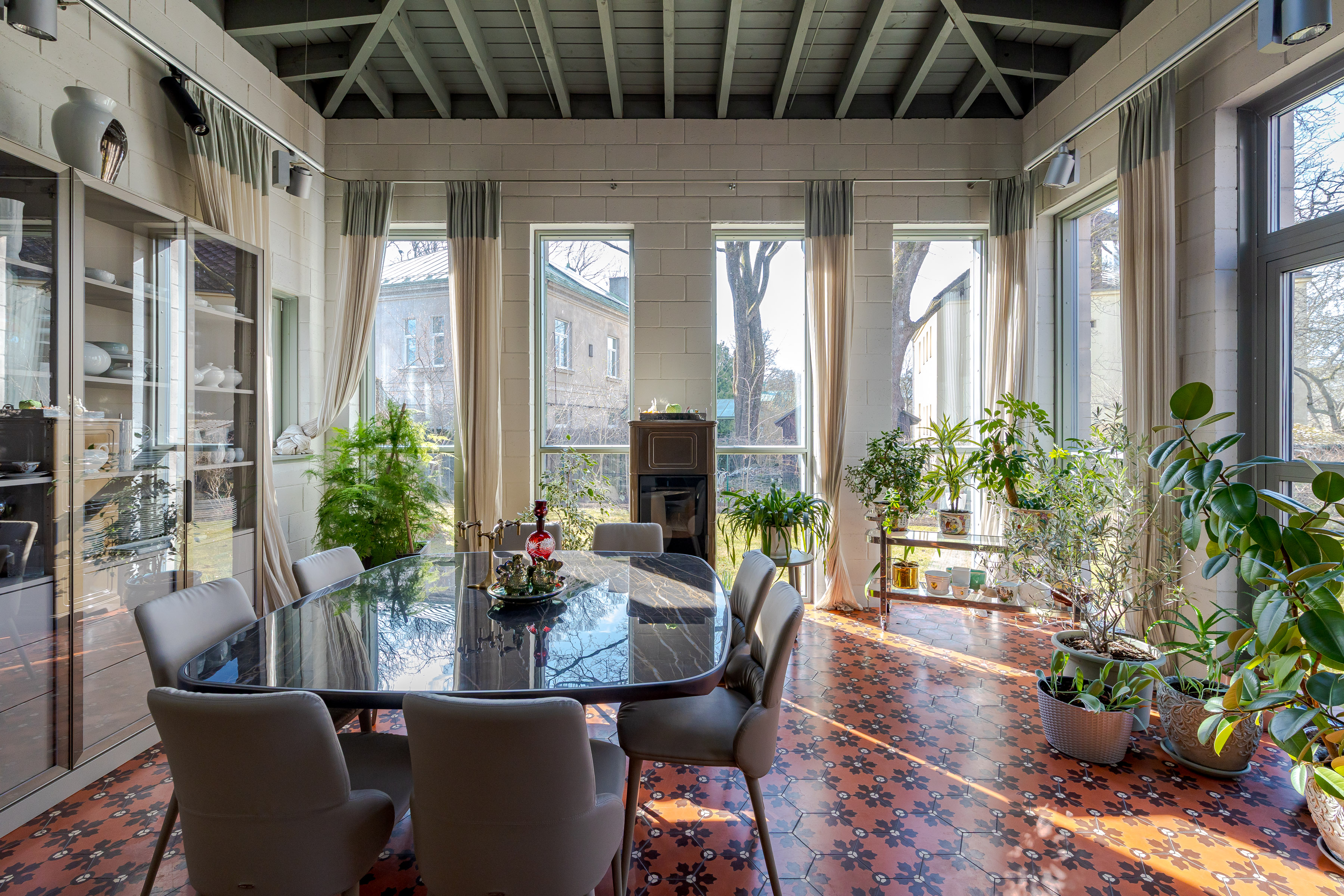 The house is created for those who value quality, privacy, and attention to detail. The first floor features a spacious, light-filled living room with a fireplace, connected to the dining area and kitchen. From the living room, you can step out onto the terrace, while the kitchen leads to a glazed orangery, allowing you to enjoy the garden all year round.