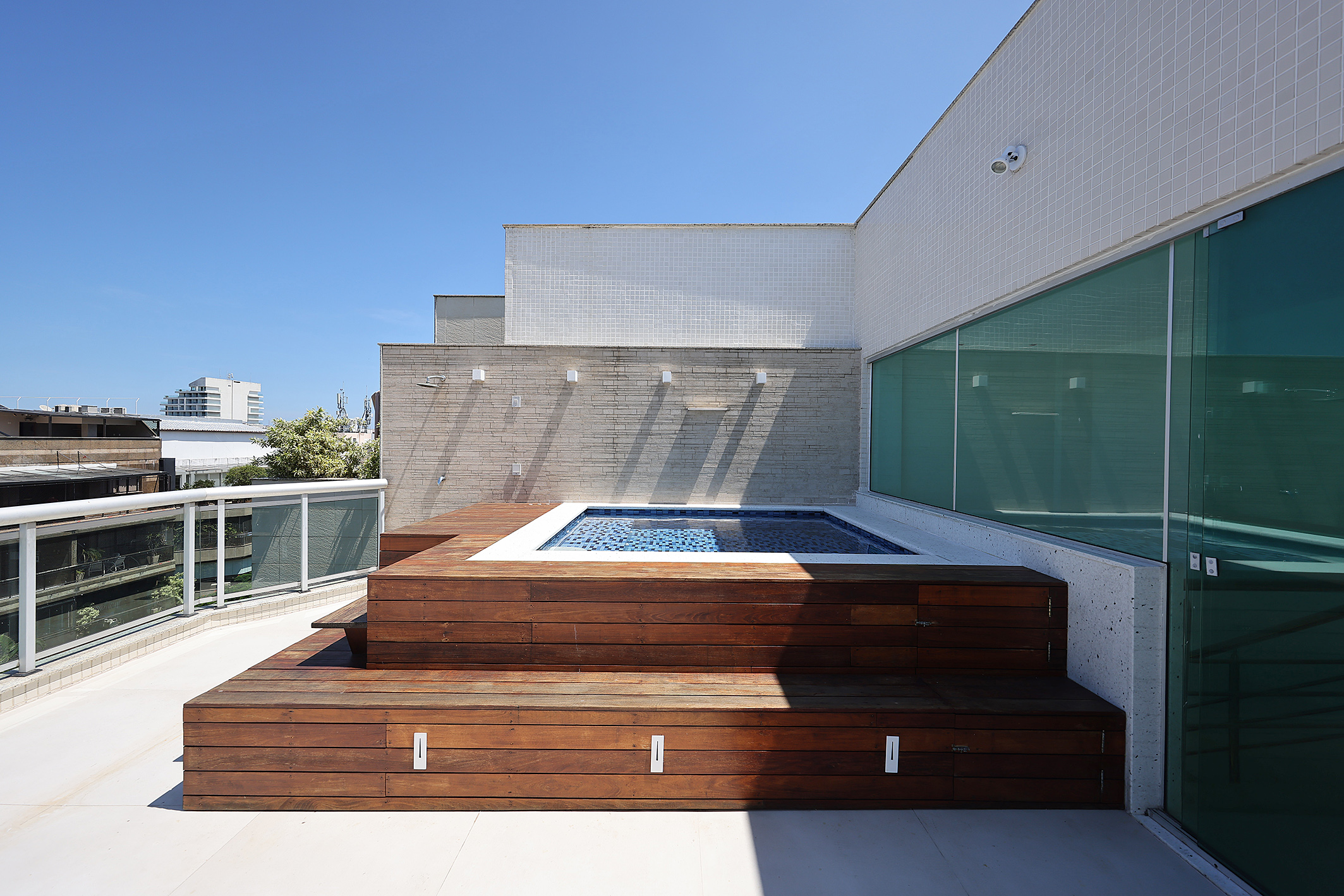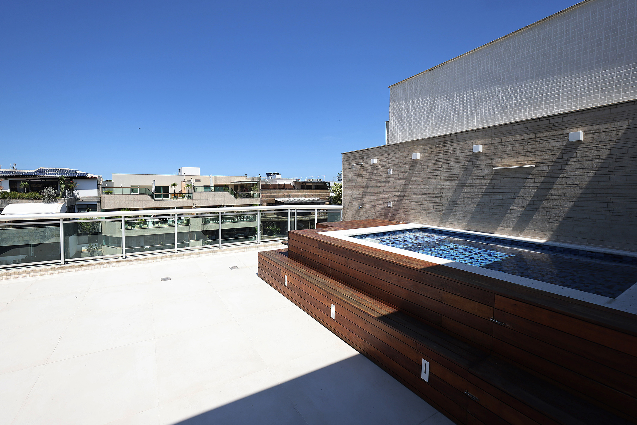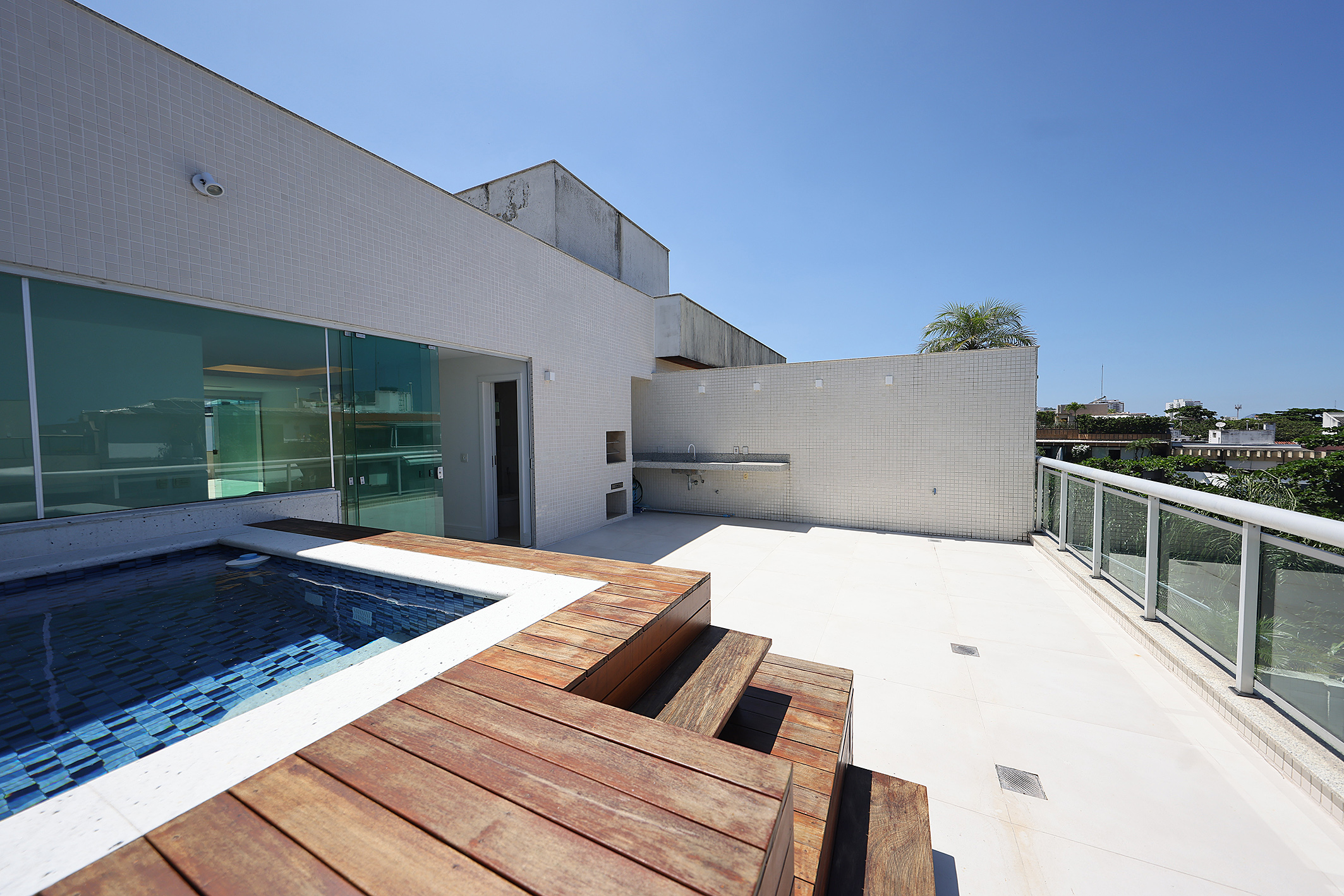 This renovated duplex penthouse offers 3,896 sq. ft. distributed across two levels in Jardim Oceânico. On the first floor, the layout includes a spacious living room, terrace, powder room, three suites, breakfast kitchen, service area, and one staff bedroom. Access to the upper level is through a linear staircase, leading to a large terrace with a lounge area, bathroom, swimming pool, and gourmet space, creating an ideal setting for leisure and entertaining. The property includes four parking spaces. The building offers doorman service during business hours.