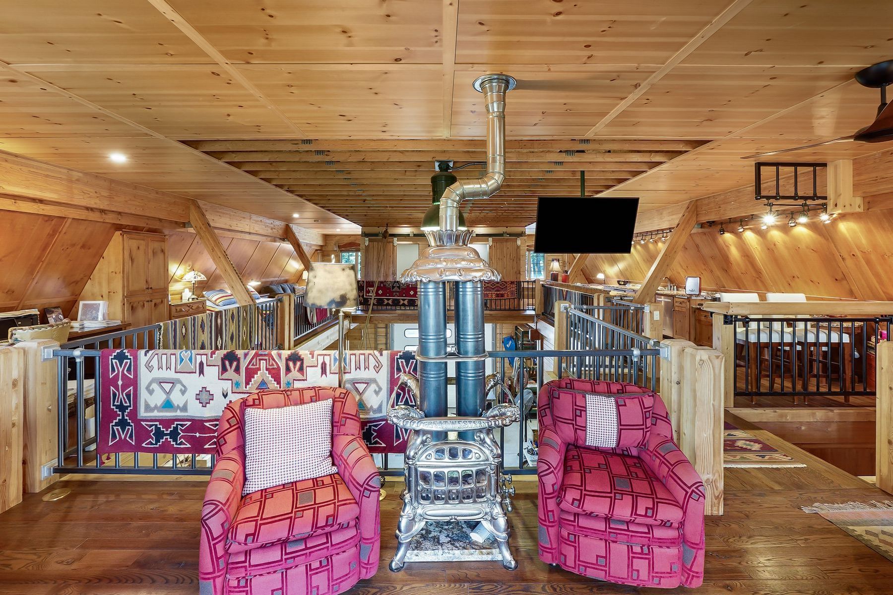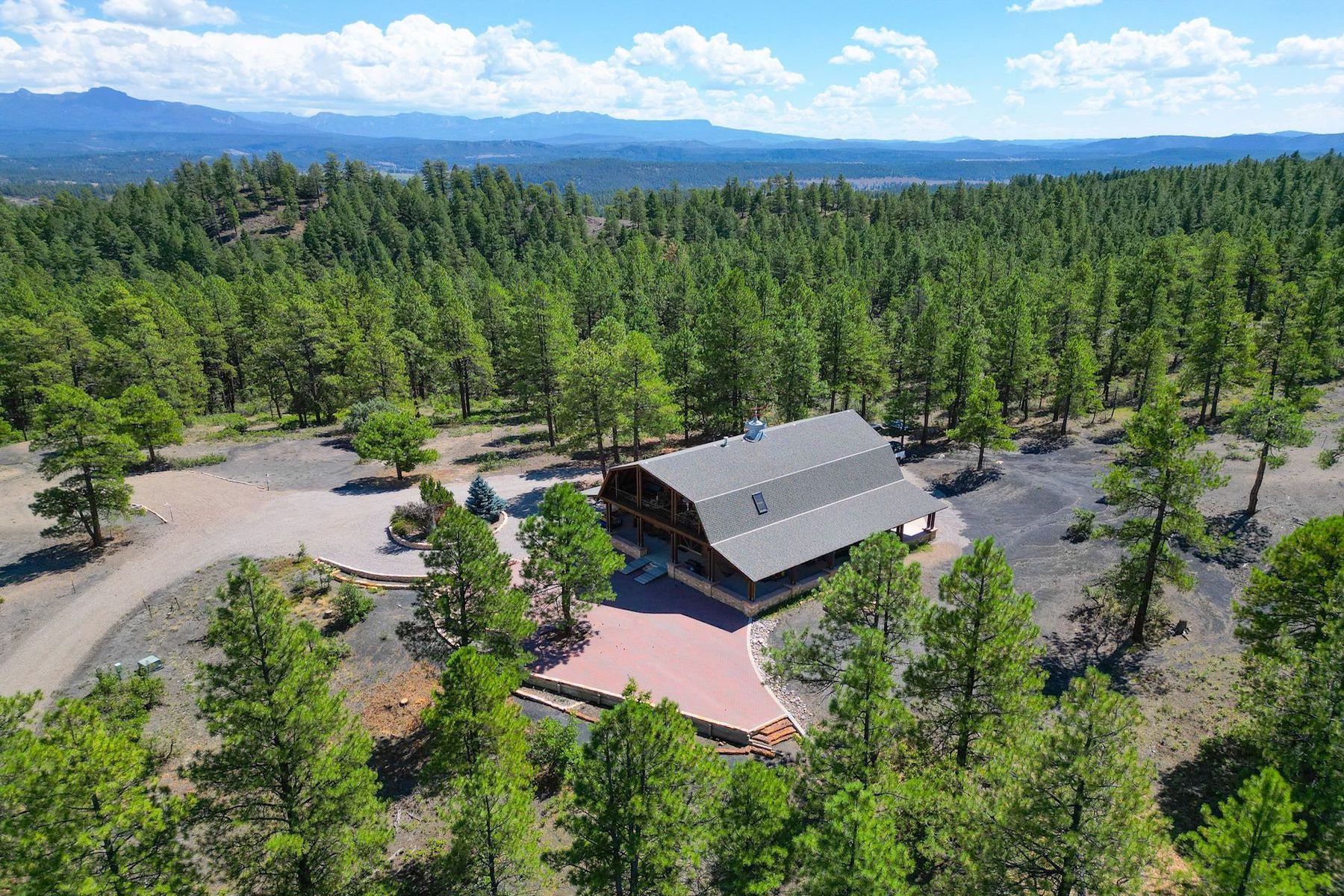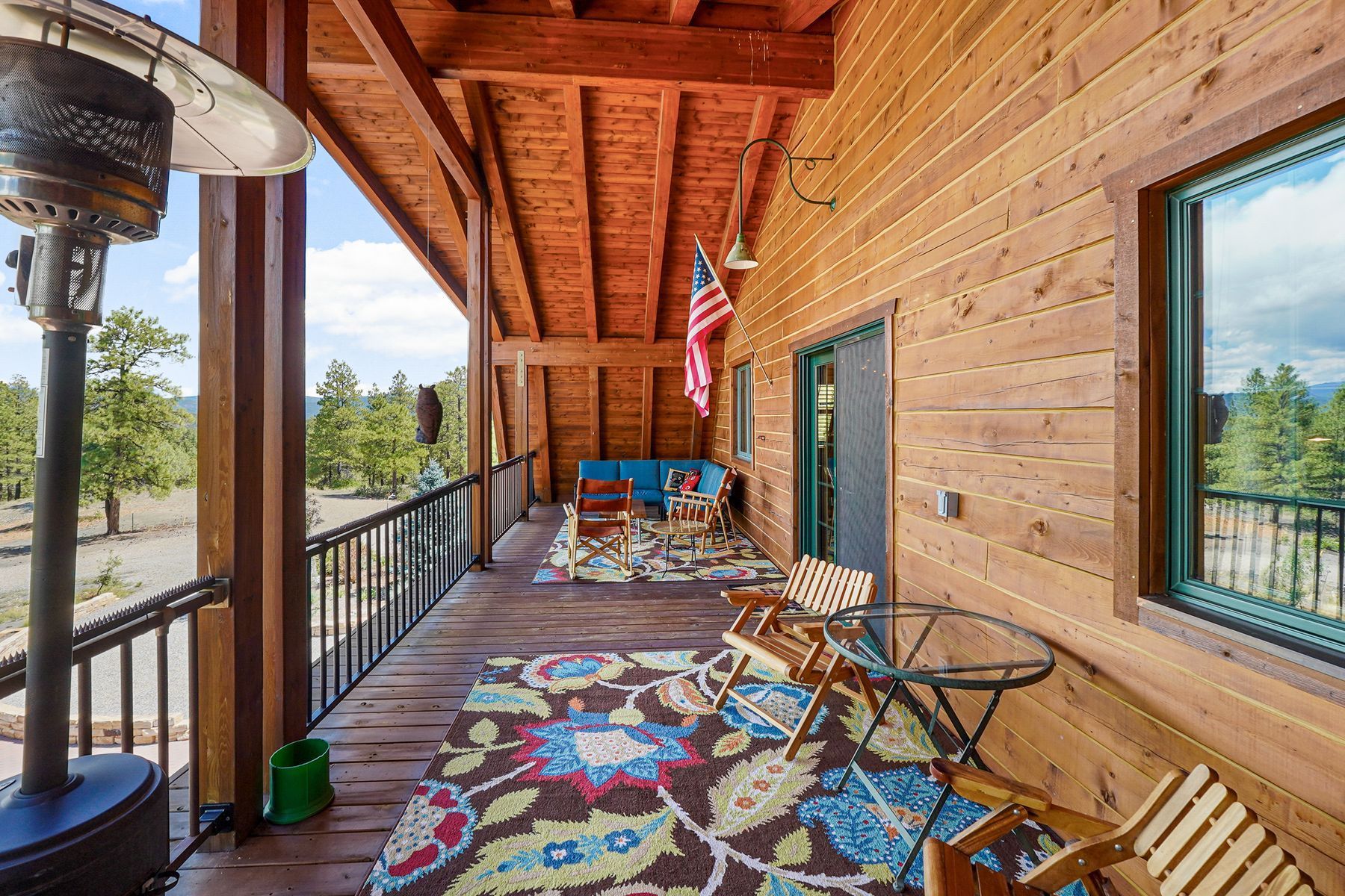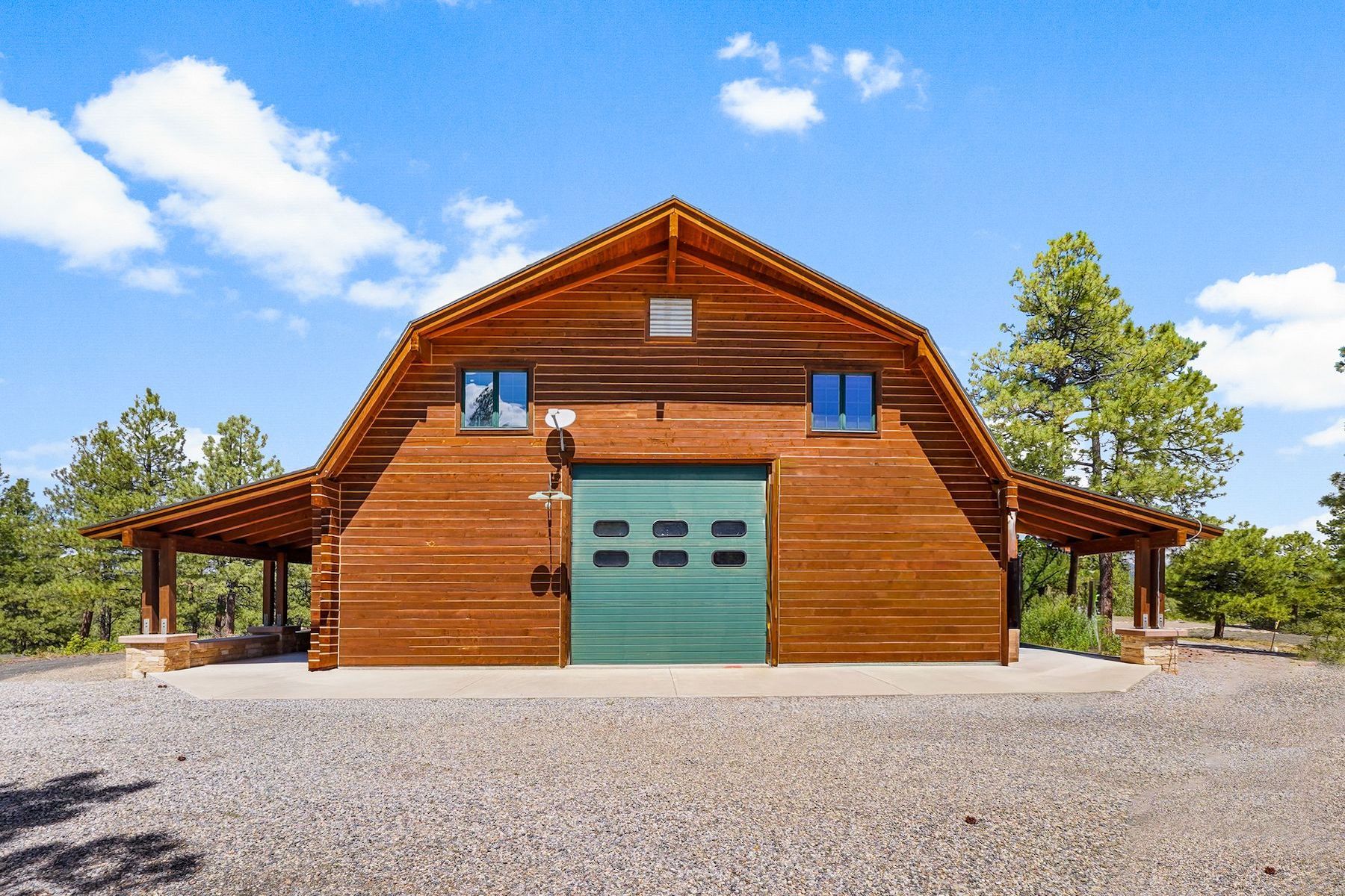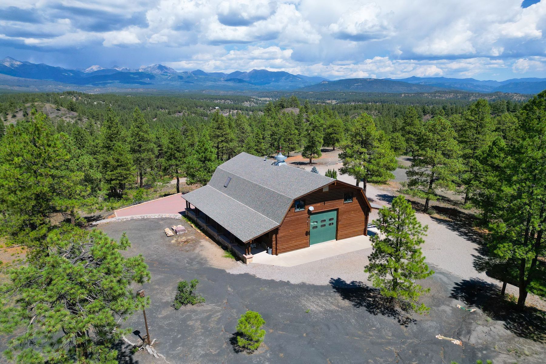 Perched on a hilltop in a secluded meadow with 270-degree mountain views, this 36-acre barndominium estate in Knolls Ranch is a true labor of love, showcasing the artistry and devotion of its master craftsman builder. Constructed with 7"x7" Spruce log and timber frame design, it is one of only seven ranches in a gated community just minutes from Highway 160 and Stevens Field Airport. Inside, every detail is custom: handmade light fixtures, hardwood floors, and handcrafted barn doors. The loft apartment includes ingenious built-ins such as cabinets on rollers and a motorized TV. The galley kitchen is finished with live-edge granite countertops, custom cabinetry. Antique Great Western 1910 gas fired parlor stove adds rustic warmth, while furnishings are included for a true turn-key experience. The barn is equally functional and impressive, with soaring 14’ garage door, radiant in-floor radiant heating, and a whole-house fan. It can easily house up to four vehicles, all kinds of toys or a large motorcoach in the shop space. 3 maple work benches, wood and metal working equipment can be included for a hobbyist or artist. Lower level has a cute bunk room and bath as well as laundry area. 240V and 120V receptacles thoughtfully located around the ceiling perimeter of the shop space. Outdoor living is highlighted by 2000 SF of covered decks on three sides that capture sweeping views of Pagosa Peak and the Continental Divide, along with a spacious paver patio large enough to host weddings, barn dances, or family gatherings. The xeriscaped grounds are supported by a 3 zone irrigation system for effortless care. A second prepped home site with gas, water, phone and electric invites the option of building a main residence while keeping the barndominium as a guest retreat. Perfect spot for a private pilot residence with the close proximity to the airport. With artisan finishes, thoughtful craftsmanship, and a setting that takes full advantage of Colorado’s mountain beauty, this property is one-of-a-kind in Pagosa Springs.