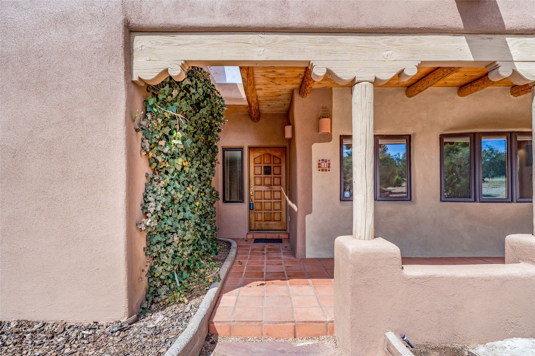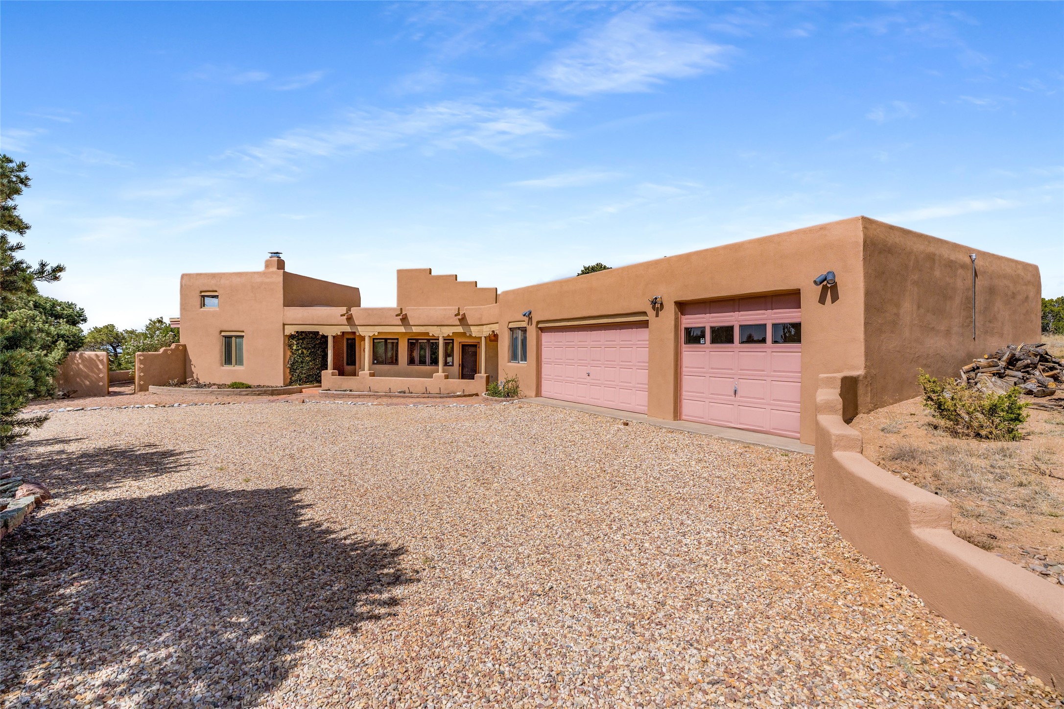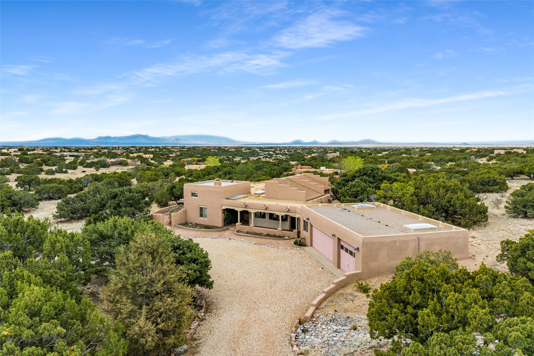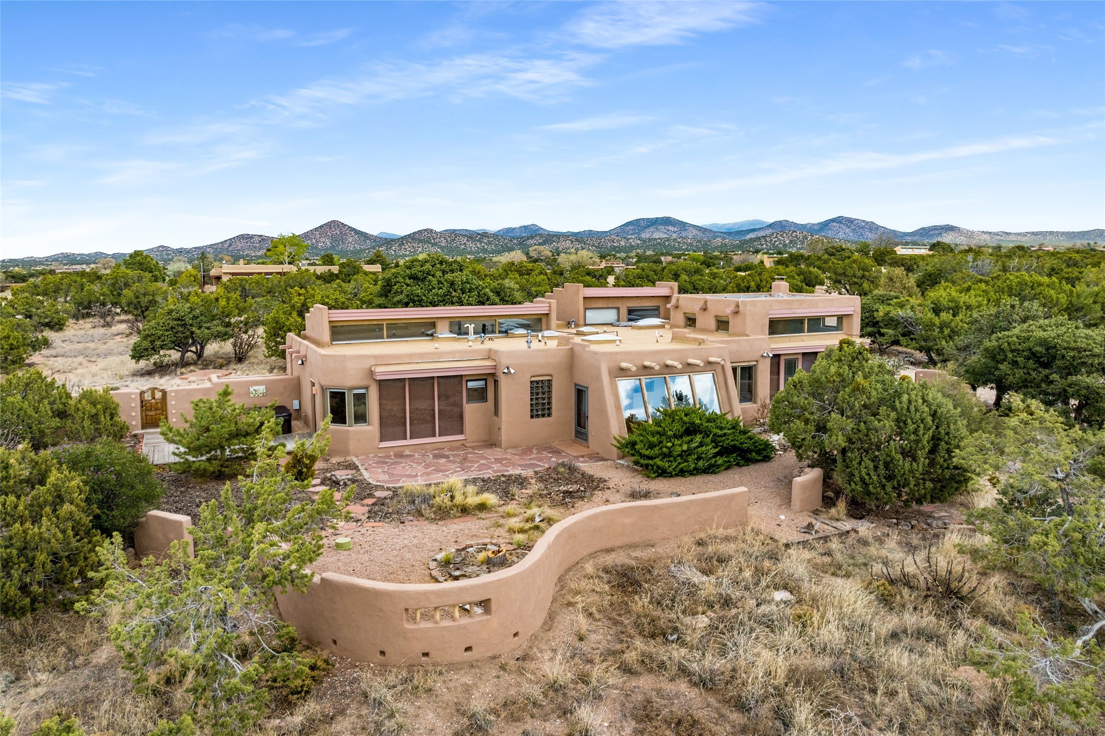 4 Montana Court is a distinctive Pueblo style residence, crafted in the mid 1980s by respected local builder John DiJanni as his personal home. Designed with passive solar Trombe Walls, and solar orientation, his charming home provides energy efficiency and the timeless warmth of classic Southwestern architecture. Set on more than two acres and bordering a greenbelt, the property enjoys remarkable privacy, separation from neighboring homes, and pleasing mountain views. A circular driveway creates an inviting and practical approach to the home. Inside, the formal living room centers around a traditional Kiva fireplace. A separate and generous office or media room—complete with vaulted ceilings, Vigas, clerestory windows, and its own exterior entrance—provides a flexible space ideal for work, creative pursuits, and a variety of uses. Adjoining the delightful and centrally placed kitchen, there is a dedicated Sunroom for growing herbs and plants throughout the year. The bedroom wing is finished with chipped edge travertine flooring, adding a refined touch. The generously sized primary suite includes a jacuzzi tub/shower, a single hardwood vanity, and a bidet. Two guest bedrooms feature vaulted Viga ceilings, clerestory windows, and abundant natural light, with a well placed full bath conveniently serving both rooms. A detached three car garage, connected to the home by a covered portal, offers excellent versatility; one bay has previously been used as an office or studio, and can easily be converted back to garage space if preferred.