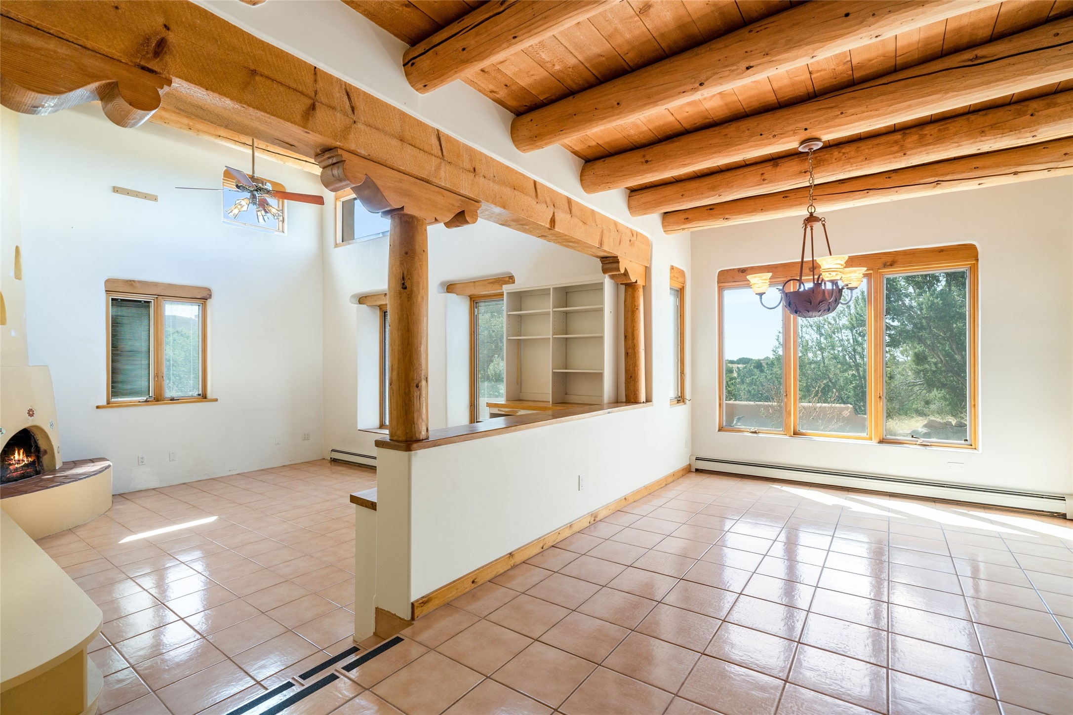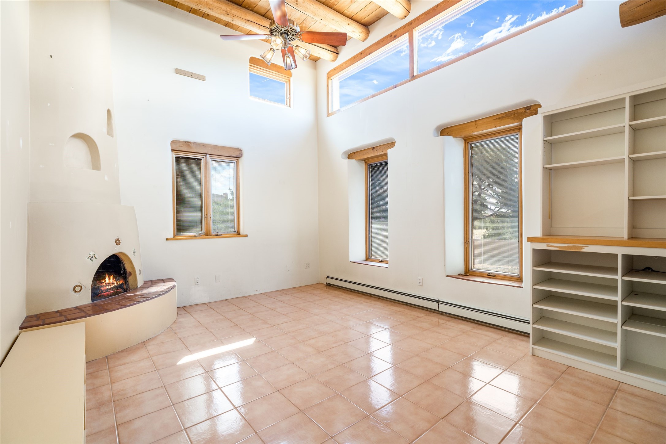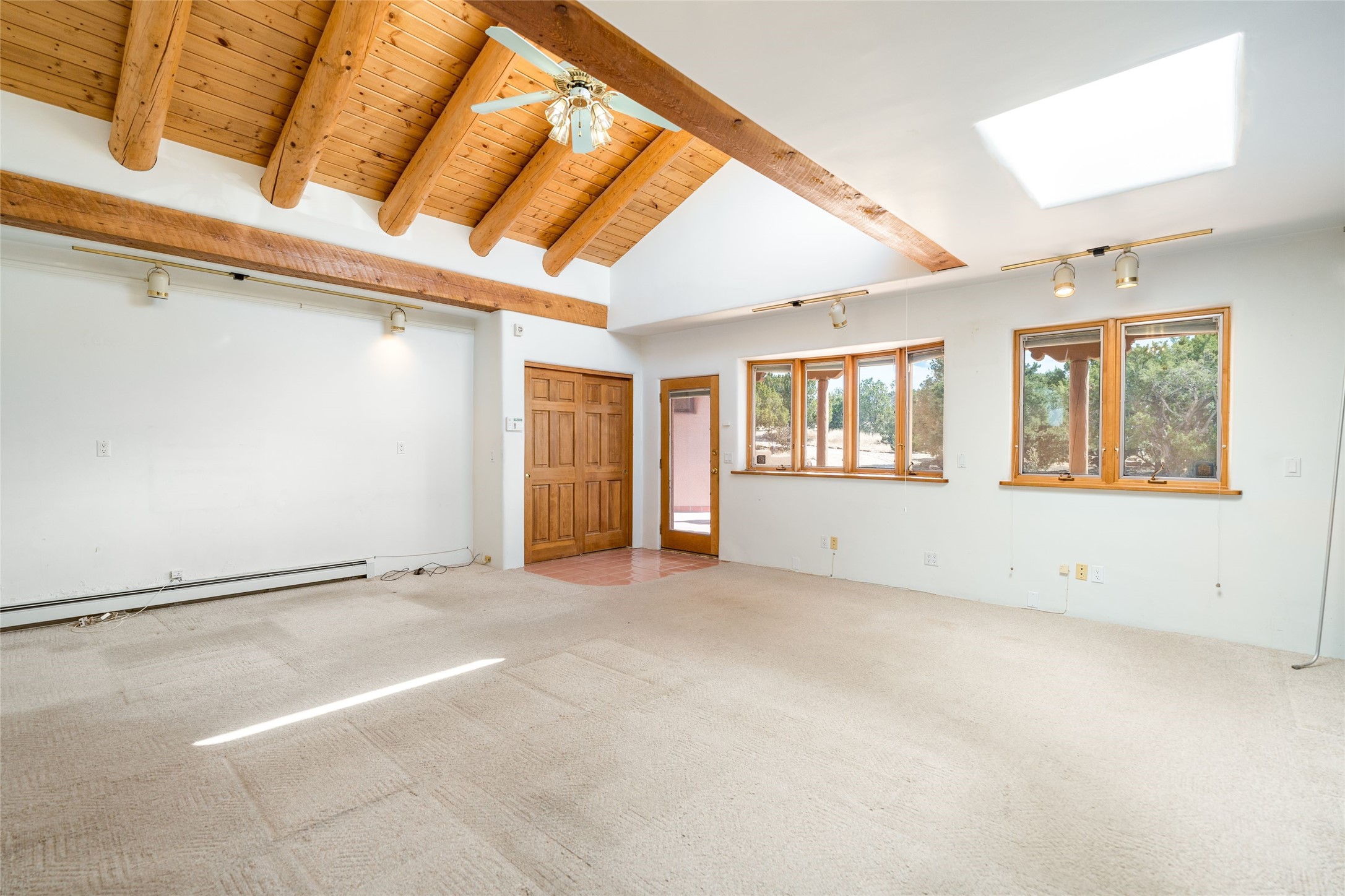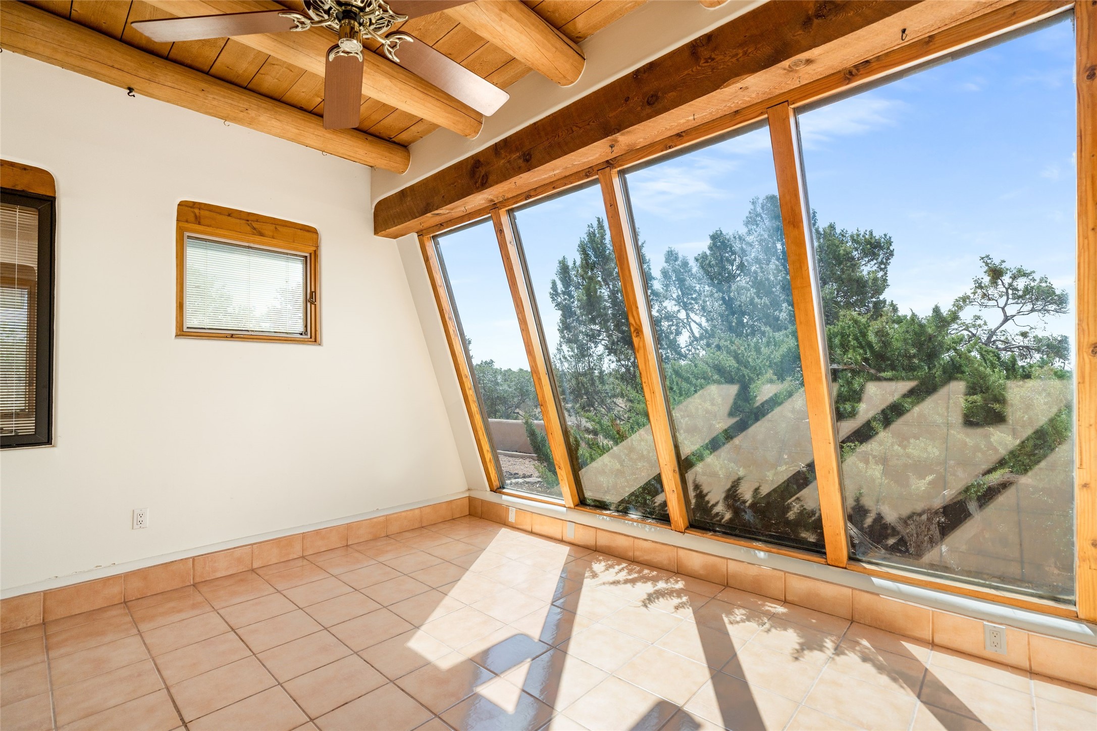 4 Montana Court is a distinctive Pueblo style residence, crafted in the mid 1980s by respected local builder John DiJanni as his personal home. Designed with passive solar Trombe Walls, and solar orientation, his charming home provides energy efficiency and the timeless warmth of classic Southwestern architecture. Set on more than two acres and bordering a greenbelt, the property enjoys remarkable privacy, separation from neighboring homes, and pleasing mountain views. A circular driveway creates an inviting and practical approach to the home. Inside, the formal living room centers around a traditional Kiva fireplace. A separate and generous office or media room—complete with vaulted ceilings, Vigas, clerestory windows, and its own exterior entrance—provides a flexible space ideal for work, creative pursuits, and a variety of uses. Adjoining the delightful and centrally placed kitchen, there is a dedicated Sunroom for growing herbs and plants throughout the year. The bedroom wing is finished with chipped edge travertine flooring, adding a refined touch. The generously sized primary suite includes a jacuzzi tub/shower, a single hardwood vanity, and a bidet. Two guest bedrooms feature vaulted Viga ceilings, clerestory windows, and abundant natural light, with a well placed full bath conveniently serving both rooms. A detached three car garage, connected to the home by a covered portal, offers excellent versatility; one bay has previously been used as an office or studio, and can easily be converted back to garage space if preferred.