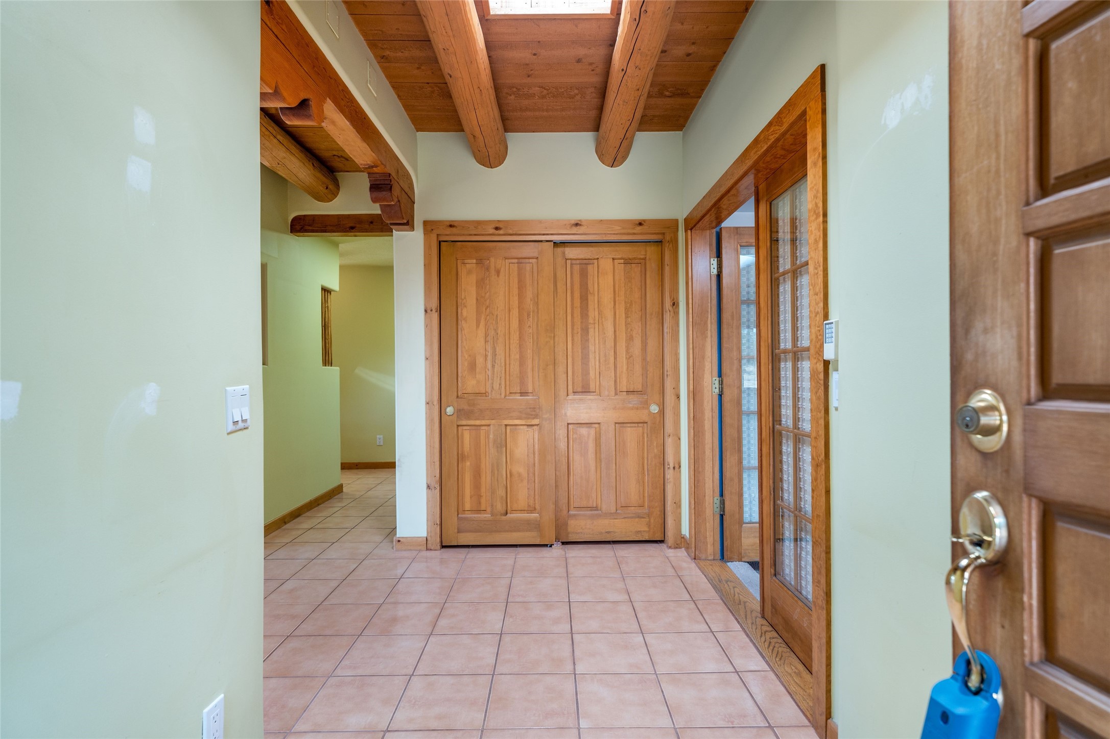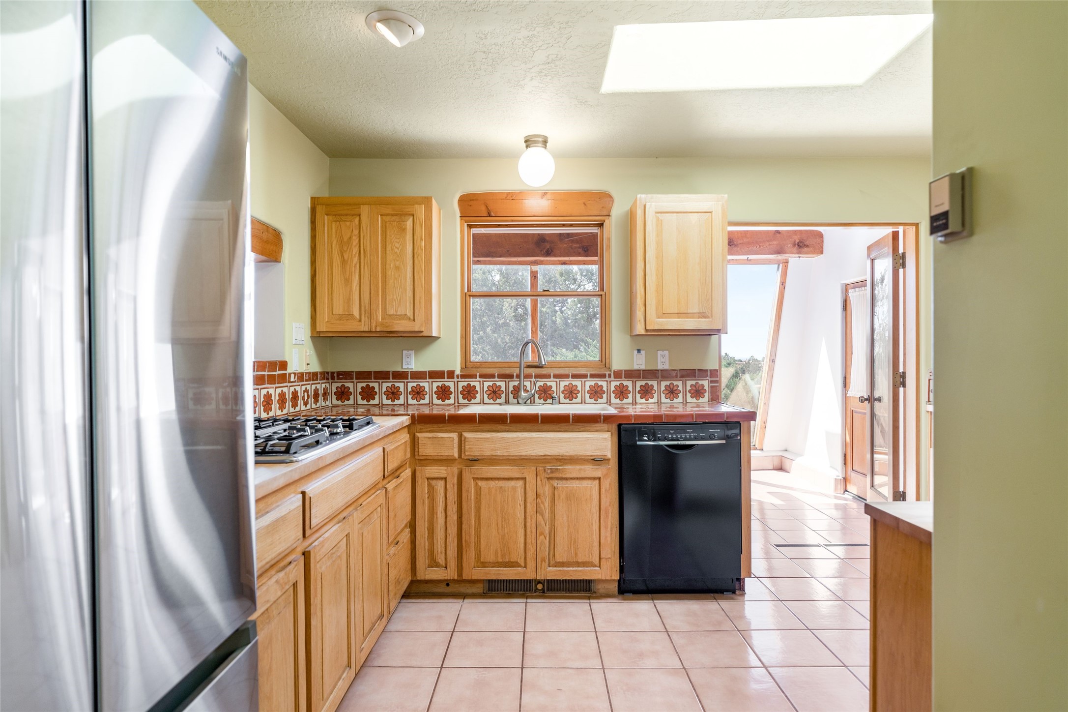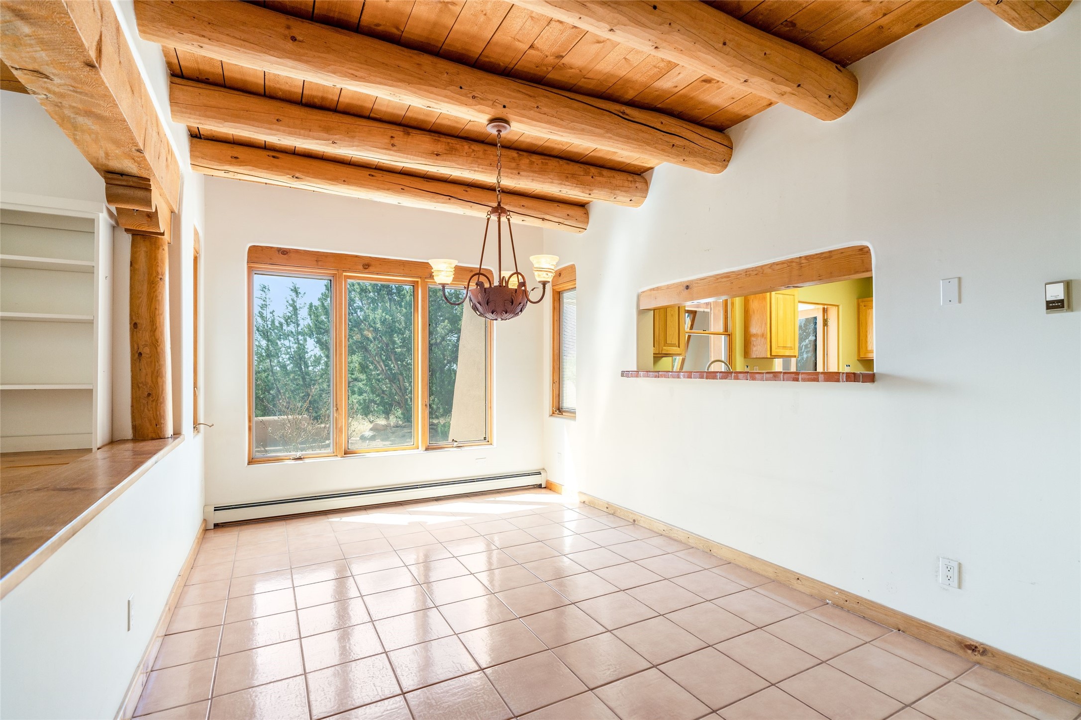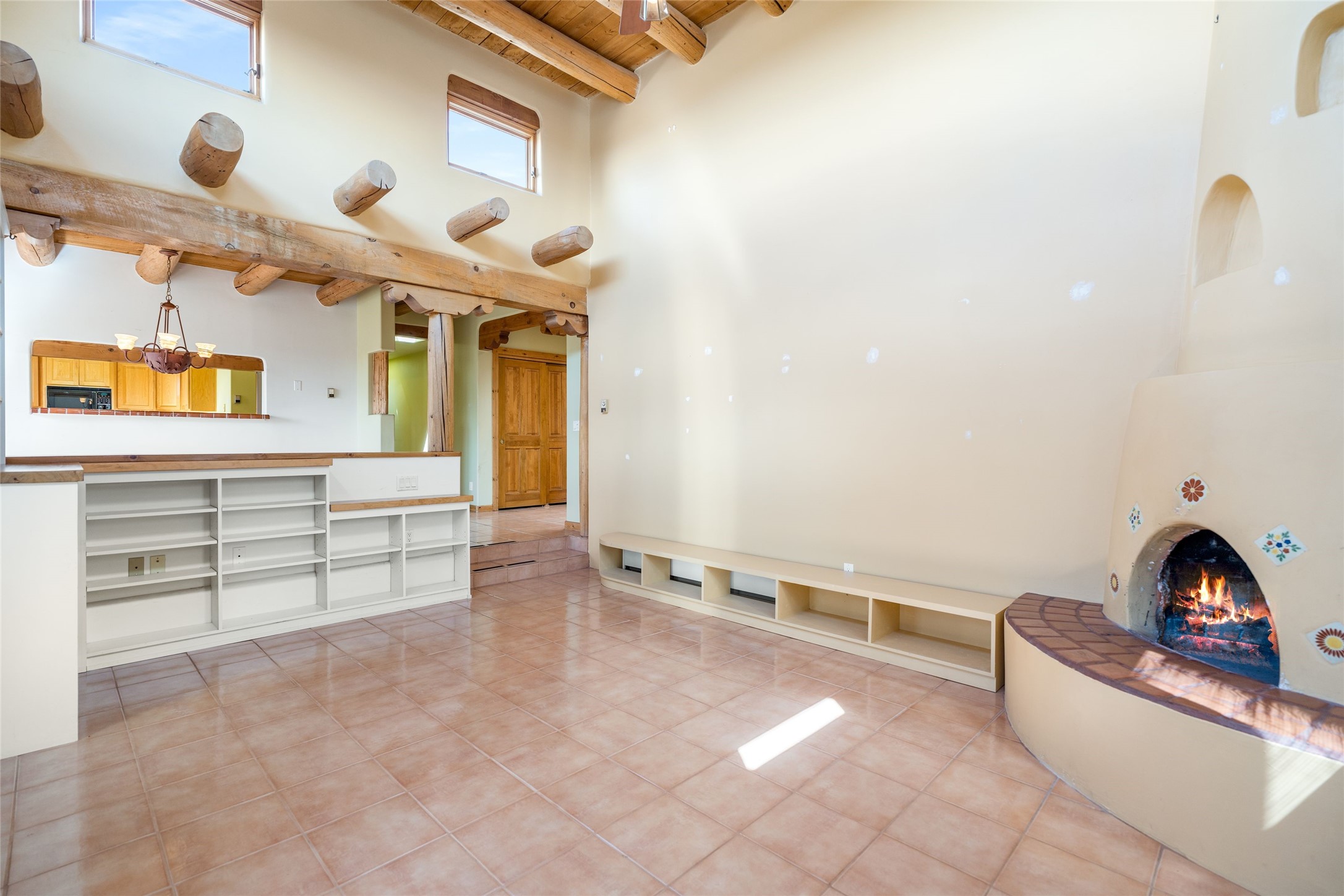 4 Montana Court is a distinctive Pueblo style residence, crafted in the mid 1980s by respected local builder John DiJanni as his personal home. Designed with passive solar Trombe Walls, and solar orientation, his charming home provides energy efficiency and the timeless warmth of classic Southwestern architecture. Set on more than two acres and bordering a greenbelt, the property enjoys remarkable privacy, separation from neighboring homes, and pleasing mountain views. A circular driveway creates an inviting and practical approach to the home. Inside, the formal living room centers around a traditional Kiva fireplace. A separate and generous office or media room—complete with vaulted ceilings, Vigas, clerestory windows, and its own exterior entrance—provides a flexible space ideal for work, creative pursuits, and a variety of uses. Adjoining the delightful and centrally placed kitchen, there is a dedicated Sunroom for growing herbs and plants throughout the year. The bedroom wing is finished with chipped edge travertine flooring, adding a refined touch. The generously sized primary suite includes a jacuzzi tub/shower, a single hardwood vanity, and a bidet. Two guest bedrooms feature vaulted Viga ceilings, clerestory windows, and abundant natural light, with a well placed full bath conveniently serving both rooms. A detached three car garage, connected to the home by a covered portal, offers excellent versatility; one bay has previously been used as an office or studio, and can easily be converted back to garage space if preferred.