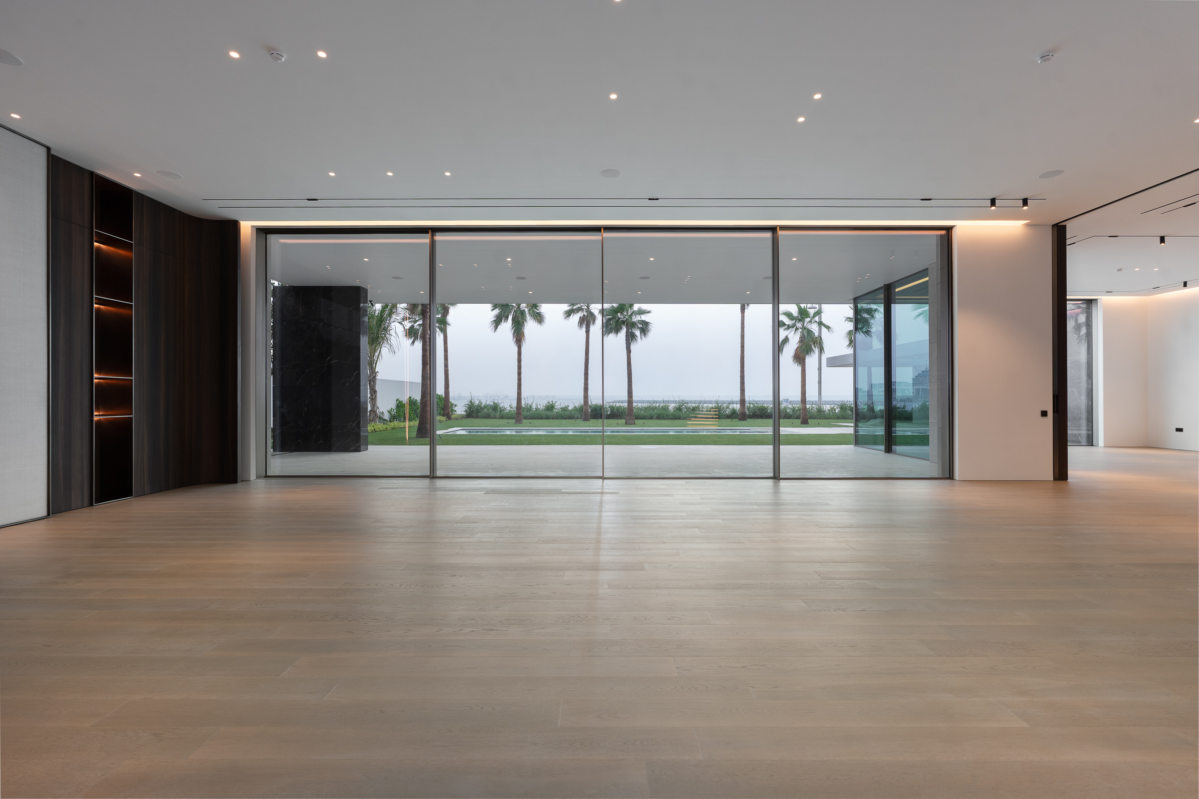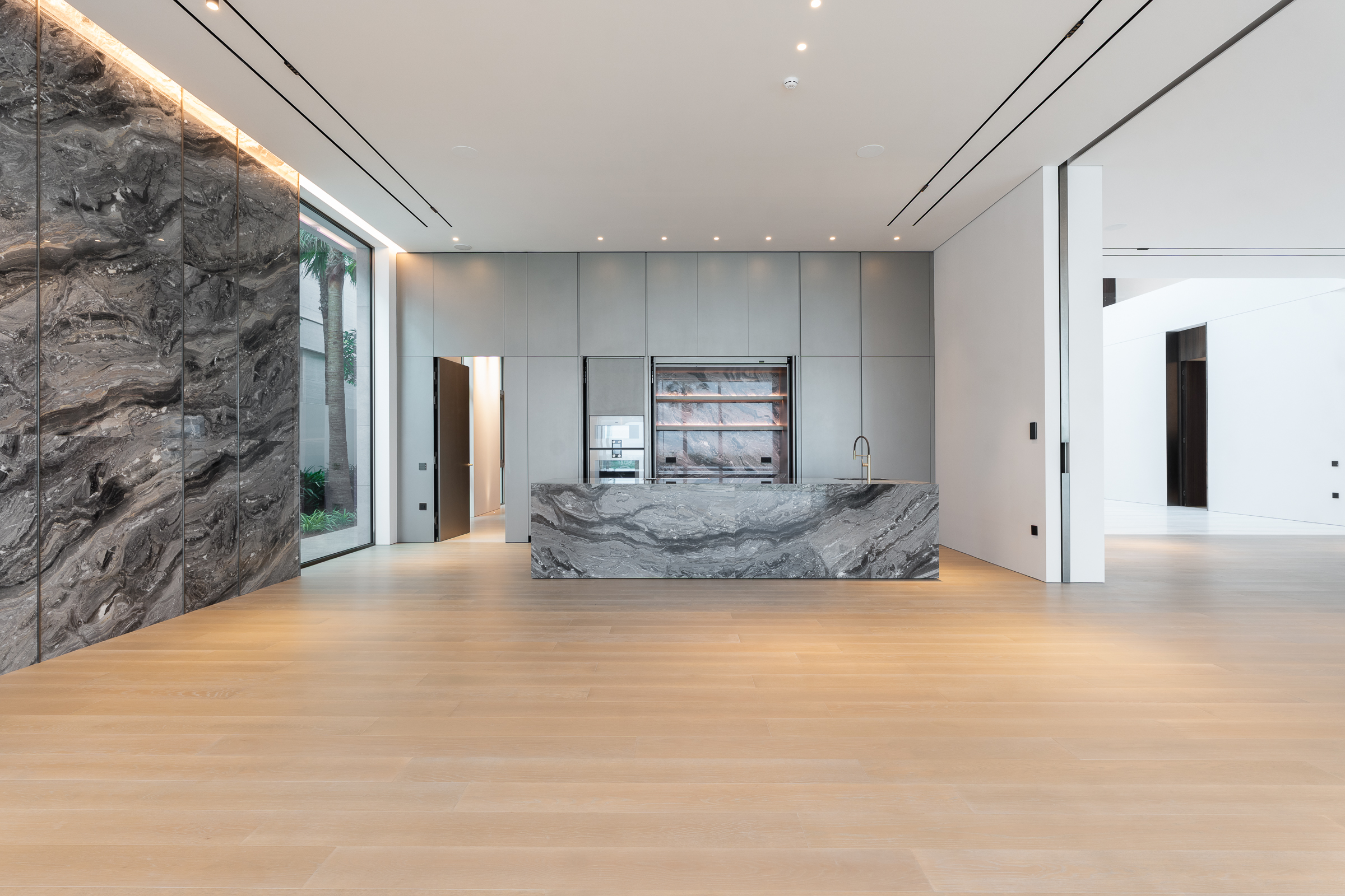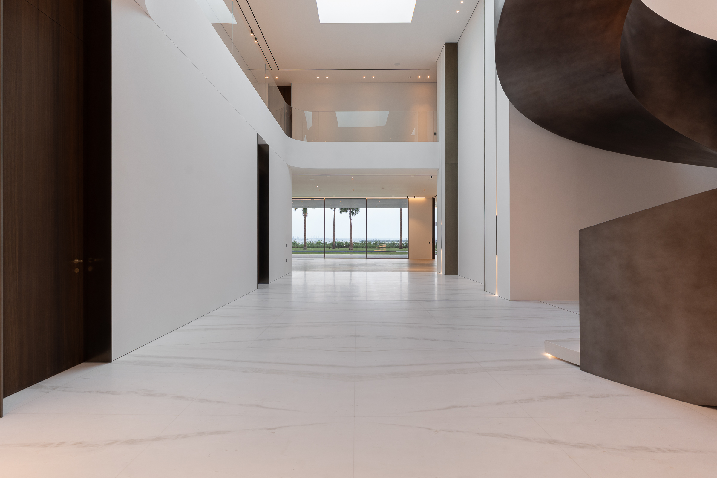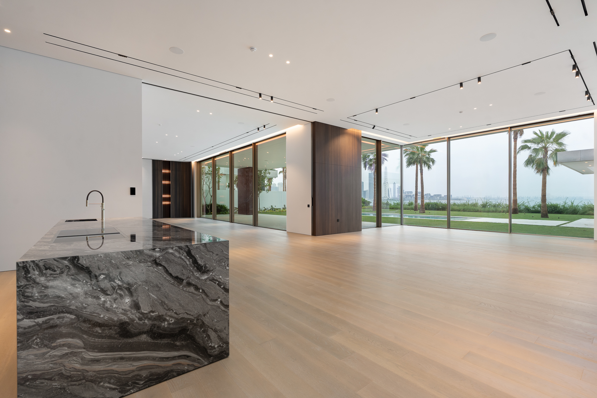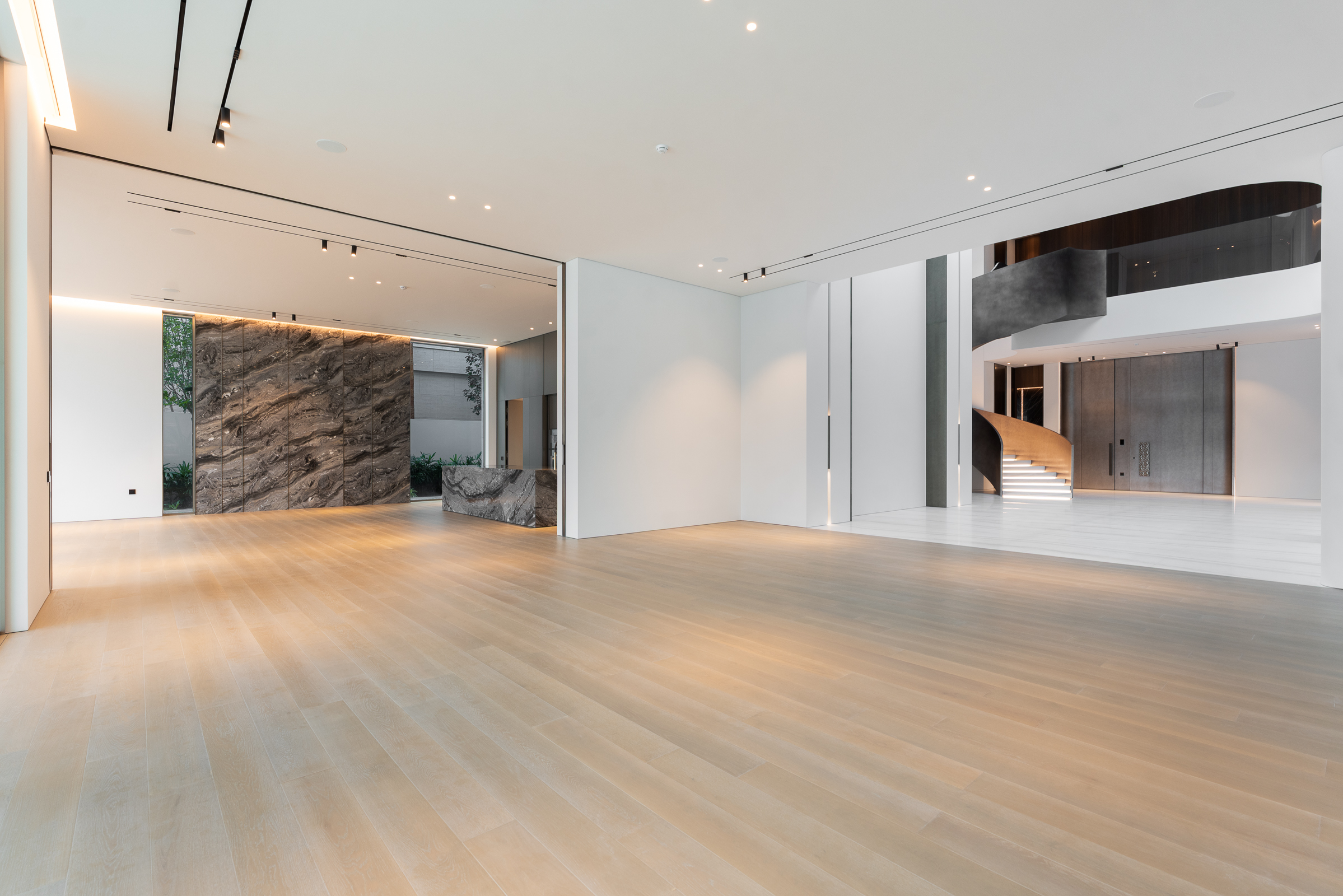 Interiors boast double-height proportions throughout, with each room illuminated by floor-to-ceiling windows; marble and wooden finishes further elevate the look and feel.