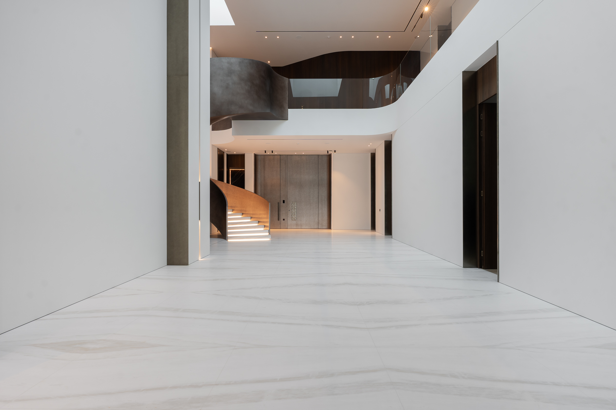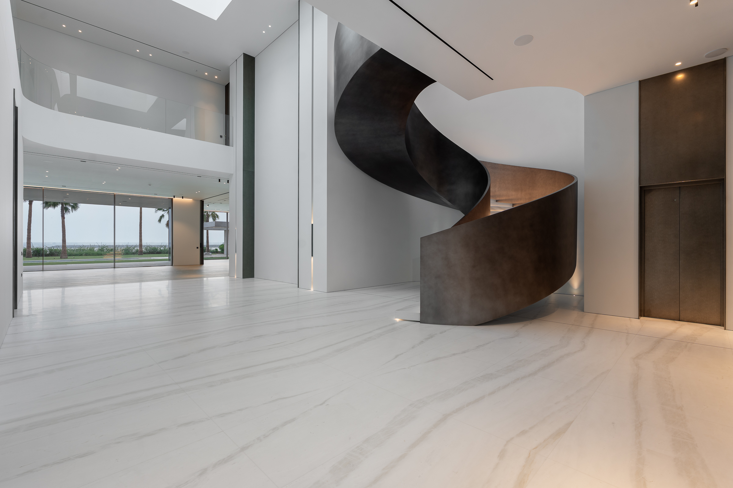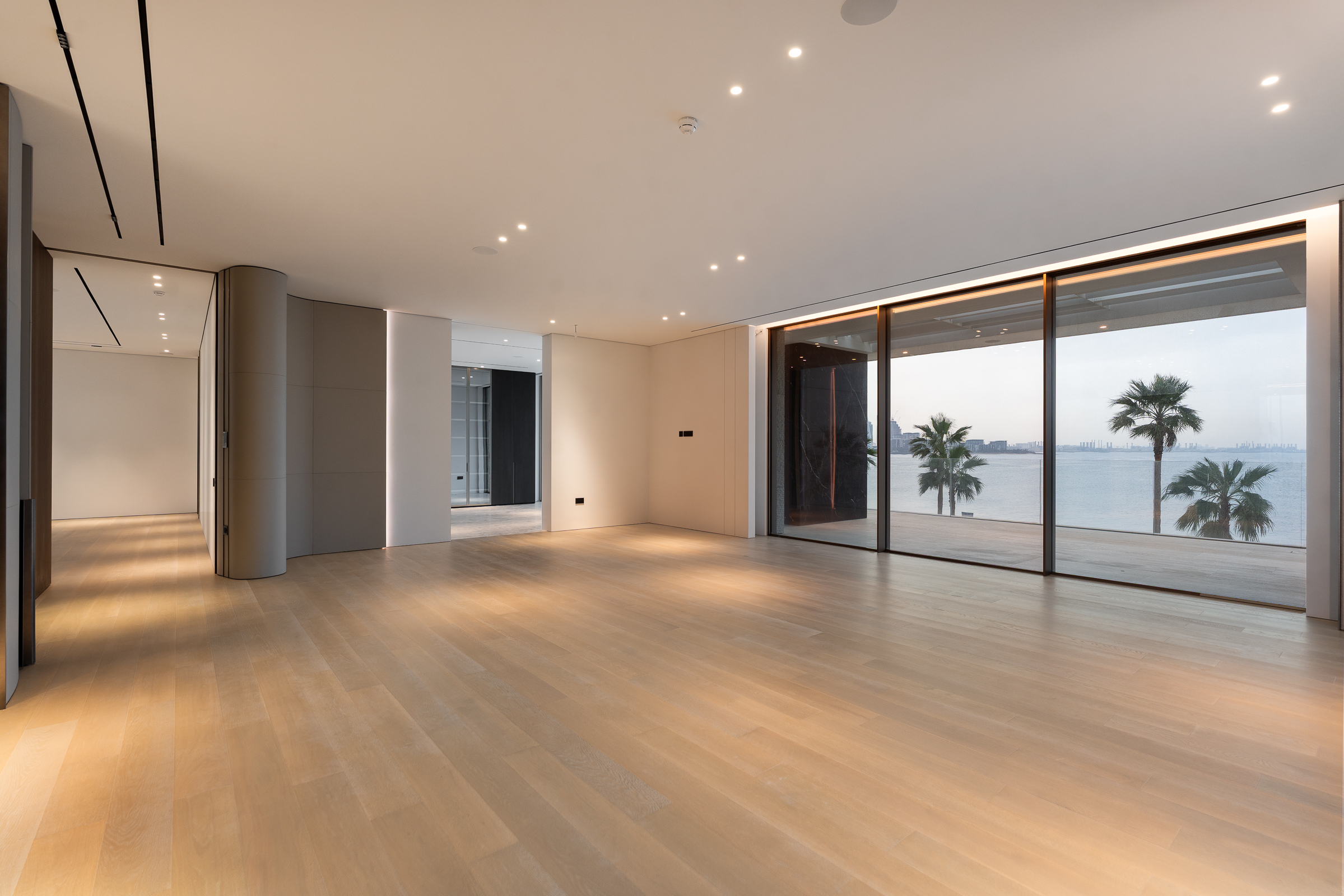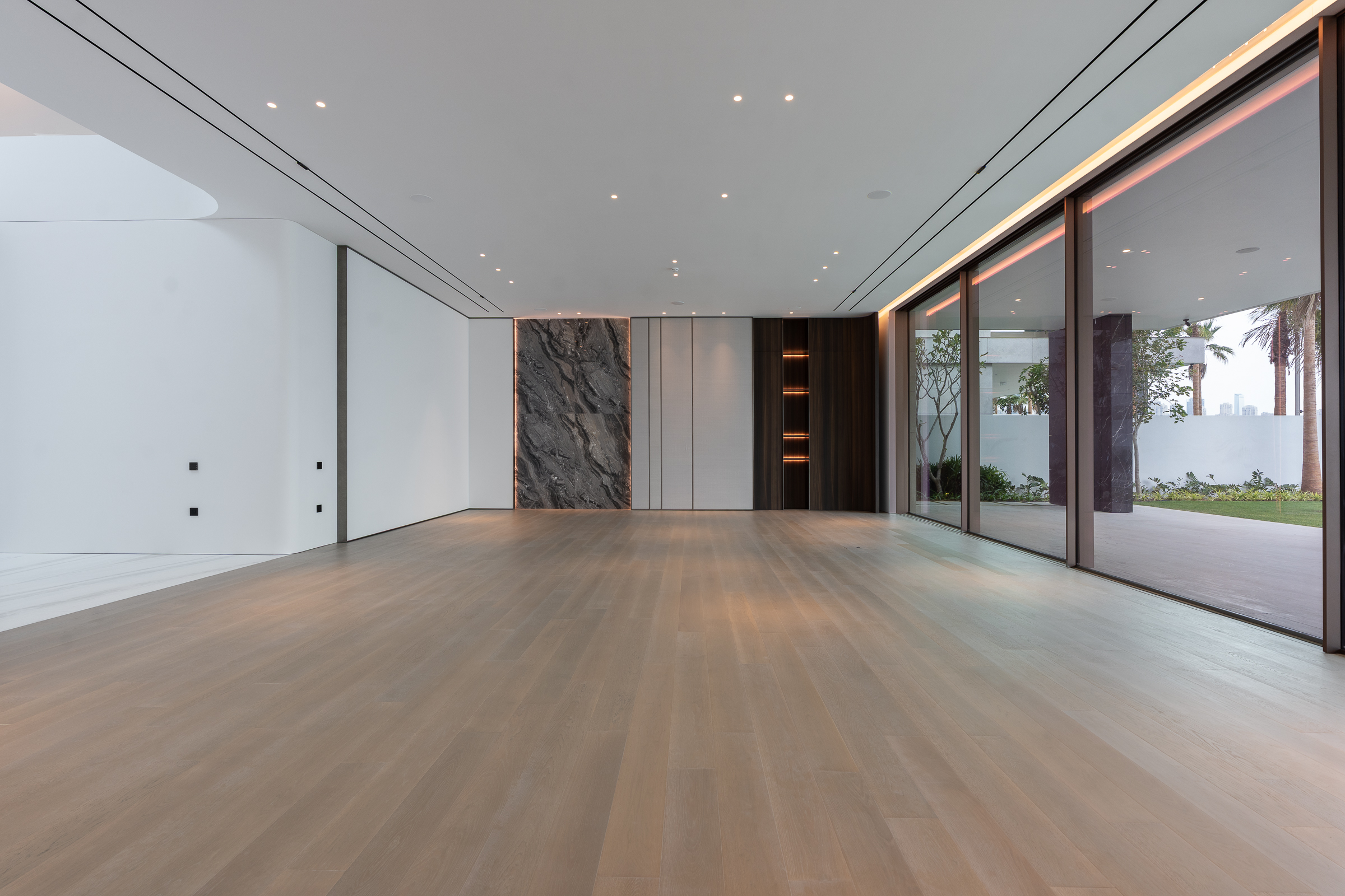 Interiors boast double-height proportions throughout, with each room illuminated by floor-to-ceiling windows; marble and wooden finishes further elevate the look and feel.