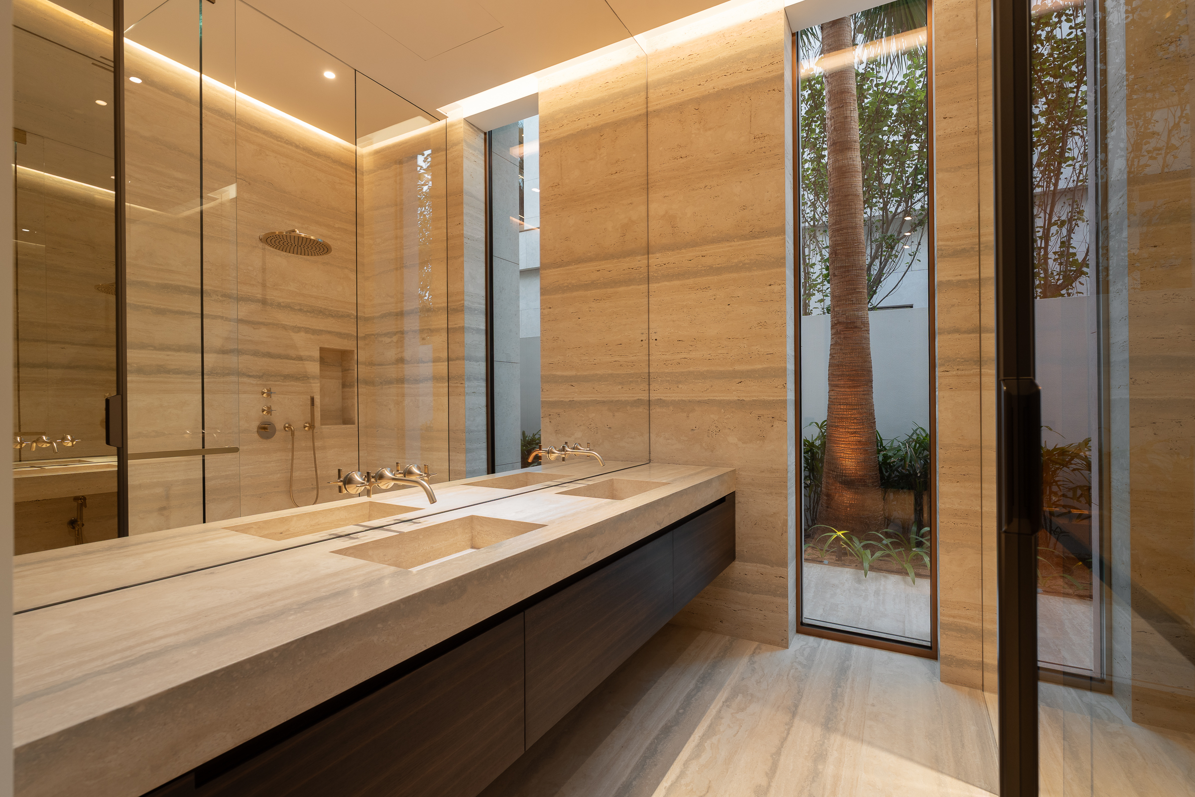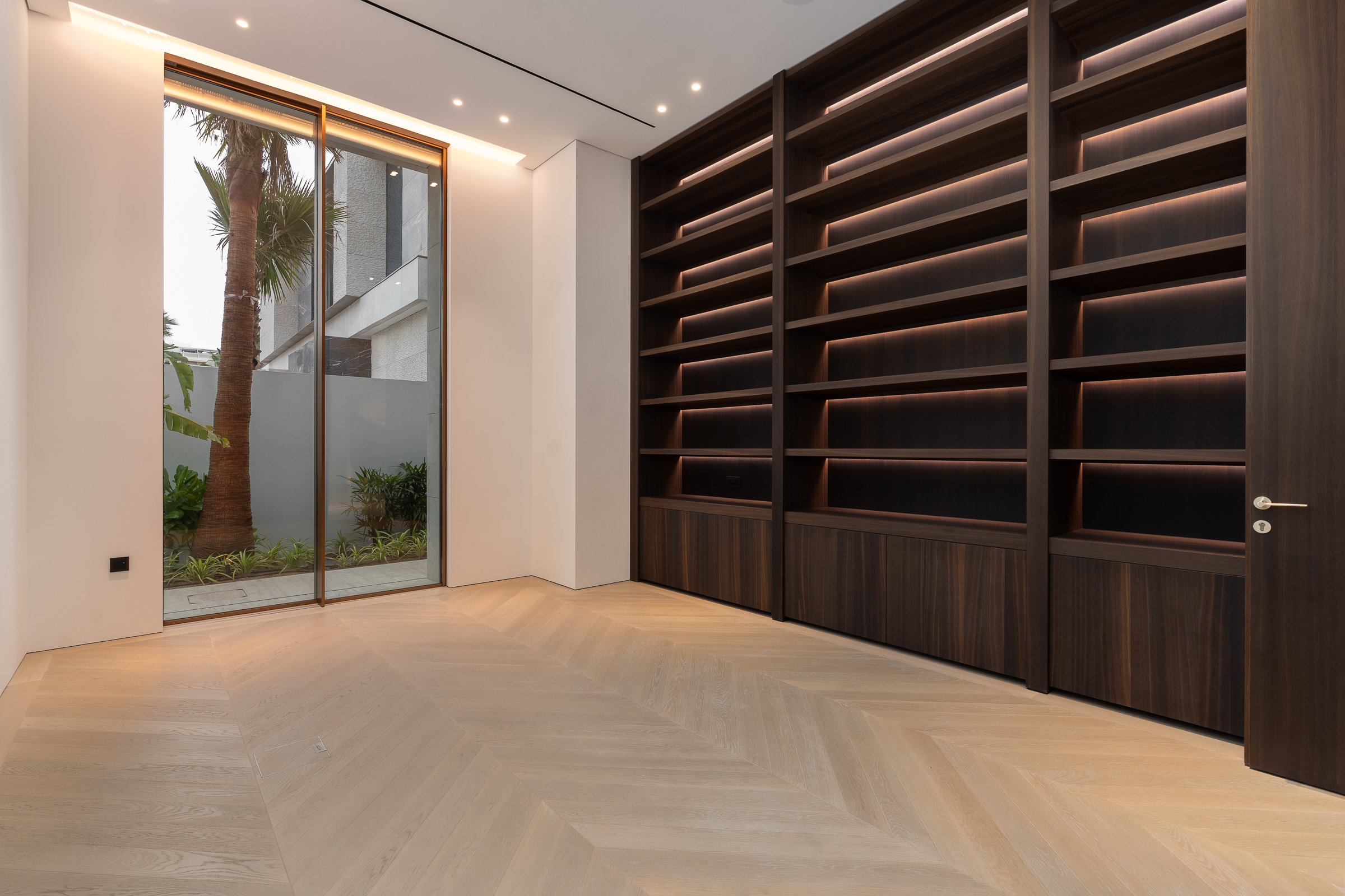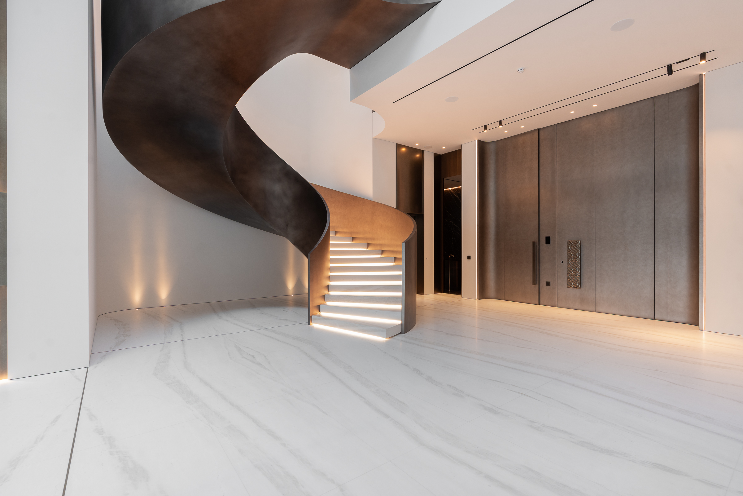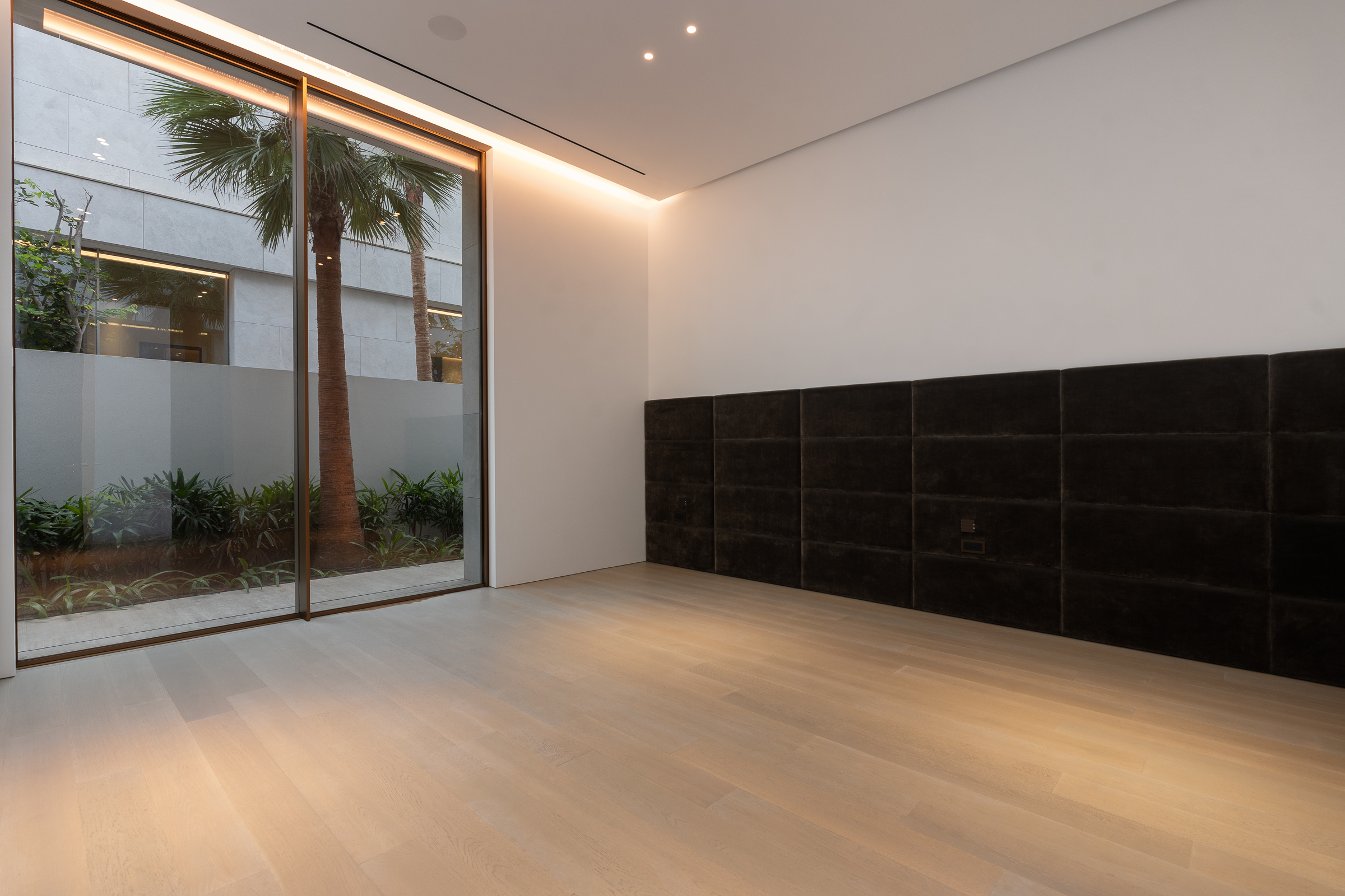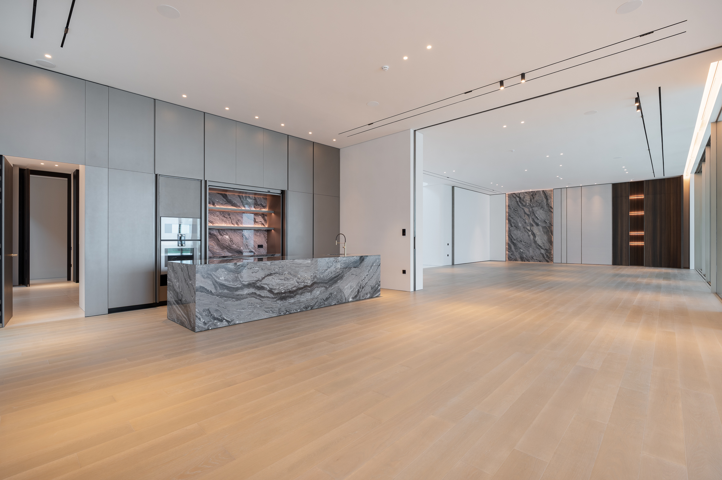 Interiors boast double-height proportions throughout, with each room illuminated by floor-to-ceiling windows; marble and wooden finishes further elevate the look and feel.