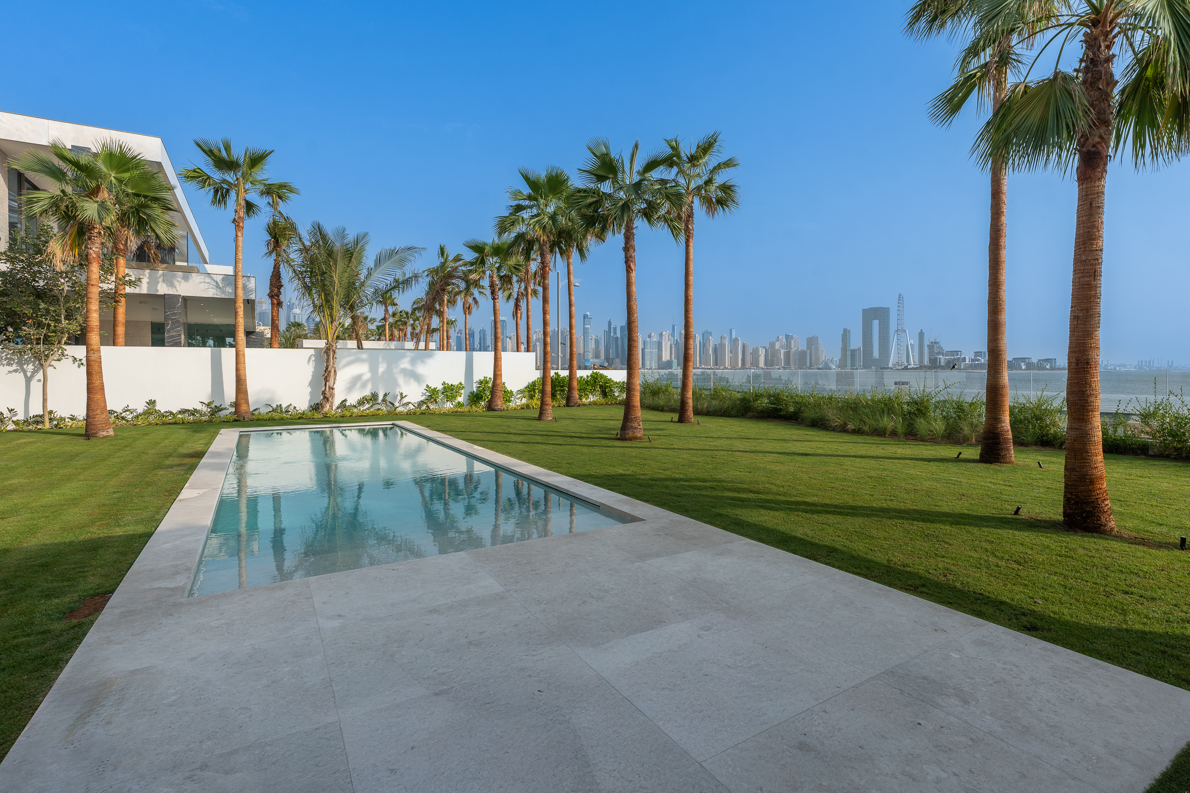 The glazing offers a seamless indoor-outdoor connection, opening out to the sweeping backyard. Creating the perfect al fresco setup are a long swimming pool, shaded dining setup equipped to support a summer kitchen, stunning landscaping, and private beach access paired with unobstructed sea views.
