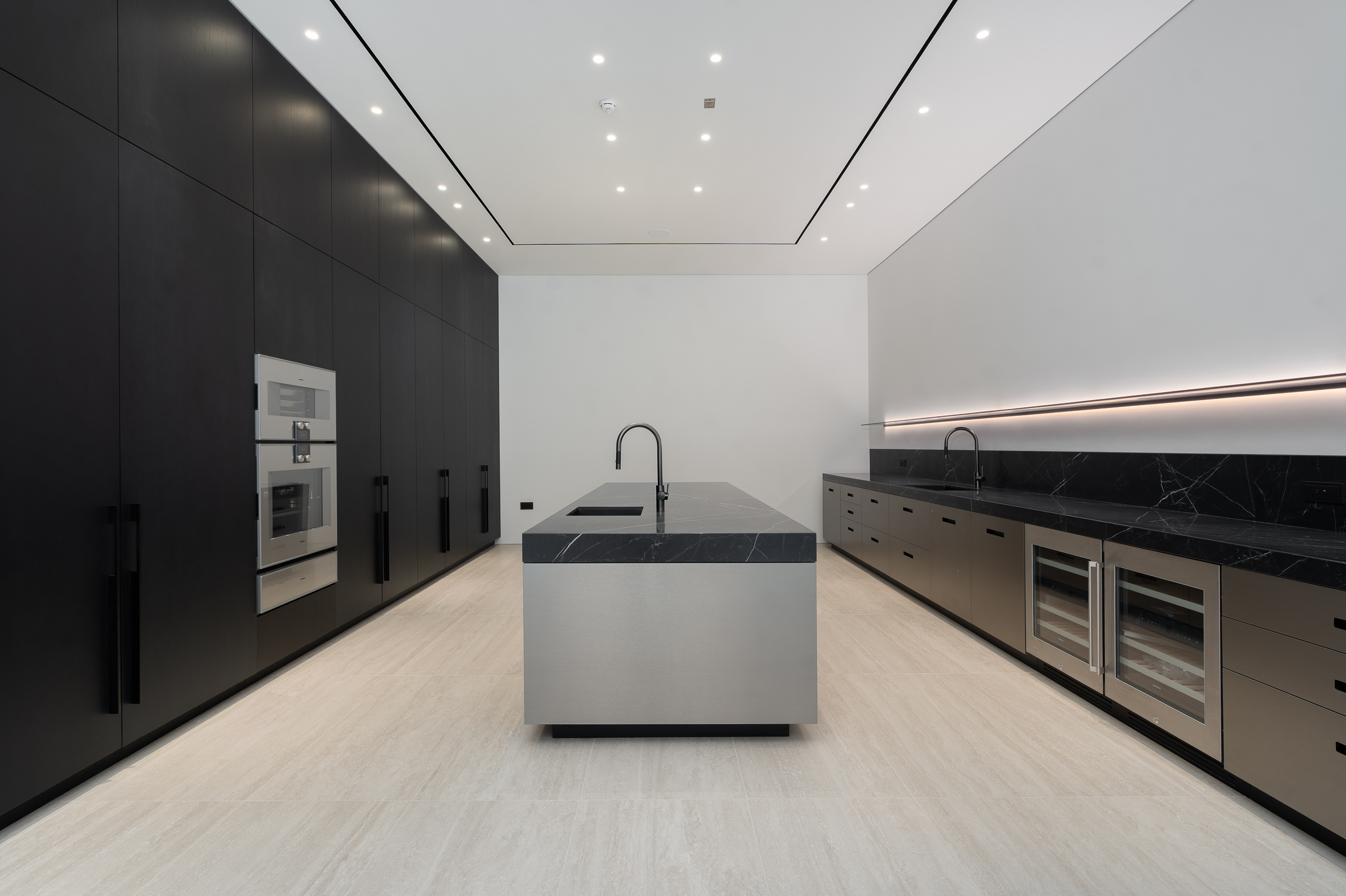 The breathtaking volume is evident right upon entry, as the home opens with a vast reception anchored by a cascading spiral staircase connecting each floor. This space leads into the expansive open-concept living room, dining space and an exquisite professional-grade chef’s kitchen complemented by a secondary kitchen — each fitted with top-notch appliances.