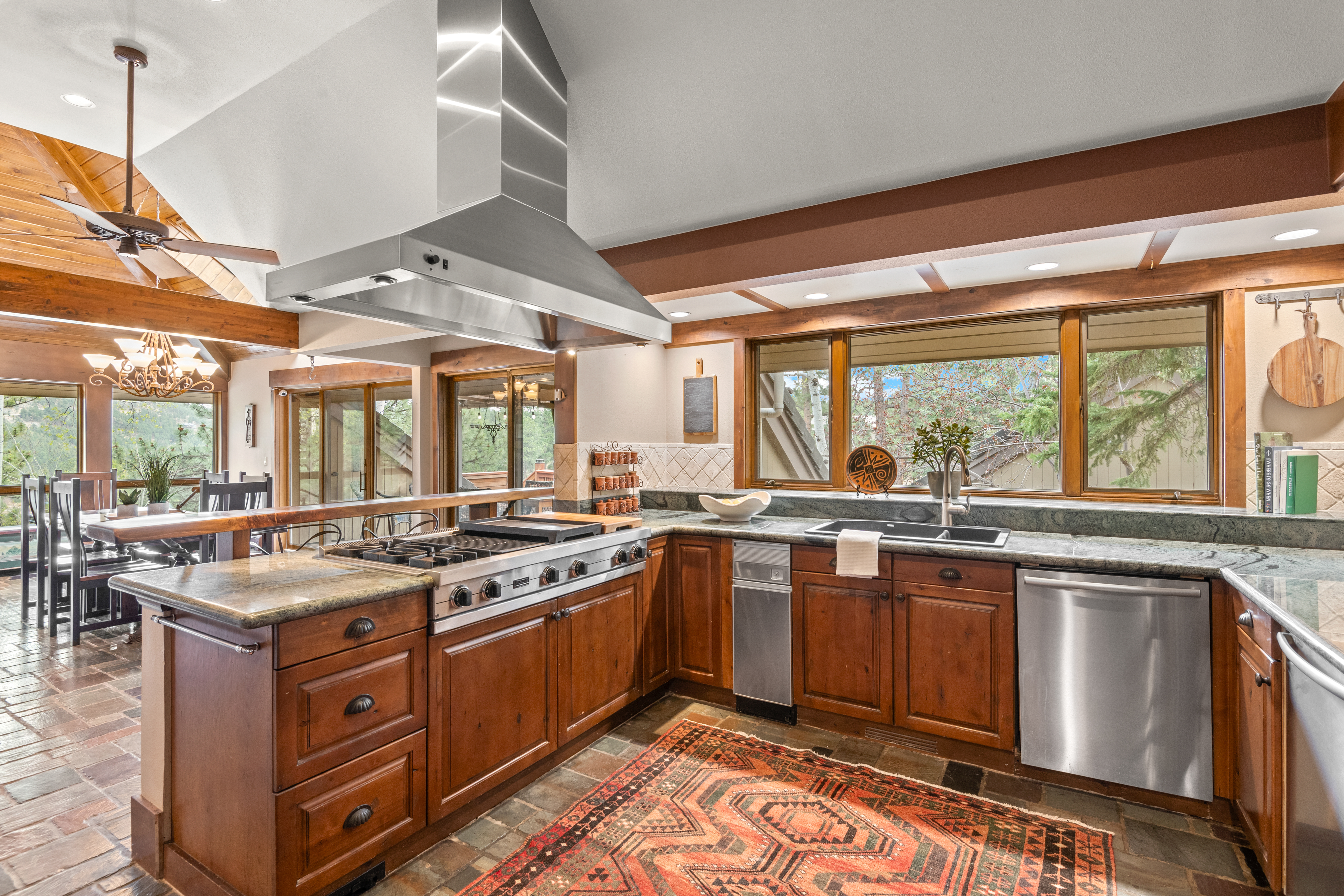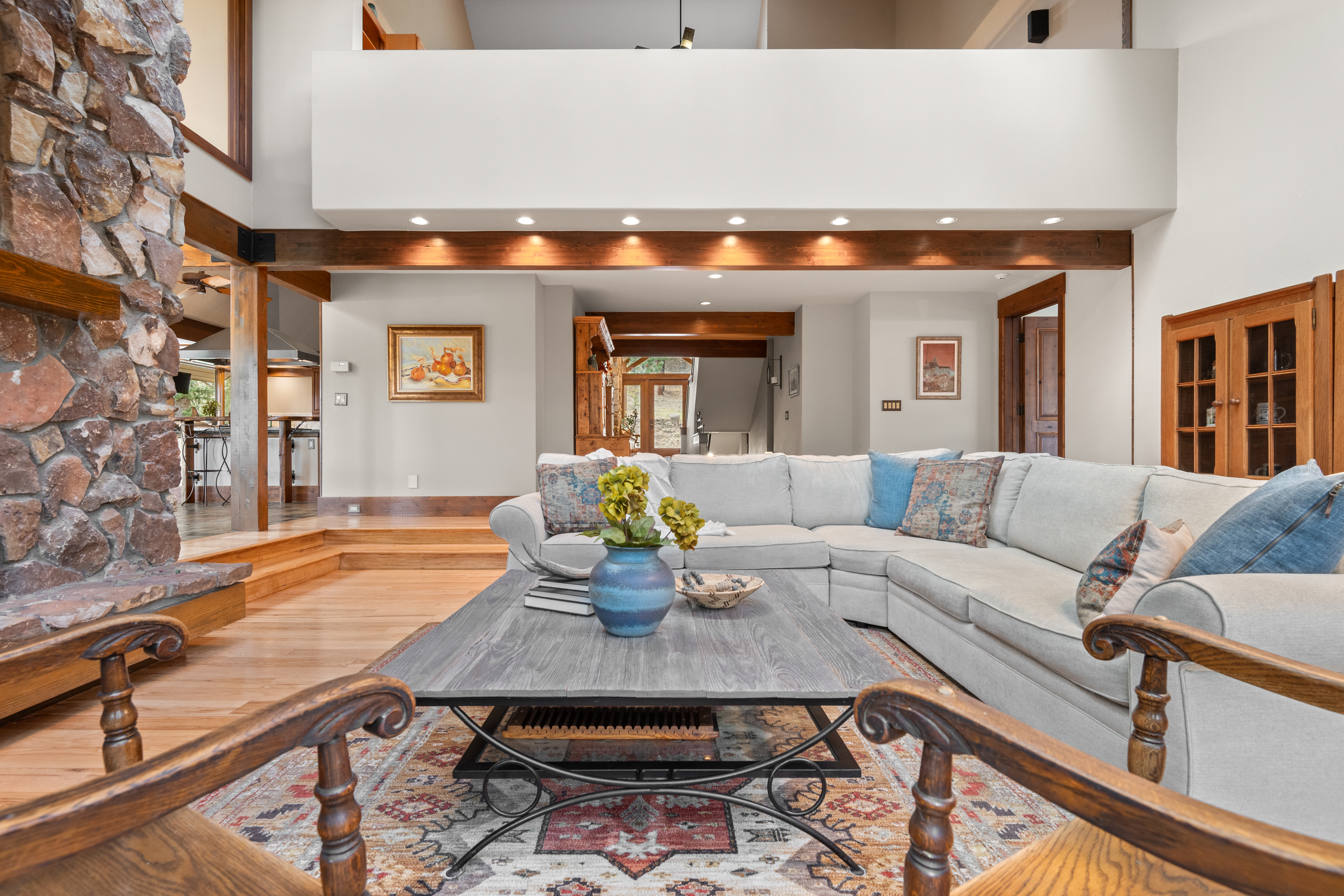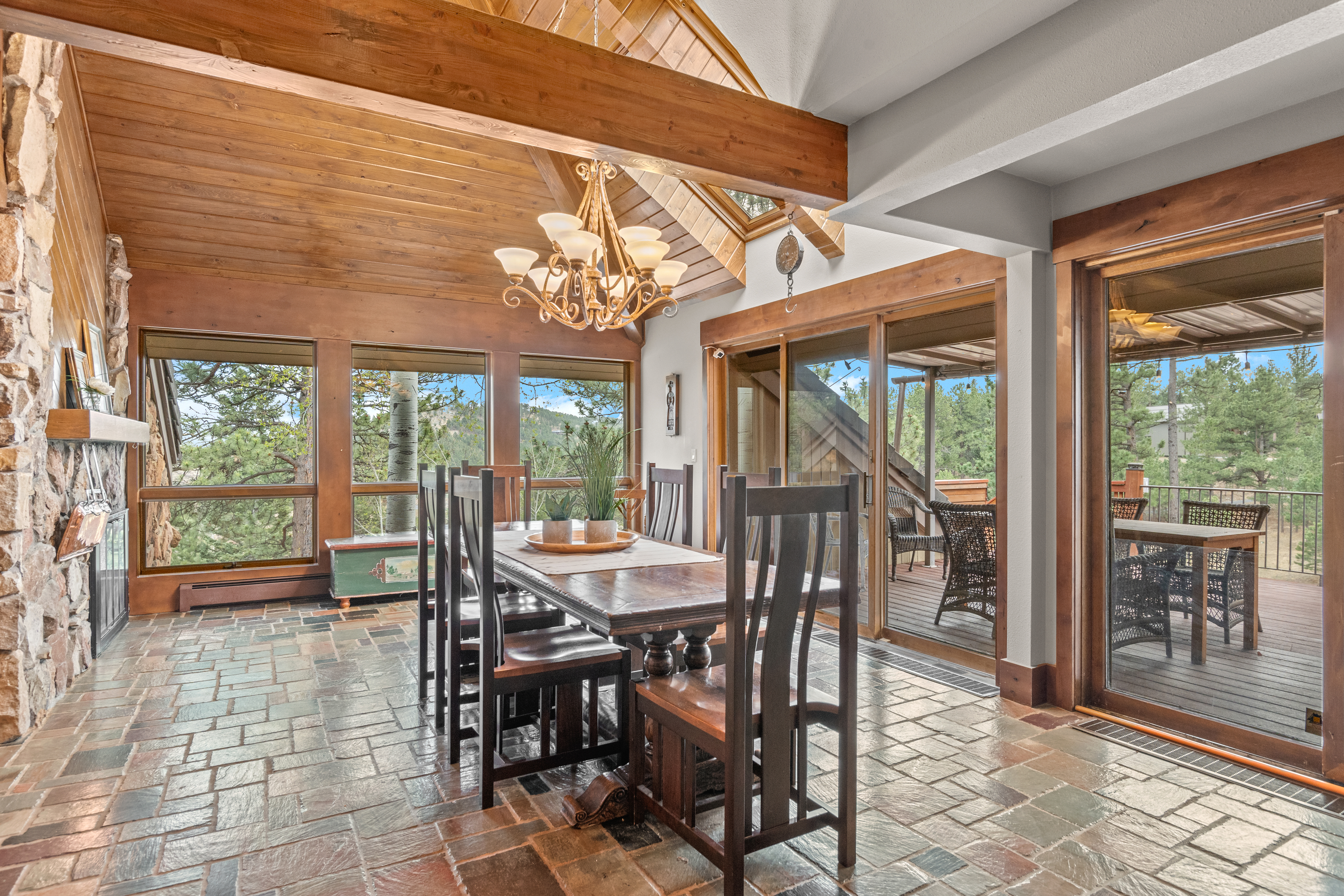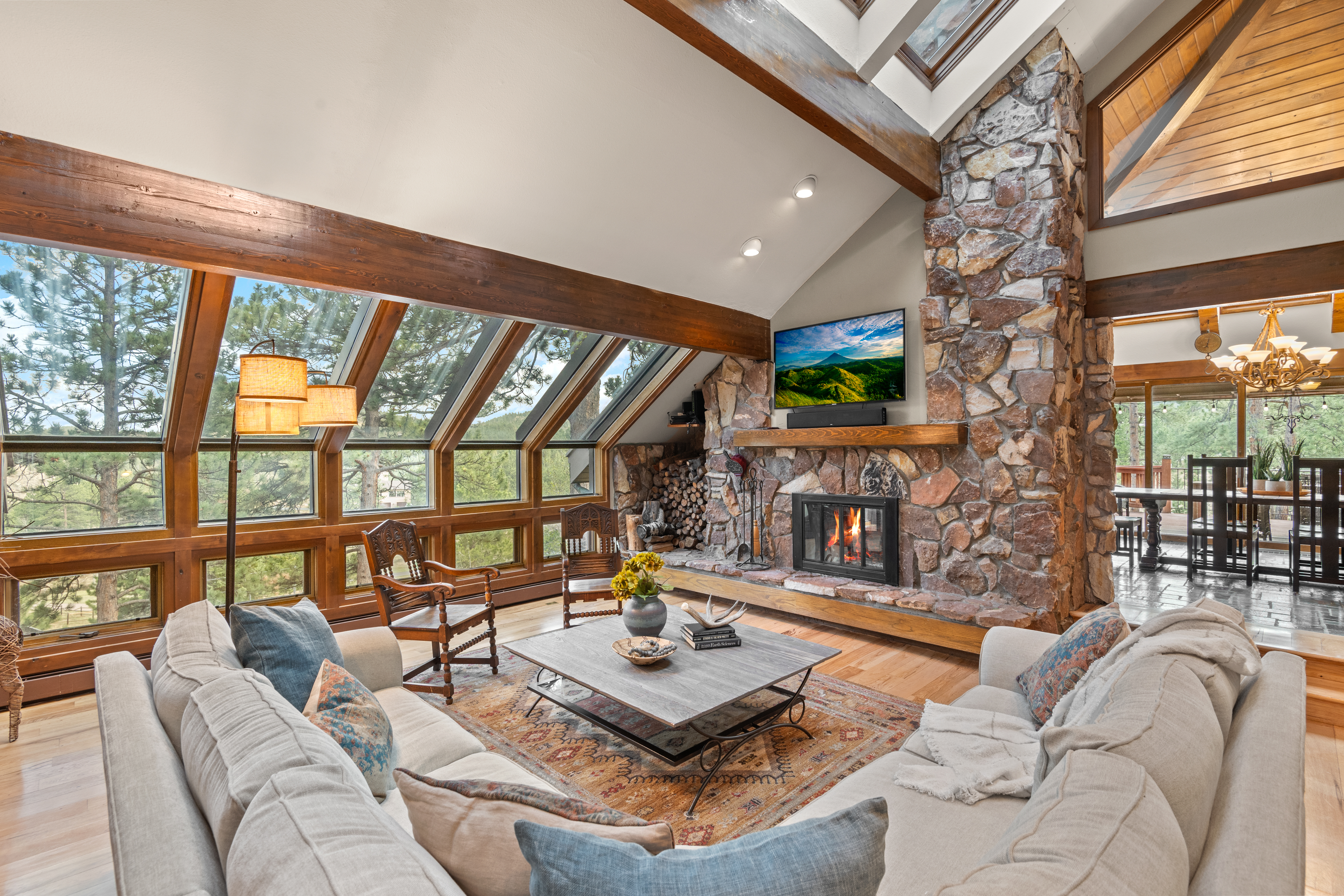 Welcome to 33208 Alta Vista Drive, an exceptional mountain estate in Evergreen’s coveted Soda Creek, one of the area’s crown jewel neighborhoods. Set on five private acres, the property is nestled among a stunning mix of aspen, ponderosa, and spruce, with a winding dual entrance drive that creates a memorable sense of arrival. Previously owned and thoughtfully renovated by renowned local builder David Williams, known for bringing the outdoors in, the home reflects a deep connection to its natural surroundings.Designed for true main-floor living, the home offers a seamless, open layout filled with natural light and rich finishes. Expansive hickory wood flooring carries throughout, anchored by a dramatic double-sided moss-rock fireplace connecting the great room and formal dining area. The chef’s kitchen features slab granite countertops, stainless steel appliances, and a generous breakfast bar that opens to the dining room, ideal for both everyday living and entertaining.The primary suite is a private retreat with its own deck and a luxurious en suite bath featuring a custom walk-in shower, soaking tub, dual sinks, water closets, and an expansive wraparound walk-through closet.Upstairs, a private office with built-ins and a spacious loft offer flexibility for work, recreation, or media space. The lower level is designed for comfort and entertaining, with two bedrooms, two bathrooms, a full wet bar, and a spacious recreation area.Outdoor living is equally impressive, with tiered decks that capture the surrounding beauty and eastern valley views. A flagstone patio with a plumbed gas fireplace and tranquil water feature overlooks the lighted tennis court and a charming studio and guest house, complete with a bathroom and wood-burning fireplace.Enjoy Soda Creek’s private pond, fishing, and miles of trails, all just minutes from Evergreen’s shops, dining, and amenities.