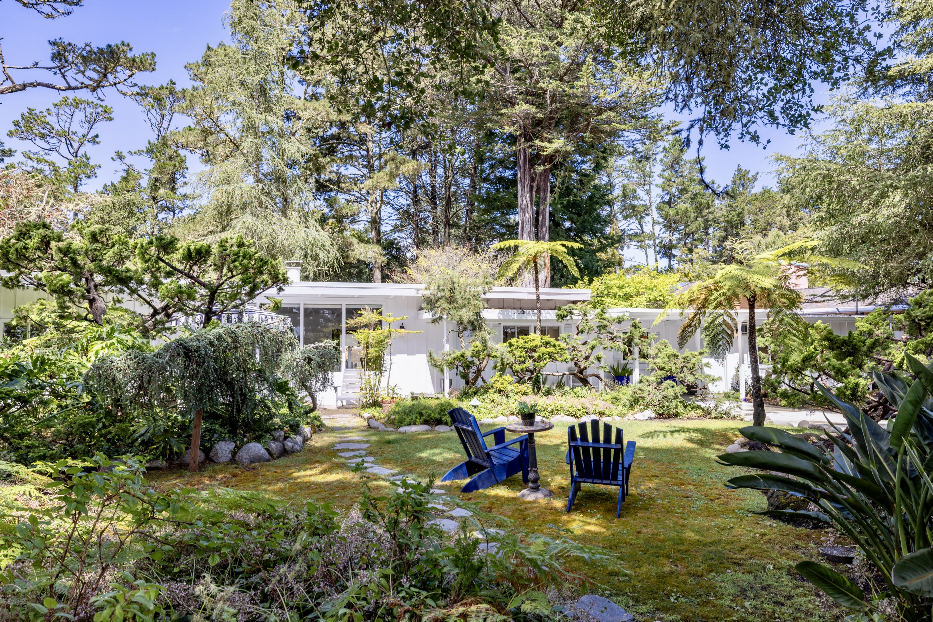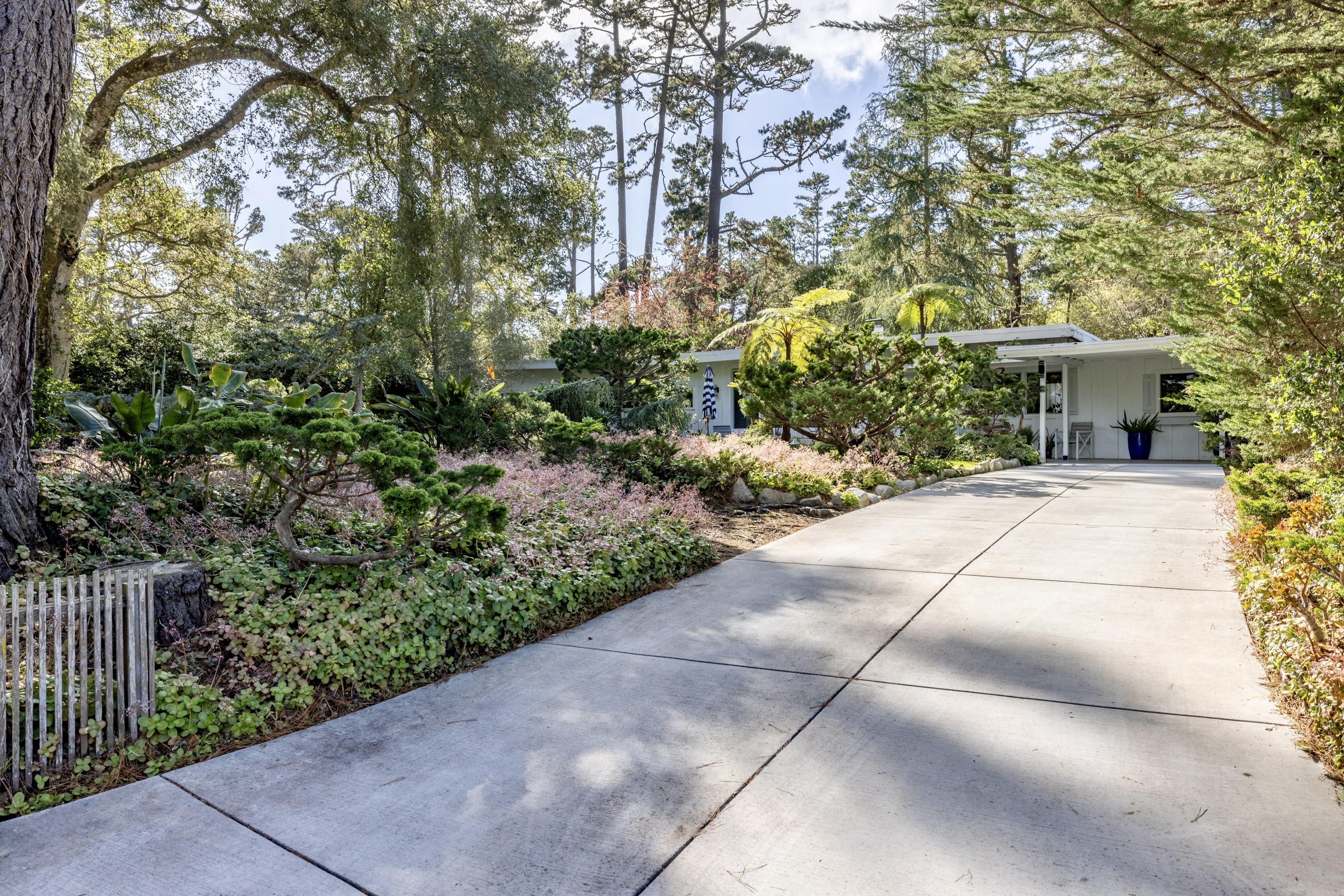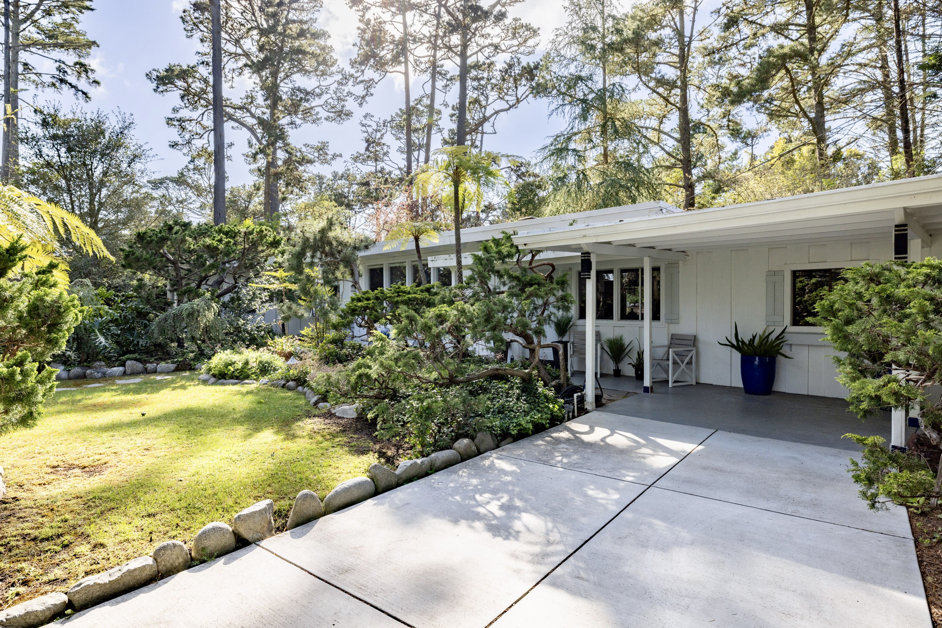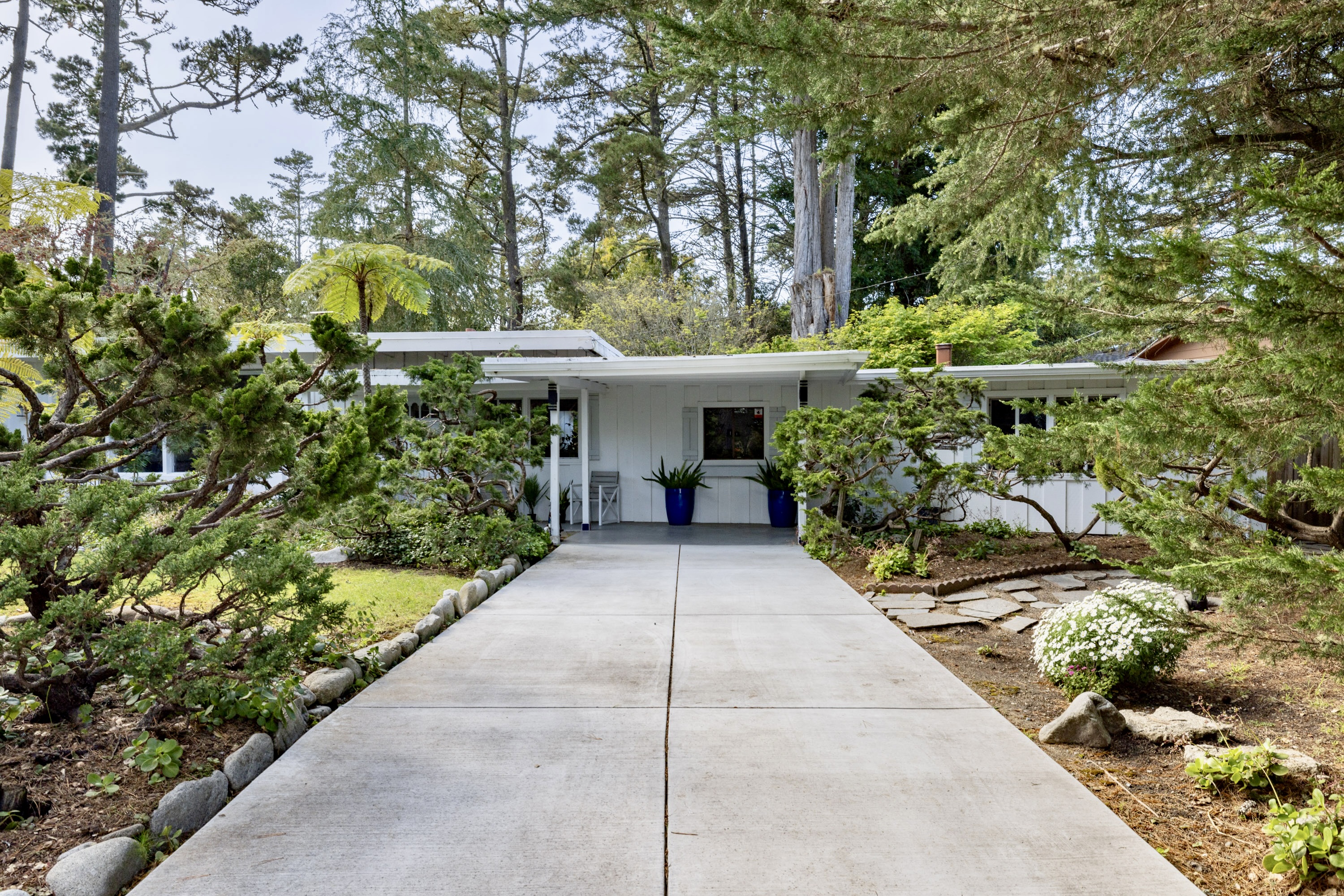 Tucked behind the gates of world-famous Pebble Beach, this secluded mid-century modern property offers a rare blend of privacy, charm, and versatility. Set back from the street on an expansive, park-like setting, the single-level layout features a 2-bed, 1-bath main residence plus a fully equipped 1-bath guest studio with kitchen, ideal for visitors or extended stays. A covered front porch veranda invites indoor-outdoor living, overlooking lush, tranquil gardens and flagstone walkways. Inside the main home, lofty ceilings with exposed beams and walls of windows fill the space with natural light. Highlights include a cozy fireplace with tile surround, an elegant dining alcove and an open kitchen with updated stainless appliances and beautiful garden views. Updated engineered hardwood floors run throughout, and the updated full bath features tile and marble finishes. Both bedrooms offer generous dual-closets for ample storage. The detached guest studio provides private living quarters with Spanish tile floors, full kitchen and updated bath, perfect for hosting in comfort and style. Recent exterior upgrades include new driveway, retaining walls and fencing. Moments from world-class golf, pristine beaches, refined dining and boutique shops, this is coastal living at its finest.