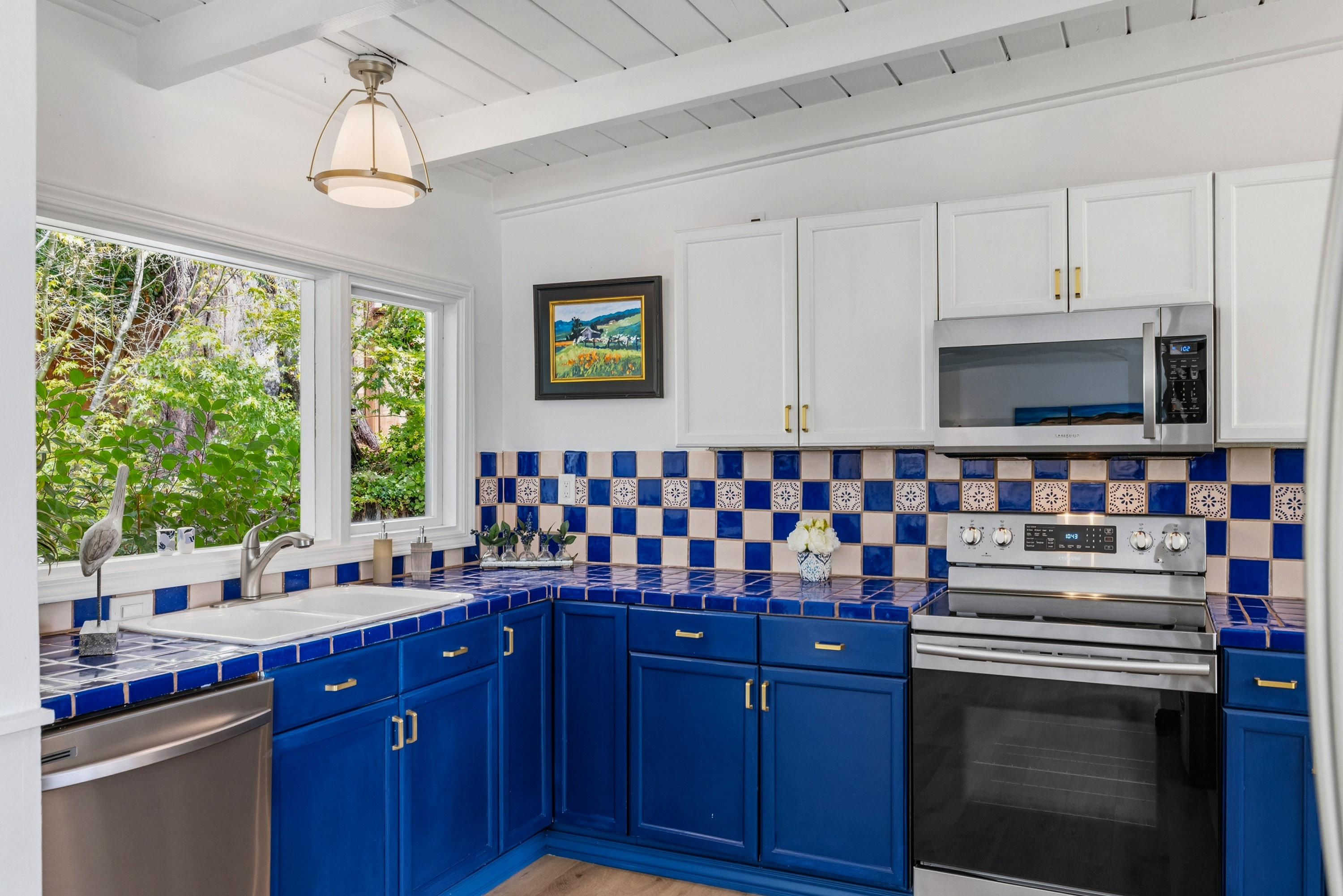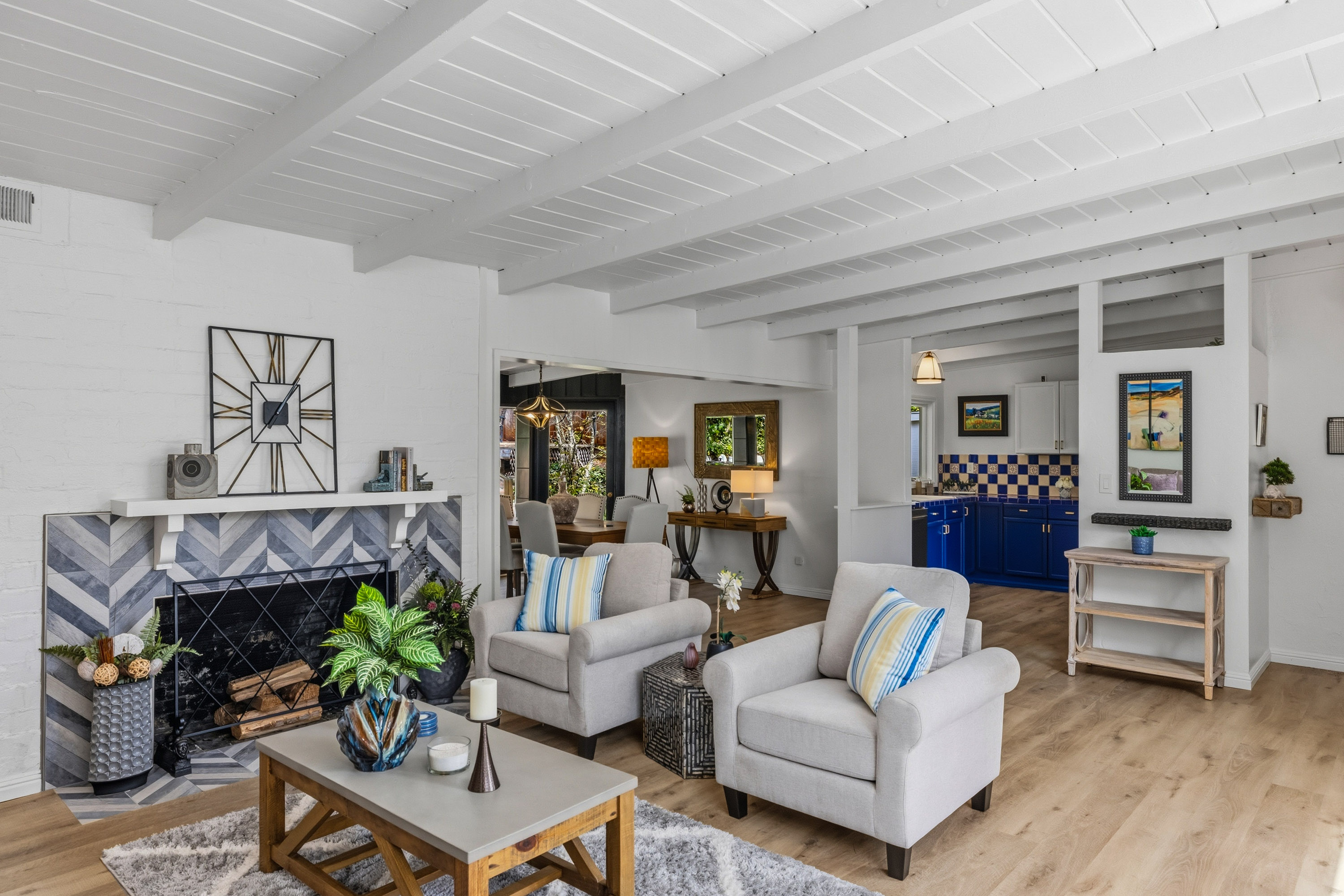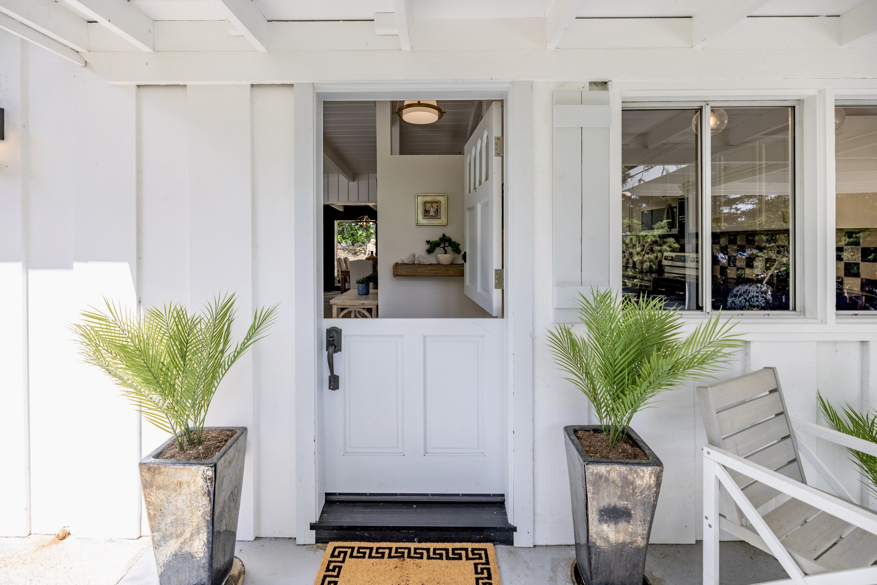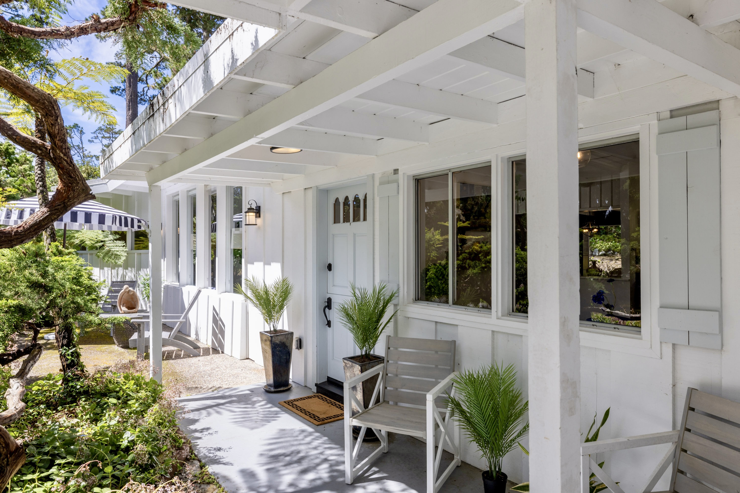 Tucked behind the gates of world-famous Pebble Beach, this secluded mid-century modern property offers a rare blend of privacy, charm, and versatility. Set back from the street on an expansive, park-like setting, the single-level layout features a 2-bed, 1-bath main residence plus a fully equipped 1-bath guest studio with kitchen, ideal for visitors or extended stays. A covered front porch veranda invites indoor-outdoor living, overlooking lush, tranquil gardens and flagstone walkways. Inside the main home, lofty ceilings with exposed beams and walls of windows fill the space with natural light. Highlights include a cozy fireplace with tile surround, an elegant dining alcove and an open kitchen with updated stainless appliances and beautiful garden views. Updated engineered hardwood floors run throughout, and the updated full bath features tile and marble finishes. Both bedrooms offer generous dual-closets for ample storage. The detached guest studio provides private living quarters with Spanish tile floors, full kitchen and updated bath, perfect for hosting in comfort and style. Recent exterior upgrades include new driveway, retaining walls and fencing. Moments from world-class golf, pristine beaches, refined dining and boutique shops, this is coastal living at its finest.