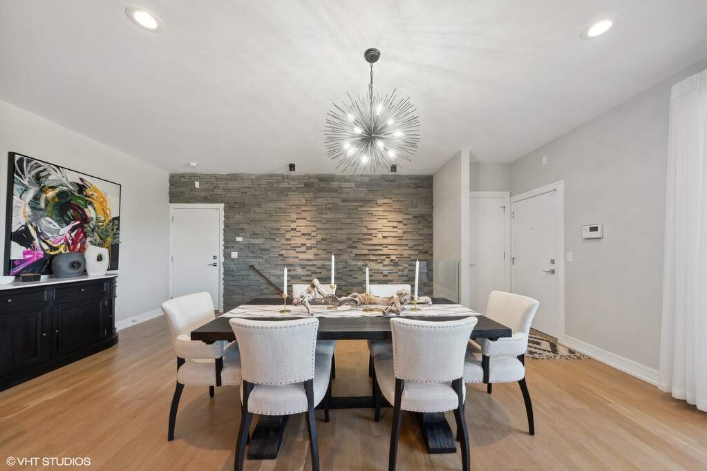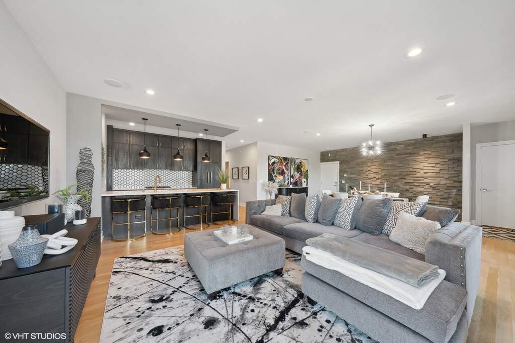 A refined balance of modern design and effortless living unfolds across more than 3,000 square feet in this architecturally striking residence, offering three bedrooms and three baths. From the moment you enter, the home's design-forward aesthetic is evident-textural feature walls, curated lighting, and wide-plank hardwood flooring create a warm yet sophisticated backdrop. The main living level flows seamlessly, connecting the living, dining, and kitchen spaces in a way that feels both open and intentional. At the heart of the home, the kitchen pairs sleek cabinetry with high-end appliances and a statement island designed for gathering, while the adjacent dining space is framed by dramatic lighting and architectural detail. The living area offers a comfortable yet elevated setting, ideal for both everyday living and entertaining. The primary suite serves as a private retreat, anchored by rich textures and a calming palette, with a spa-inspired bath featuring a walk-in shower and clean, modern finishes. The lower level expands the living experience with impressive ceiling height and radiant heated floors, creating a versatile lounge space complete with a wet bar-perfect for entertaining or unwinding. From here, the home transitions effortlessly to a sunken outdoor patio with fireplace, offering a rare, intimate setting for year-round enjoyment. Outdoor living is a defining feature, with three distinct spaces designed for both relaxation and entertaining. A balcony just off the kitchen is ideal for grilling and casual evenings, while the expansive garage rooftop deck has been thoughtfully envisioned as a true extension of the home-complete with lounge seating, dining space, and layered greenery, creating a private urban retreat rarely found in the city. Additional highlights include garage parking, ample storage, and a location that places you moments from Chicago's best dining, shopping, and neighborhood conveniences.