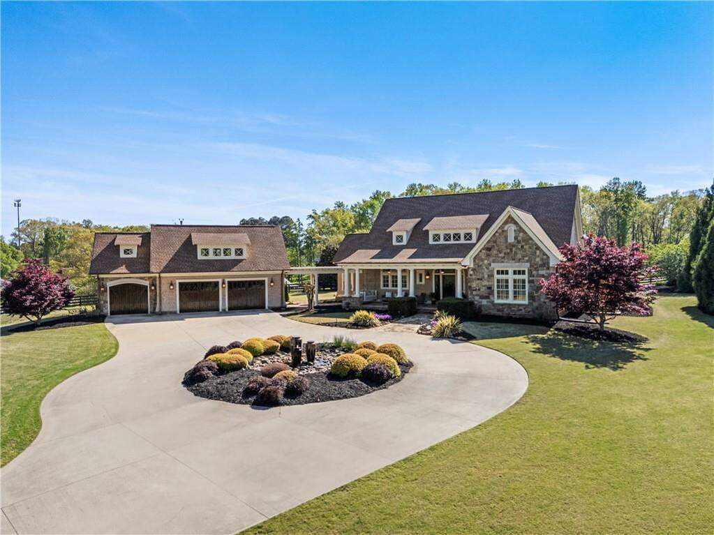 Discover a rare opportunity to own a private, gated estate in one of Cherokee County's most coveted areas-just minutes from the Milton border, top-rated schools, the Crabapple District, and vibrant downtown Alpharetta. Set on 2.78 manicured acres, this custom-built 2012 Southern retreat blends timeless rustic elegance with modern luxury, offering an unmatched lifestyle of privacy, comfort, and refined living. A long, tree-lined gated driveway leads to the welcoming covered front porch, complete with a classic porch swing that sets the tone for the warmth and character found throughout the home. Inside, the main level is designed for effortless everyday living, featuring a rare primary suite on the main and a beautifully curated floor plan filled with natural light. At the heart of the home, the gourmet kitchen impresses with stone countertops, a Wolf range, farmhouse sink overlooking the backyard, a spacious island with secondary prep sink, walk-in country pantry, a butler's pantry/coffee-breakfast-wine bar, and light-filled dining room. The fireside great room has full access to a vaulted covered patio with an outdoor fireplace and full outdoor kitchen-perfect for year-round entertaining and overlooking the PebbleTec pool and spa. Upstairs, a central loft with built-in desks and shelving provides an ideal office, homework, or creative workspace. Two generous en-suite bedrooms each offer private baths, ensuring comfort and privacy for family or guests. The terrace level expands the home's versatility with a second family room and fireplace, a guest bedroom with full bath, a separate half bath, and a flexible workout or gaming room. A spacious main-level laundry and mudroom connect via a covered stone walkway to the oversized three-car garage. Above the garage, a full in-law or guest suite offers a private living area, kitchenette, sleeping area, and full bath-perfect for extended stays. Outdoors, the property truly shines. The flat, usable acreage is fully fenced and thoughtfully landscaped, offering open green space, multiple garden areas-including a charming pumpkin patch-and a barn with power for hobby farming, storage, or future customization. The dedicated pool bath off the garage is an added convenience as well. High-quality craftsmanship, and a setting that feels worlds away yet close to everything, this estate delivers a polished, effortless take on luxury countryside living. A true Southern Charmer!
