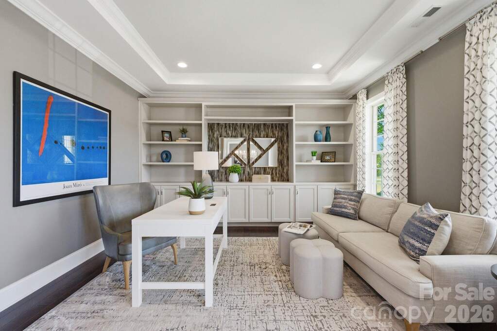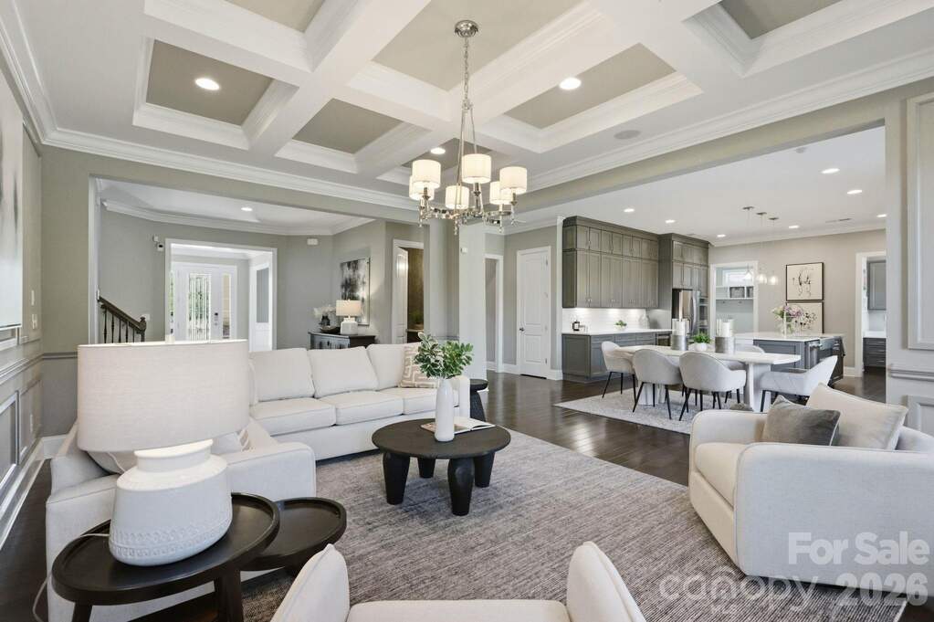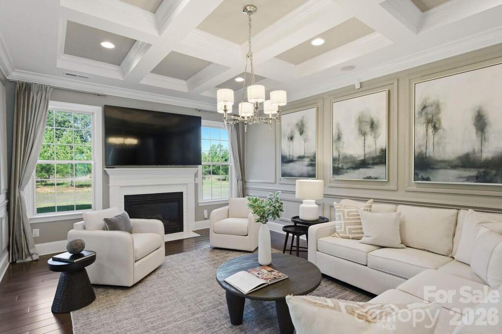 Situated in the desirable Weddington area, this former model home showcases a seamless blend of thoughtful design, quality craftsmanship, and modern comfort. From its impressive curb appeal and side-load three-car garage to the level backyard, with views of the woods this home offers both presence and privacy. A welcoming foyer with 10-foot ceilings, engineered hardwood flooring, and detailed millwork leads to well-appointed formal living and dining spaces, as well as a spacious great room featuring coffered ceilings and a gas fireplace. The kitchen is designed for both functionality and entertaining, complete with an oversized island, quartz countertops, stainless steel appliances, farmhouse sink, walk-in pantry, and custom cabinetry. The adjacent covered patio and firepit create an easy transition to outdoor living. The main level includes a desirable guest suite with a full bath. Upstairs, the primary suite offers a private retreat with a sitting area, balcony access, dual walk-in closets, direct laundry access, and a well-appointed bath. Secondary bedrooms are generously sized, each with its own en-suite bath. A flex space room could be a space for crafts or another office. A bonus/media room with custom finishes and surround sound, along with a third-floor flex space, provide additional versatility for a variety of needs. Additional features include a finished garage, irrigation system, and numerous designer upgrades throughout. Conveniently located near Waverly, Rea Farms, and Blakeney, with access to local amenities including fitness centers and recreational facilities. The expansive lot offers potential for a future pool or outdoor living expansion. Award winning schools.