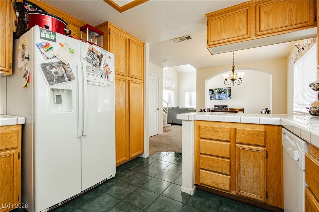 Attention Investors! Tenant in place until 1/31/2027. Welcome to your new home. This spacious 3 bedroom, 2.5 bath rental features an open layout featuring high vaulted ceilings in the carpeted living room. The kitchen features tile countertops, all white appliances, plenty of cabinetry and a large window to look out into the huge backyard. Upstairs you will find the large master bedroom which features mirrored closet doors and a walk-in bathroom with his and her sinks and a large tub and shower combo. The secondary bedrooms are quite large and share a Jack-and-Jill bathroom. The backyard features a covered patio and plenty of space for entertaining