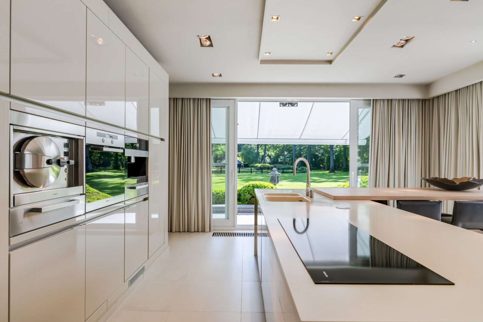 Unique country house renovated in high-quality loft style amidst an exceptional park garden of more than 2 hectares with centuries-old trees, ponds, and meadows, all just a stone's throw from Turnhout. Large living spaces, master bedroom with dressing room and large bathroom, fitness room, and an indoor apartment on the first floor. A beautiful opportunity! This property is ideal for horse lovers!Ground floor: Through a small entrance hall at the front of the house, you immediately enter the large living spaces. Here we find a dining area and sitting area, separated by a see-through fireplace. Both spaces are bathed in light due to the south orientation and large windows that provide access to the terraces that surround the entire house. Next, we come to the living kitchen, fully equipped with Siematic with a corian worktop and Miele appliances: induction hobs, steamer, oven, warming drawer, refrigerator, dishwasher, built-in coffee maker, and quooker. The kitchen also provides access to 2 terraces, each with electric sun awnings. All these spaces are equipped with stylish natural stone flooring. On the north side of the house is the master suite. This is divided into a spacious dressing room, bedroom with a view of the beautiful garden, and a luxurious bathroom with a rain shower, waterfall, infrared heater, and freestanding bathtub. This master suite is characterized by a high level of finishing with lots of indirect lighting, air conditioning, and large windows. On the west side, at a slightly lower level, there is a beautiful fitness room and a laundry room. This first can also be used as a multipurpose room for, for example, an extra bedroom or office. First floor: On the first floor, there is a particularly spacious apartment with a sitting area, kitchenette, sleeping area, and bathroom. This apartment is also completely designed in loft style with an open layout. Particularities: - Year of construction 1958, renovation 2010 - Particularly high-quality finish and as good as new! - Carport for 3 cars - Detached greenhouse for people with green fingers & aviary - Several beautiful seating areas in the garden - Stable building and 2 separate meadows - Oil-fired heating, underfloor heating on the ground floor, radiators above This property is a real opportunity for a family who wants to live modernly amidst nature. Such a mature park garden is a true rarity!