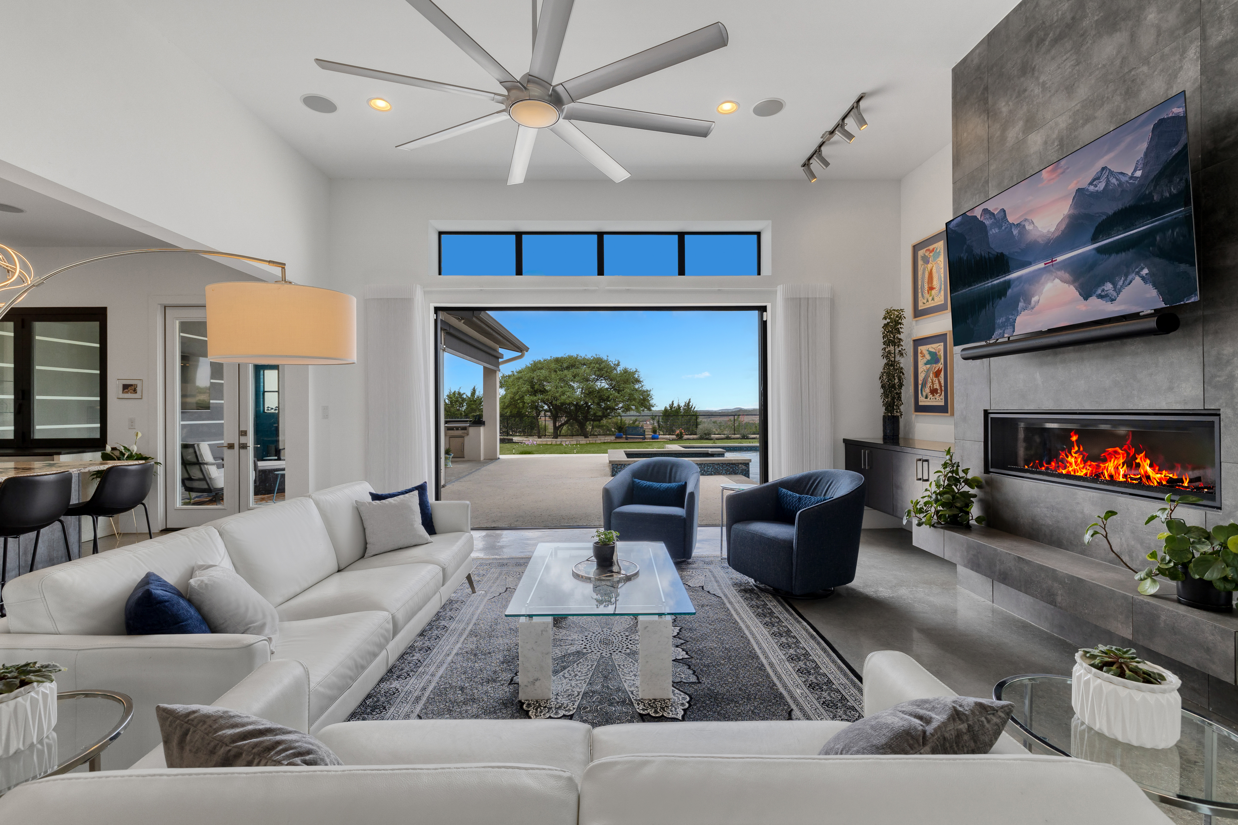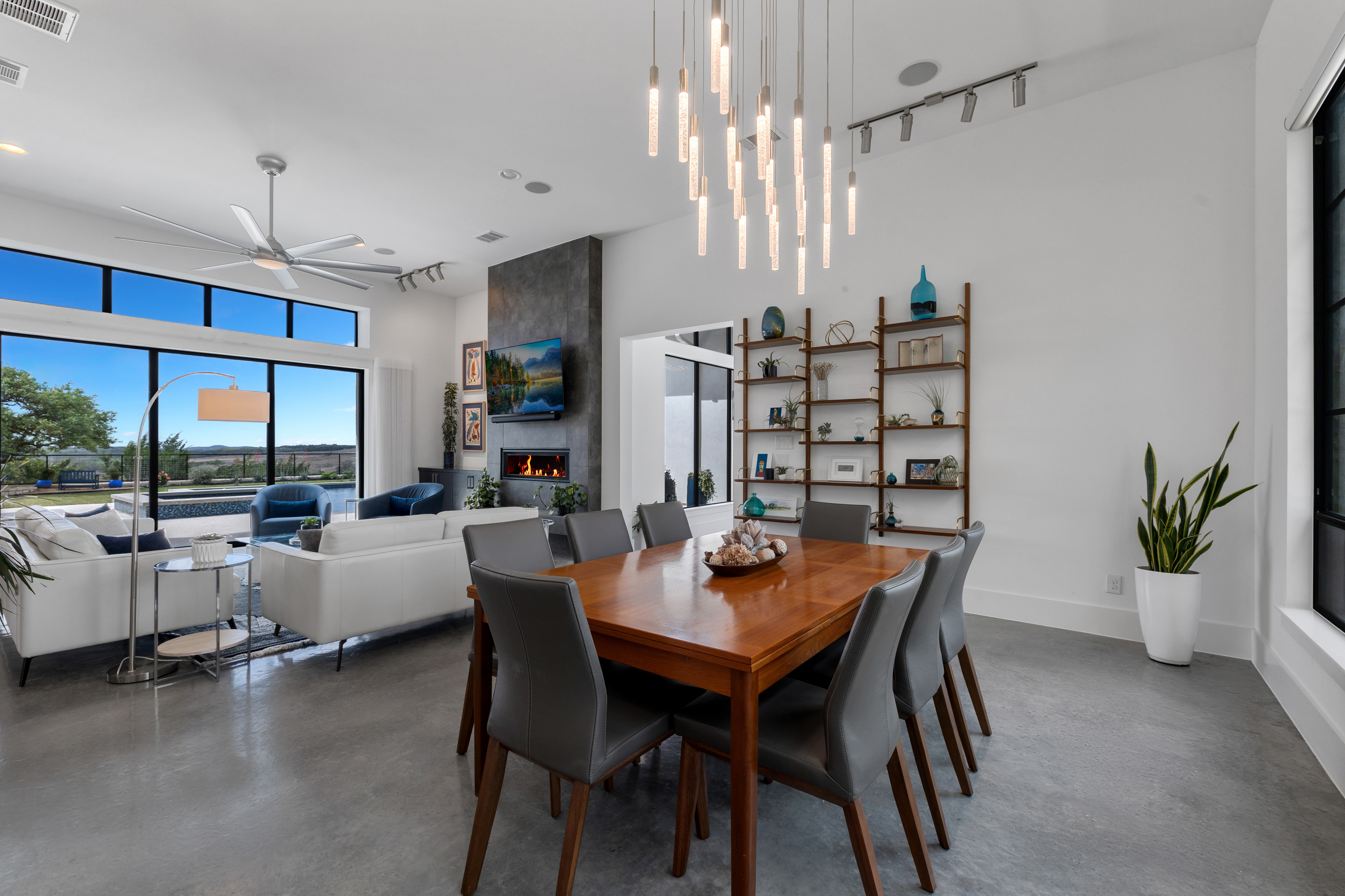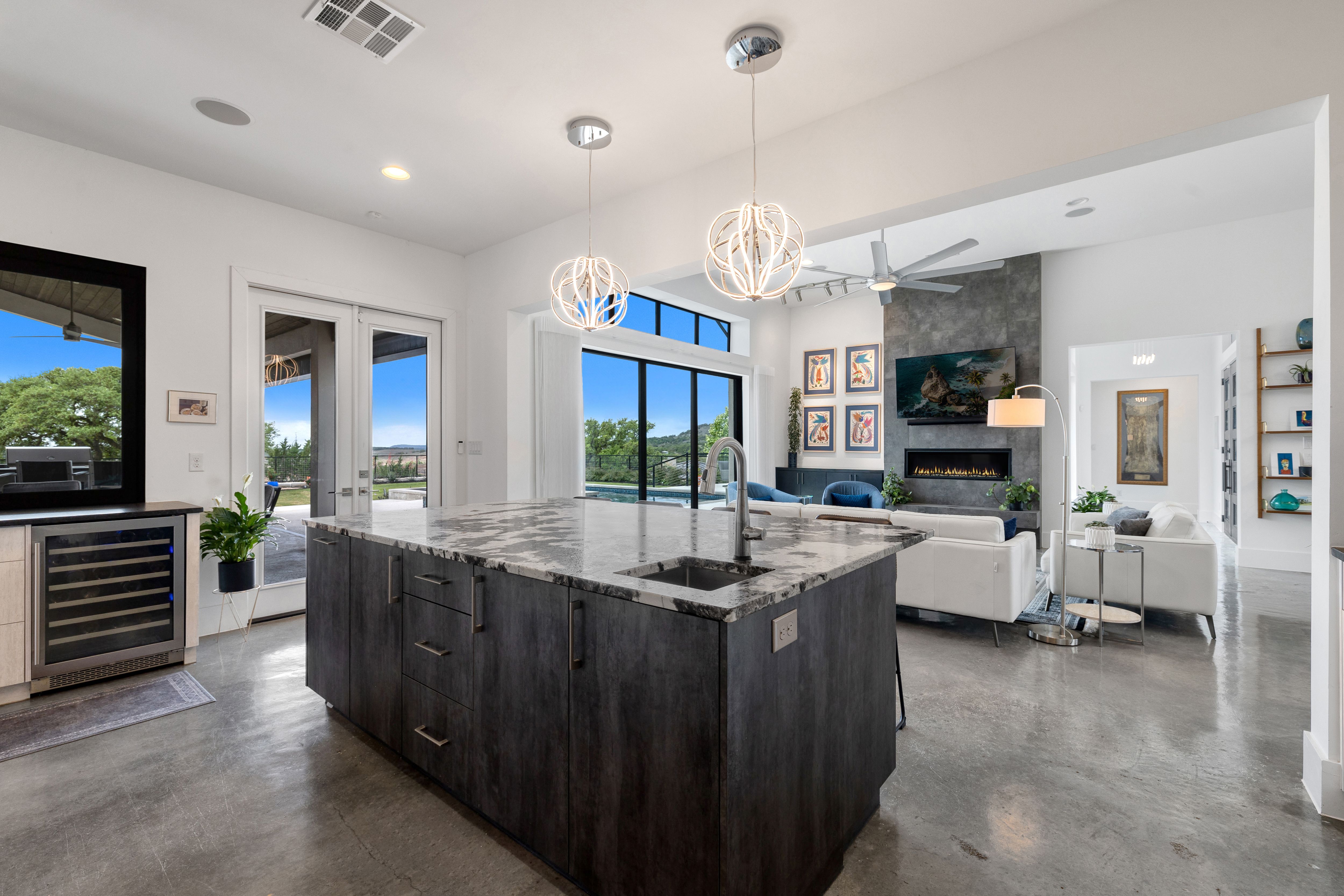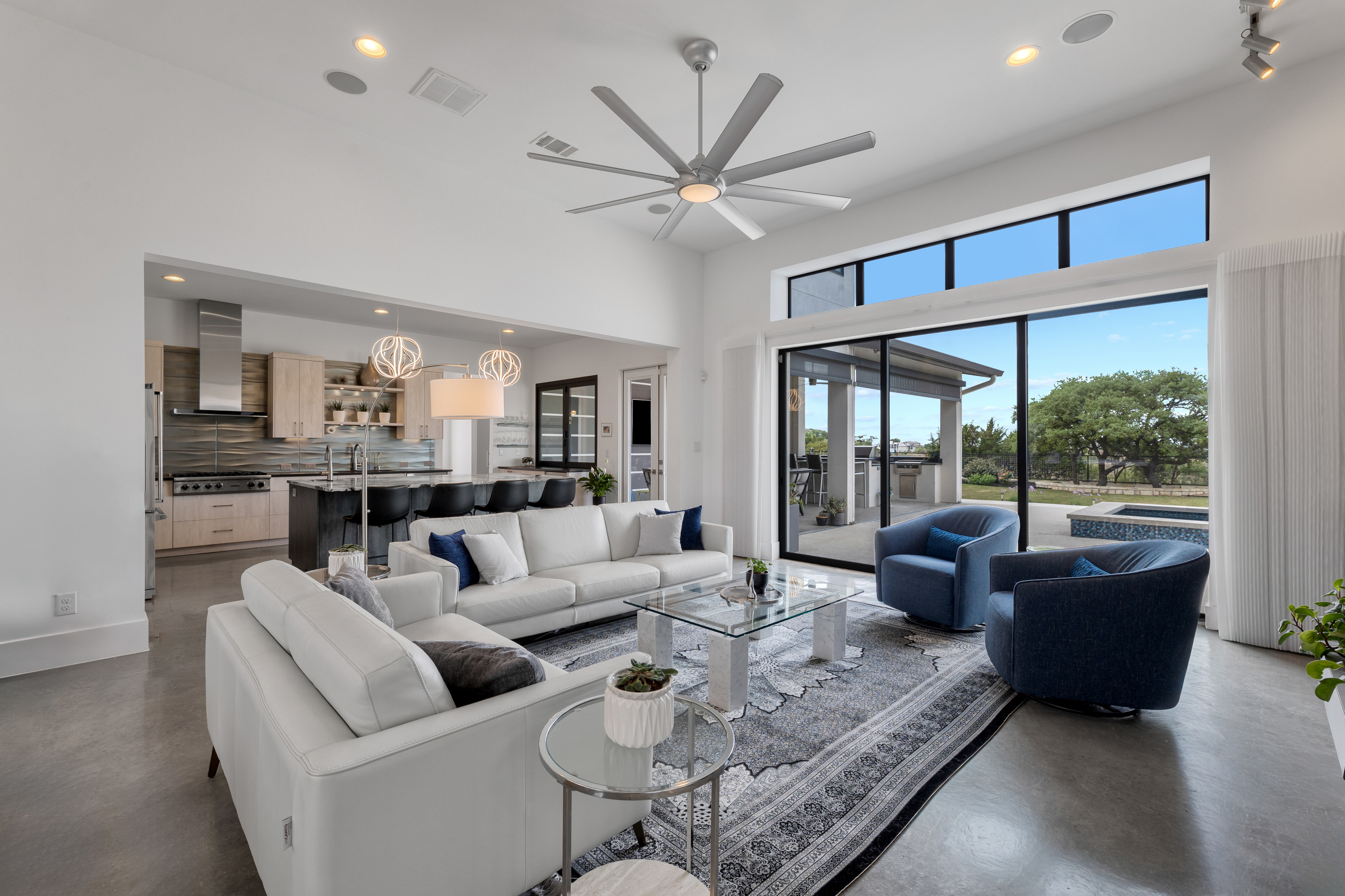 Set within Canyons at Scenic Loop, this custom residence brings together clean contemporary design, strong natural light, and a layout that feels both refined and highly functional. The main living areas are open yet comfortably scaled, with stained concrete floors, varied ceiling treatments, and expansive windows that bring consistent light across the interior. At the center of the home, the kitchen is designed to support both daily living and entertaining, offering European acrylic cabinetry, stainless steel appliances, gas cooking, double ovens plus a separate warming oven, a large island, under counter wine refrigeration, and a pass through bifold serving window that connects directly to the covered patio for seamless indoor outdoor flow. The primary suite is privately positioned on the main level and includes a spacious bath with a freestanding tub and walk in shower, while a separate guest suite on the first floor offers comfort and privacy for visitors. Upstairs, two additional bedroom suites are arranged around a central sitting area, creating a private upper level that feels well separated from the home’s main entertaining spaces. The outdoor setting is equally considered, with a covered patio, automatic screens, outdoor kitchen, fireplace, pool bath, outdoor shower, extensive decking, and a pool and spa framed by mature landscaping. A split three car garage adds further versatility, with a separate one car bay currently outfitted as an exercise room with wall unit climate control.