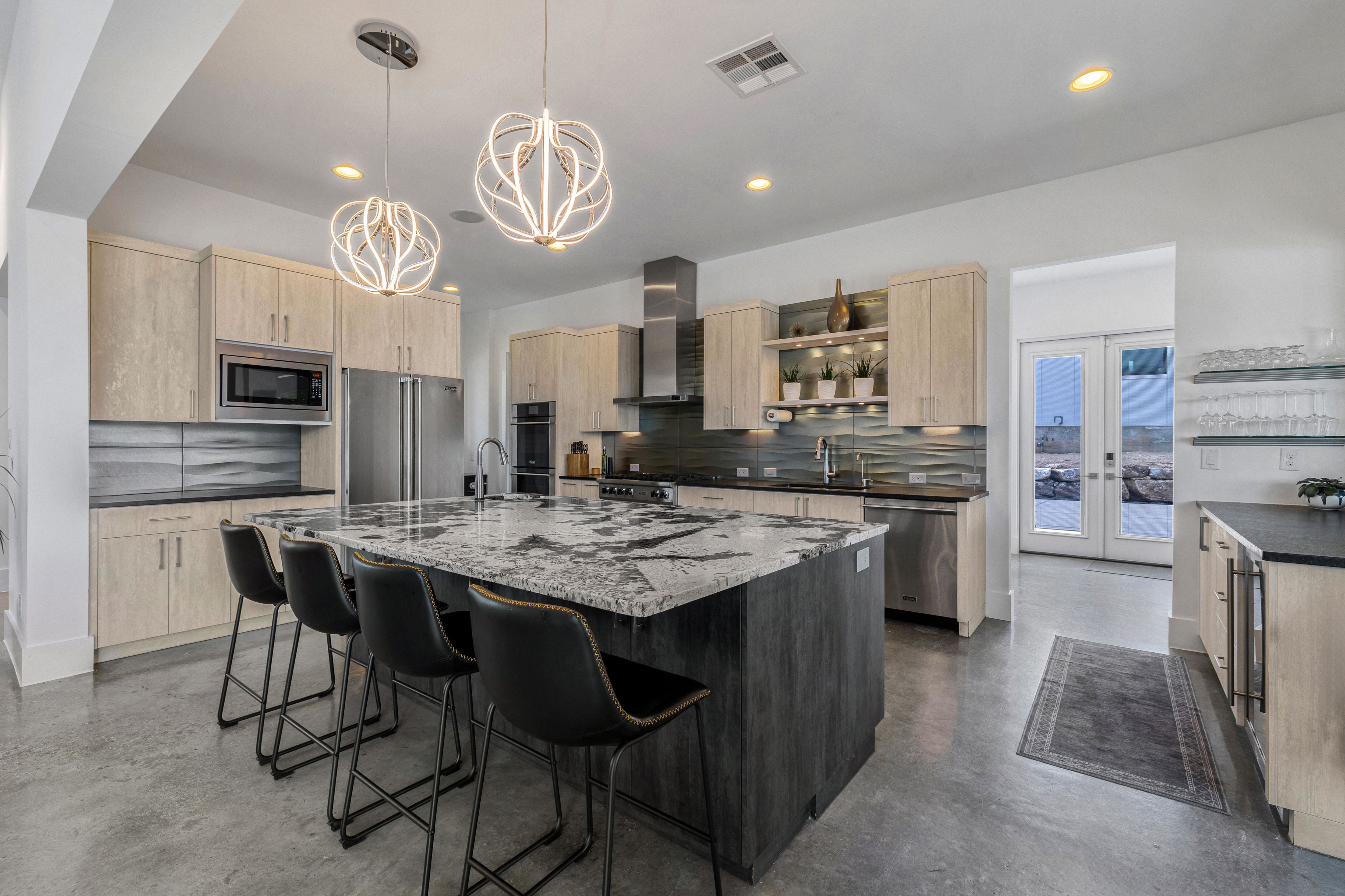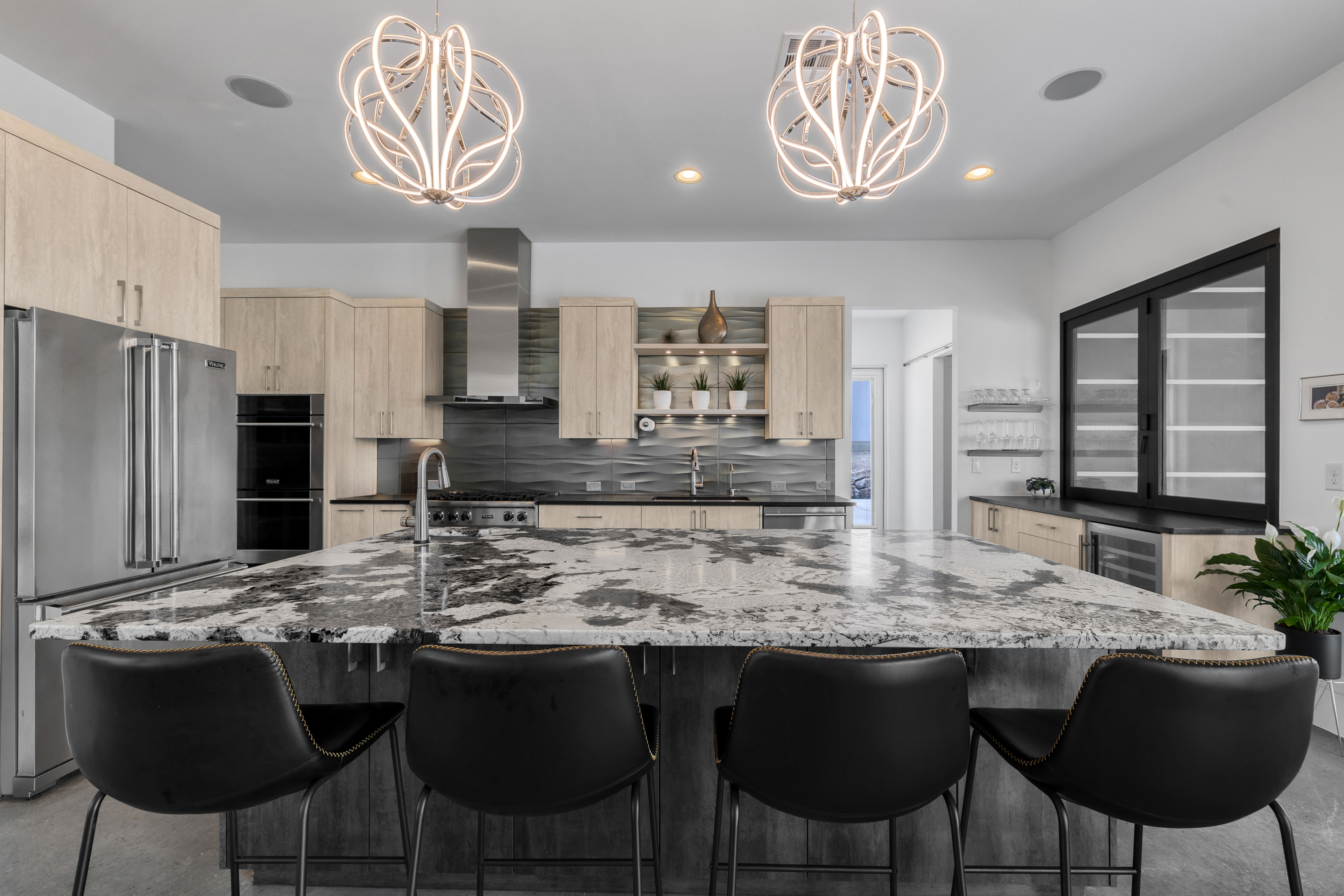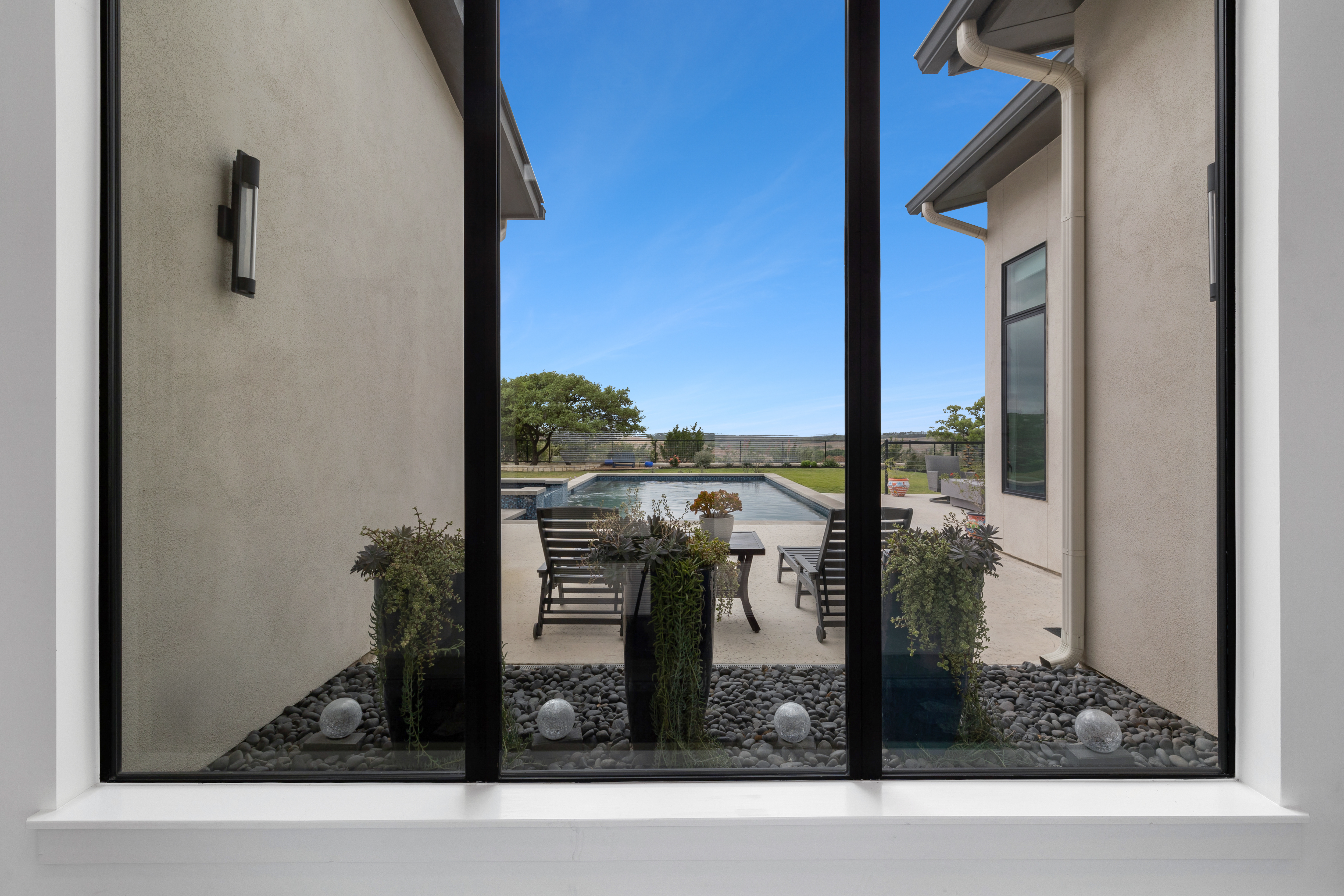 Set within Canyons at Scenic Loop, this custom residence brings together clean contemporary design, strong natural light, and a layout that feels both refined and highly functional. The main living areas are open yet comfortably scaled, with stained concrete floors, varied ceiling treatments, and expansive windows that bring consistent light across the interior. At the center of the home, the kitchen is designed to support both daily living and entertaining, offering European acrylic cabinetry, stainless steel appliances, gas cooking, double ovens plus a separate warming oven, a large island, under counter wine refrigeration, and a pass through bifold serving window that connects directly to the covered patio for seamless indoor outdoor flow. The primary suite is privately positioned on the main level and includes a spacious bath with a freestanding tub and walk in shower, while a separate guest suite on the first floor offers comfort and privacy for visitors. Upstairs, two additional bedroom suites are arranged around a central sitting area, creating a private upper level that feels well separated from the home’s main entertaining spaces. The outdoor setting is equally considered, with a covered patio, automatic screens, outdoor kitchen, fireplace, pool bath, outdoor shower, extensive decking, and a pool and spa framed by mature landscaping. A split three car garage adds further versatility, with a separate one car bay currently outfitted as an exercise room with wall unit climate control.