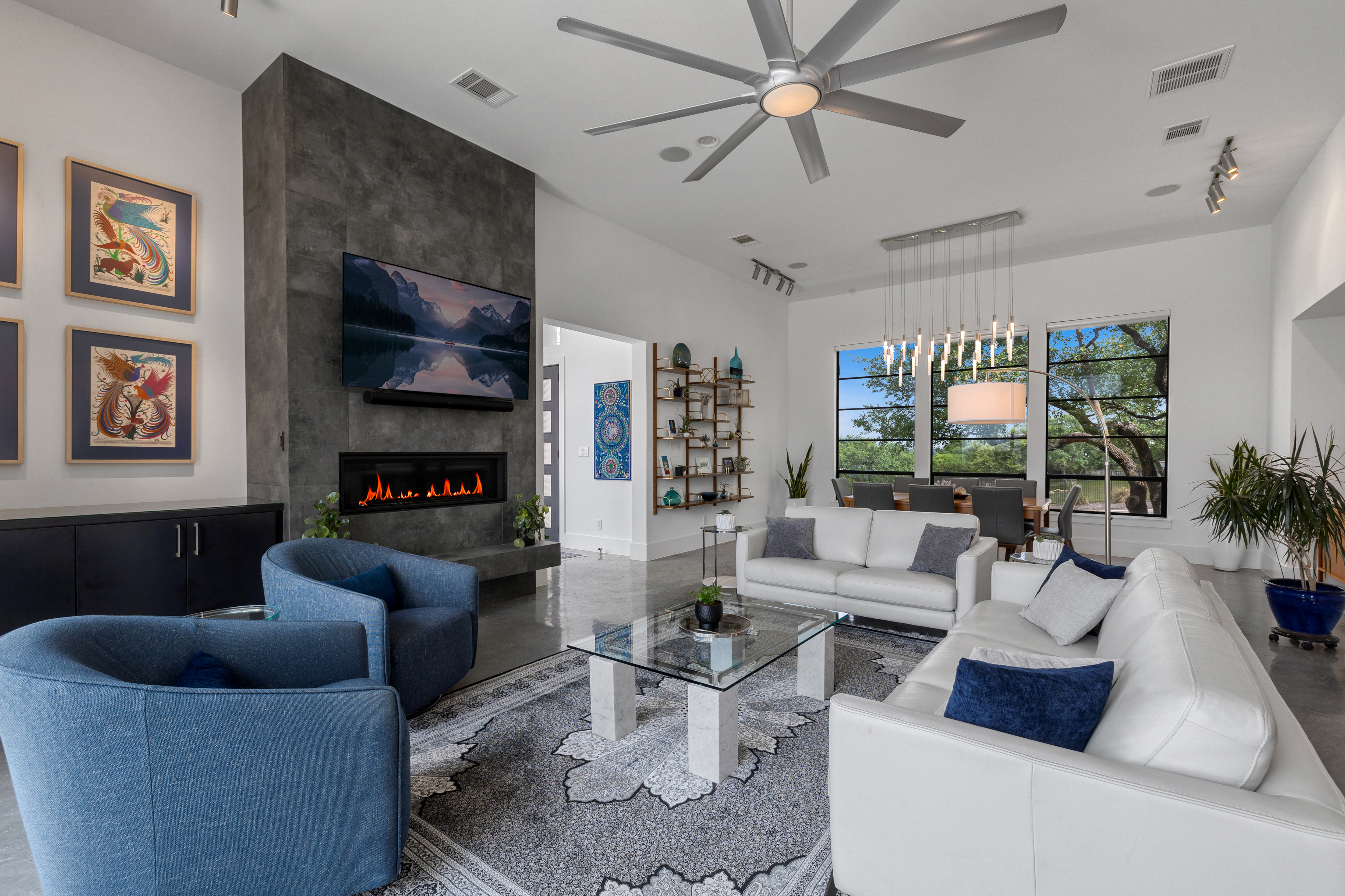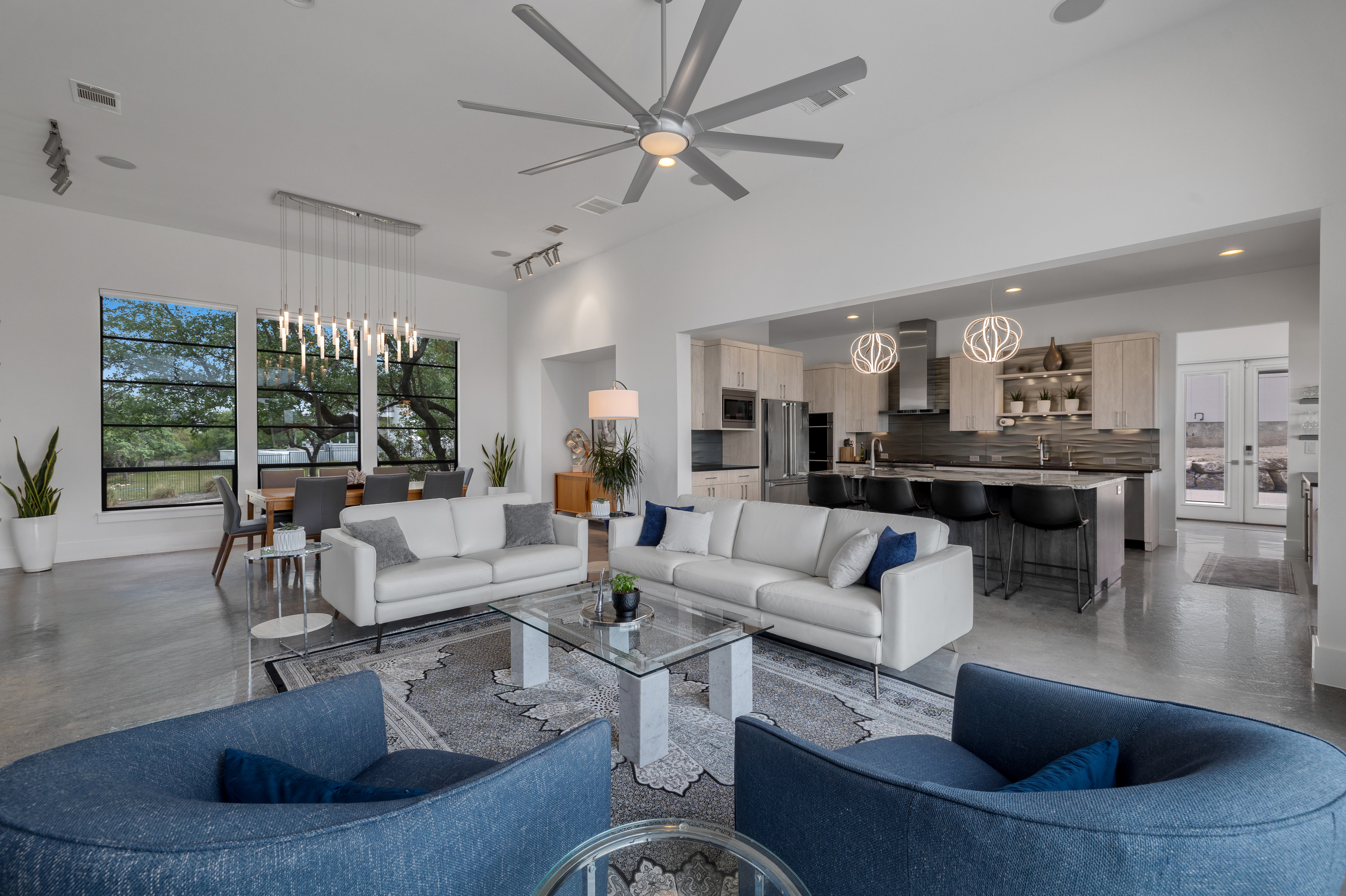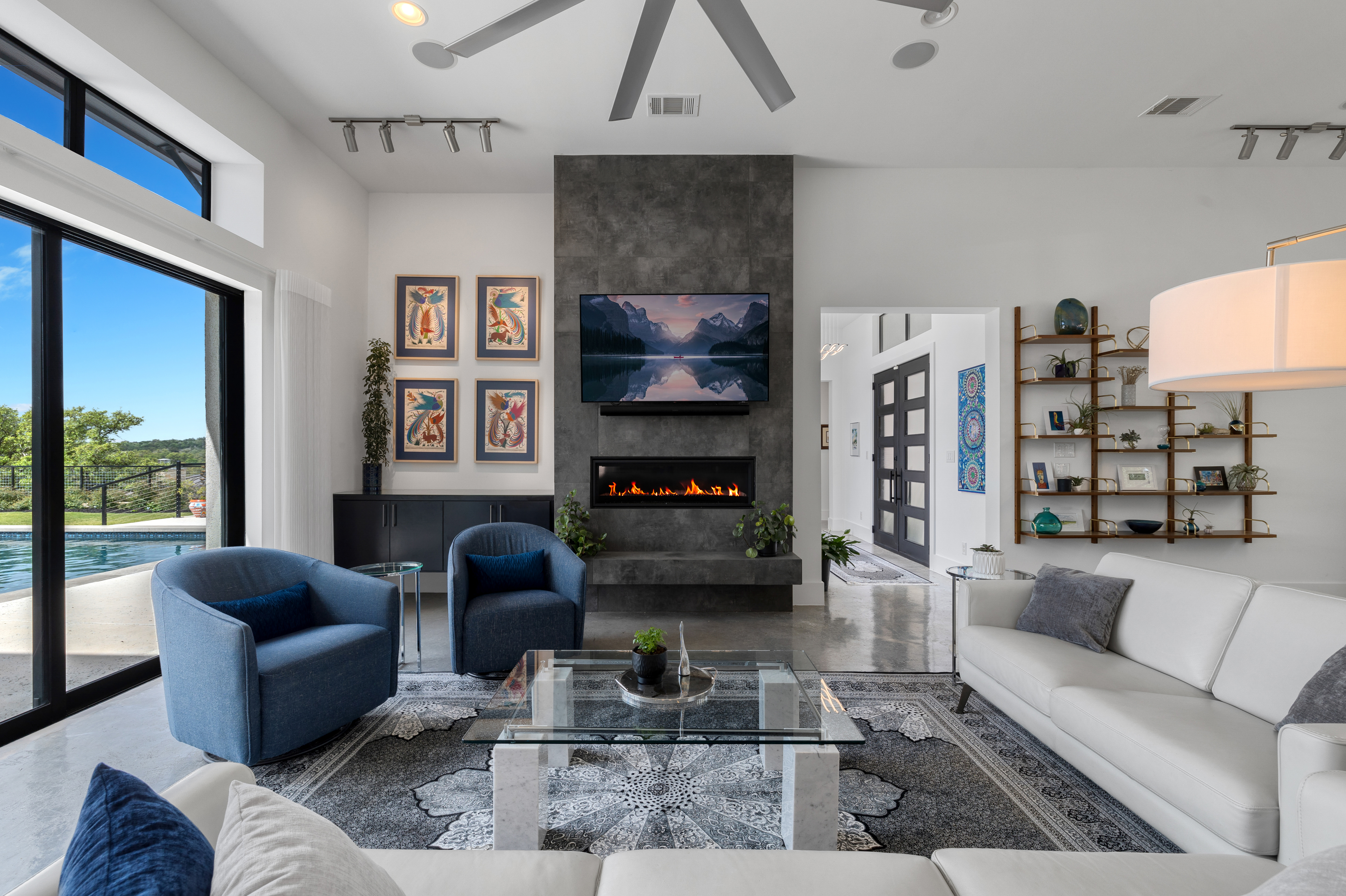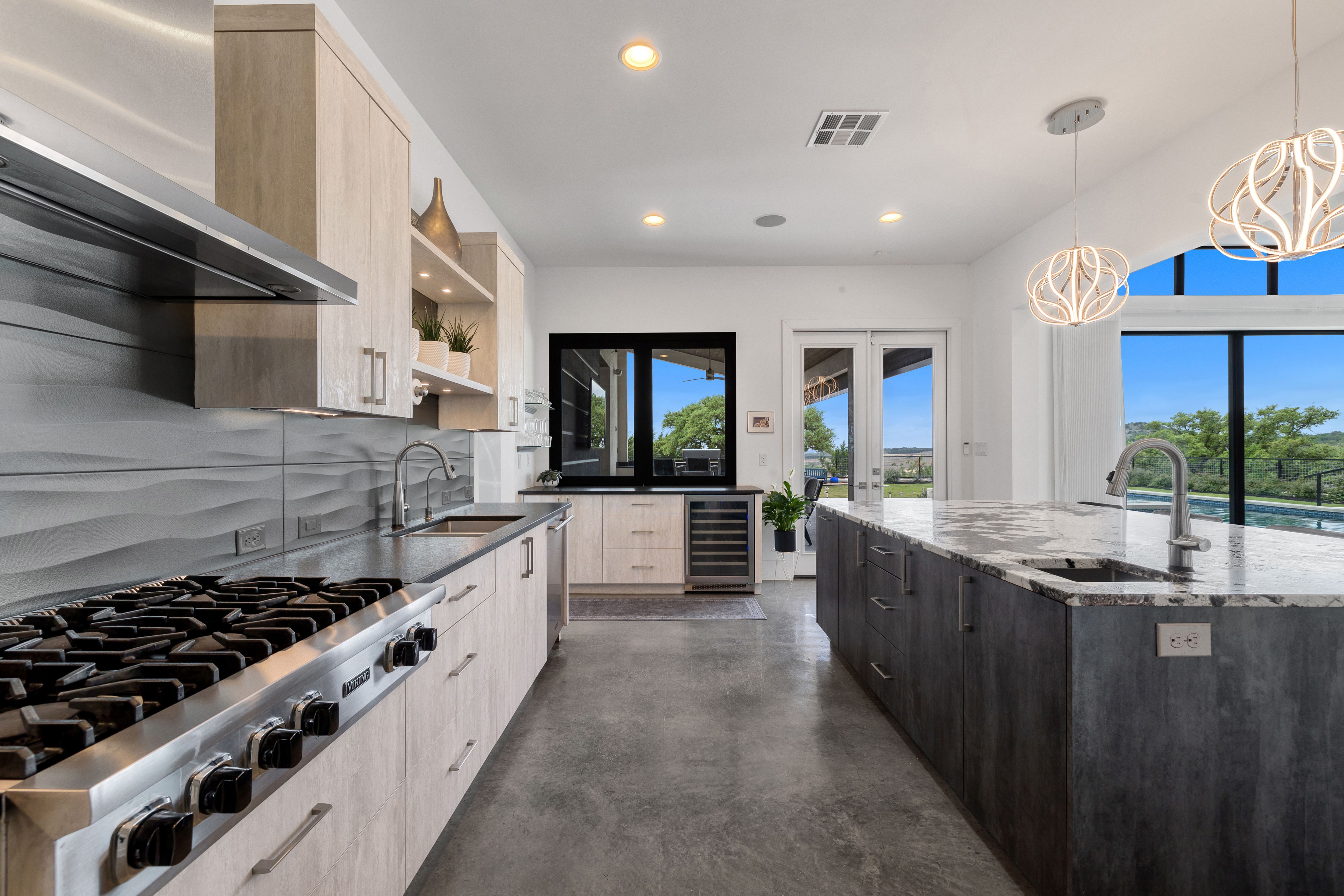 Set within Canyons at Scenic Loop, this custom residence brings together clean contemporary design, strong natural light, and a layout that feels both refined and highly functional. The main living areas are open yet comfortably scaled, with stained concrete floors, varied ceiling treatments, and expansive windows that bring consistent light across the interior. At the center of the home, the kitchen is designed to support both daily living and entertaining, offering European acrylic cabinetry, stainless steel appliances, gas cooking, double ovens plus a separate warming oven, a large island, under counter wine refrigeration, and a pass through bifold serving window that connects directly to the covered patio for seamless indoor outdoor flow. The primary suite is privately positioned on the main level and includes a spacious bath with a freestanding tub and walk in shower, while a separate guest suite on the first floor offers comfort and privacy for visitors. Upstairs, two additional bedroom suites are arranged around a central sitting area, creating a private upper level that feels well separated from the home’s main entertaining spaces. The outdoor setting is equally considered, with a covered patio, automatic screens, outdoor kitchen, fireplace, pool bath, outdoor shower, extensive decking, and a pool and spa framed by mature landscaping. A split three car garage adds further versatility, with a separate one car bay currently outfitted as an exercise room with wall unit climate control.