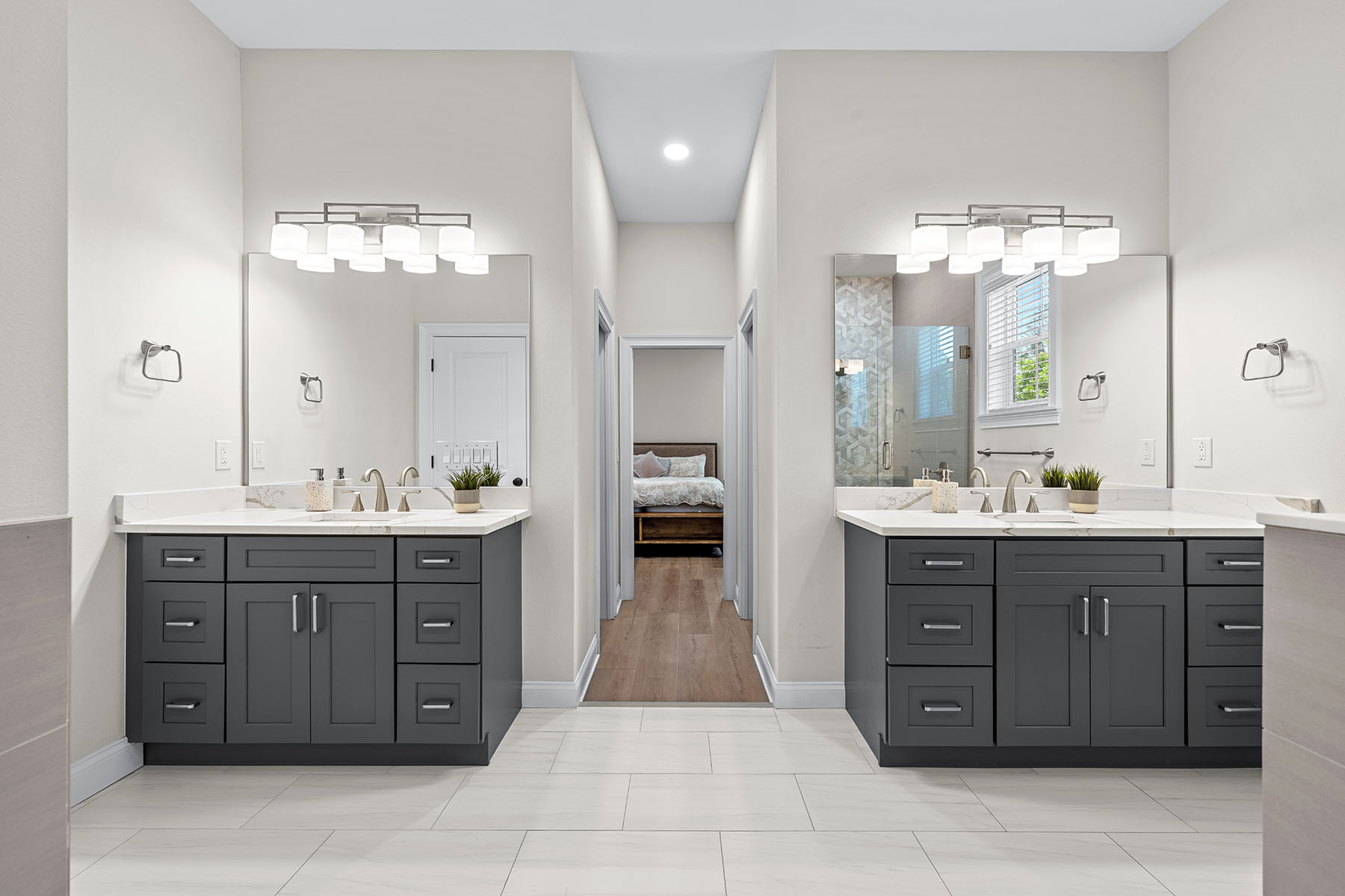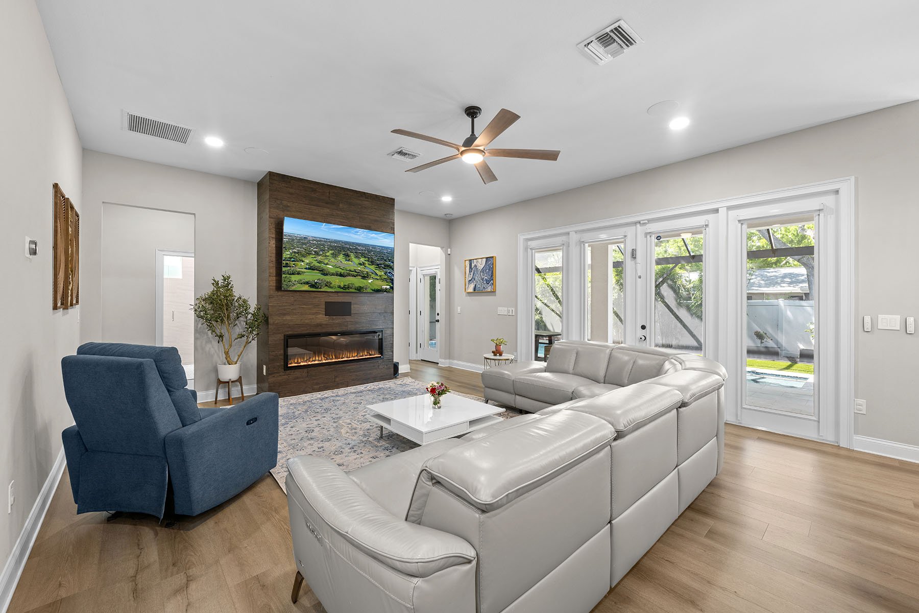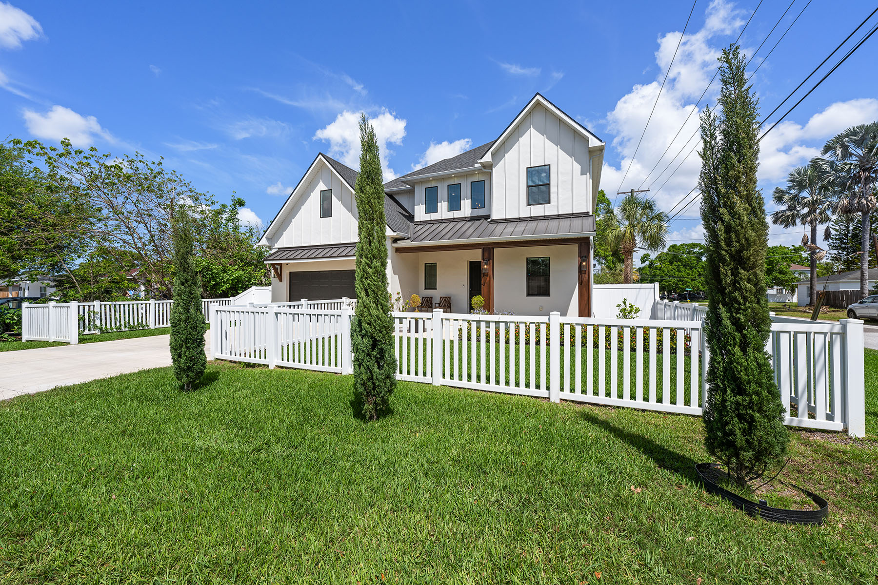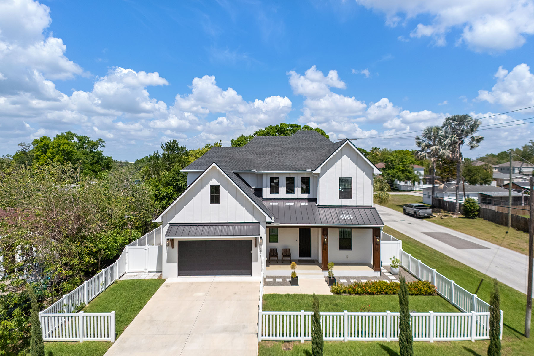 Curb appeal abounds with a classic white picket fence and a welcoming covered front porch accented by a subtle wood ceiling. Go through the 8-foot exterior doors into a breathtaking entryway with a soaring 22-foot foyer ceiling, setting the stage for the airy 10-foot ceilings and sleek luxury vinyl flooring that flow seamlessly throughout the five-bedroom layout. The meticulously designed interior is elevated by wood-framed doors, impact windows and striking metal railings for the stairs. The chef's kitchen dazzles with gleaming quartz countertops, which are consistent throughout the home, a stunning art deco tile backsplash, and a high-end induction cooktop. Retreat to the luxurious primary suite, complete with thoughtfully built out dual closets and an en-suite bath with a frameless glass walk-in shower, split dual vanities and a separate deep soaking bathtub. The transition to outdoor living is effortless, enhanced by motorized shades on all rear-facing windows and doors. Outside, your private oasis awaits and gives way to a fully equipped outdoor kitchen boasting a grill, dual burners, a beverage refrigerator and a motorized retractable awning for ultimate climate control. The centerpiece of the backyard is a resort-style heated saltwater pool, complete with a tanning ledge and six-person spa, all enclosed in a tasteful cage with a turf area. Effortless living is guaranteed with a smart system controlling the pool and lighting, alongside added peace of mind of a pre-installed 50-amp generator hookup. Live the South Tampa lifestyle with quick access to the Selmon Expressway, St. Pete and Tampa International Airport, while only being a short distance from the iconic Bayshore Boulevard and downtown Tampa.