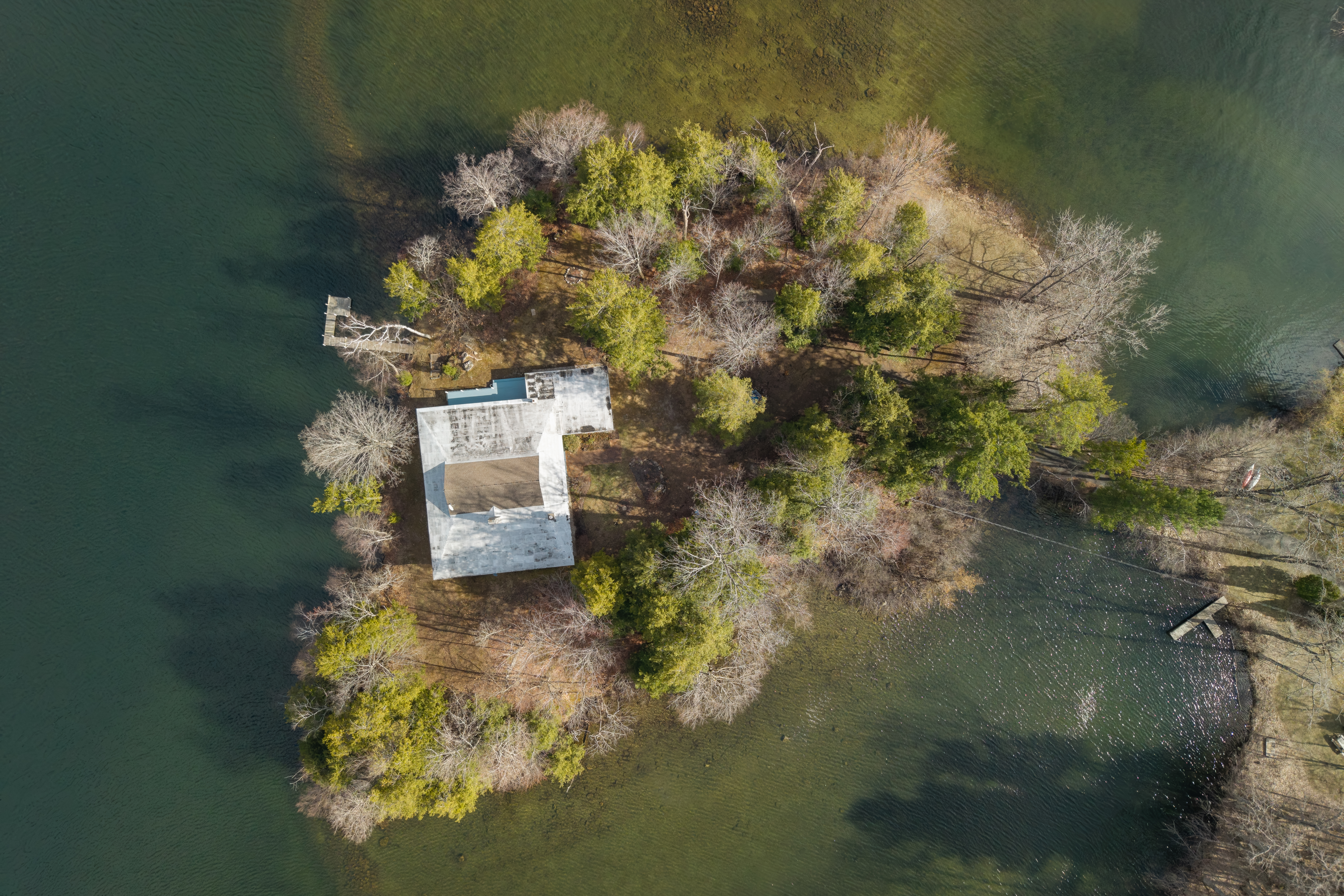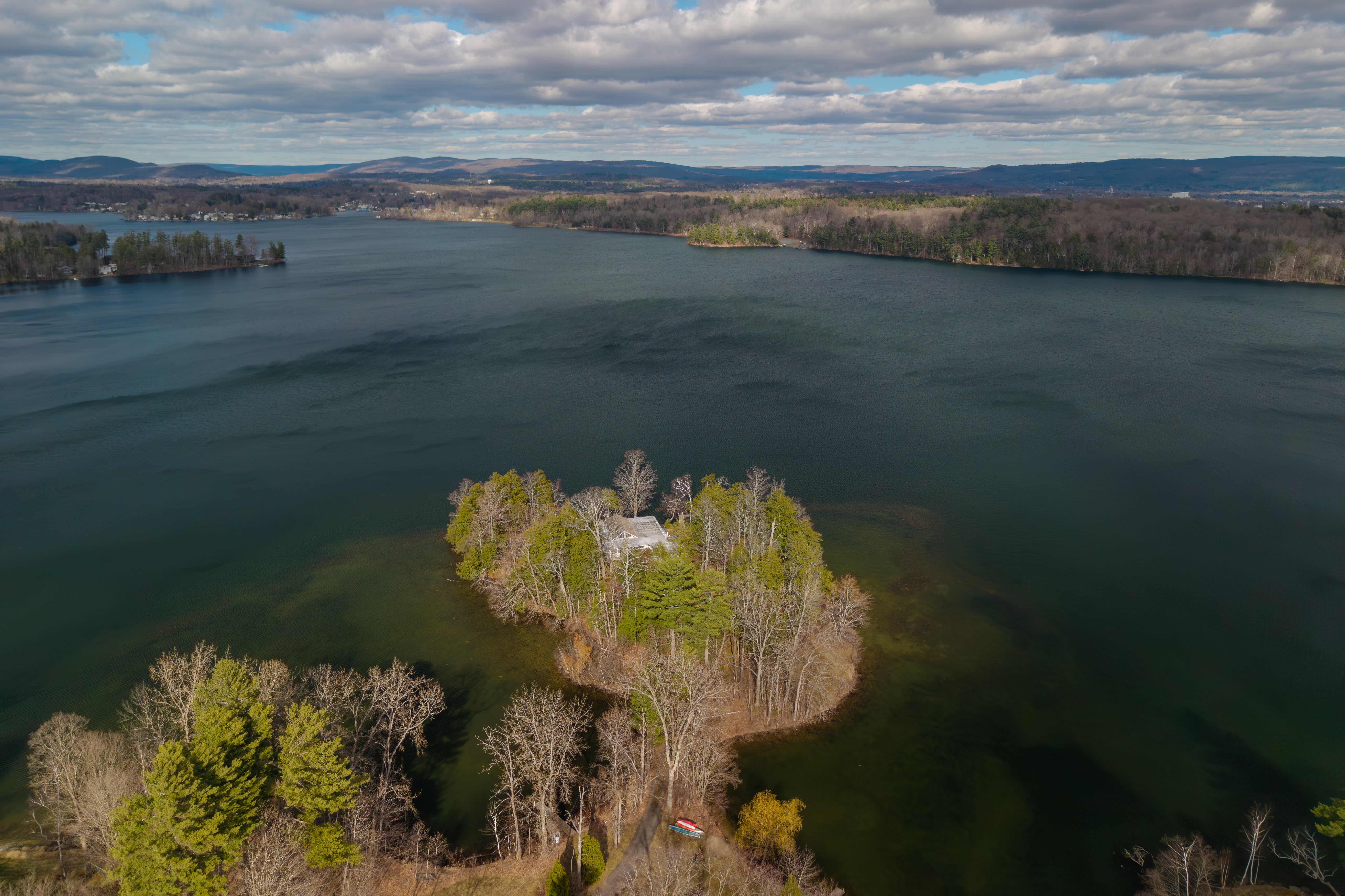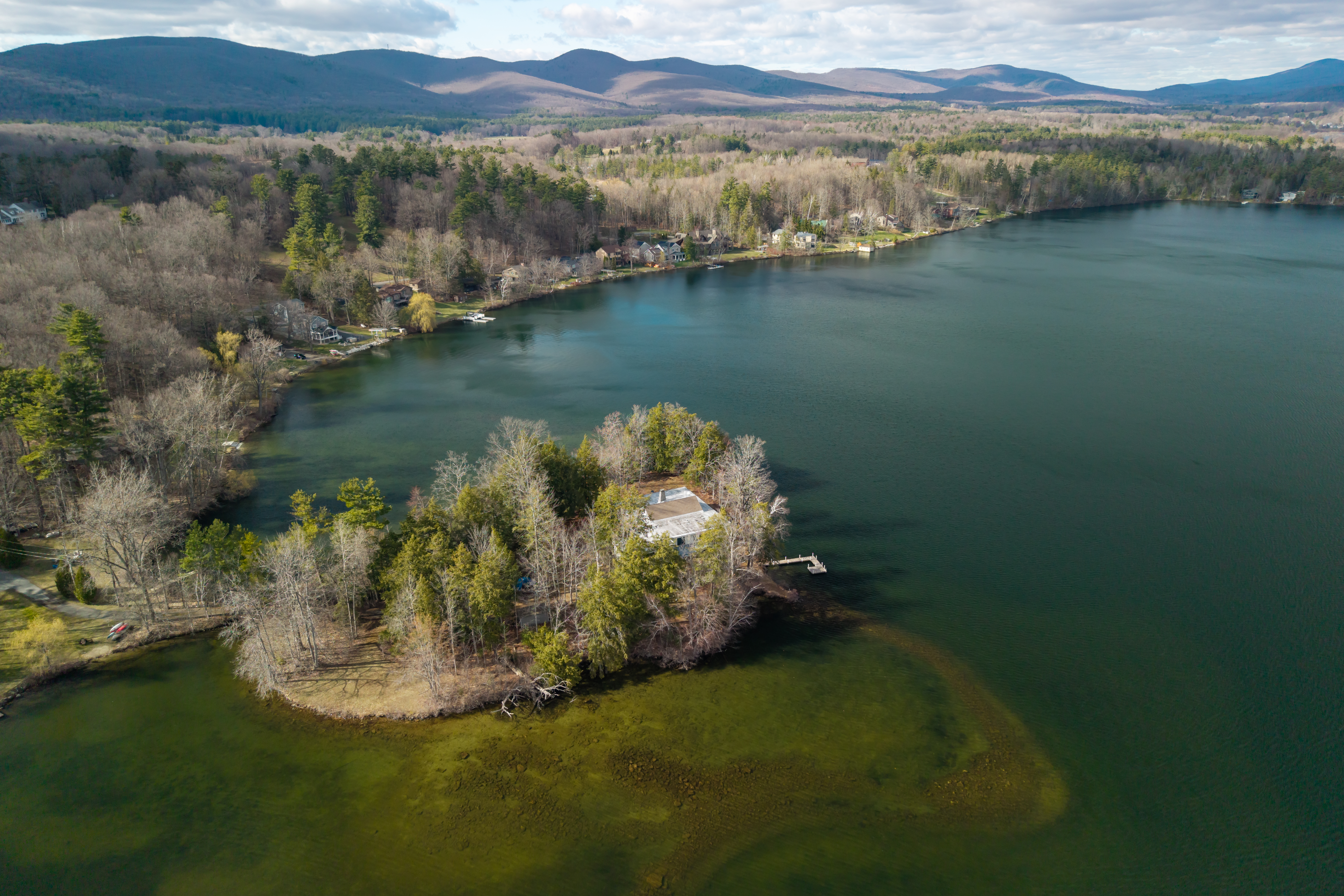 Set just off the shoreline of Onota Lake and accessed by a private bridge, this approximately 1.25-acre island offers a kind of ownership that is seldom available in the Berkshires. Surrounded by water, the property creates a natural sense of separation and calm, with broad lake views and a level of privacy that is difficult to replicate without sacrificing accessibility. Here, the experience is distinctly your own, yet the mainland is always within easy reach. The existing residence is positioned to take full advantage of the setting. A vaulted living space with a loft above, two fireplaces, and expansive windows and sliders bring in light and water views throughout the day. A covered porch extends directly toward the lake, offering a simple, immediate connection to the outdoors.