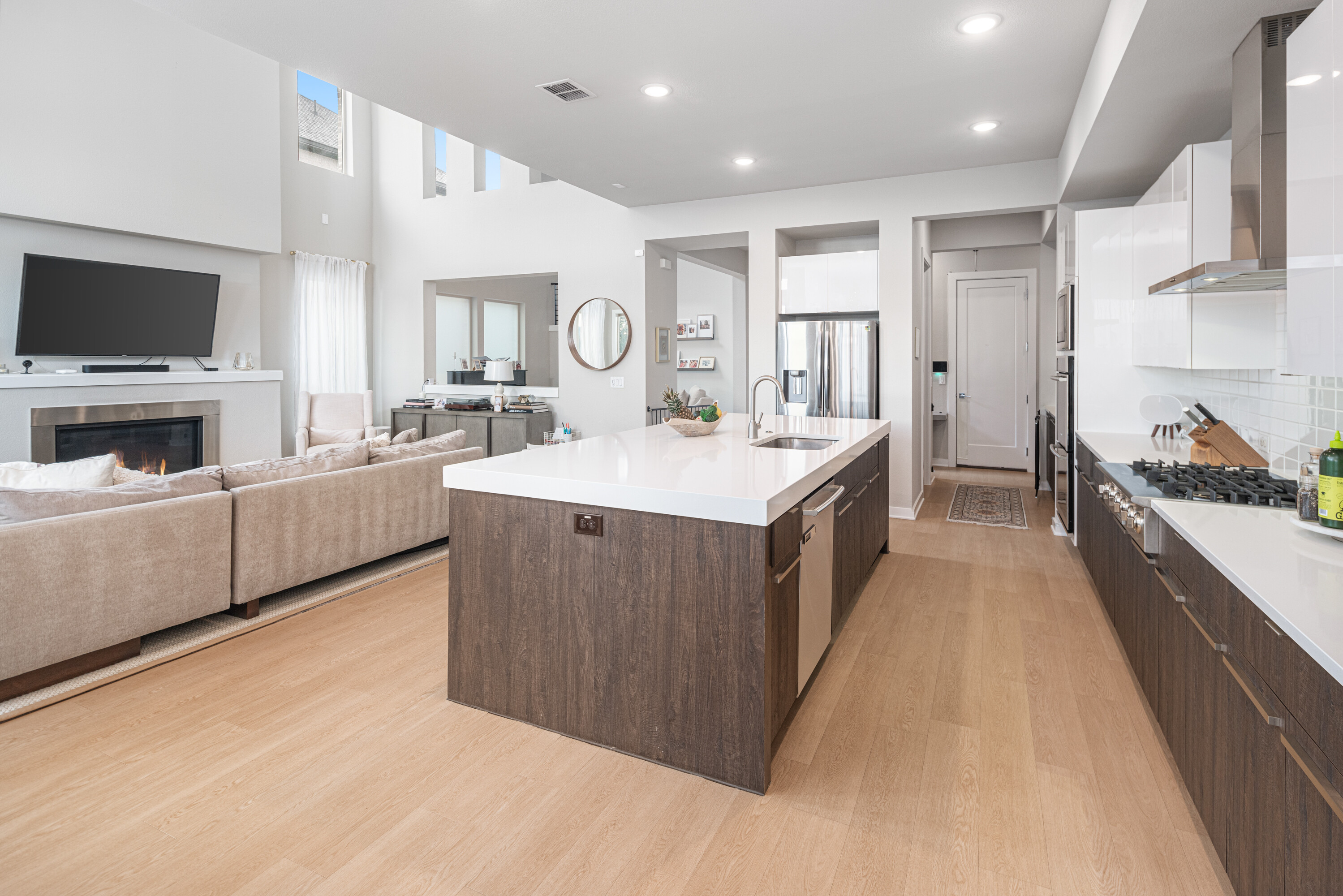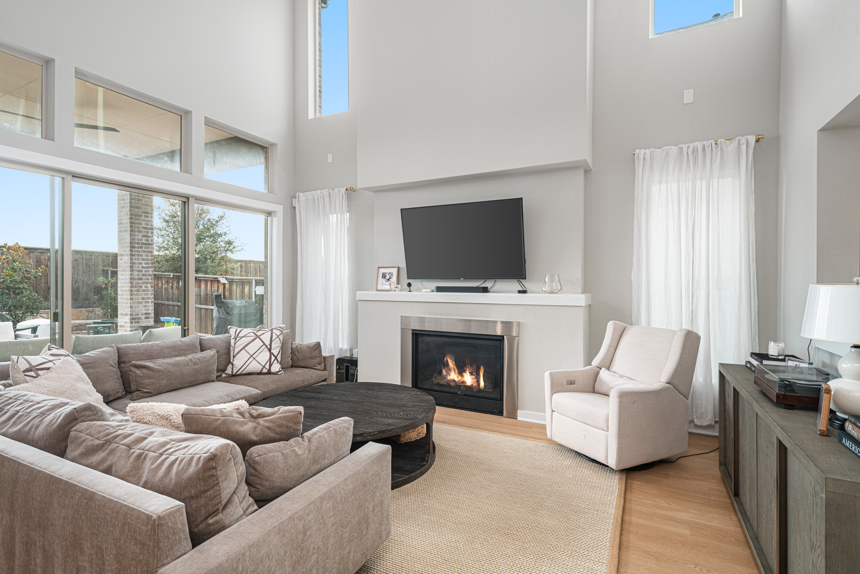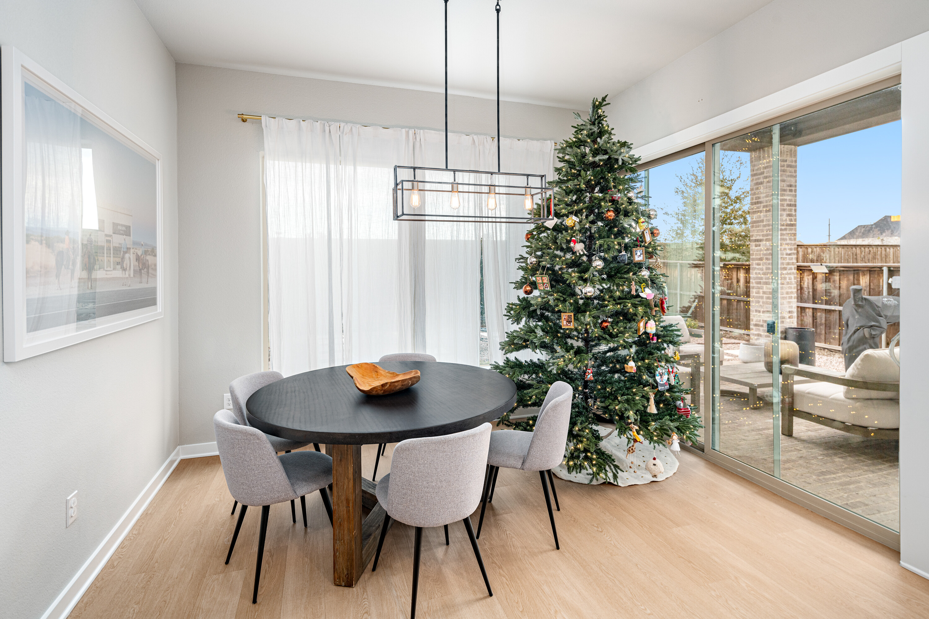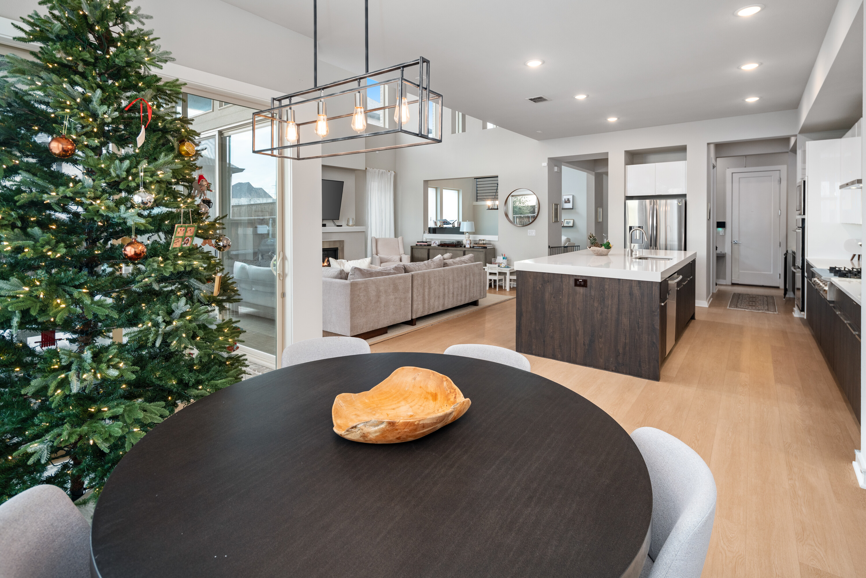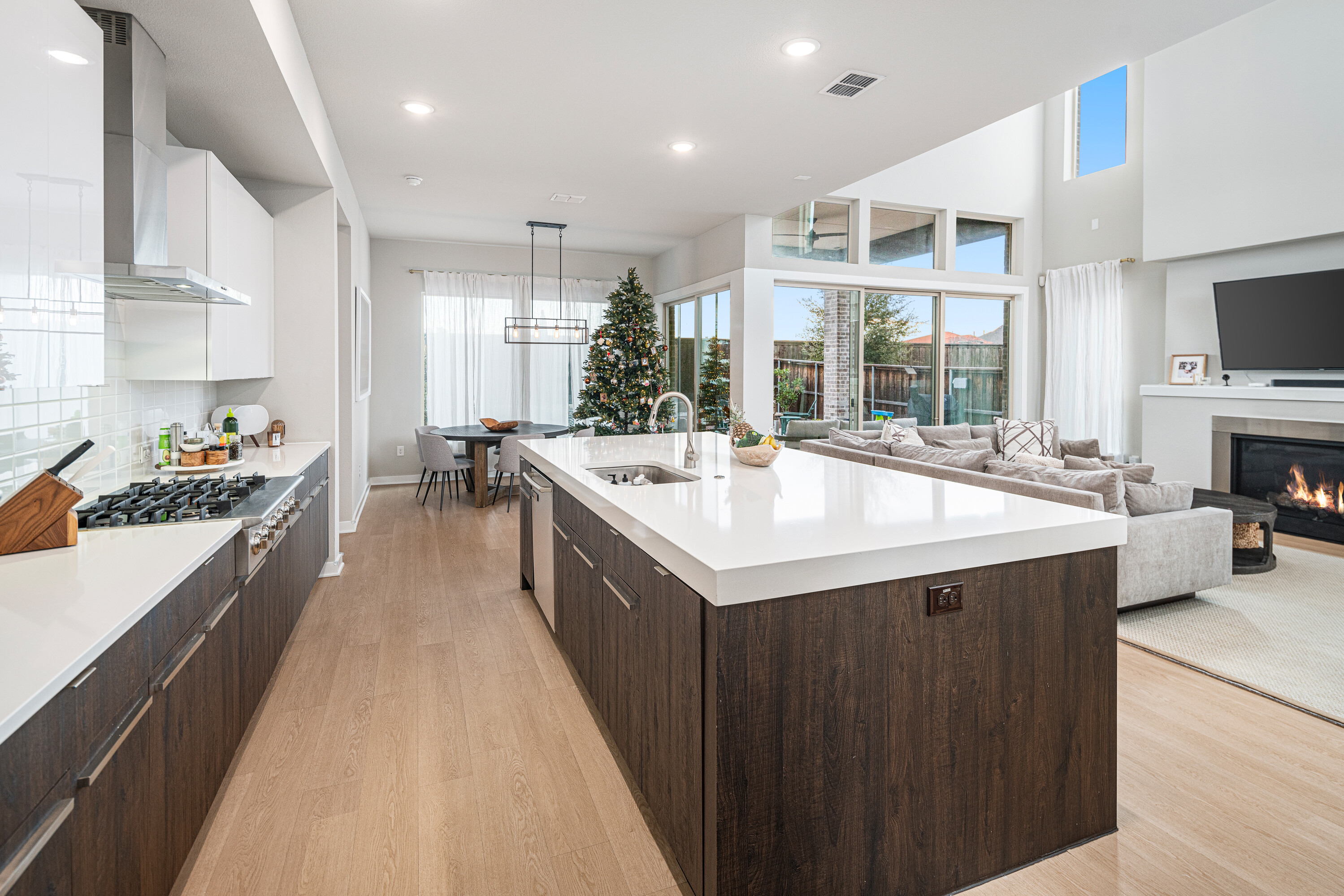 Experience modern luxury in this stunning Mainvue home in West Frisco. Designed with high ceilings and abundant windows, natural light floods every corner of the open floor plan. The sleek kitchen includes a large island, gas stove, and an eat-in dining area, ideal for casual meals. A separate dining room adds elegance for formal gatherings. The living room, with its cozy fireplace, flows seamlessly into the kitchen and dining spaces. Two sliding glass doors open to an extended patio, perfect for indoor-outdoor living. The downstairs guest bedroom offers an easily-accessible bathroom and would make a great office space, while the primary suite boasts a spacious, beautifully designed bathroom. Upstairs, two additional bedrooms with Jack & Jill ensuites, a game room with a powder bath, and a media room provide ample space for entertaining. With its contemporary design and exceptional layout, this home is perfect for modern living. Close to The Star, Legacy West, Grandscape and easy access to major highways.