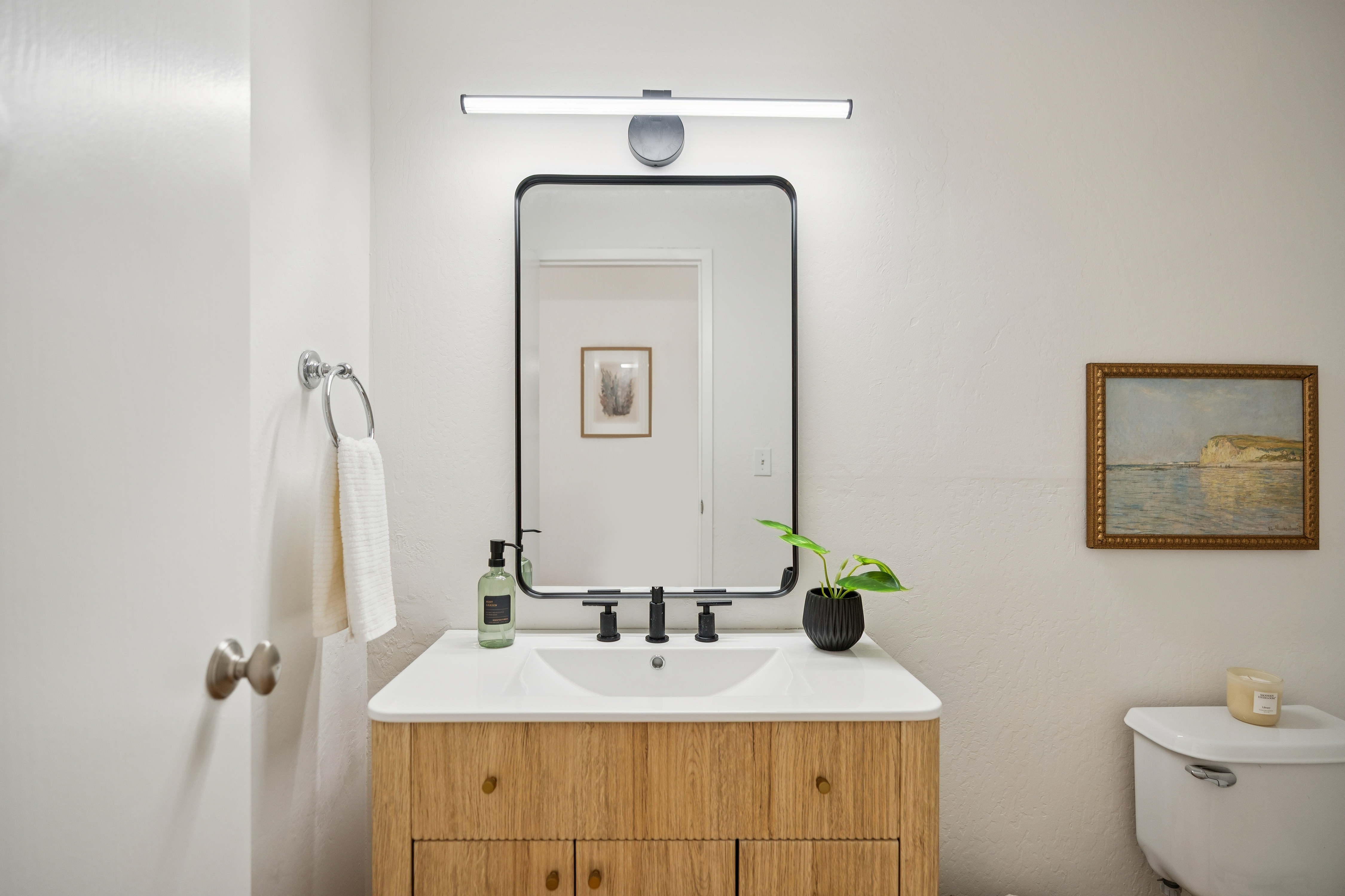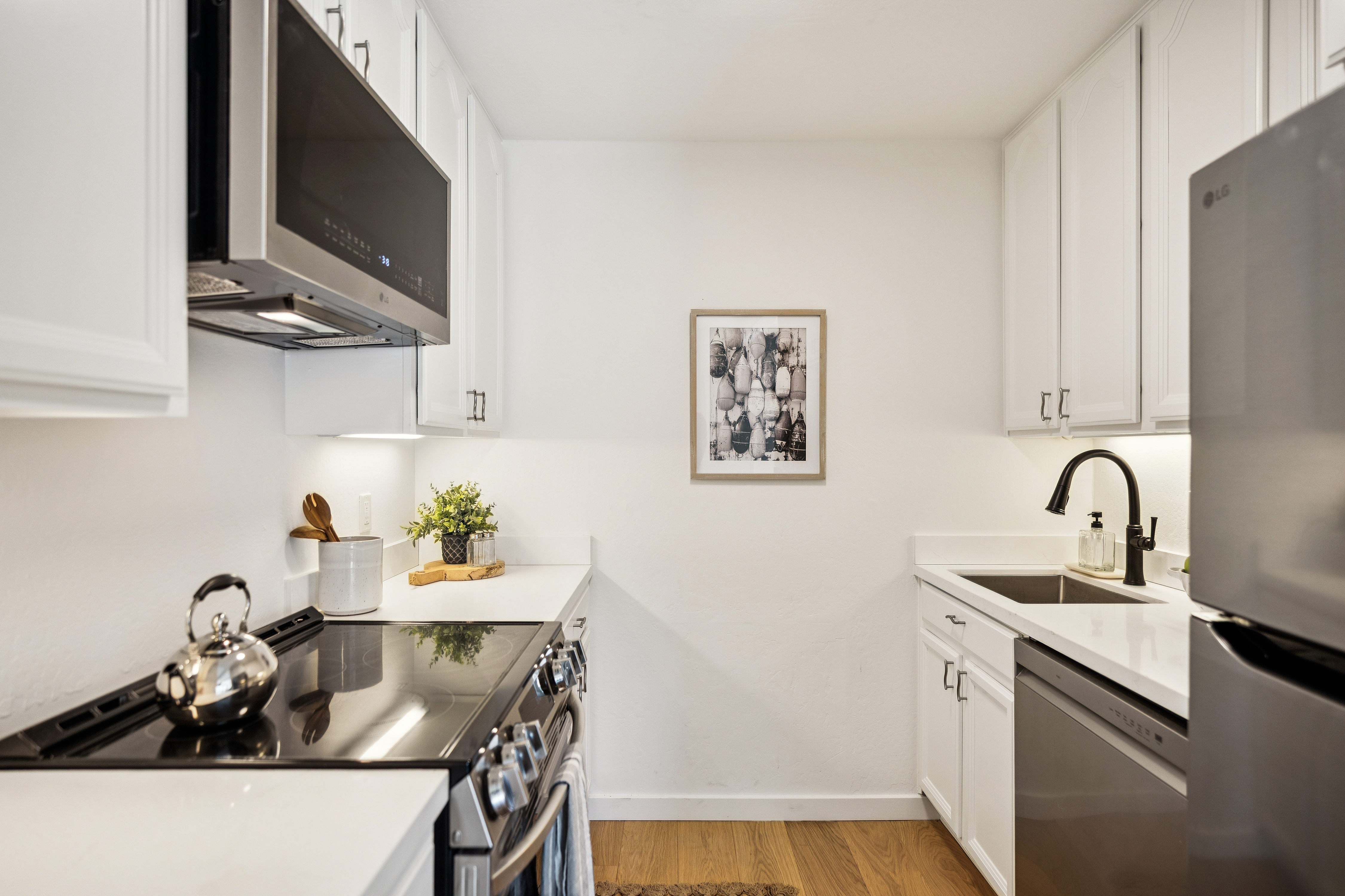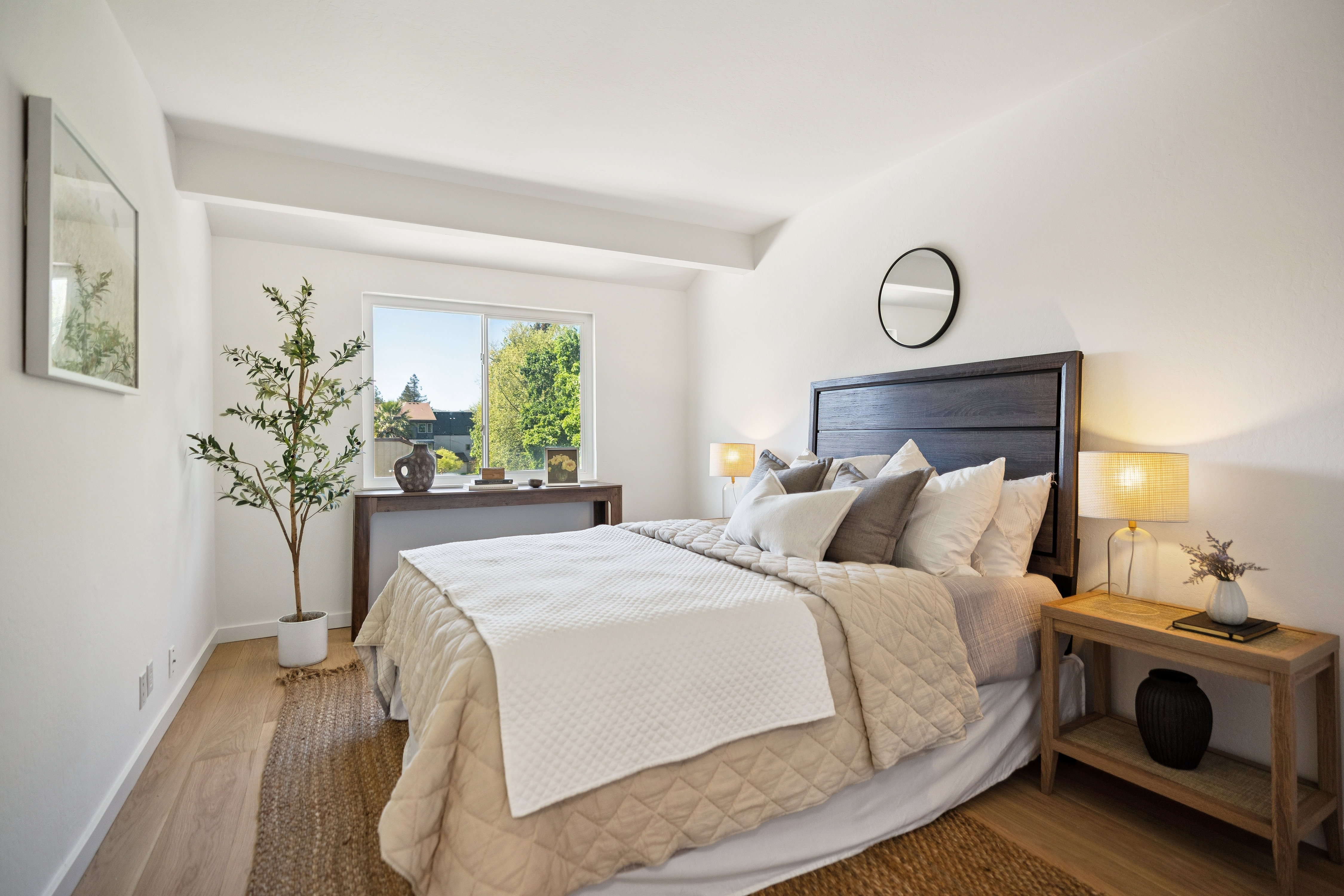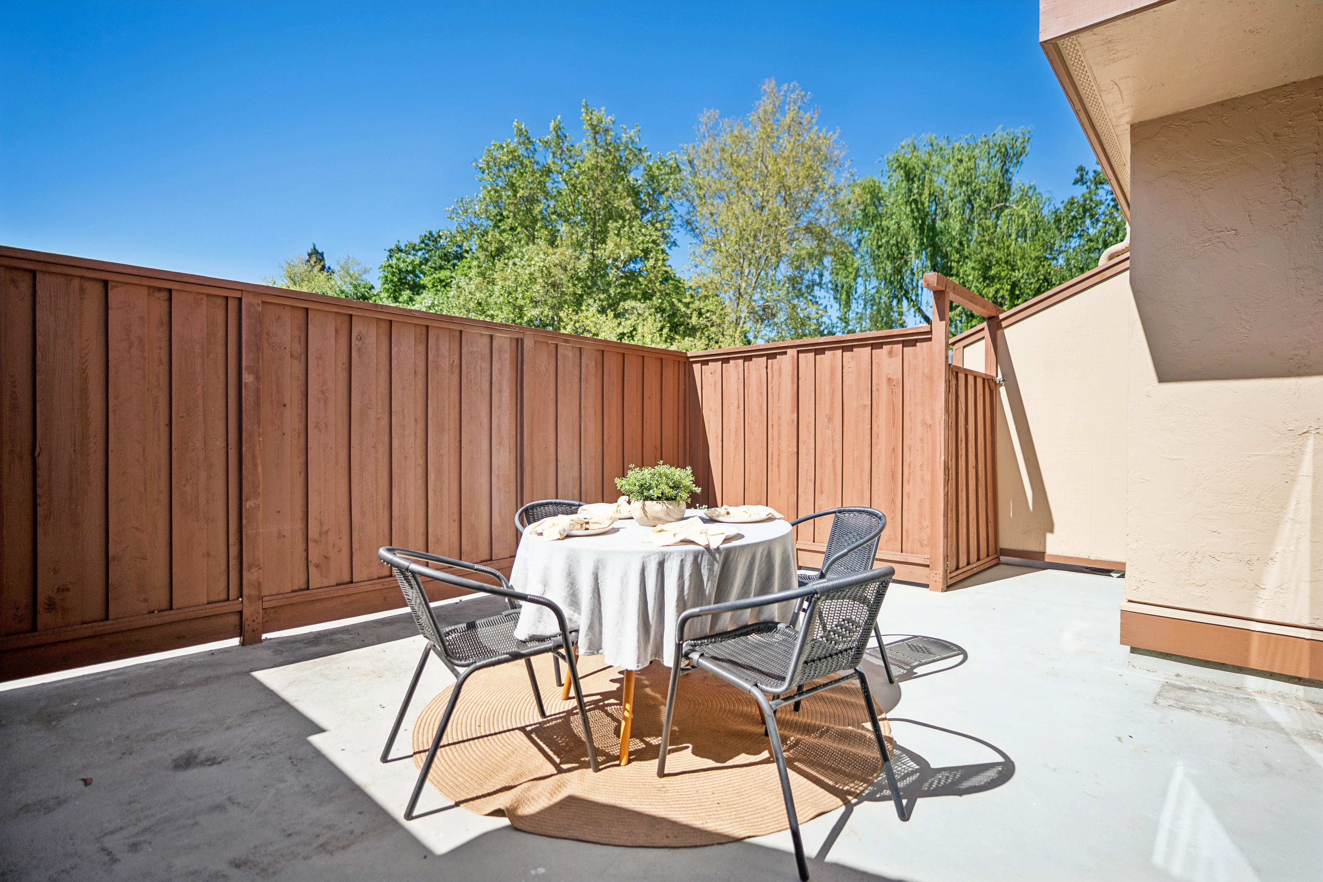 If you have been searching for a thoughtfully updated, move-in ready two-bedroom, one-and-a-half-bath condo below $500,000, check out 1542 Center Road #96. Spanning approximately 948 square feet, this inviting unit is ready for its next chapter. The main level features new white oak engineered flooring throughout and a beautifully updated kitchen with quartz countertops, new LG appliances, under-cabinet lighting, and a functional layout that opens seamlessly into the great room. The combined living and dining areas offer flexibility, while the west-facing orientation fills the space with natural light. A sliding door leads to a private patio, an ideal extension of the home for indoor/outdoor living and easy entertaining. Also on the main level is a stylishly updated powder room, complete with a fluted wood vanity, white stone countertop, and modern lighting. Upstairs, a skylit stairwell creates an airy transition to the second level, where two well-proportioned bedrooms overlook the peaceful greenbelt and enjoy soft sunset views. The primary bedroom offers generous closet space with Elfa organizers, while the second bedroom is well-suited for guests, a home office, or both. The full bathroom has been tastefully updated with a shower-over-tub, dual-sink wood vanity with a white stone countertop, new mirrors, updated lighting, and a skylight above. Comfort is ensured year-round with central air conditioning and heating. The community offers a range of amenities, including shared laundry facilities, landscaped greenbelts, nearby trails, and a pool and spa for residents to enjoy. Additional conveniences include a one-car garage just steps from the unit, assigned storage near the laundry area, and a private storage shed off the patio. Ideally located near grocery stores, restaurants, cafes, gym/fitness studios, and everyday essentials, this home offers a balanced lifestyle of comfort, convenience, and connection in a well-situated Novato location.