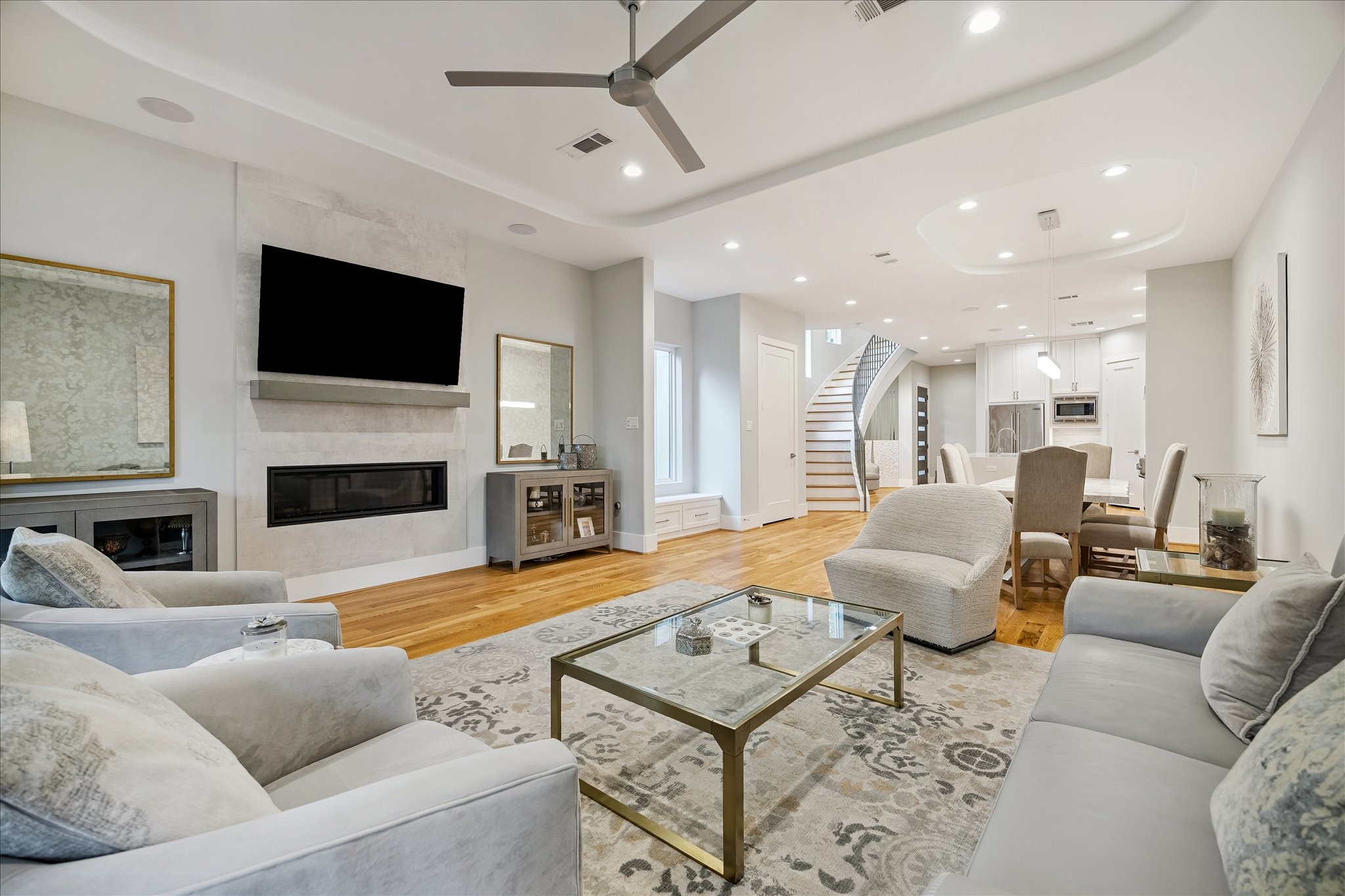 Gorgeous recent construction. First floor living w/ spacious open-flow floor plan, ideal for entertaining. Cooks dream kitchen w/ Thermador 48" gas range w/ double ovens. Quartz counter tops and massive island with waterfall edge. Amazing architectural details including gorgeous spiral staircase. Three outdoor spaces. Appx 3800 sq. ft. of living space w/ huge bedrooms, absolute luxury in all baths including two half baths. Huge primary bedroom w/ French doors opening onto a balcony. Primary bath is breathtaking. Large enclosed game room on 3rd floor w/ kitchenette space. Handsome study currently being used as an exercise room. Beautiful white oak hardwoods throughout. Fantastic location! Private entry gate. Beautiful backyard. Seven minutes to Downtown and surrounded by Memorial Park, Bayou Bend Park and Buffalo Bayou collection of Parks.