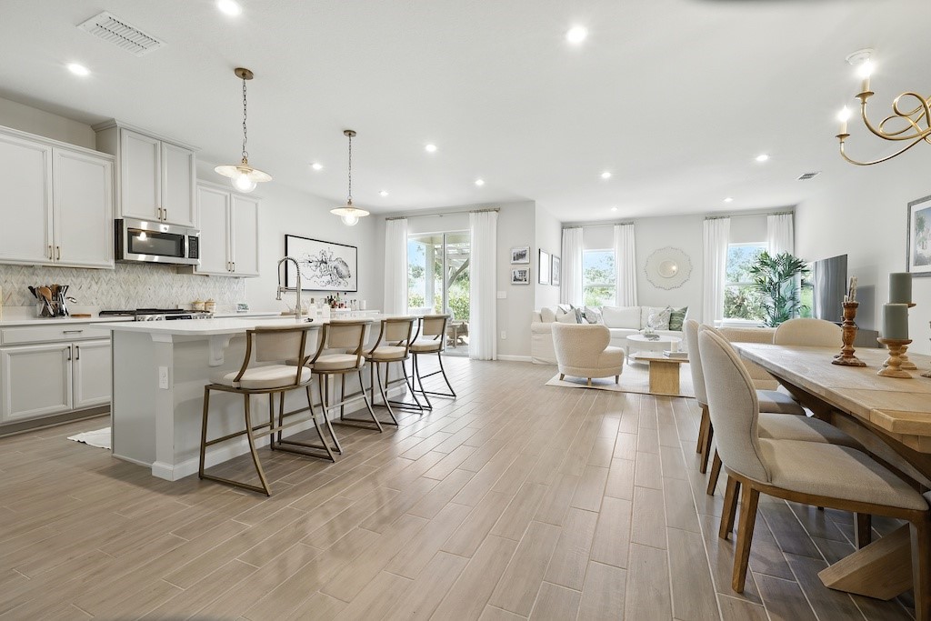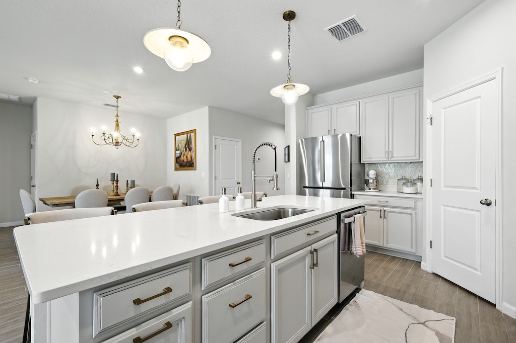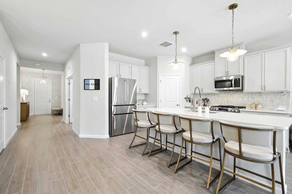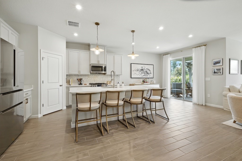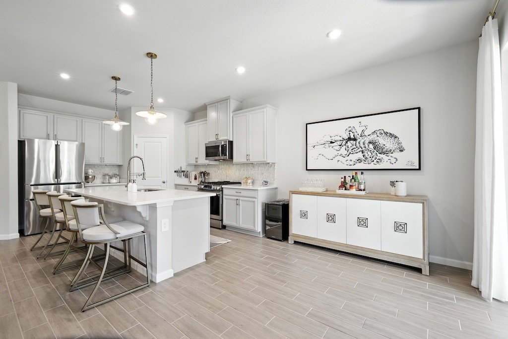 This immaculate home is a masterpiece of design& upgrades. Porcelain wood grain floors throughout, custom marble backsplash& quartz countertops in kitchen & baths. The open-concept plan features a large island, gas stove & custom walk-in pantry. The split floor plan offers a private master suite with a custom closet& spa-like bath. With 3 bed, 3 baths& a bonus rm there's space for everyone. Outdoors, relax on travertine patio under pergola, overlooking a peaceful preserve. ADT security system,whole house water filtration & a paver driveway complete the home.Other fees & restrictions may apply.