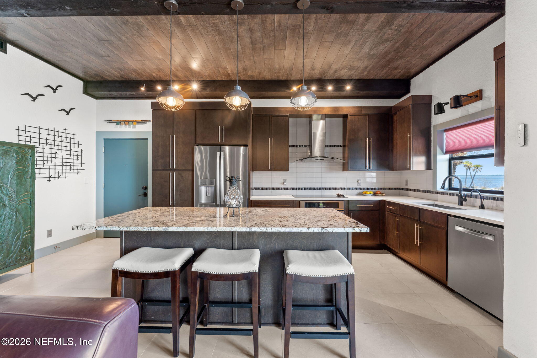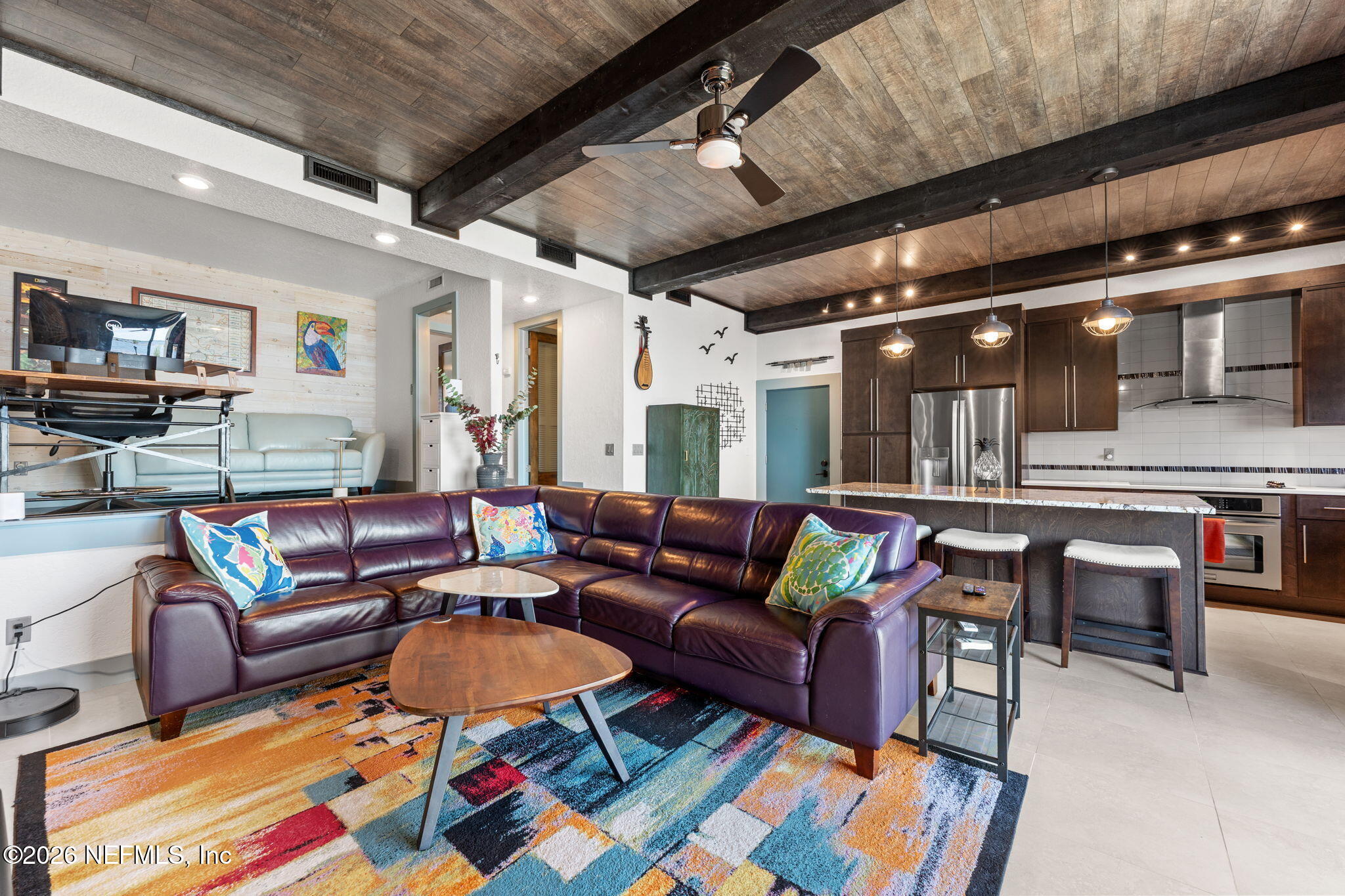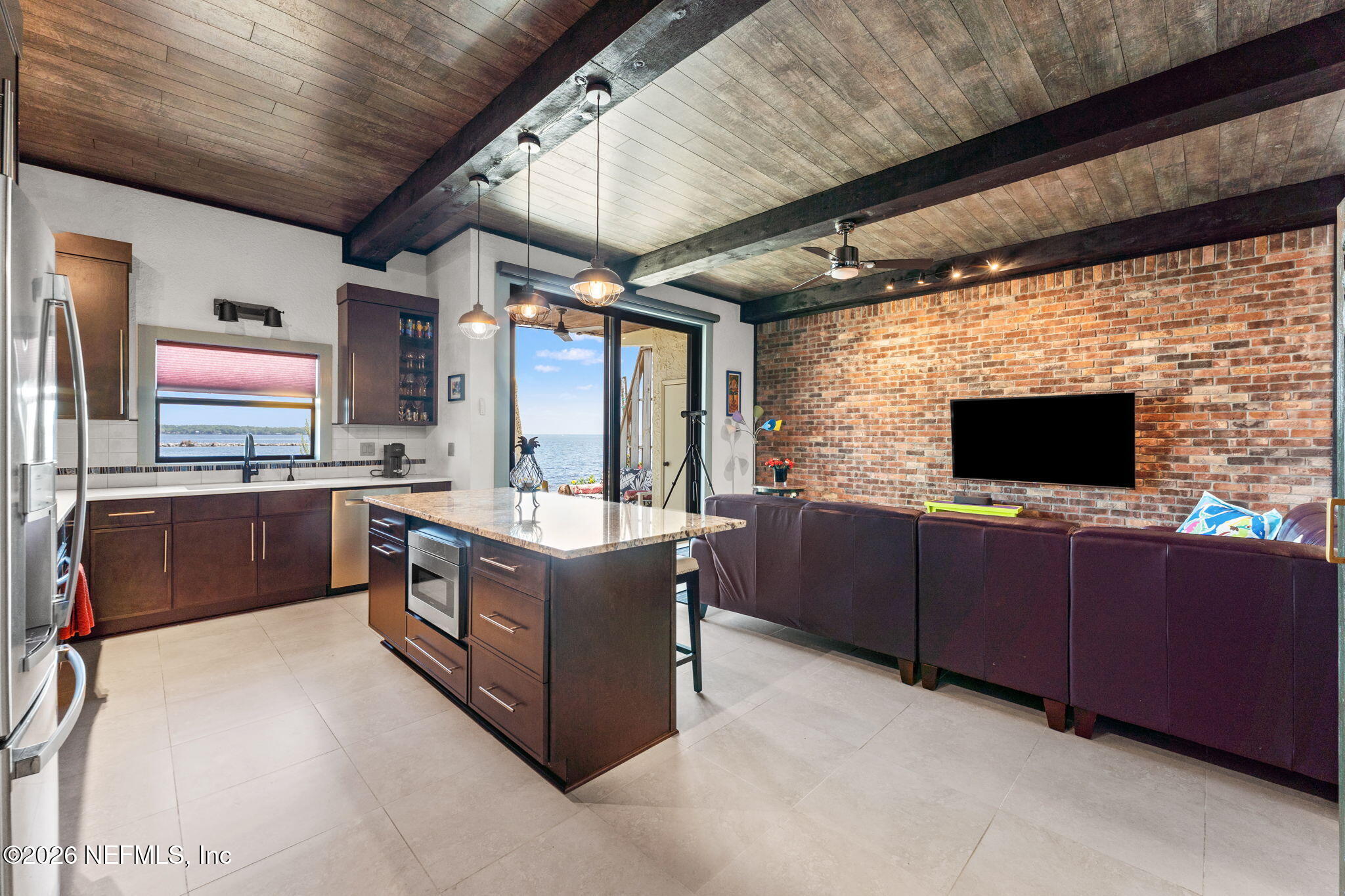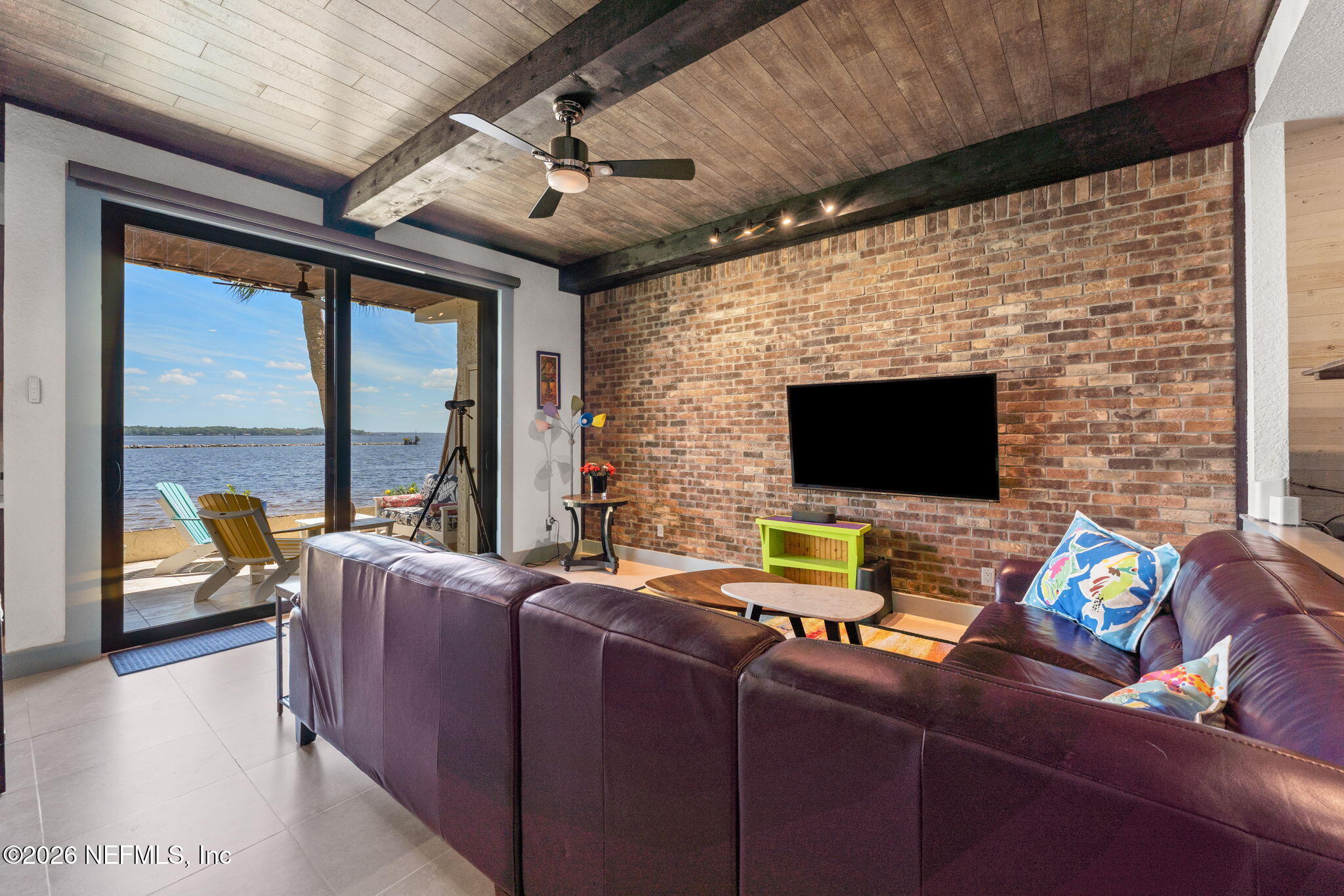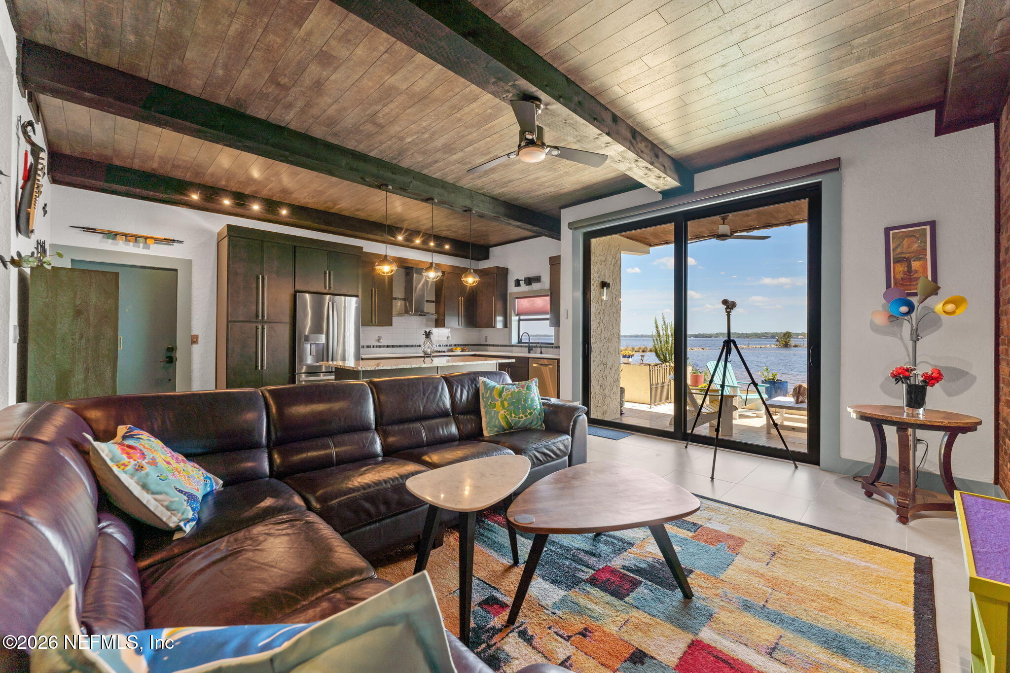 AN OASIS ON THE RIVER! Tranquil river views, refined design, and curated upgrades create a lifestyle that feels more like a retreat than a residence. Nestled within the Club Continental & designed by an HGTV Dream Home designer; this ground-floor unit offers a thoughtfully designed layout, including a secondary bedroom reimagined as a loft style riverfront office with stunning views as your focal point. The fully transformed kitchen is both striking and functional, featuring new cabinetry, upgraded countertops, new stainless-steel appliances. The main living area is elevated by a custom wood-paneled ceiling with exposed beam detail, and added sound-reduction, creating warmth, character, and quiet comfort while framing stunning views of the St. Johns River. The primary suite serves as a private retreat with oak hardwood flooring, a custom closet, elegant plantation shutters, and a spa inspired bathroom complete with a floor to ceiling marble tiled glass shower Additional highlights: LVP flooring in hallway/office, no carpet, surround sound wiring, washer/dryer and living room TV conveying, water softener, updated electrical panel (2022), water heater (2026), and added patio/carport storage. Nestled near Club Continental, residents enjoy peaceful surroundings, stunning St. Johns River views, a prime location, and optional access to dining, swimming, and tennis; offering a true resort-style lifestyle.