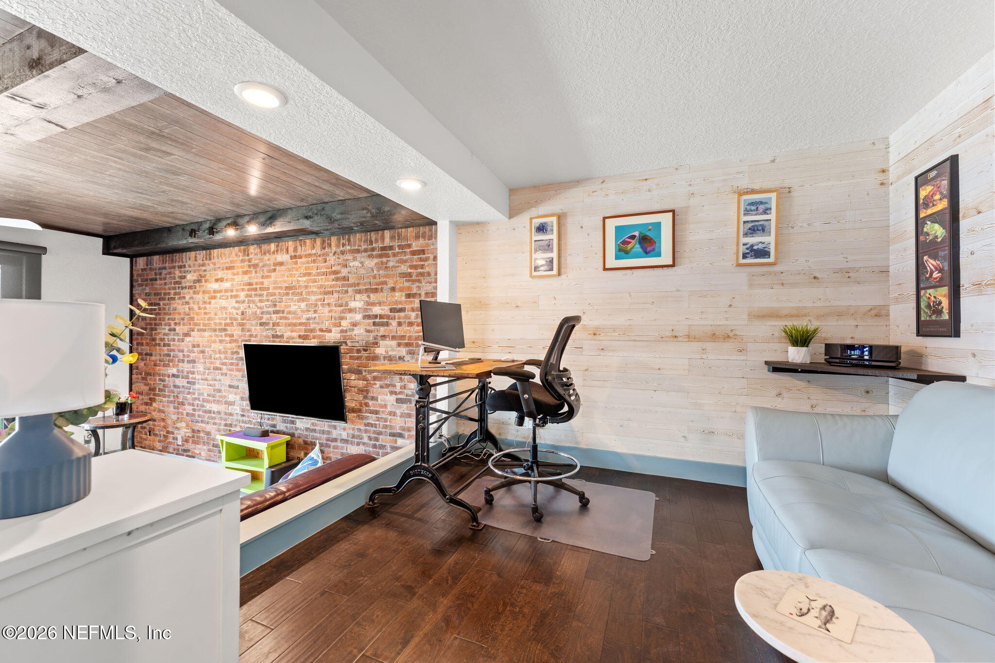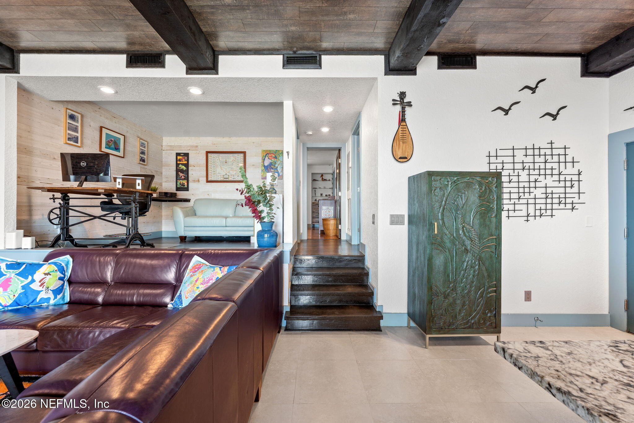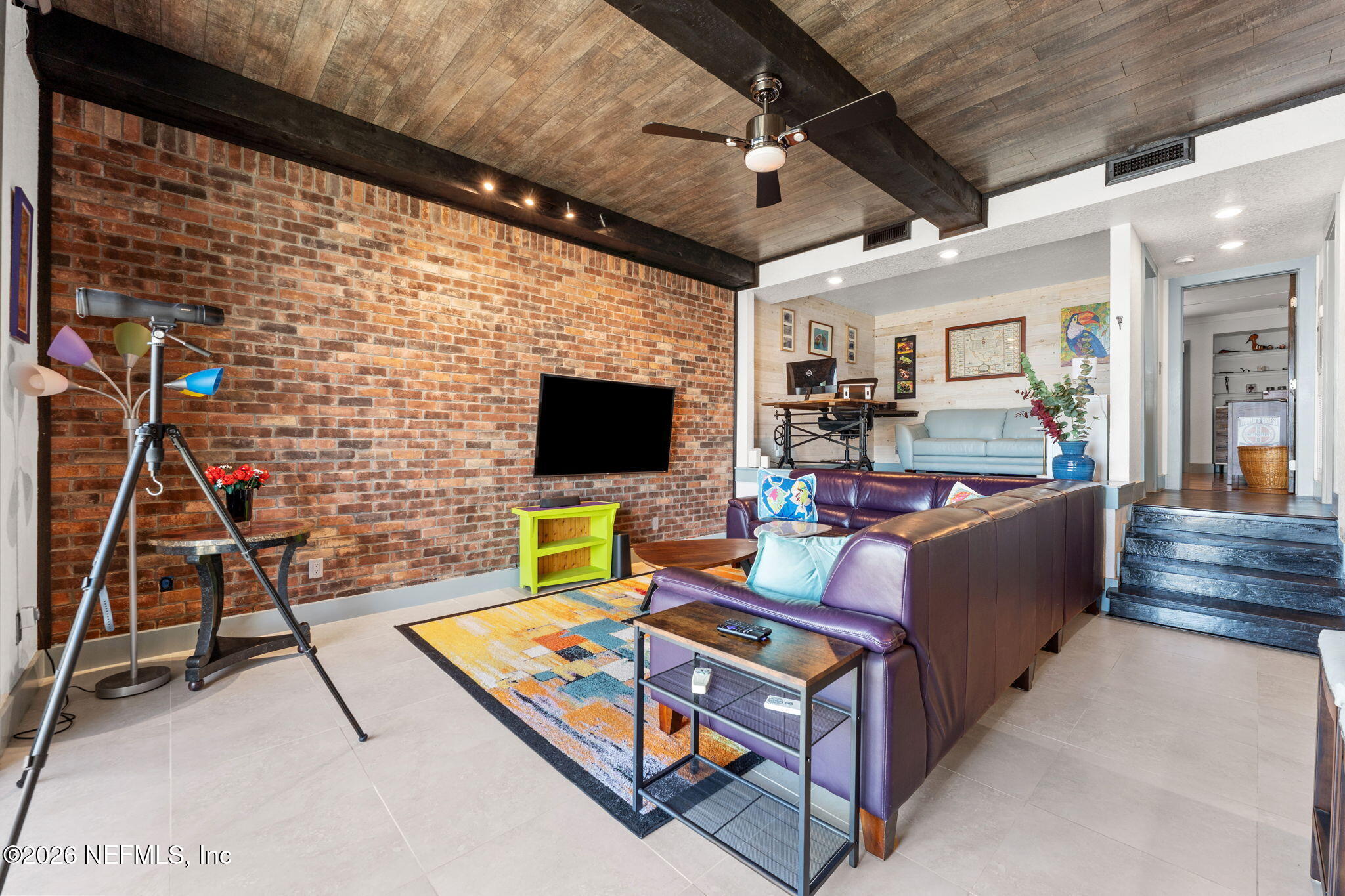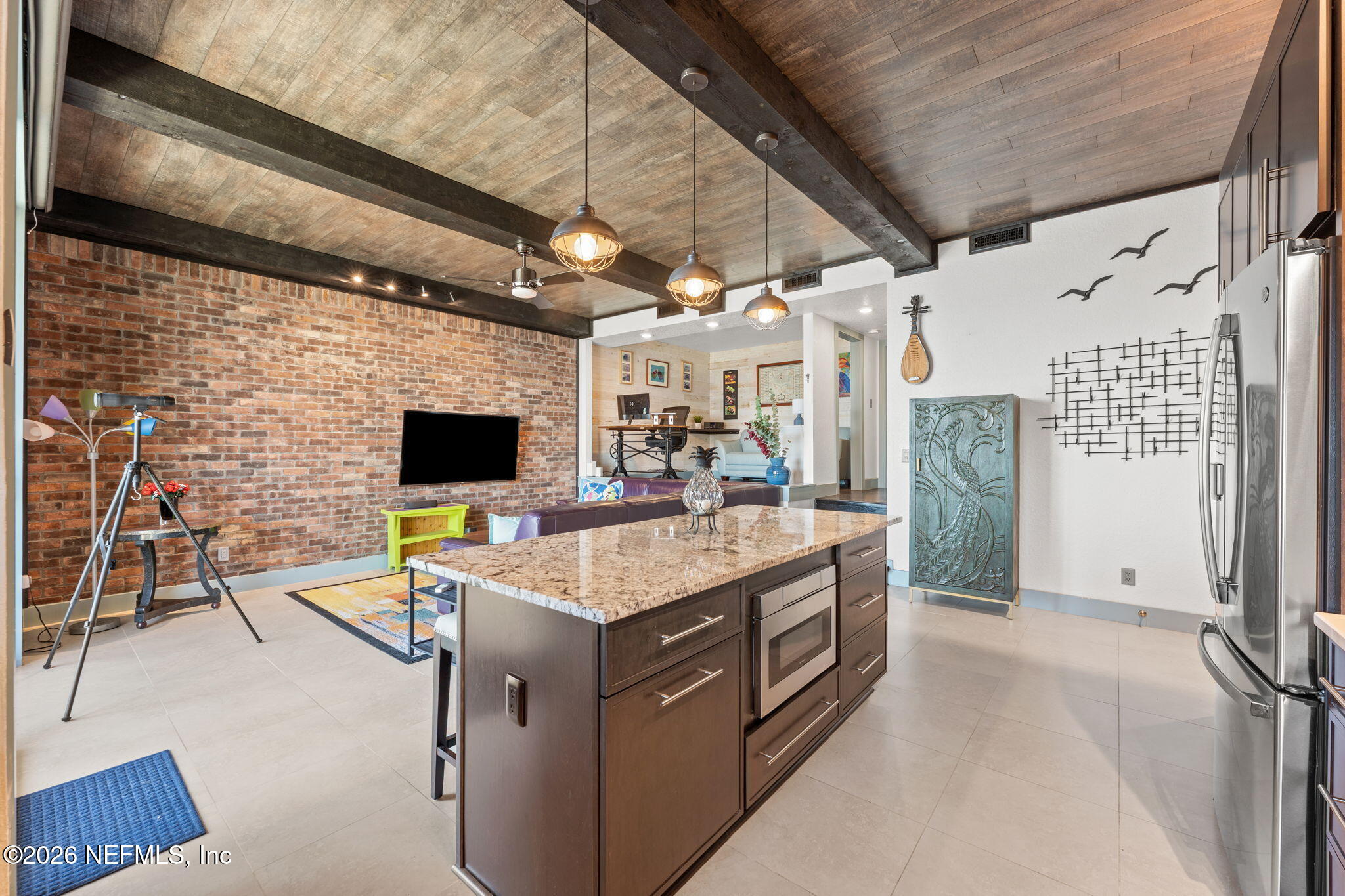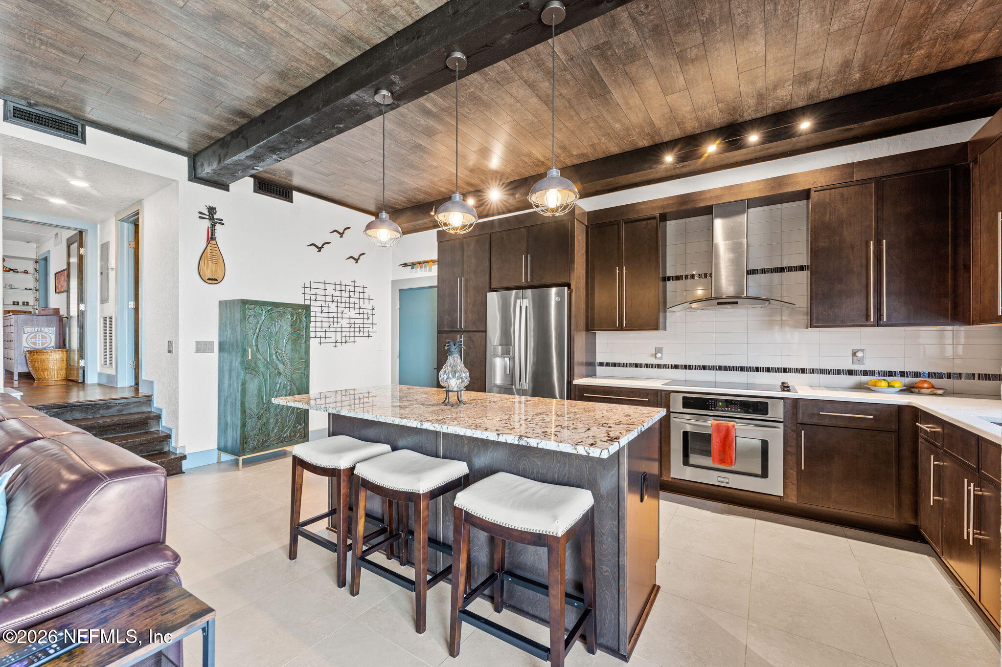 AN OASIS ON THE RIVER! Tranquil river views, refined design, and curated upgrades create a lifestyle that feels more like a retreat than a residence. Nestled within the Club Continental & designed by an HGTV Dream Home designer; this ground-floor unit offers a thoughtfully designed layout, including a secondary bedroom reimagined as a loft style riverfront office with stunning views as your focal point. The fully transformed kitchen is both striking and functional, featuring new cabinetry, upgraded countertops, new stainless-steel appliances. The main living area is elevated by a custom wood-paneled ceiling with exposed beam detail, and added sound-reduction, creating warmth, character, and quiet comfort while framing stunning views of the St. Johns River. The primary suite serves as a private retreat with oak hardwood flooring, a custom closet, elegant plantation shutters, and a spa inspired bathroom complete with a floor to ceiling marble tiled glass shower Additional highlights: LVP flooring in hallway/office, no carpet, surround sound wiring, washer/dryer and living room TV conveying, water softener, updated electrical panel (2022), water heater (2026), and added patio/carport storage. Nestled near Club Continental, residents enjoy peaceful surroundings, stunning St. Johns River views, a prime location, and optional access to dining, swimming, and tennis; offering a true resort-style lifestyle.
